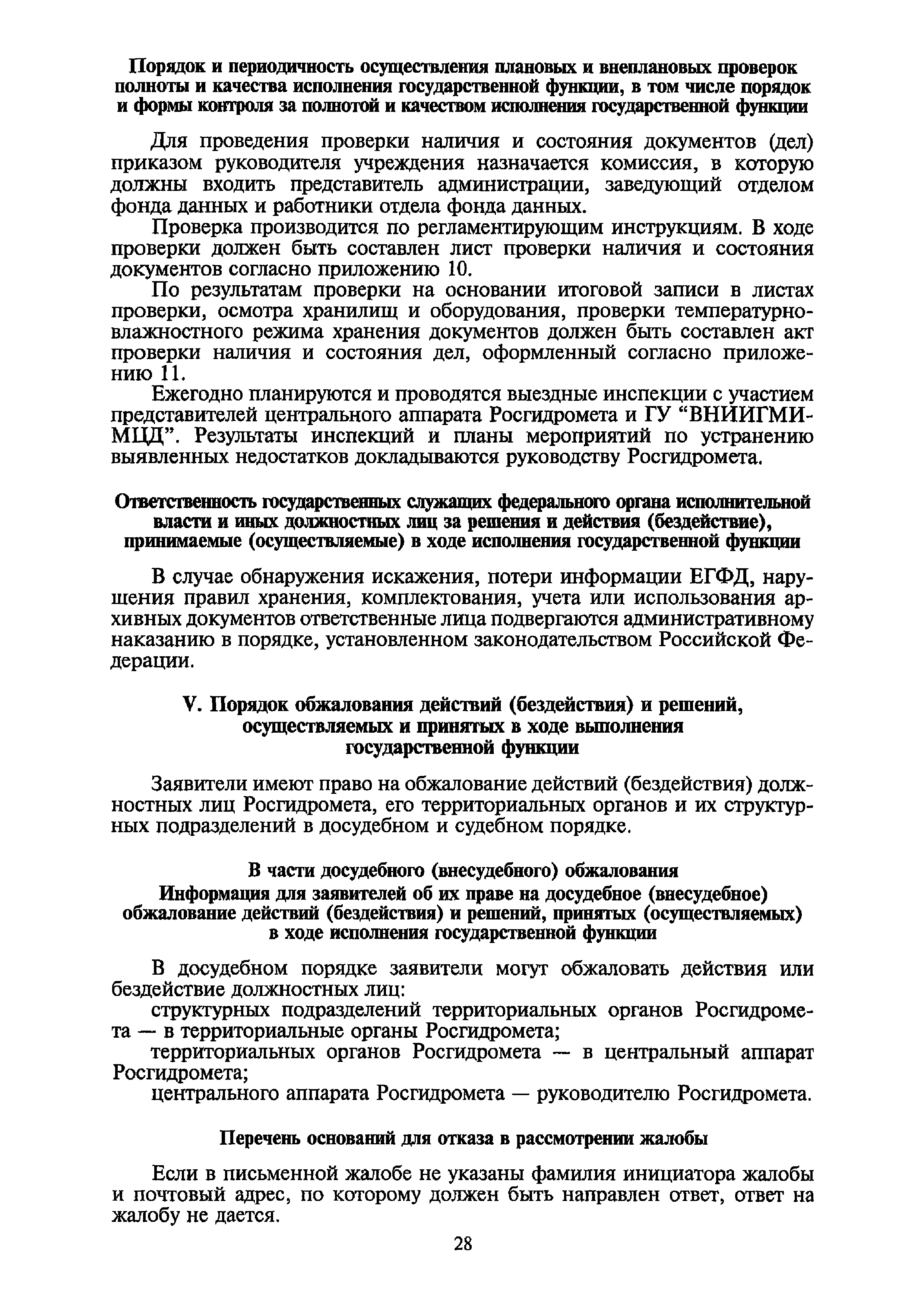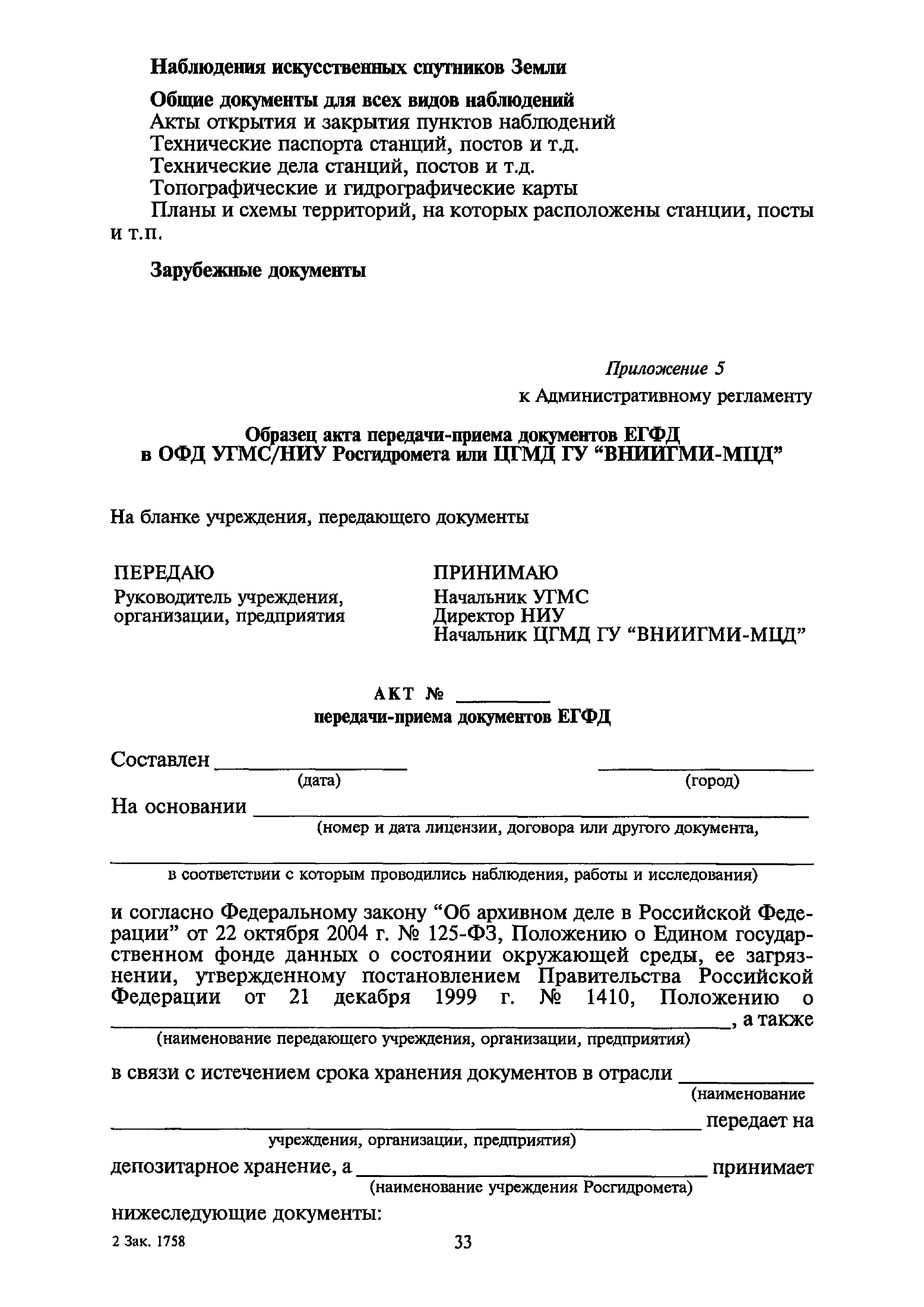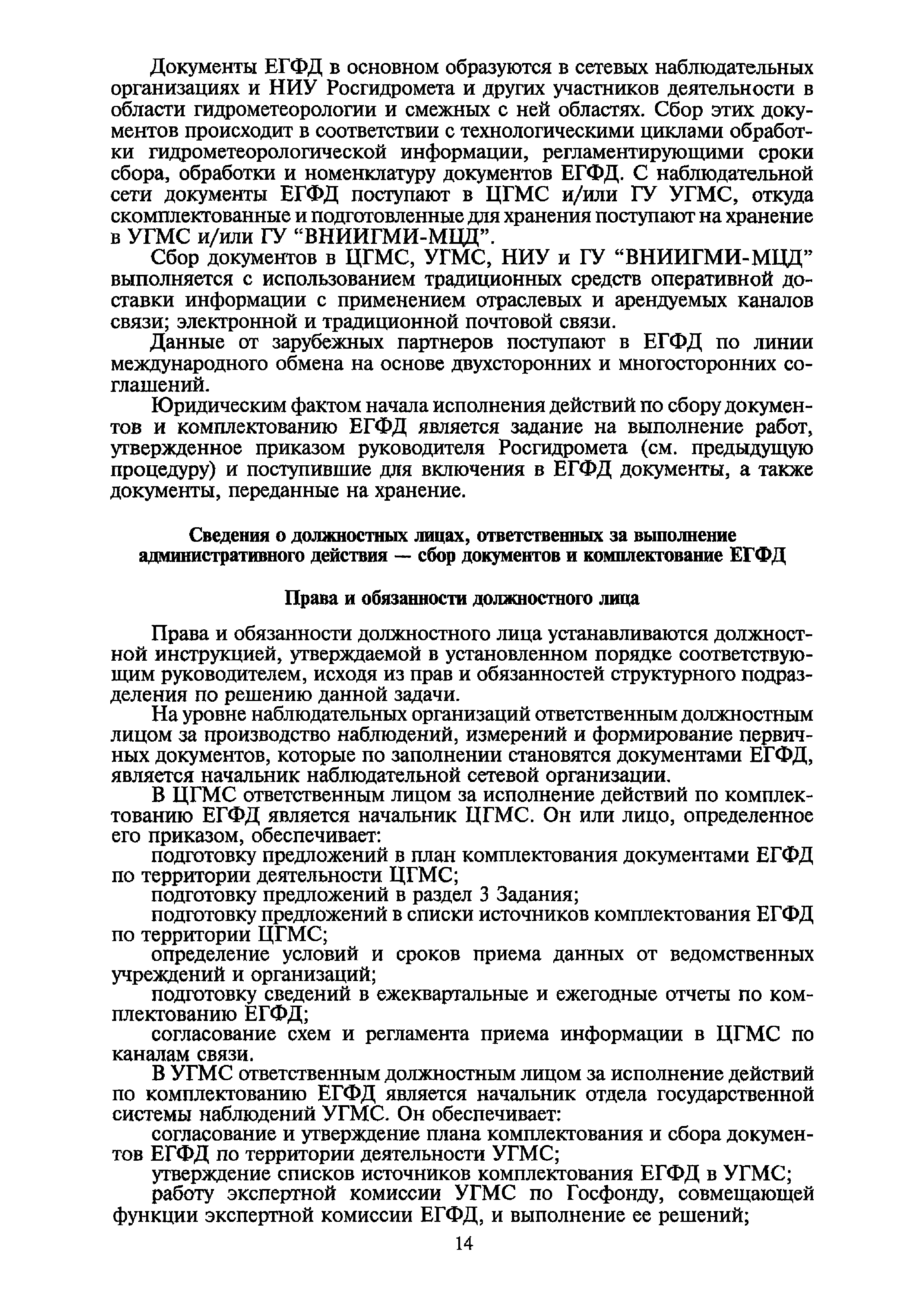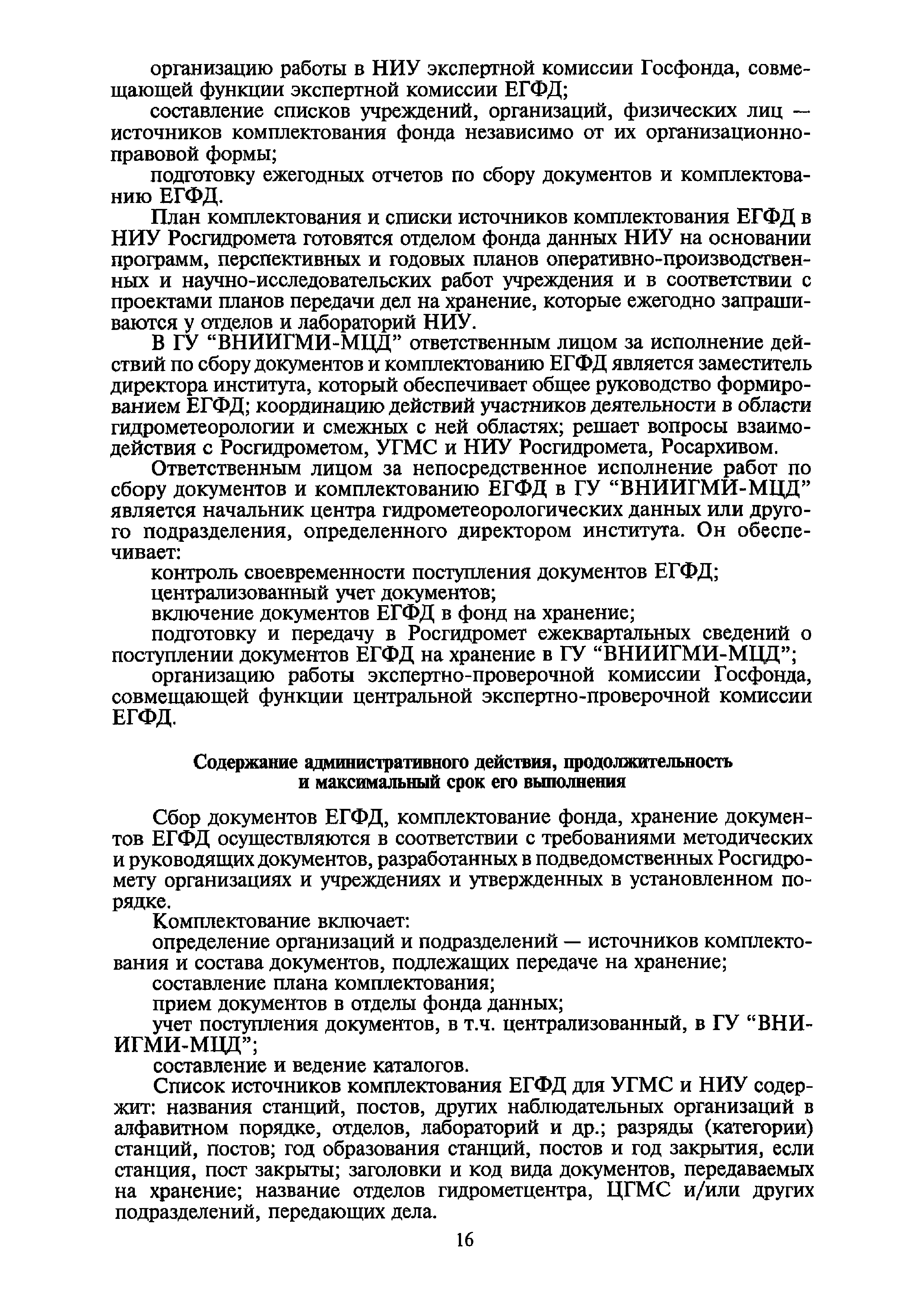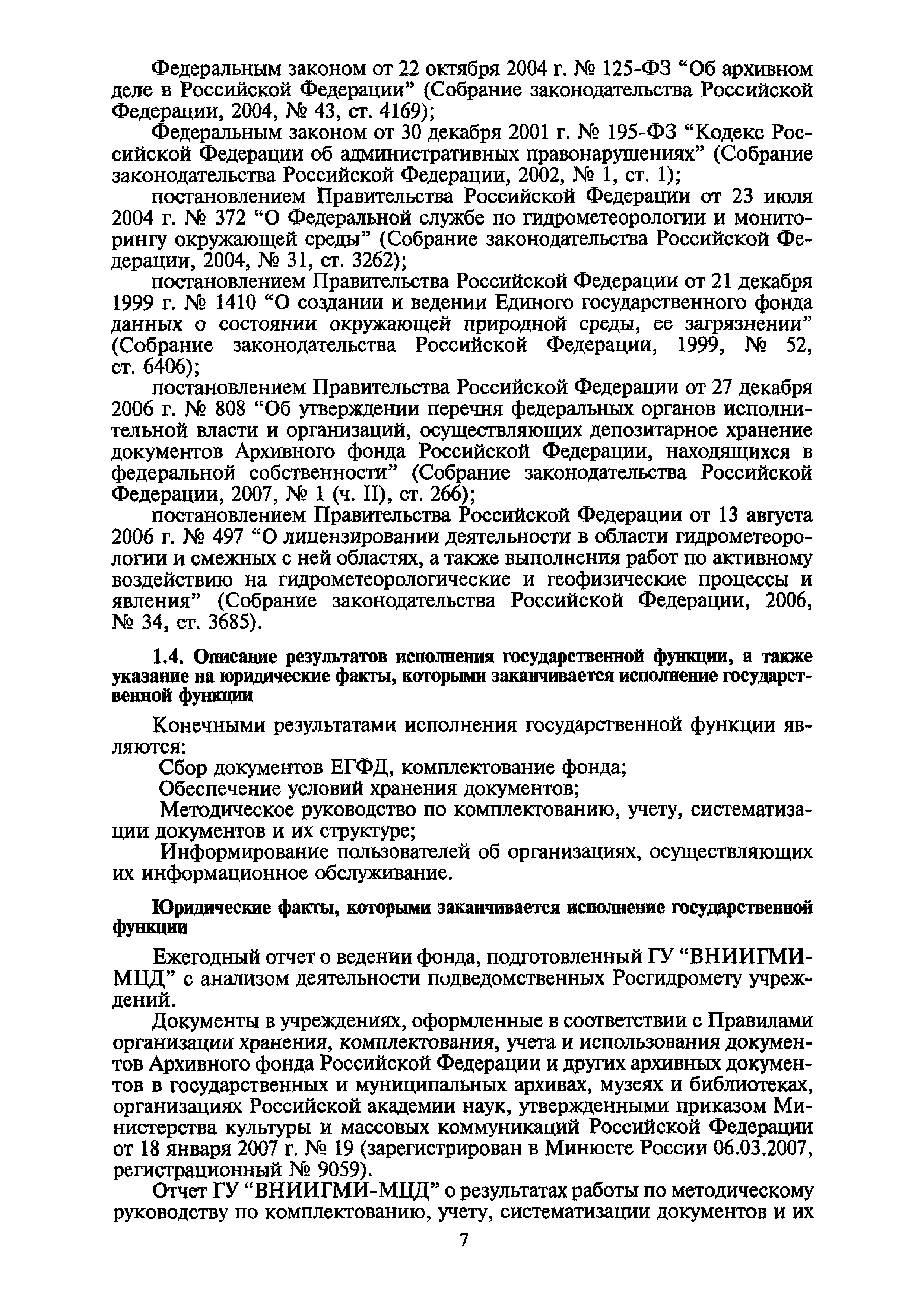 | Оглавление: | I. Общие положения II. Требования к порядку исполнения государственной функции III. Административные процедуры IV. Порядок и формы контроля за исполнением государственной функции V. Порядок обжалования действий (бездействия) и решений, осуществляемых и принятых в ходе выполнения государственной функции Приложение 1. Общая схема обеспечения выполнения государственной функции по ведению ЕГФД Приложение 2. Территориальные органы Росгидромета и закрепленные за ними территории Приложение 3. Список научно-исследовательских учреждений Росгидромета осуществляющих функцию ведения ЕГФД Приложение 4. Наблюдения за параметрами окружающей среды, включая виды информации Приложение 5. Образец акта передачи-приема документов ЕГФД в ОФД УГМС/НИУ Росгидромета или ЦГМД ГУ "ВНИИГМИ-МЦД" Приложение 6. Образец акта передачи-приема документов ЕГФД при изменении территории или профиля деятельности одного УГМС, НИУ и отнесения их к территории или профилю деятельности другого УГМС, НИУ Приложение 7. Образец структуры ежегодного отчета участника деятельности по ведению Российского государственного фонда данных о состоянии окружающей среды Приложение 8. Сведения о составе документов Госфонда Приложение 9. Образец акта о выделении к уничтожению документов Госфонда по территории деятельности УГМС, профилю деятельности НИУ, не подлежащих дальнейшему хранению Приложение 10. Образец листа проверки наличия и состояния документов Госфонда Приложение 11. Образец акта проверки наличия и состояния документов Госфонда |
