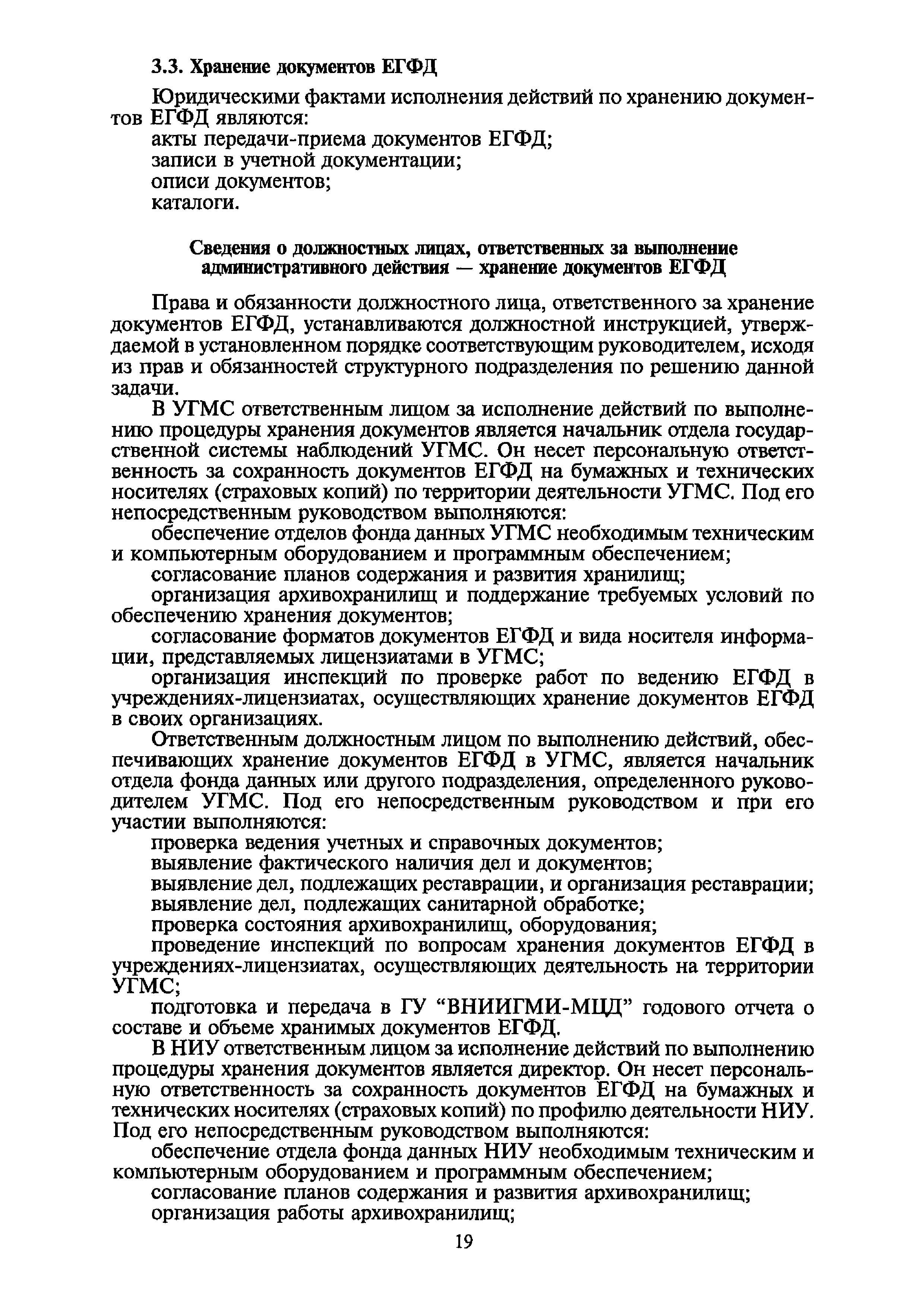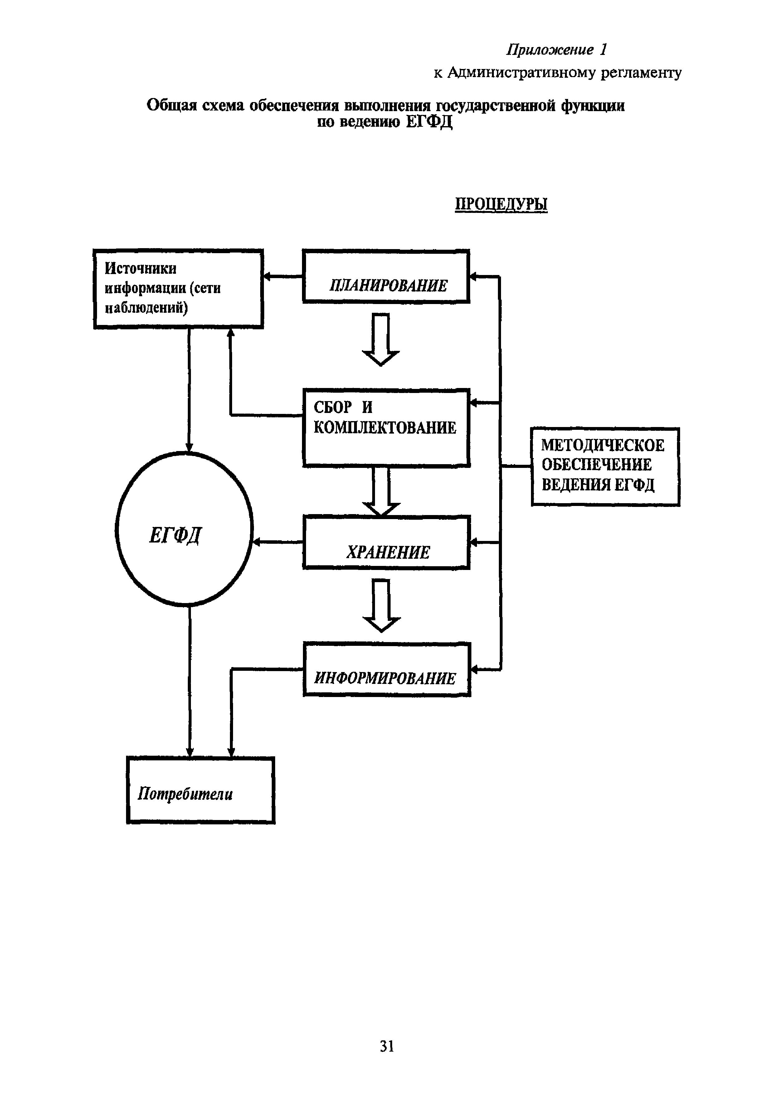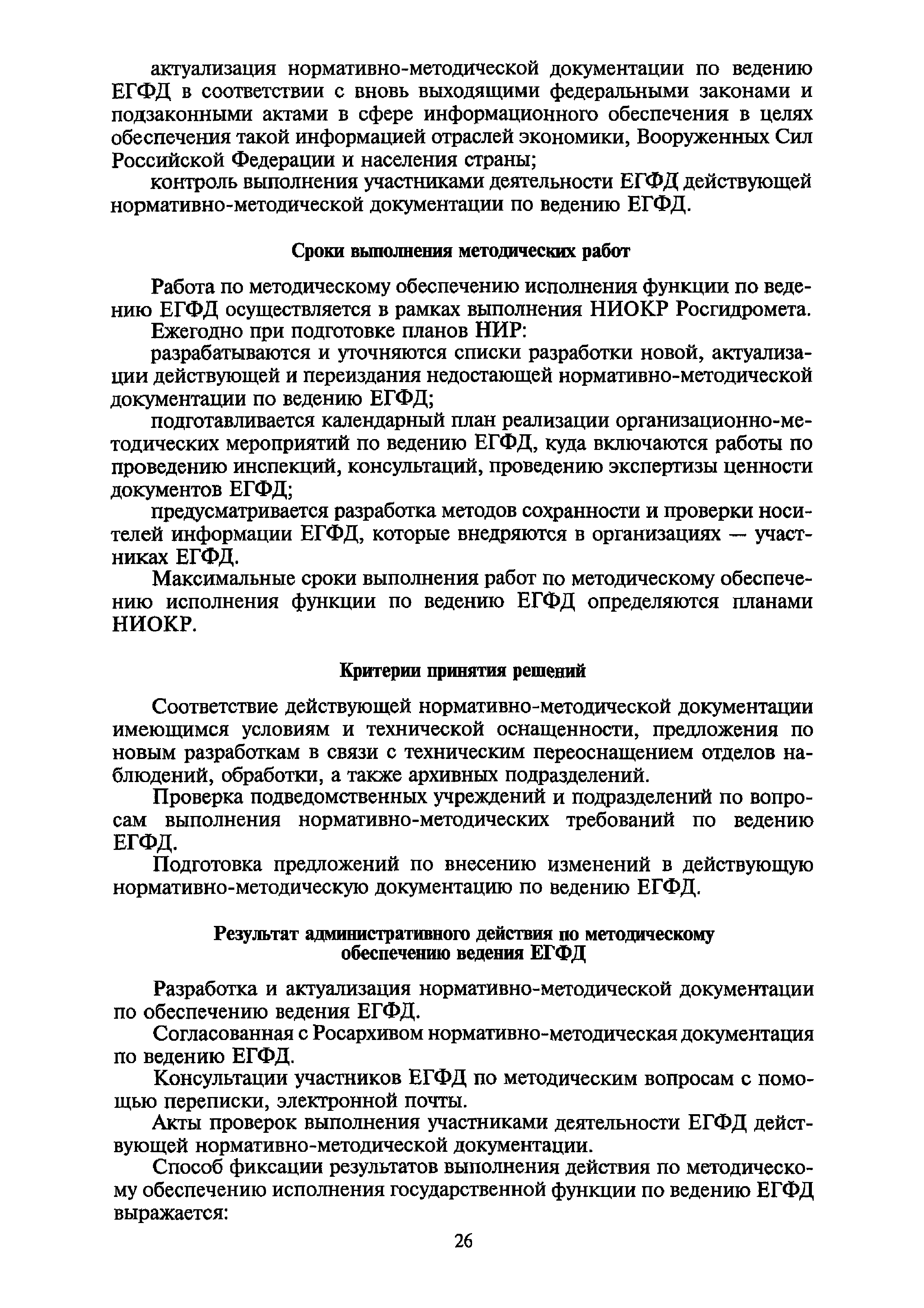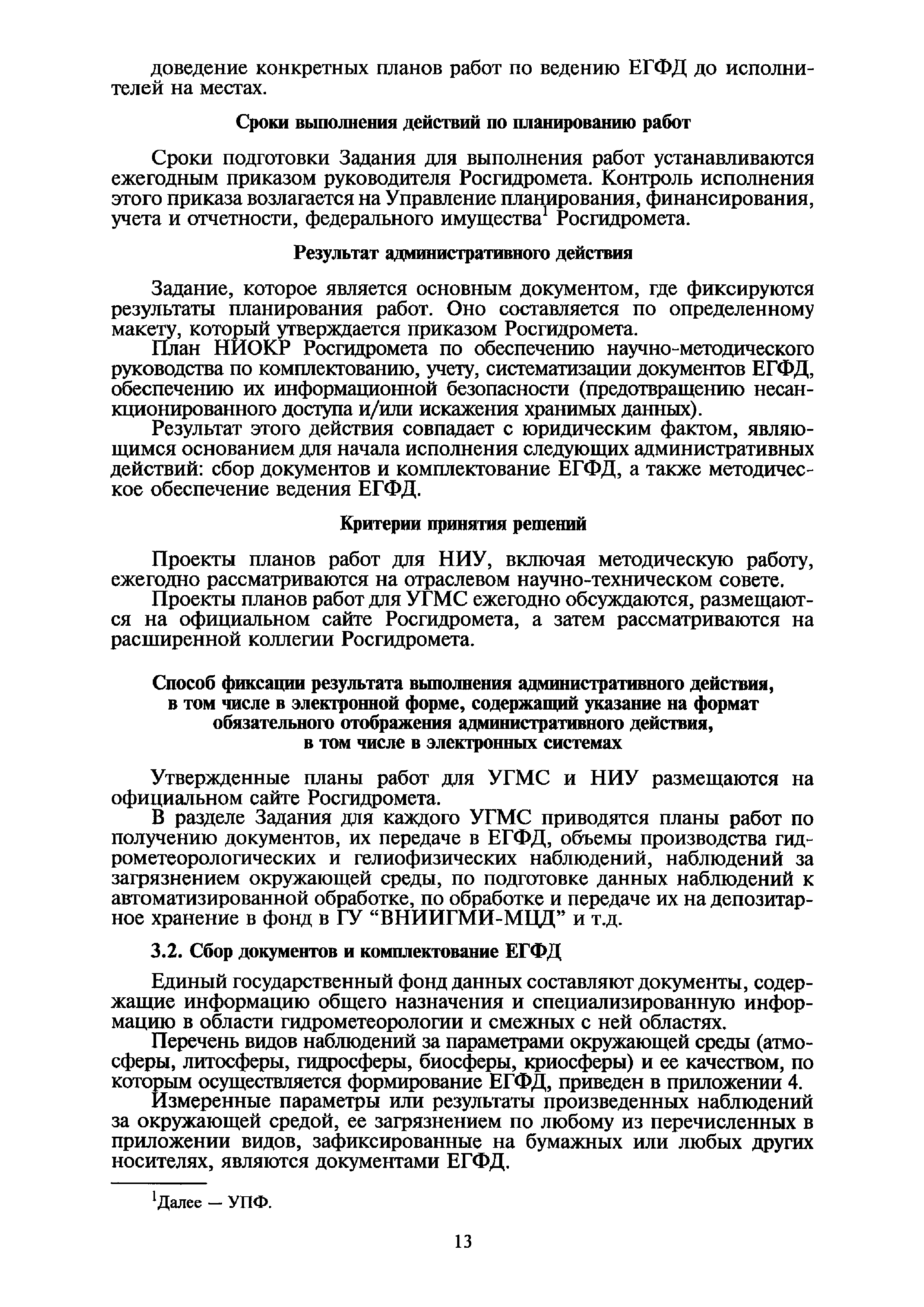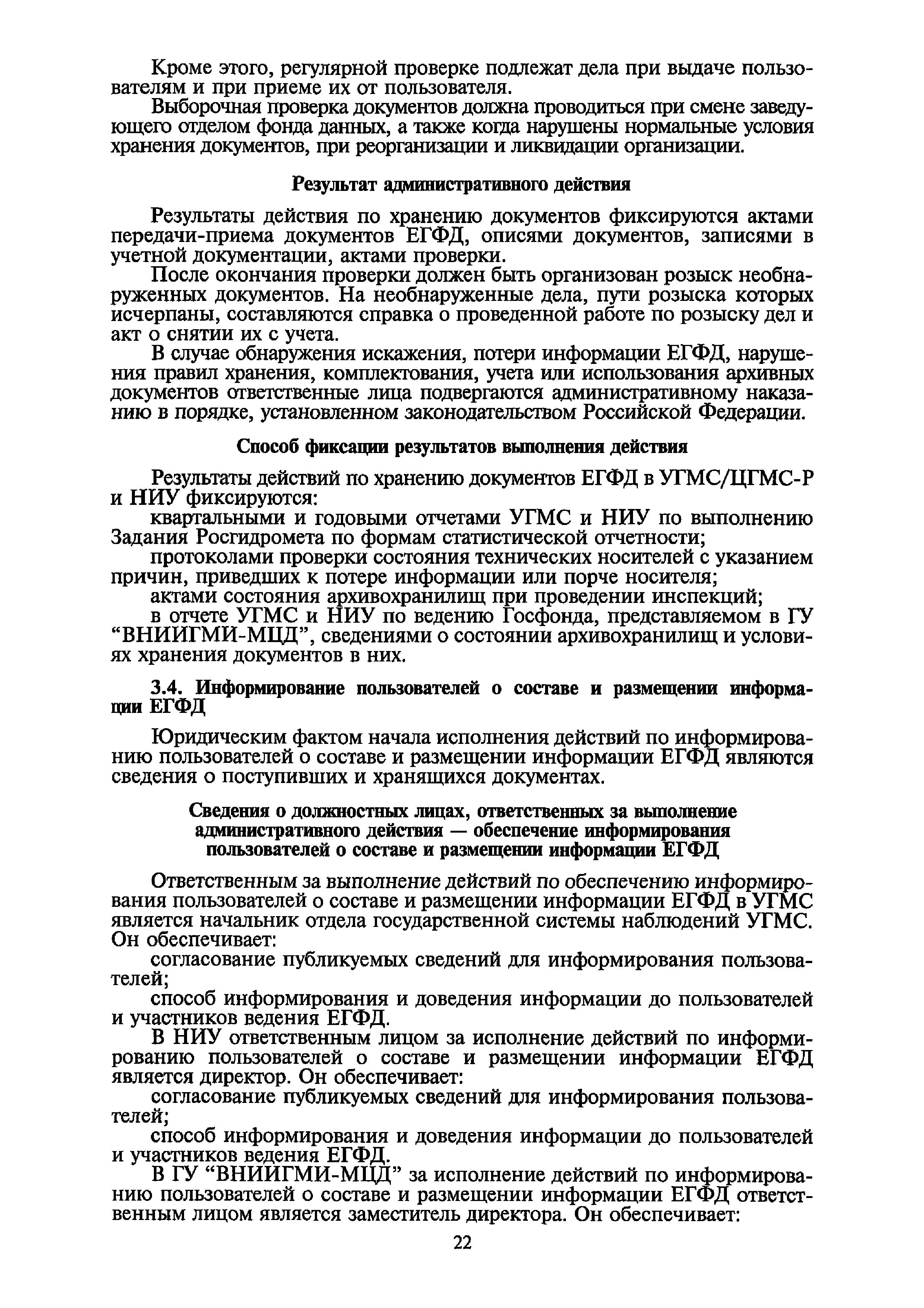 | Оглавление: | I. Общие положения II. Требования к порядку исполнения государственной функции III. Административные процедуры IV. Порядок и формы контроля за исполнением государственной функции V. Порядок обжалования действий (бездействия) и решений, осуществляемых и принятых в ходе выполнения государственной функции Приложение 1. Общая схема обеспечения выполнения государственной функции по ведению ЕГФД Приложение 2. Территориальные органы Росгидромета и закрепленные за ними территории Приложение 3. Список научно-исследовательских учреждений Росгидромета осуществляющих функцию ведения ЕГФД Приложение 4. Наблюдения за параметрами окружающей среды, включая виды информации Приложение 5. Образец акта передачи-приема документов ЕГФД в ОФД УГМС/НИУ Росгидромета или ЦГМД ГУ "ВНИИГМИ-МЦД" Приложение 6. Образец акта передачи-приема документов ЕГФД при изменении территории или профиля деятельности одного УГМС, НИУ и отнесения их к территории или профилю деятельности другого УГМС, НИУ Приложение 7. Образец структуры ежегодного отчета участника деятельности по ведению Российского государственного фонда данных о состоянии окружающей среды Приложение 8. Сведения о составе документов Госфонда Приложение 9. Образец акта о выделении к уничтожению документов Госфонда по территории деятельности УГМС, профилю деятельности НИУ, не подлежащих дальнейшему хранению Приложение 10. Образец листа проверки наличия и состояния документов Госфонда Приложение 11. Образец акта проверки наличия и состояния документов Госфонда |