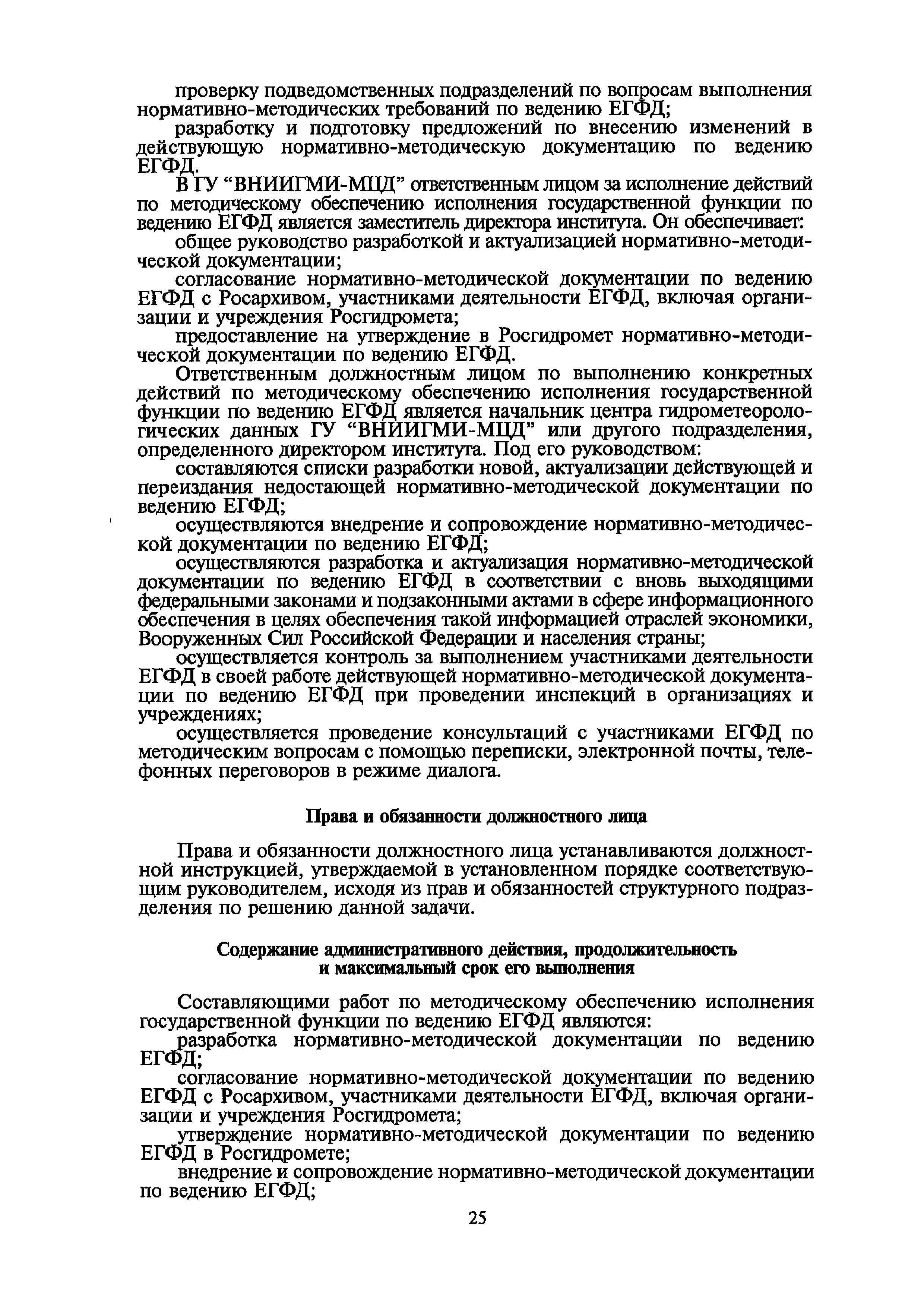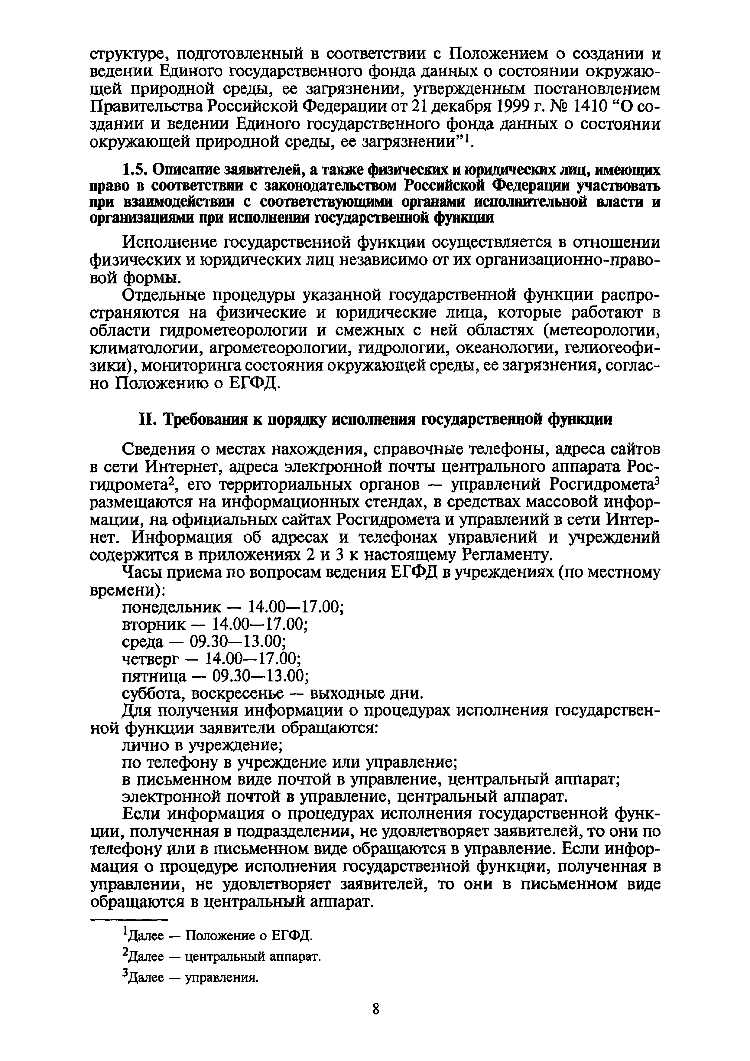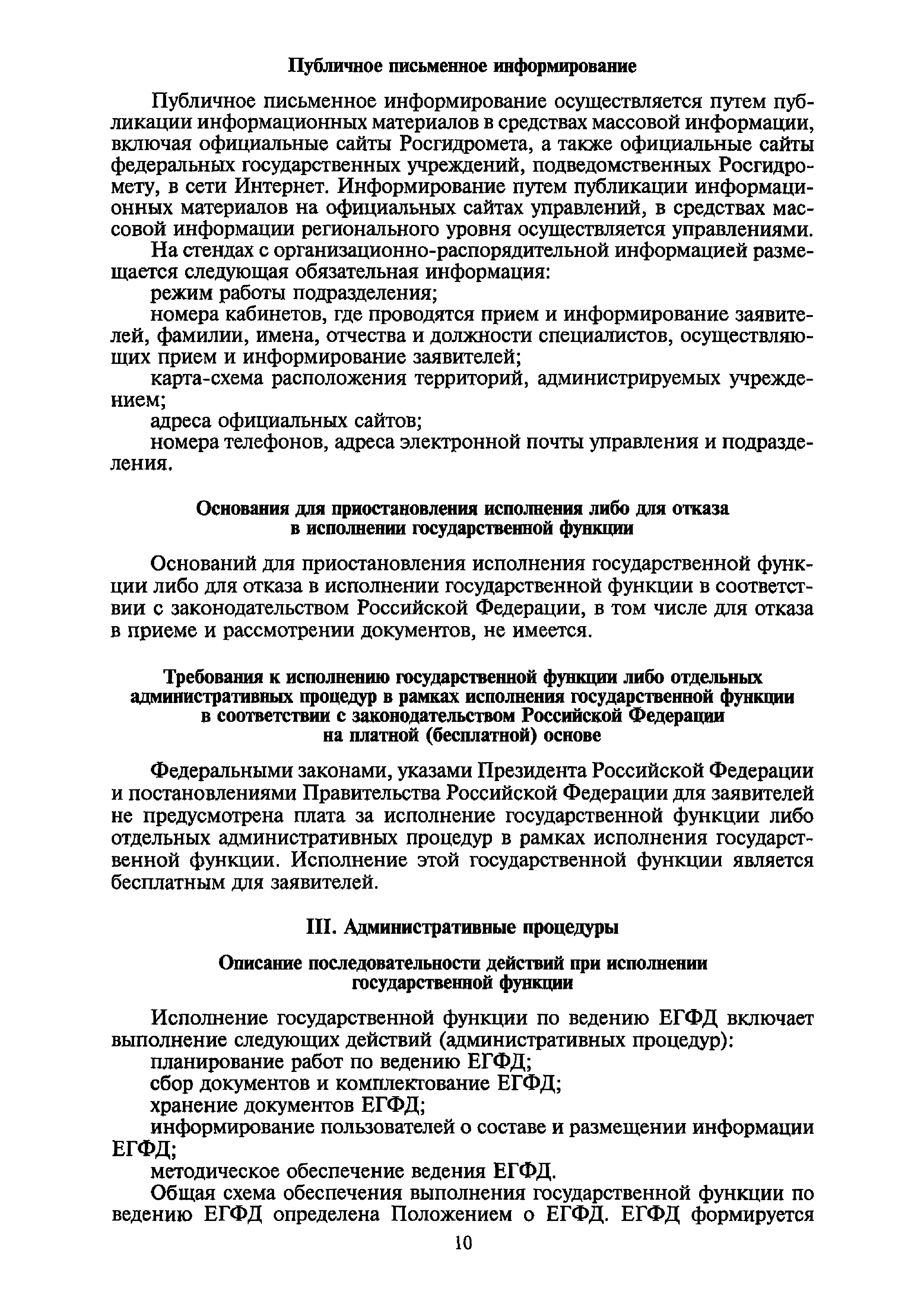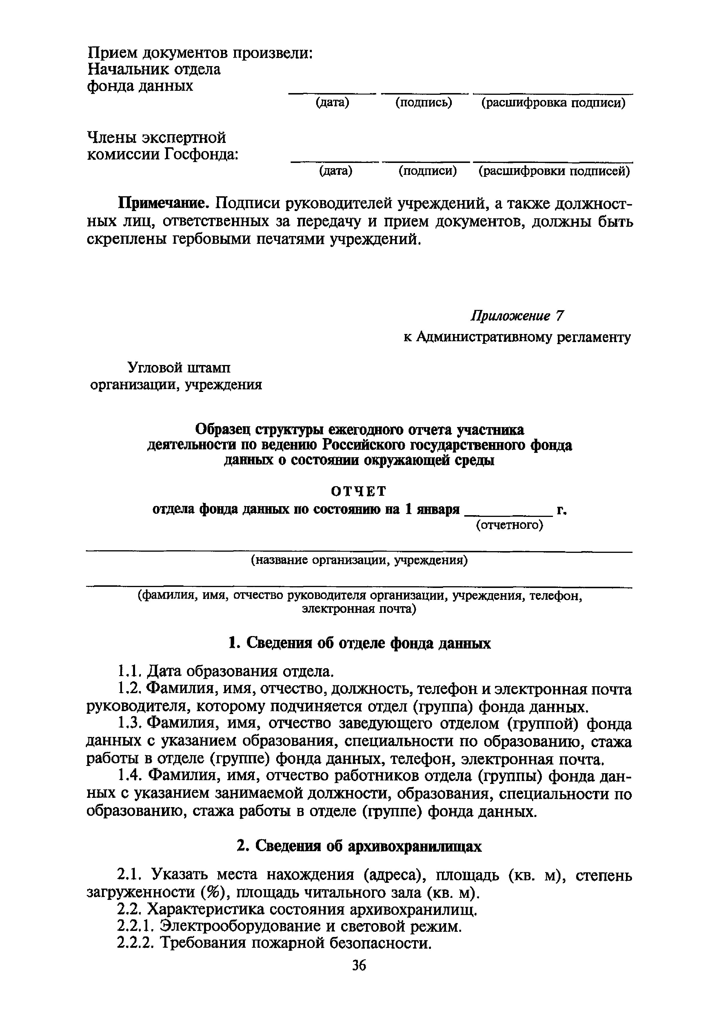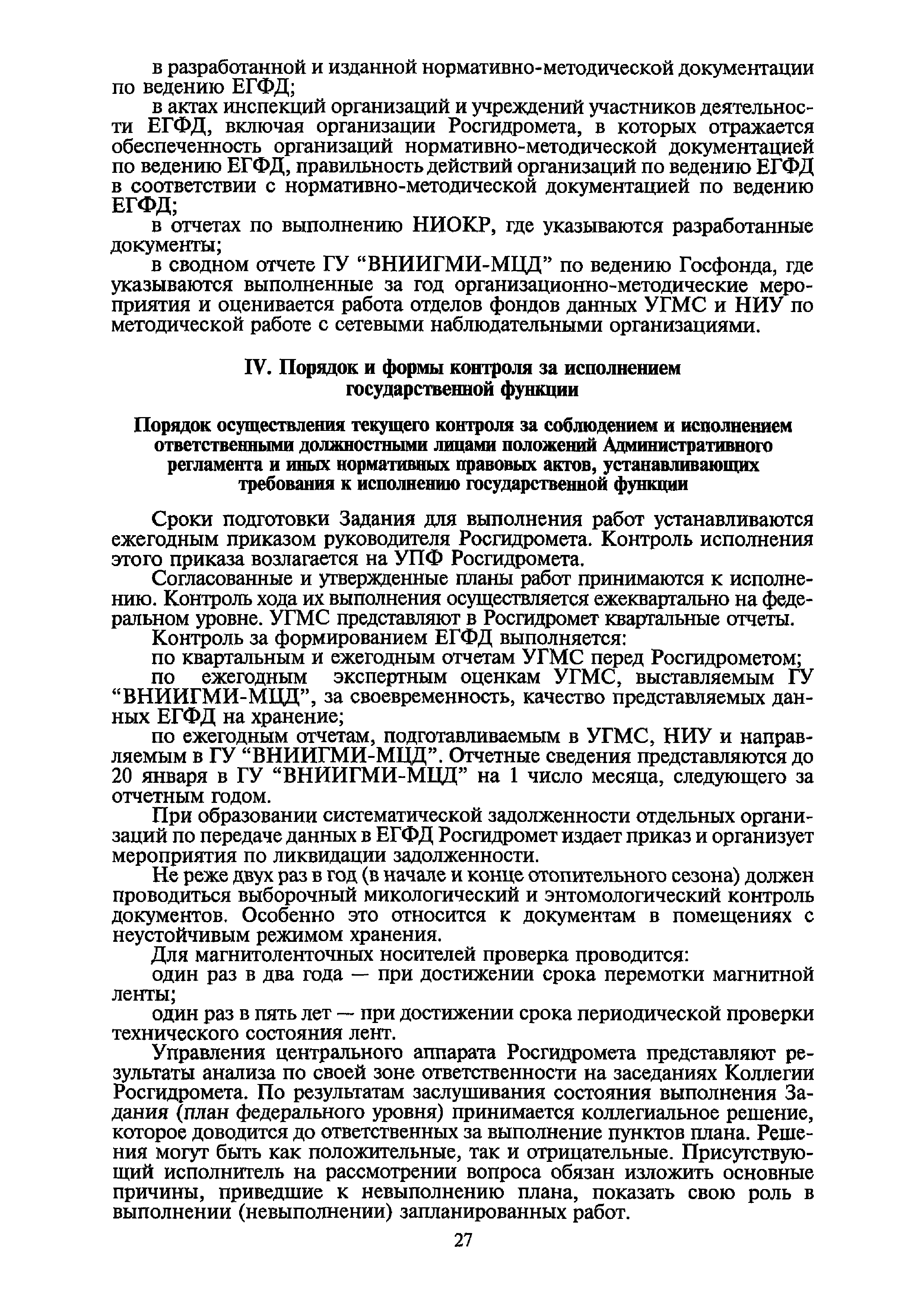 | Оглавление: | I. Общие положения II. Требования к порядку исполнения государственной функции III. Административные процедуры IV. Порядок и формы контроля за исполнением государственной функции V. Порядок обжалования действий (бездействия) и решений, осуществляемых и принятых в ходе выполнения государственной функции Приложение 1. Общая схема обеспечения выполнения государственной функции по ведению ЕГФД Приложение 2. Территориальные органы Росгидромета и закрепленные за ними территории Приложение 3. Список научно-исследовательских учреждений Росгидромета осуществляющих функцию ведения ЕГФД Приложение 4. Наблюдения за параметрами окружающей среды, включая виды информации Приложение 5. Образец акта передачи-приема документов ЕГФД в ОФД УГМС/НИУ Росгидромета или ЦГМД ГУ "ВНИИГМИ-МЦД" Приложение 6. Образец акта передачи-приема документов ЕГФД при изменении территории или профиля деятельности одного УГМС, НИУ и отнесения их к территории или профилю деятельности другого УГМС, НИУ Приложение 7. Образец структуры ежегодного отчета участника деятельности по ведению Российского государственного фонда данных о состоянии окружающей среды Приложение 8. Сведения о составе документов Госфонда Приложение 9. Образец акта о выделении к уничтожению документов Госфонда по территории деятельности УГМС, профилю деятельности НИУ, не подлежащих дальнейшему хранению Приложение 10. Образец листа проверки наличия и состояния документов Госфонда Приложение 11. Образец акта проверки наличия и состояния документов Госфонда |