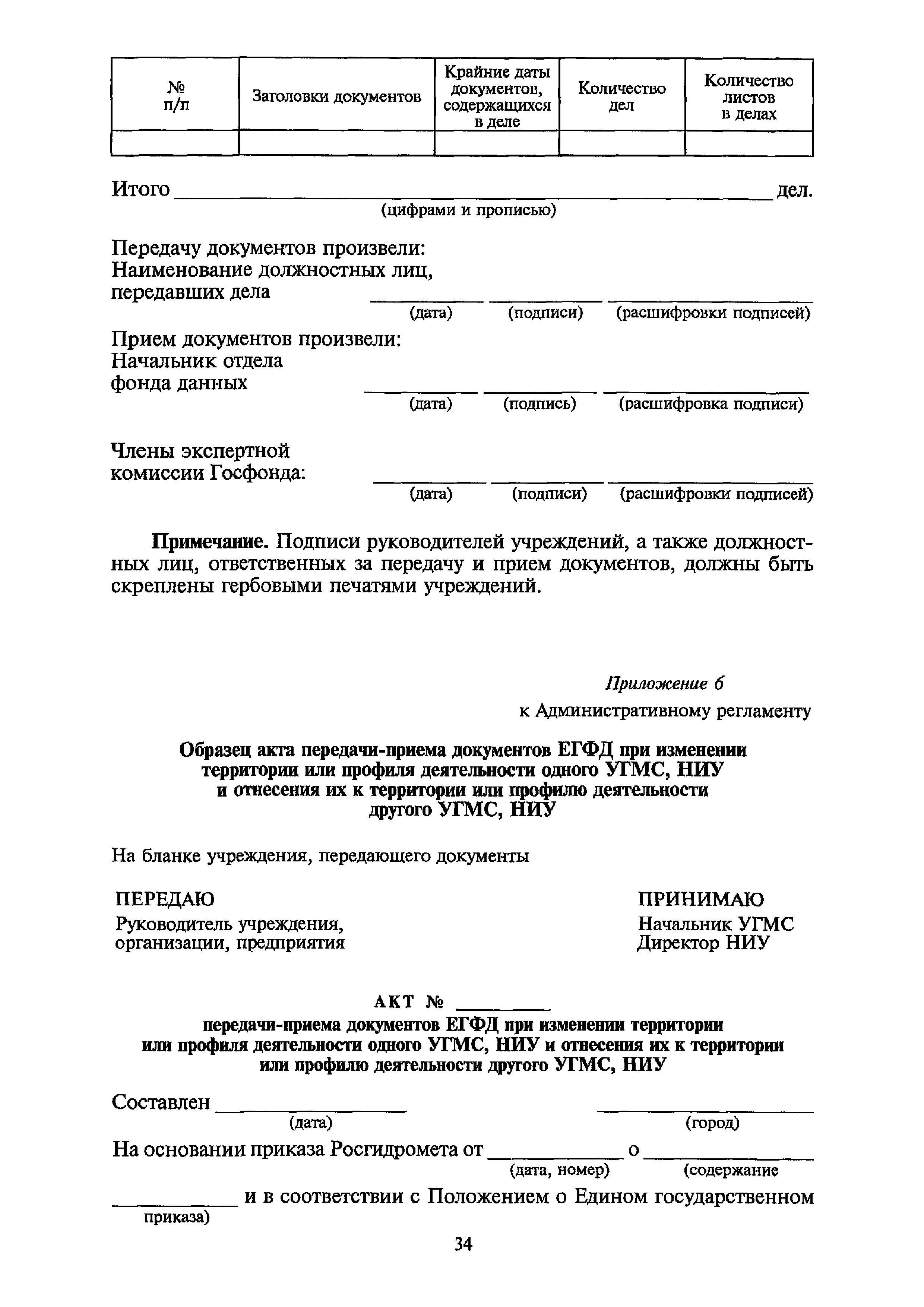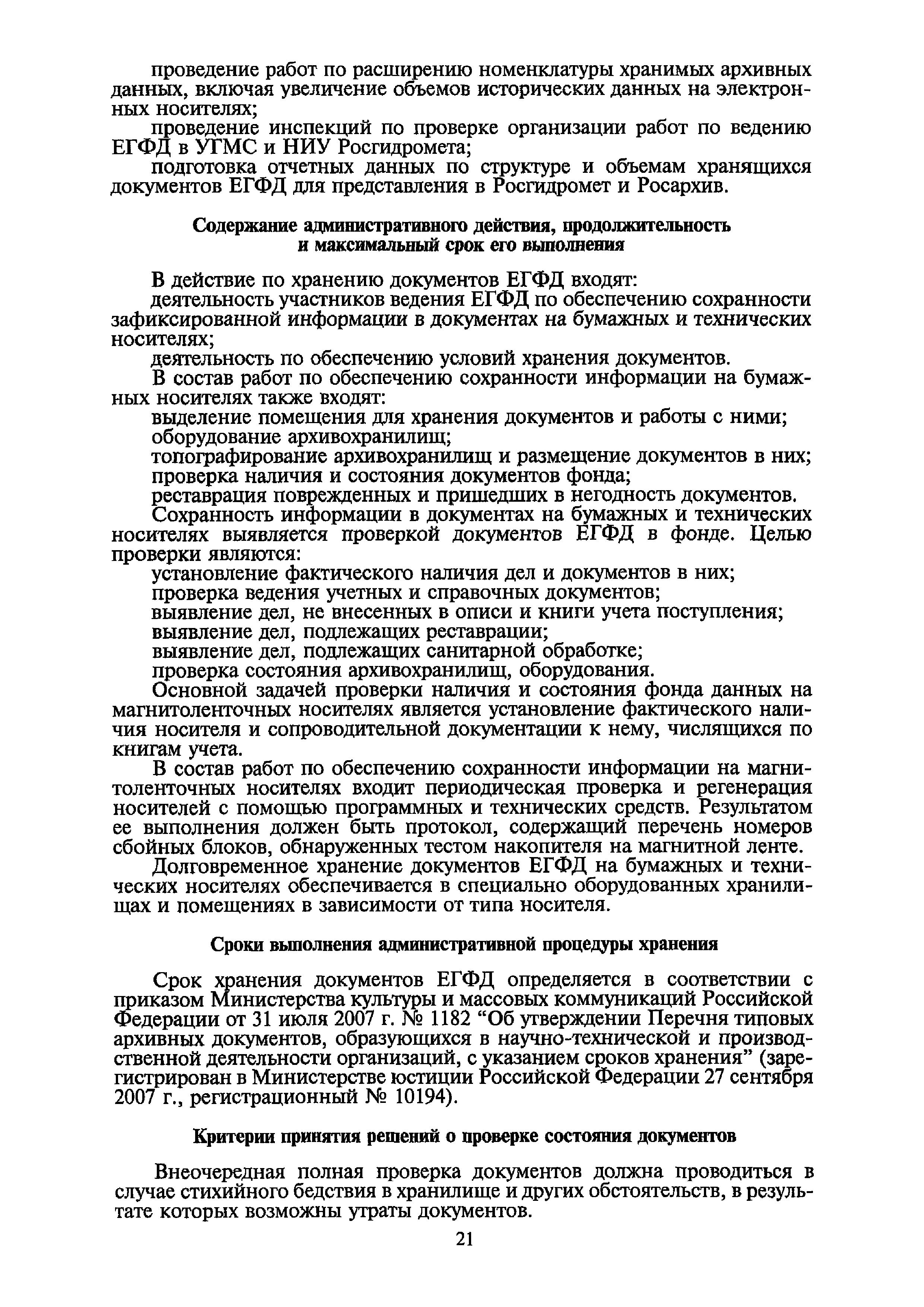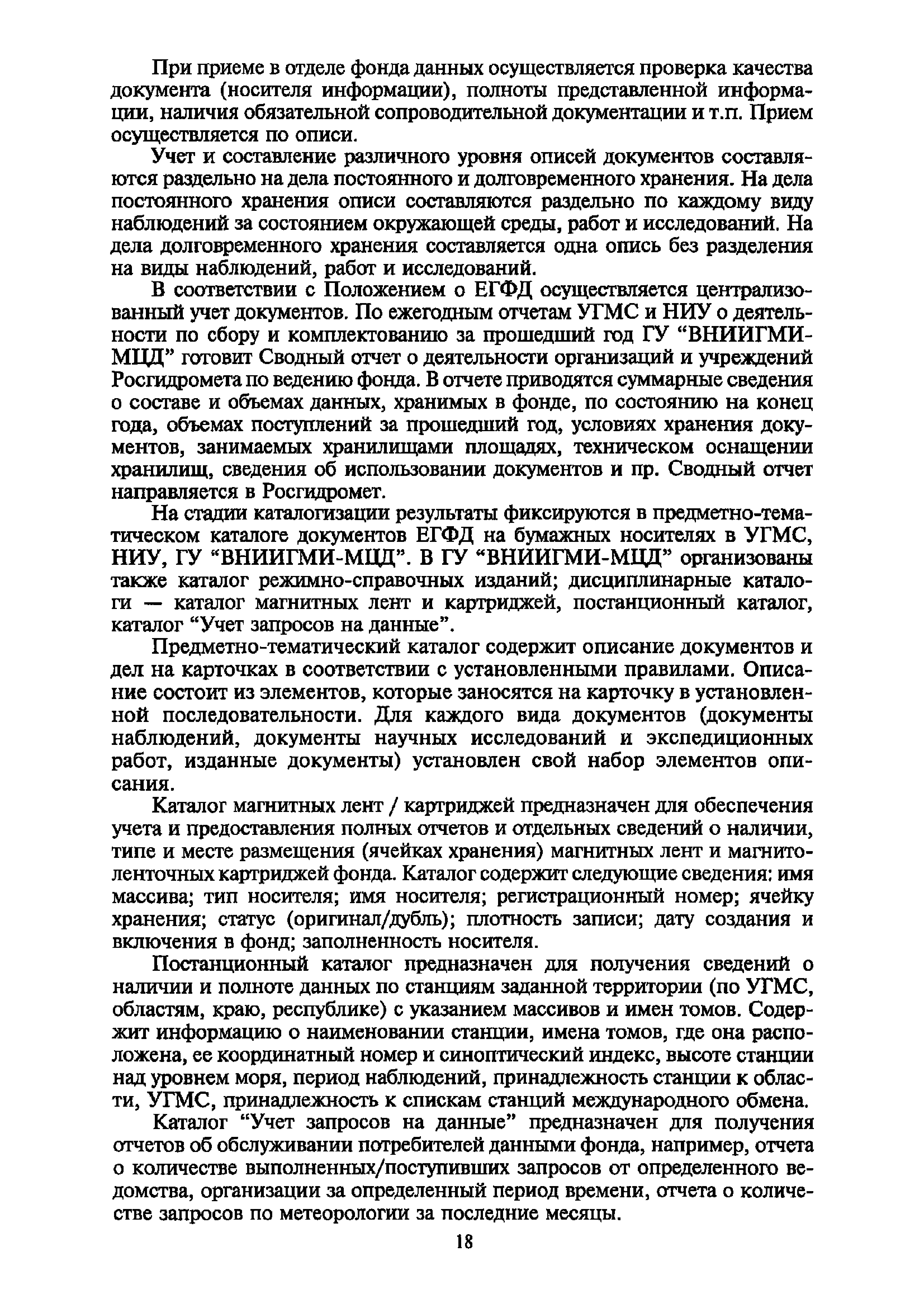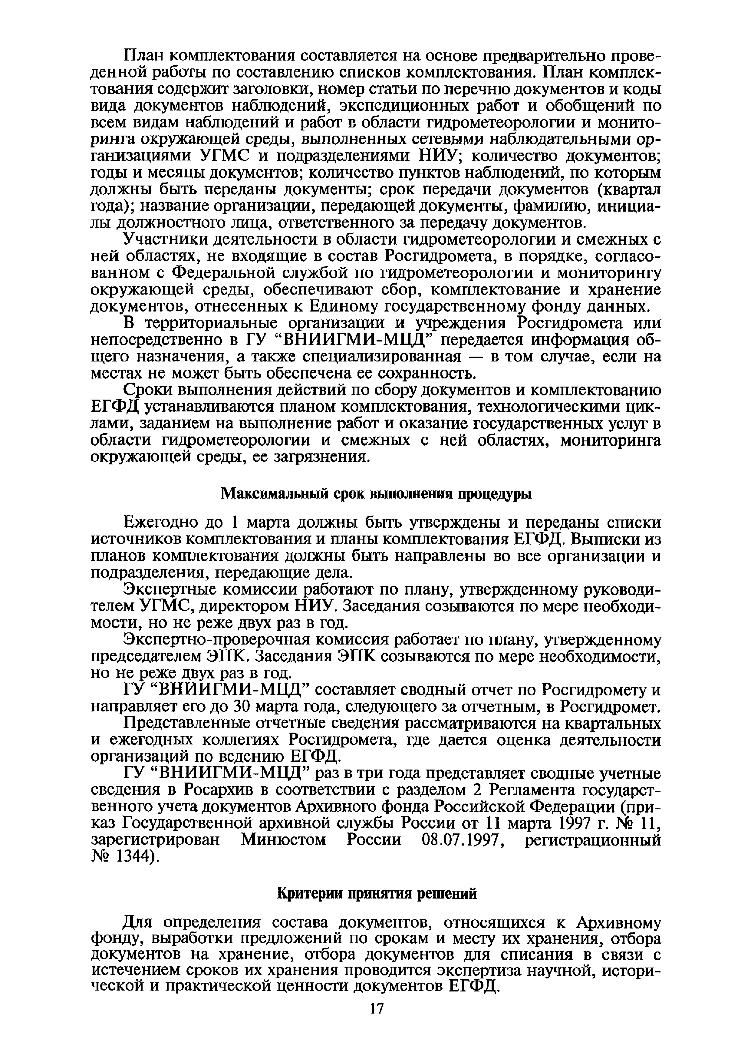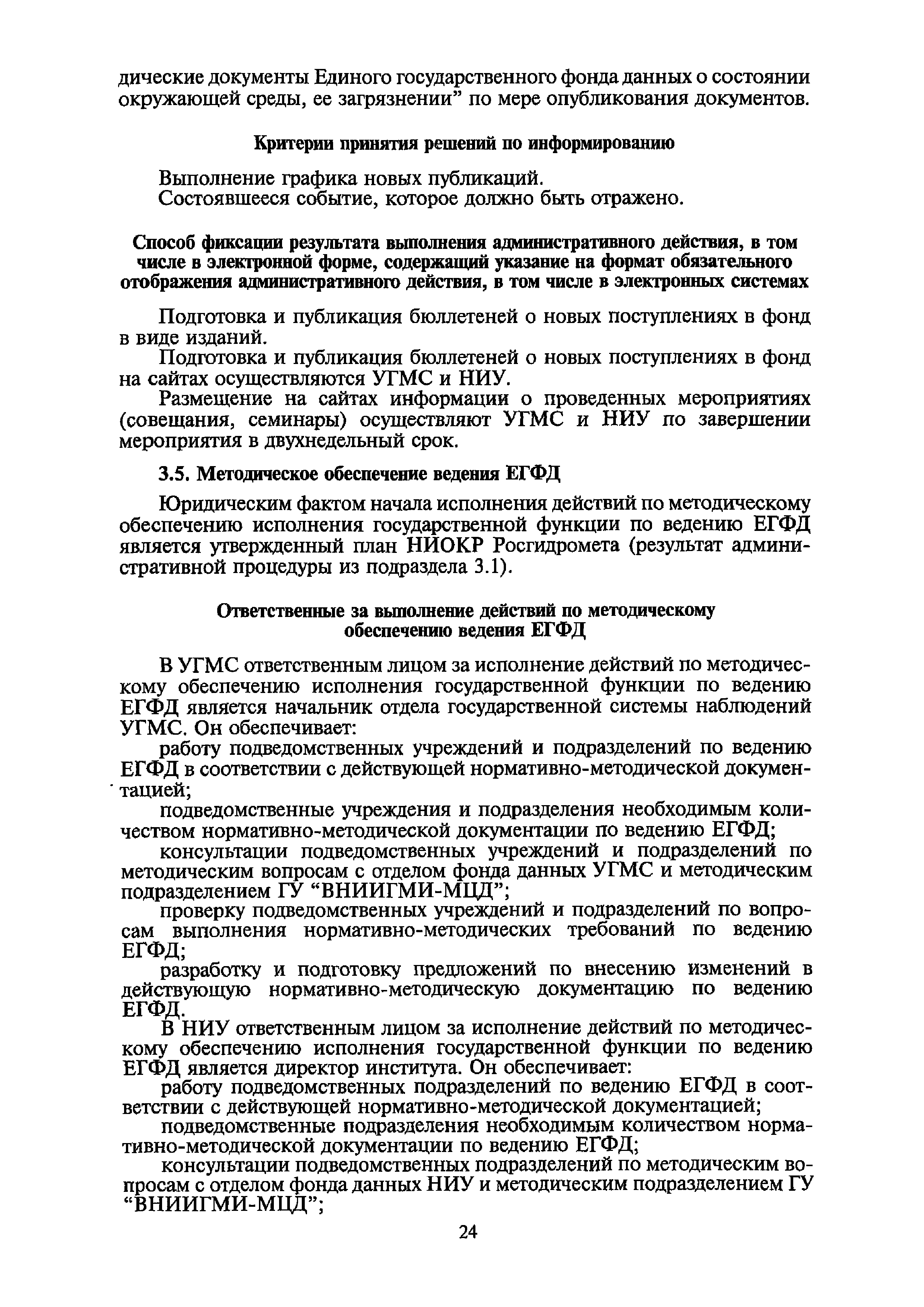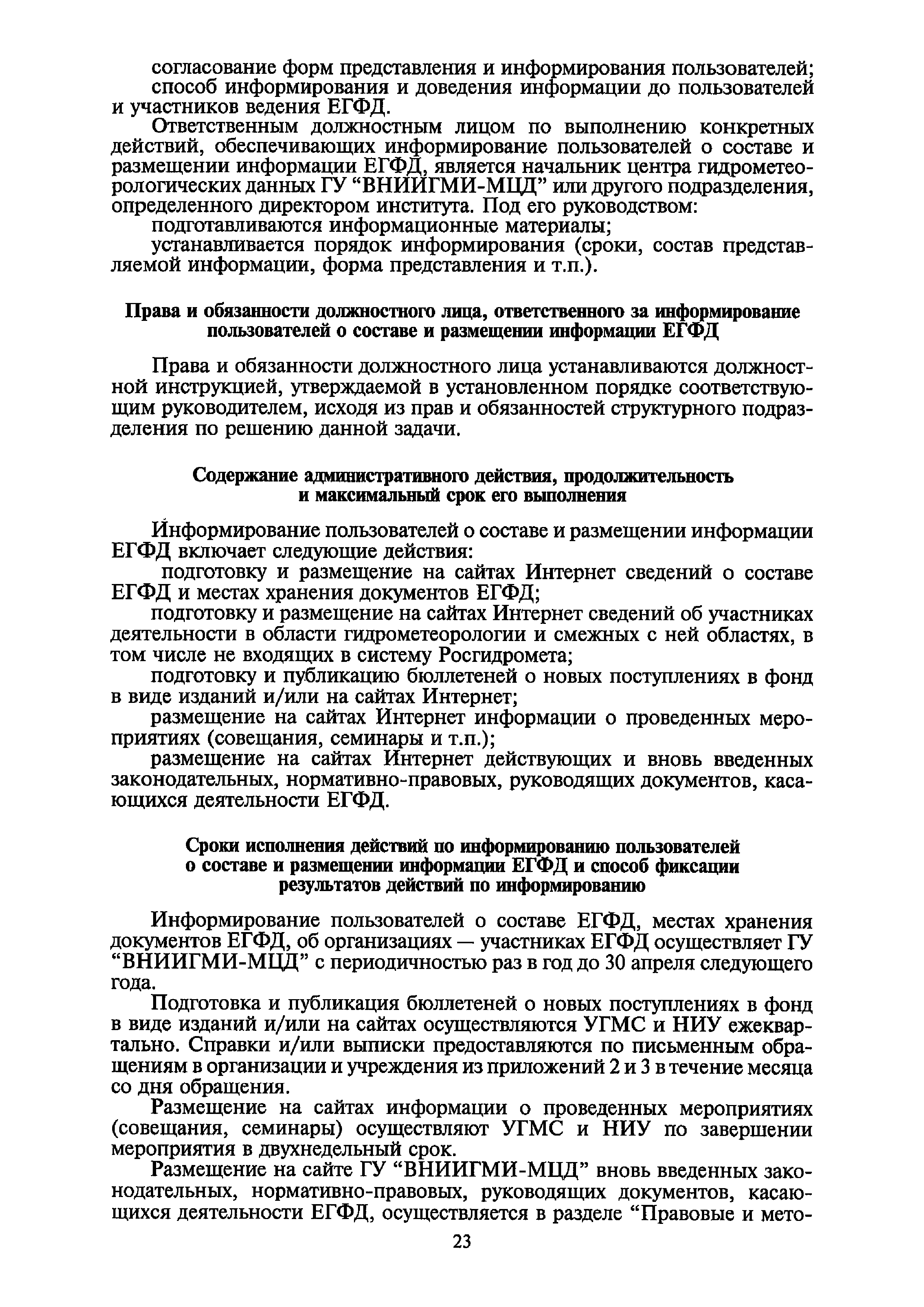 | Оглавление: | I. Общие положения II. Требования к порядку исполнения государственной функции III. Административные процедуры IV. Порядок и формы контроля за исполнением государственной функции V. Порядок обжалования действий (бездействия) и решений, осуществляемых и принятых в ходе выполнения государственной функции Приложение 1. Общая схема обеспечения выполнения государственной функции по ведению ЕГФД Приложение 2. Территориальные органы Росгидромета и закрепленные за ними территории Приложение 3. Список научно-исследовательских учреждений Росгидромета осуществляющих функцию ведения ЕГФД Приложение 4. Наблюдения за параметрами окружающей среды, включая виды информации Приложение 5. Образец акта передачи-приема документов ЕГФД в ОФД УГМС/НИУ Росгидромета или ЦГМД ГУ "ВНИИГМИ-МЦД" Приложение 6. Образец акта передачи-приема документов ЕГФД при изменении территории или профиля деятельности одного УГМС, НИУ и отнесения их к территории или профилю деятельности другого УГМС, НИУ Приложение 7. Образец структуры ежегодного отчета участника деятельности по ведению Российского государственного фонда данных о состоянии окружающей среды Приложение 8. Сведения о составе документов Госфонда Приложение 9. Образец акта о выделении к уничтожению документов Госфонда по территории деятельности УГМС, профилю деятельности НИУ, не подлежащих дальнейшему хранению Приложение 10. Образец листа проверки наличия и состояния документов Госфонда Приложение 11. Образец акта проверки наличия и состояния документов Госфонда |