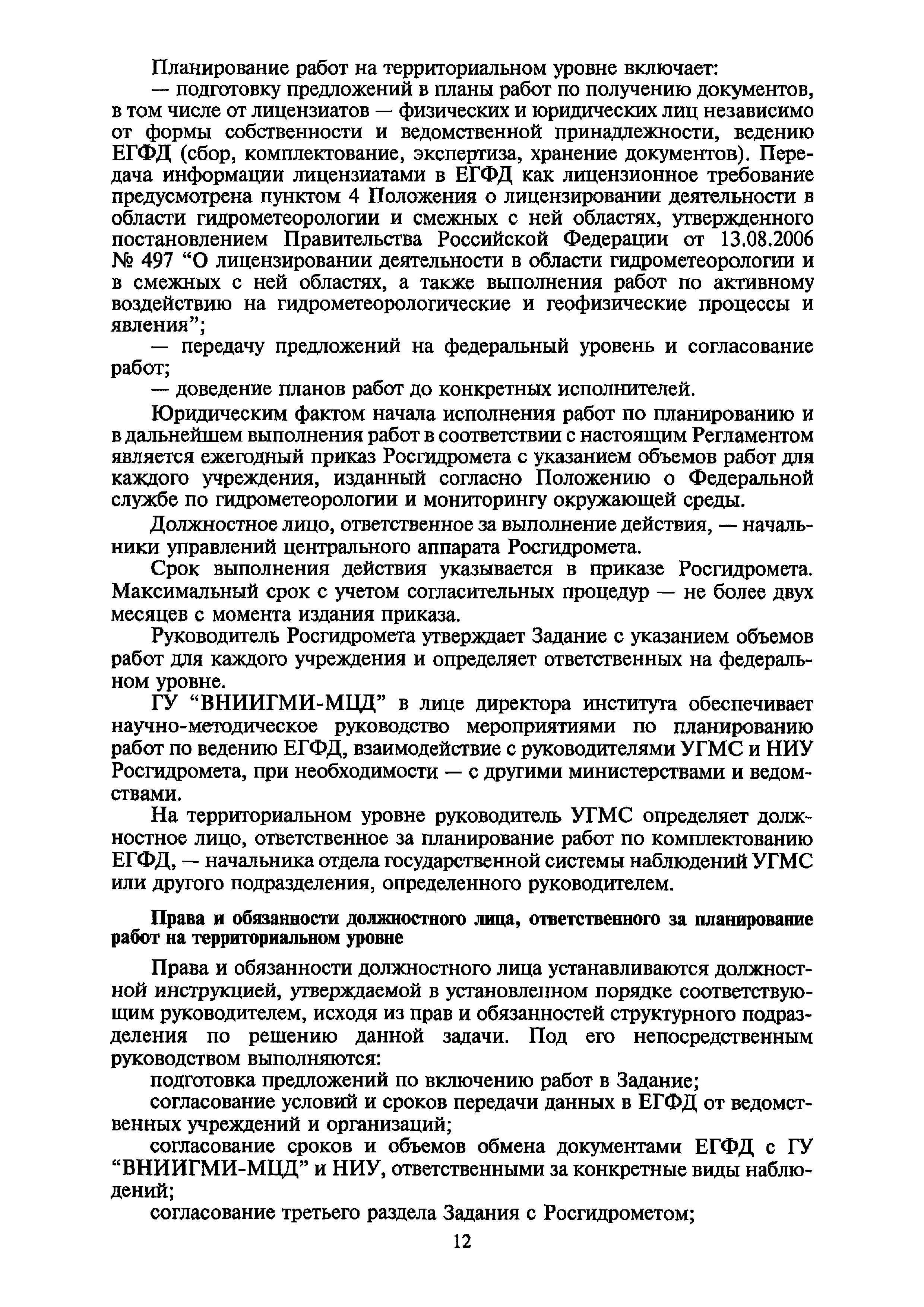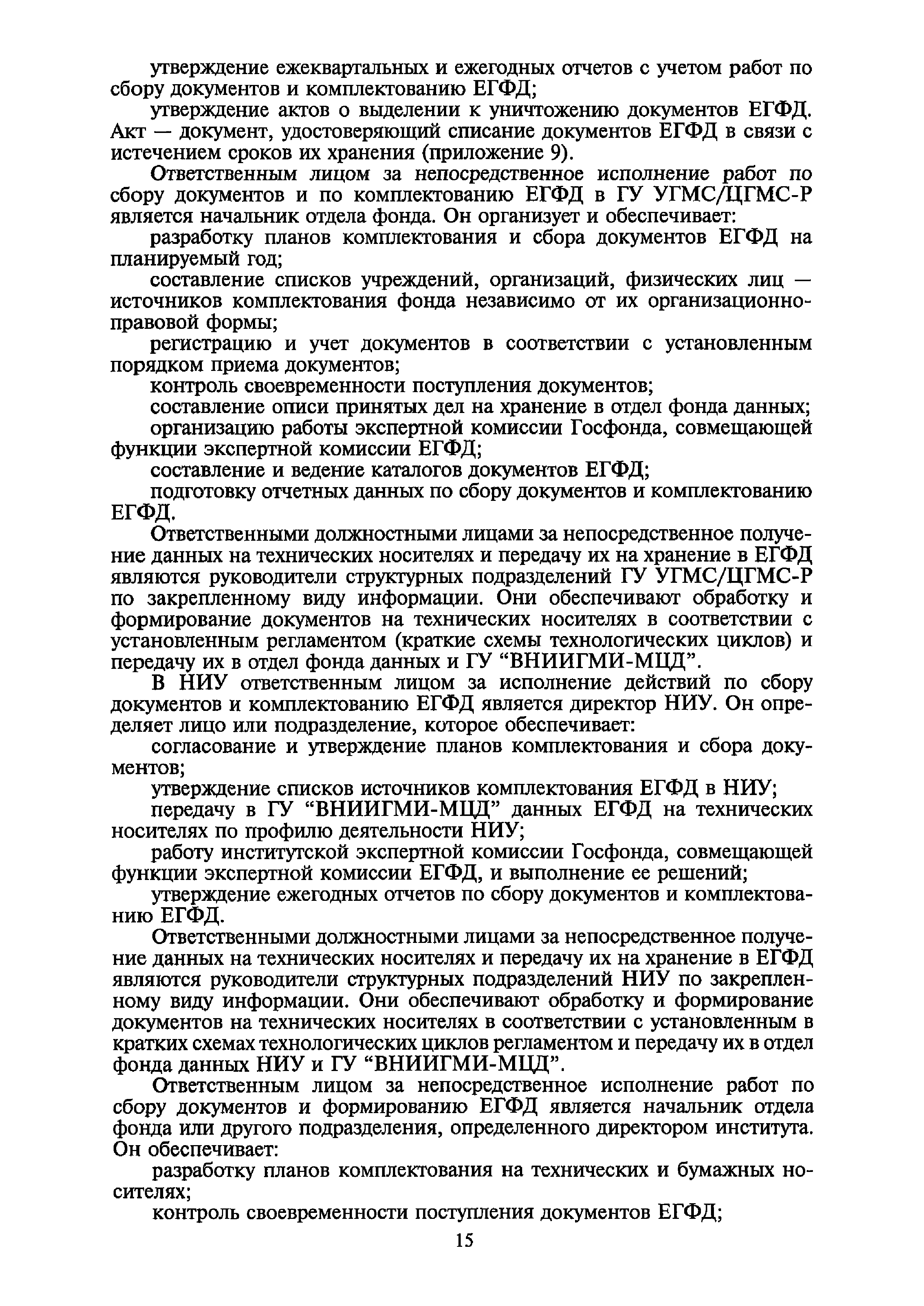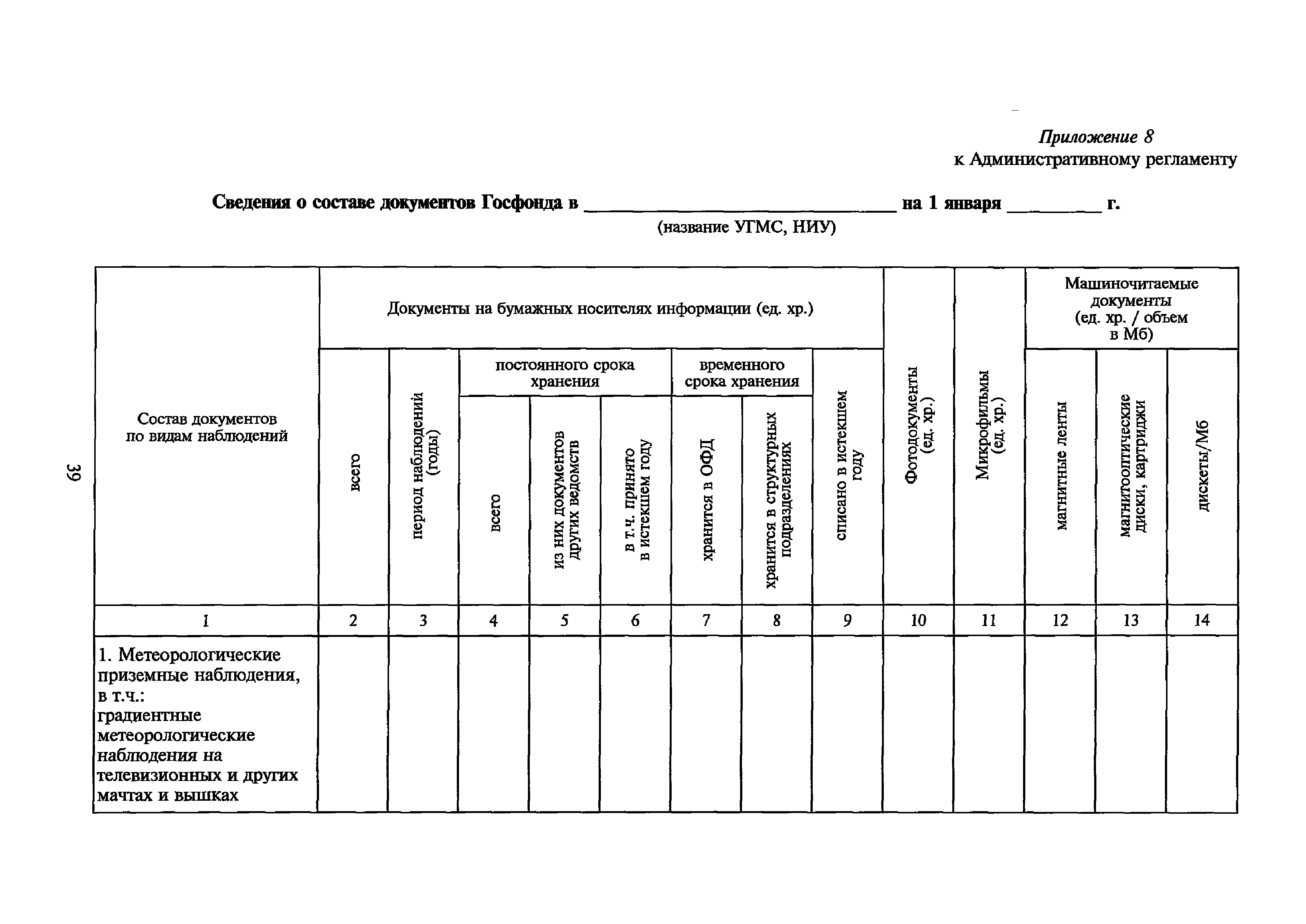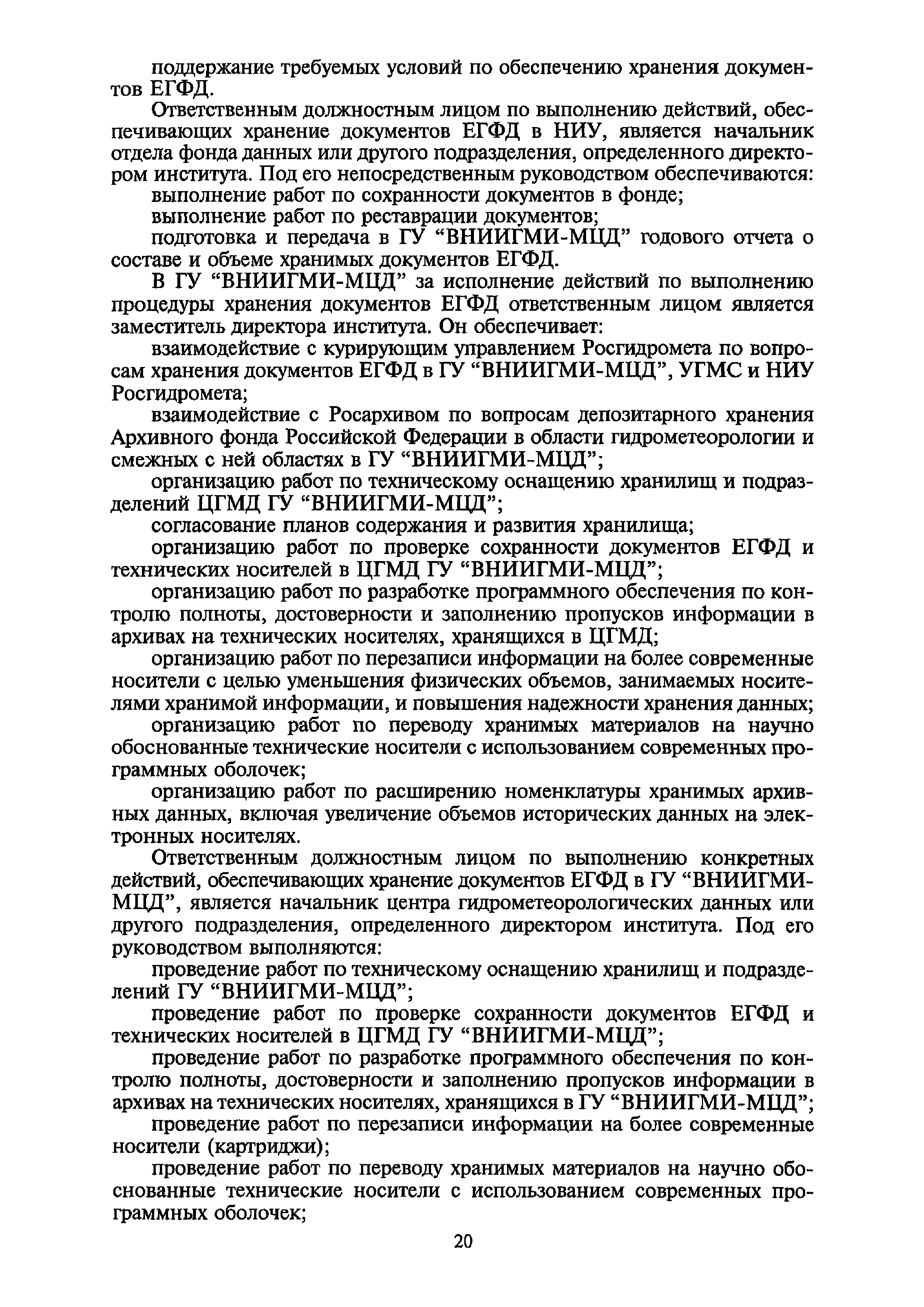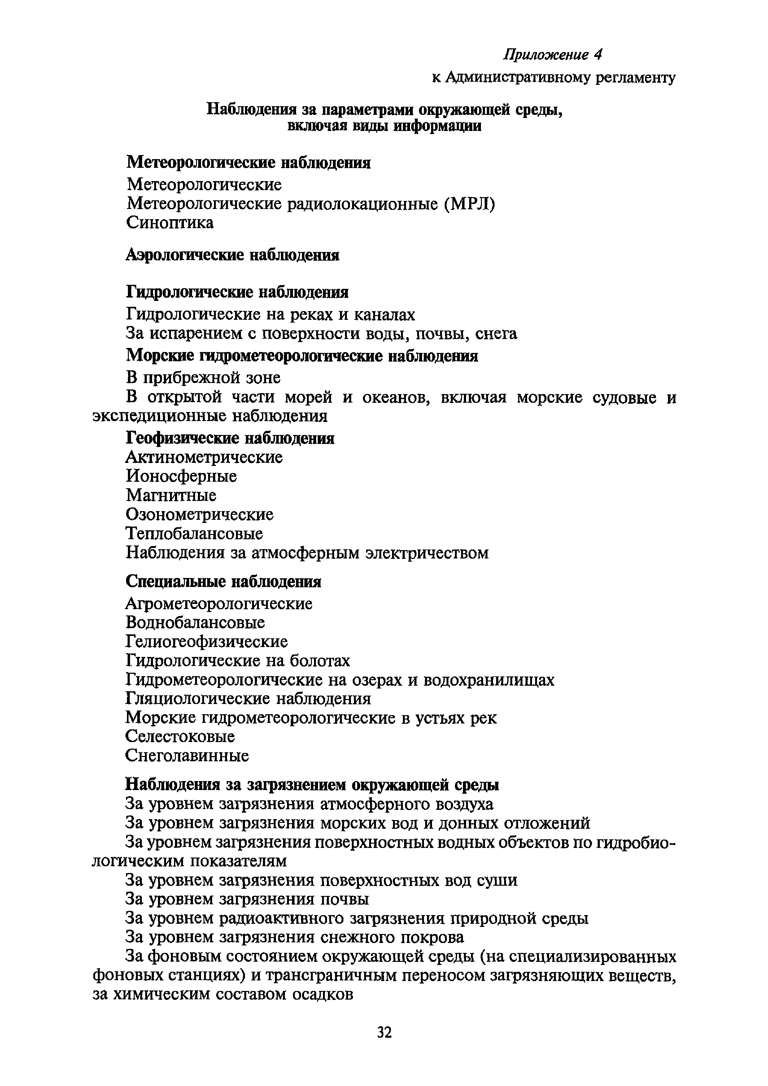 | Оглавление: | I. Общие положения II. Требования к порядку исполнения государственной функции III. Административные процедуры IV. Порядок и формы контроля за исполнением государственной функции V. Порядок обжалования действий (бездействия) и решений, осуществляемых и принятых в ходе выполнения государственной функции Приложение 1. Общая схема обеспечения выполнения государственной функции по ведению ЕГФД Приложение 2. Территориальные органы Росгидромета и закрепленные за ними территории Приложение 3. Список научно-исследовательских учреждений Росгидромета осуществляющих функцию ведения ЕГФД Приложение 4. Наблюдения за параметрами окружающей среды, включая виды информации Приложение 5. Образец акта передачи-приема документов ЕГФД в ОФД УГМС/НИУ Росгидромета или ЦГМД ГУ "ВНИИГМИ-МЦД" Приложение 6. Образец акта передачи-приема документов ЕГФД при изменении территории или профиля деятельности одного УГМС, НИУ и отнесения их к территории или профилю деятельности другого УГМС, НИУ Приложение 7. Образец структуры ежегодного отчета участника деятельности по ведению Российского государственного фонда данных о состоянии окружающей среды Приложение 8. Сведения о составе документов Госфонда Приложение 9. Образец акта о выделении к уничтожению документов Госфонда по территории деятельности УГМС, профилю деятельности НИУ, не подлежащих дальнейшему хранению Приложение 10. Образец листа проверки наличия и состояния документов Госфонда Приложение 11. Образец акта проверки наличия и состояния документов Госфонда |