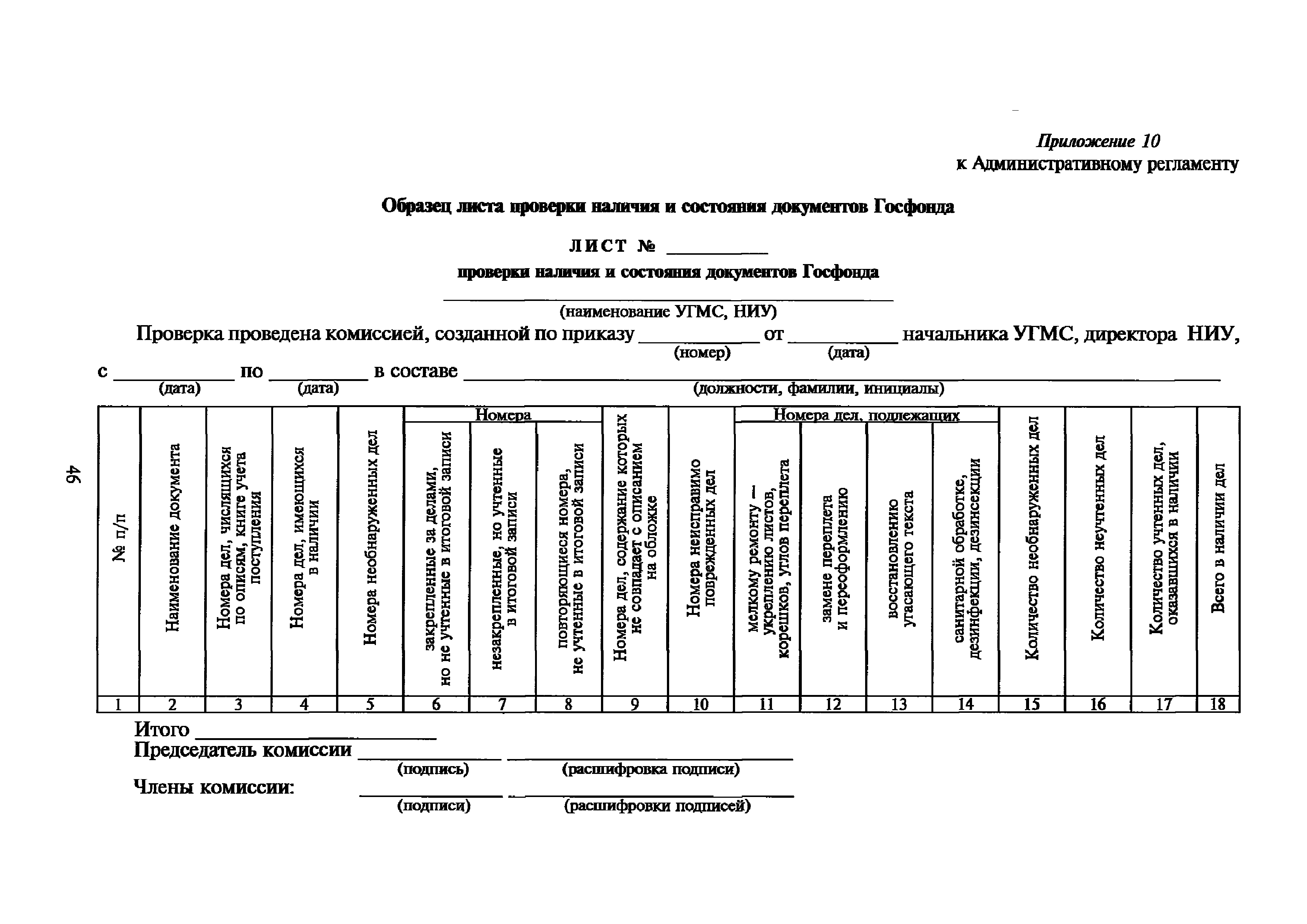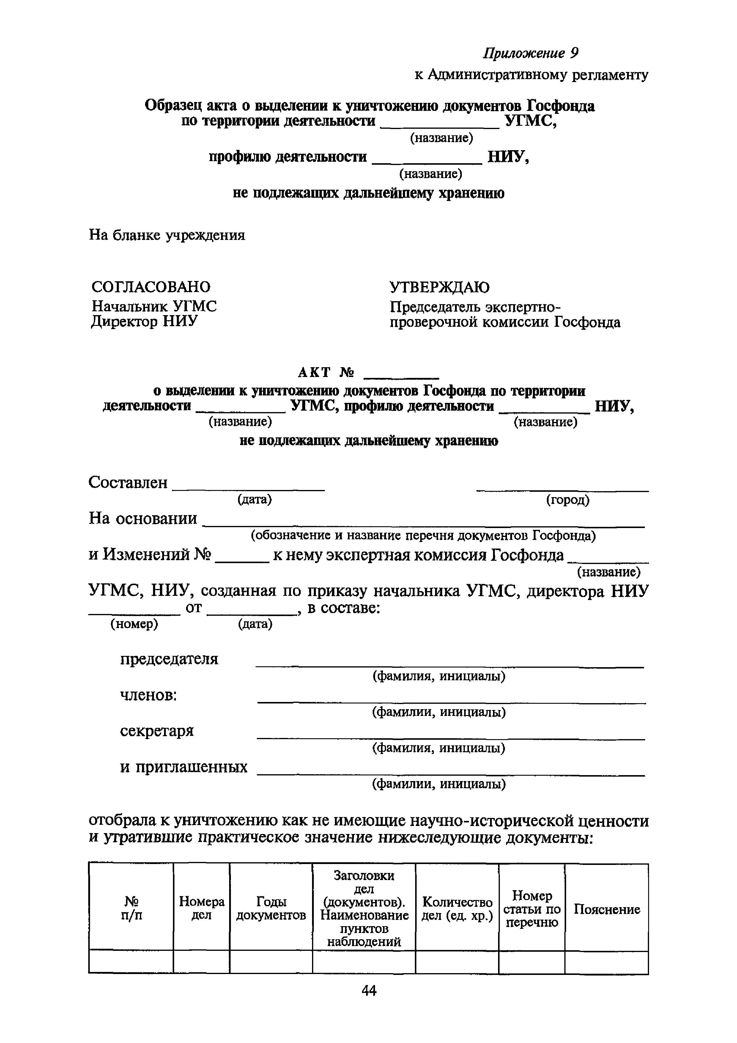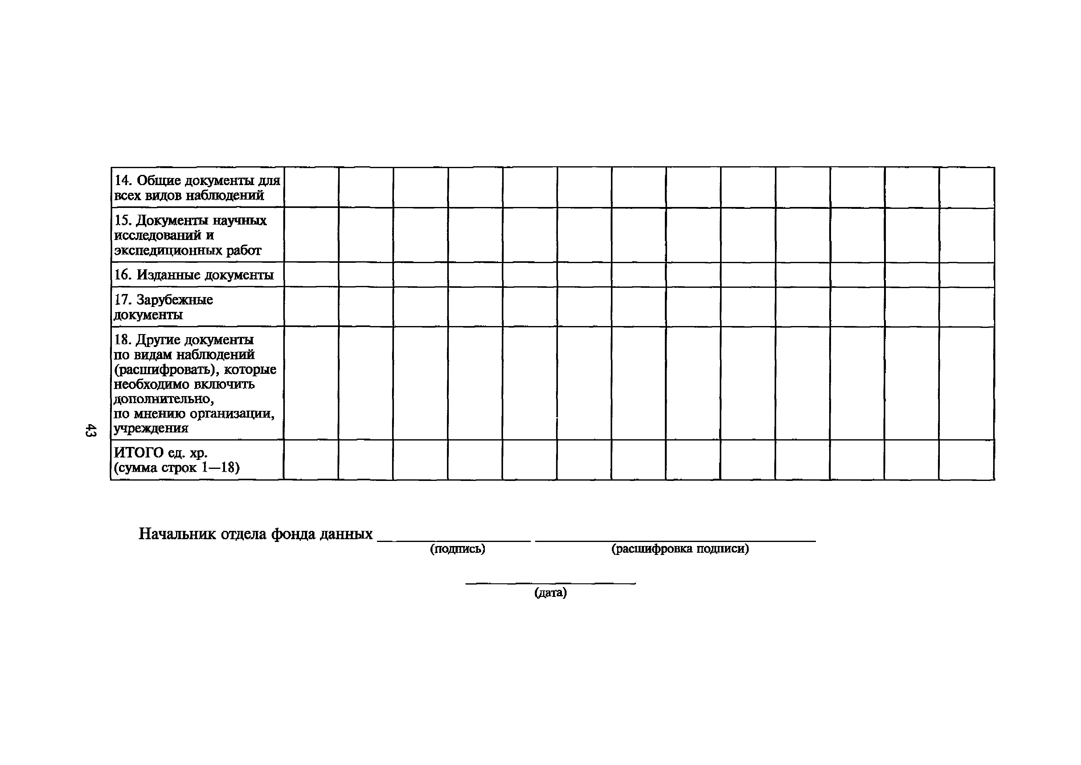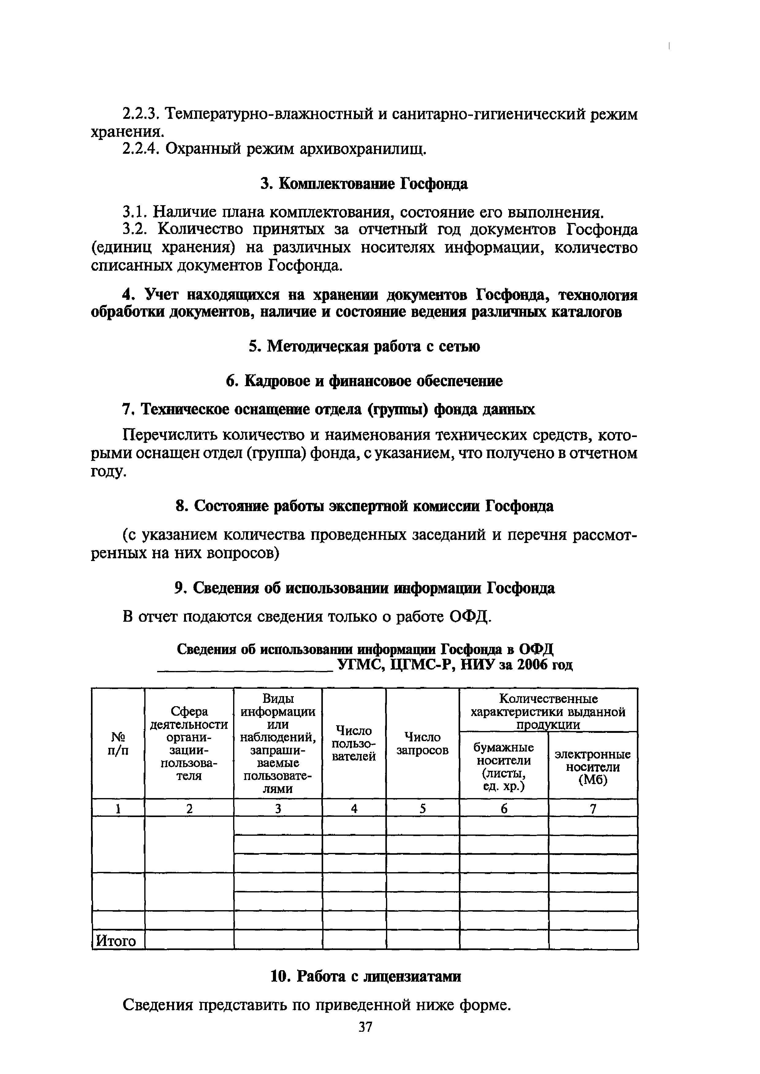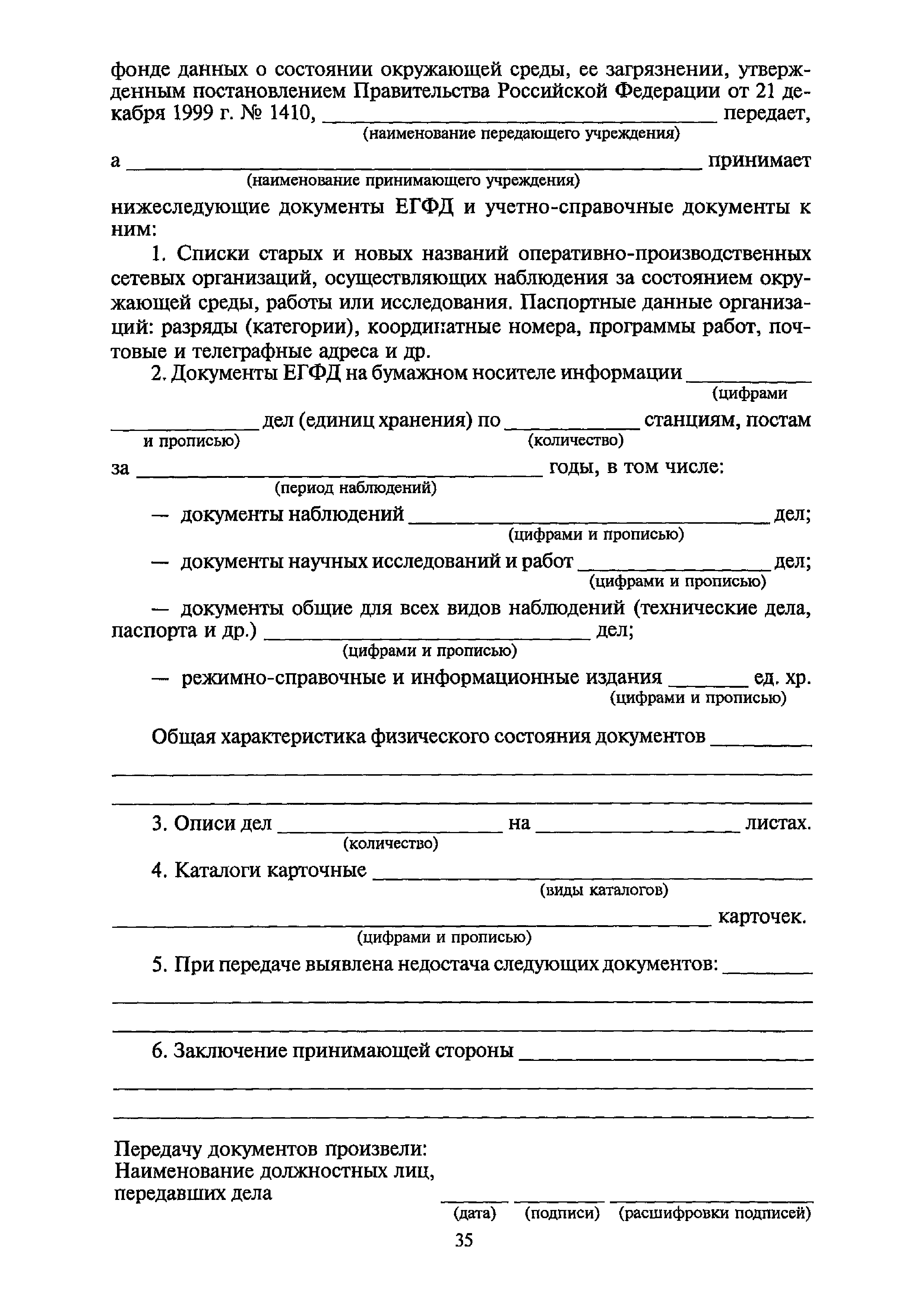 | Оглавление: | I. Общие положения II. Требования к порядку исполнения государственной функции III. Административные процедуры IV. Порядок и формы контроля за исполнением государственной функции V. Порядок обжалования действий (бездействия) и решений, осуществляемых и принятых в ходе выполнения государственной функции Приложение 1. Общая схема обеспечения выполнения государственной функции по ведению ЕГФД Приложение 2. Территориальные органы Росгидромета и закрепленные за ними территории Приложение 3. Список научно-исследовательских учреждений Росгидромета осуществляющих функцию ведения ЕГФД Приложение 4. Наблюдения за параметрами окружающей среды, включая виды информации Приложение 5. Образец акта передачи-приема документов ЕГФД в ОФД УГМС/НИУ Росгидромета или ЦГМД ГУ "ВНИИГМИ-МЦД" Приложение 6. Образец акта передачи-приема документов ЕГФД при изменении территории или профиля деятельности одного УГМС, НИУ и отнесения их к территории или профилю деятельности другого УГМС, НИУ Приложение 7. Образец структуры ежегодного отчета участника деятельности по ведению Российского государственного фонда данных о состоянии окружающей среды Приложение 8. Сведения о составе документов Госфонда Приложение 9. Образец акта о выделении к уничтожению документов Госфонда по территории деятельности УГМС, профилю деятельности НИУ, не подлежащих дальнейшему хранению Приложение 10. Образец листа проверки наличия и состояния документов Госфонда Приложение 11. Образец акта проверки наличия и состояния документов Госфонда |