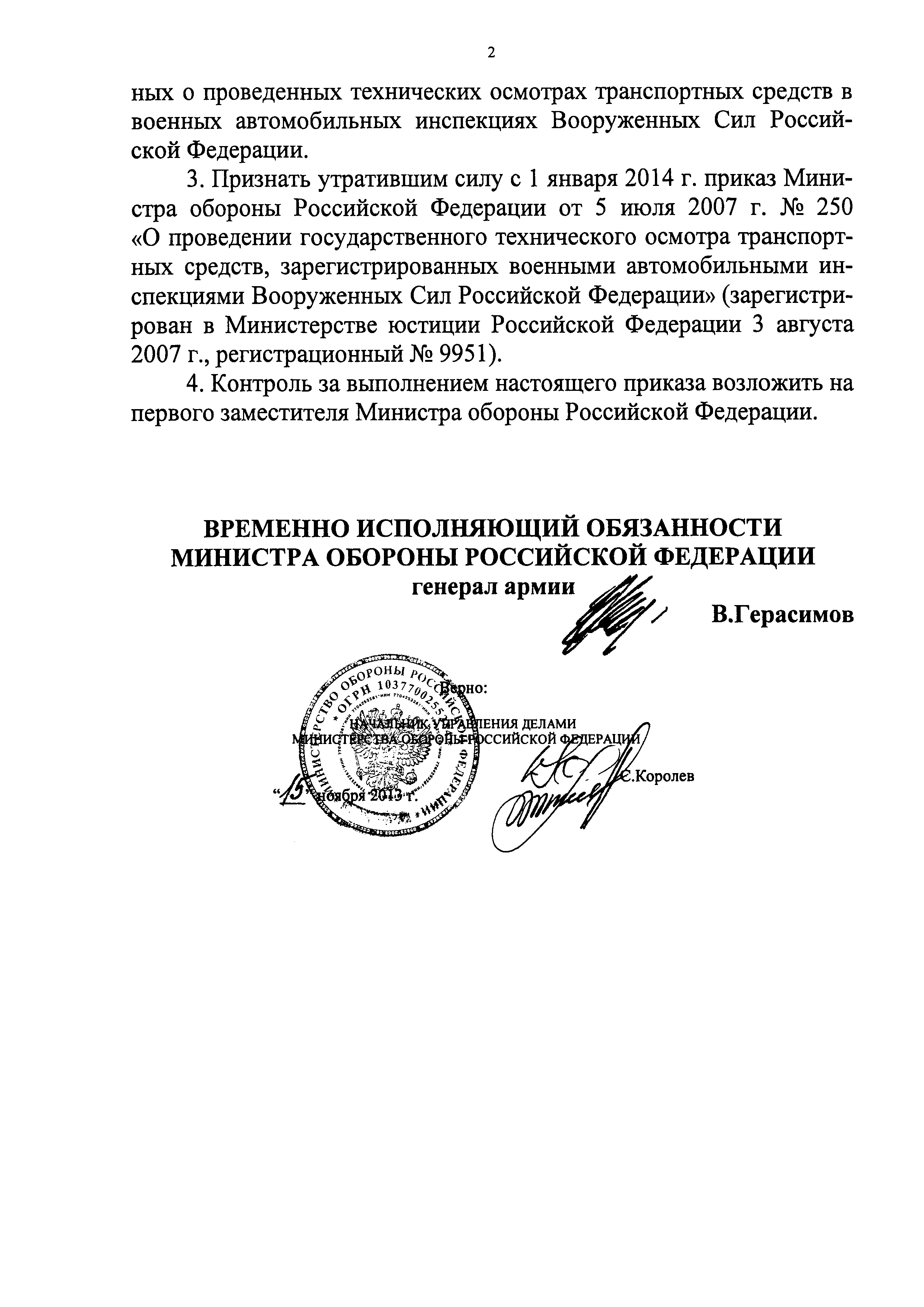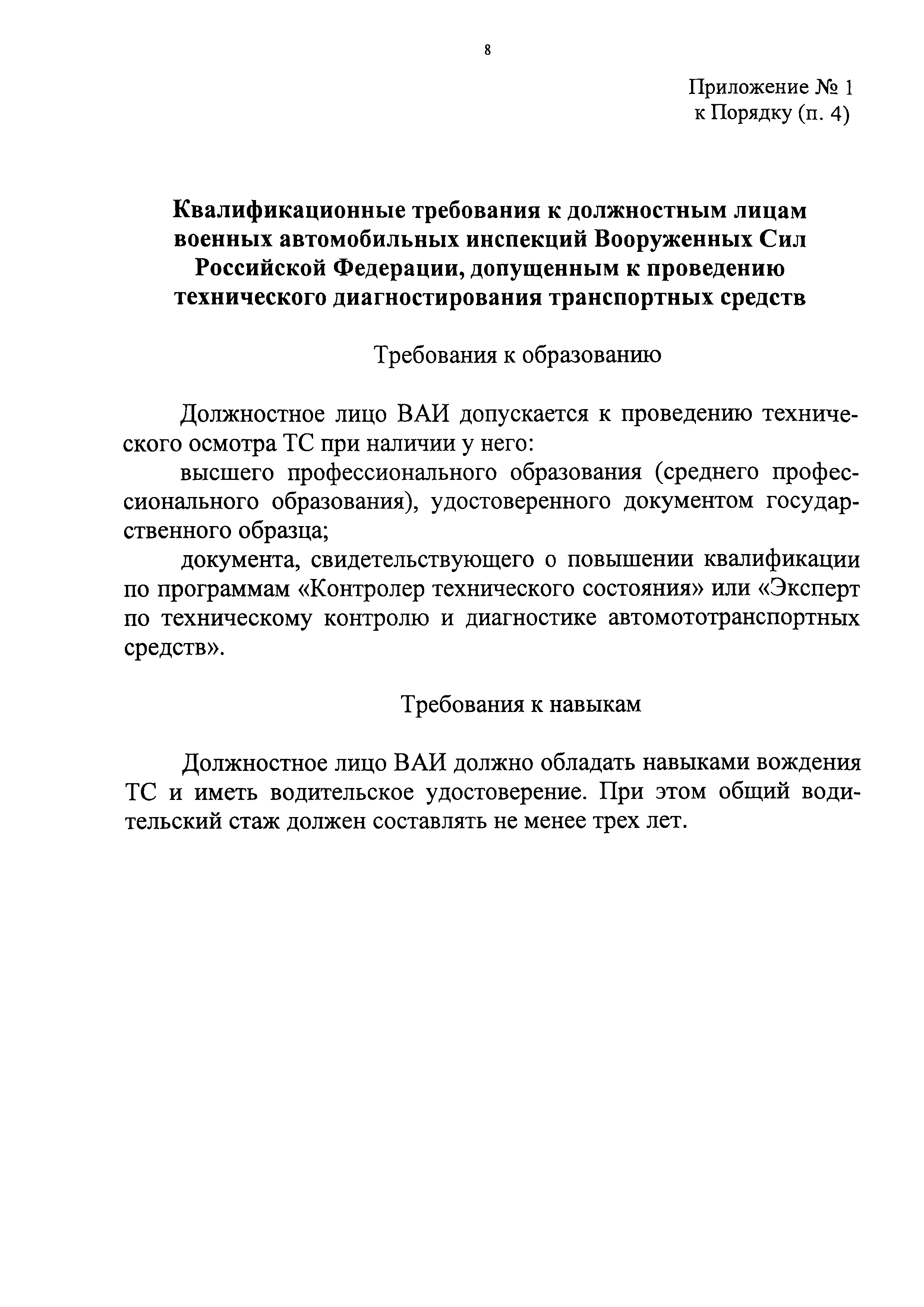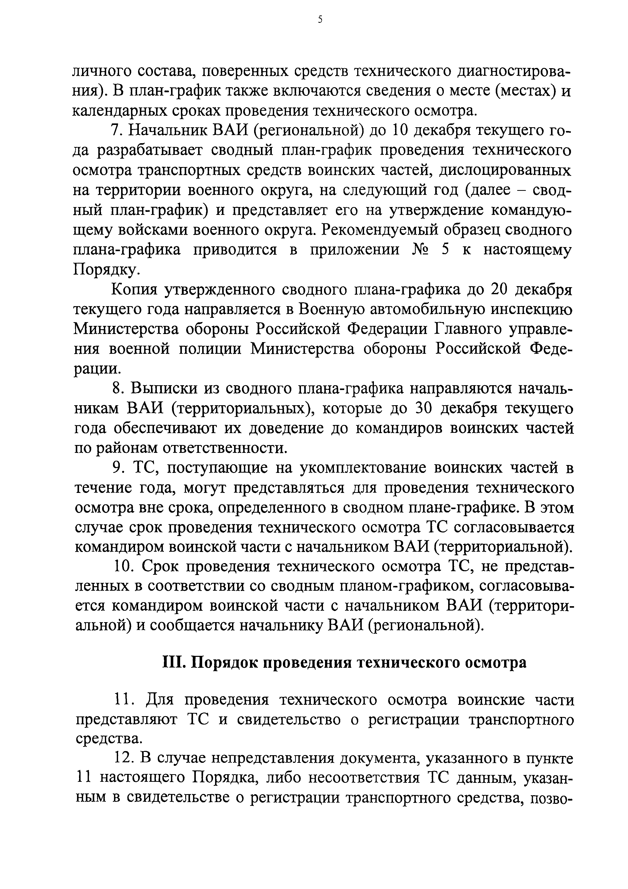 Порядок проведения технического осмотра транспортных средств, зарегистрированных военными автомобильными инспекциями Вооруженных Сил Российской Федерации| Статус: | действует | | Название рус.: | Порядок проведения технического осмотра транспортных средств, зарегистрированных военными автомобильными инспекциями Вооруженных Сил Российской Федерации | | Дата добавления в базу: | 05.05.2017 | | Дата актуализации: | 01.01.2021 | | Дата введения: | 10.01.2014 | | Область применения: | Порядок устанавливает требования по организации и проведению в Вооруженных Силах Российской Федерации технического осмотра транспортных средств, тракторов, самоходных дорожно-строительных и иных машин воинских частей и организаций Вооруженных Сил Российской Федерации, зарегистрированных военными автомобильными инспекциями Вооруженных Сил Российской Федерации | | Оглавление: | I. Общие положения II. Мероприятия по организации и планированию технического осмотра III. Порядок проведения технического осмотра IV. Оформление результатов технического осмотра Приложение № 1. Квалификационные требования к должностным лицам военных автомобильных инспекций Вооруженных Сил Российской Федерации, допущенным к проведению технического диагностирования транспортных средств Приложение № 2. Перечень средств технического диагностирования, используемых при проведении технического осмотра транспортных средств Приложение № 3. Заявка на проведение технического осмотра транспортных средств войсковой части Приложение № 4. План-график проведения технического осмотра транспортных средств воинских частей в районе ответственности ВАИ (территориальной) Приложение № 5. Сводный план-график проведения технического осмотра транспортных средств воинских частей, дислоцированных на территории военного округа | | Утверждён: | 14.11.2013 Министр обороны Российской Федерации (820)
