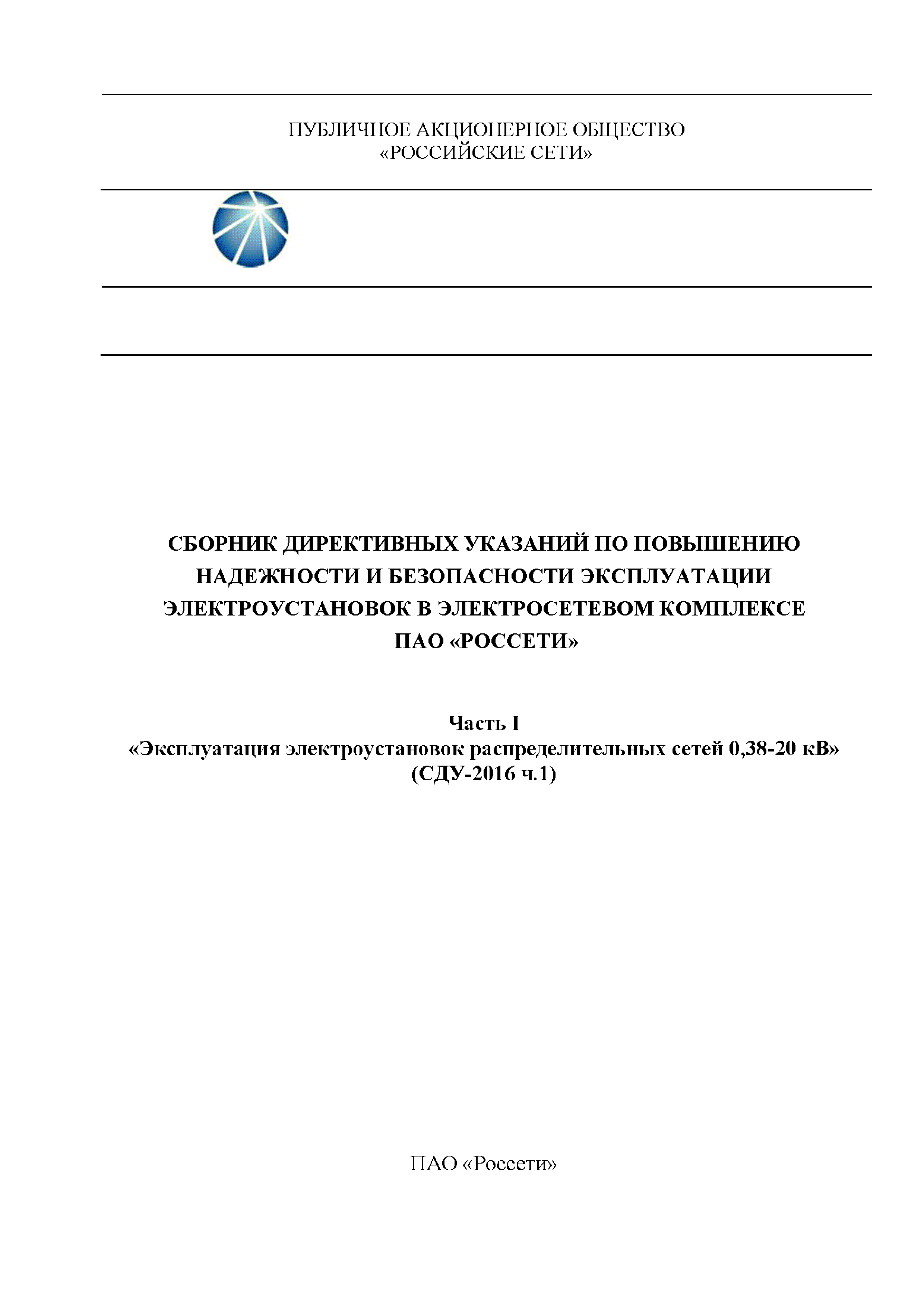 | Название рус.: | Сборник директивных указаний по повышению надежности и безопасности эксплуатации электроустановок в электросетевом комплексе ПАО "РОССЕТИ". Часть I. "Эксплуатация электроустановок распределительных сетей 0,38 - 20 кВ" (СДУ-2016 ч.1) |