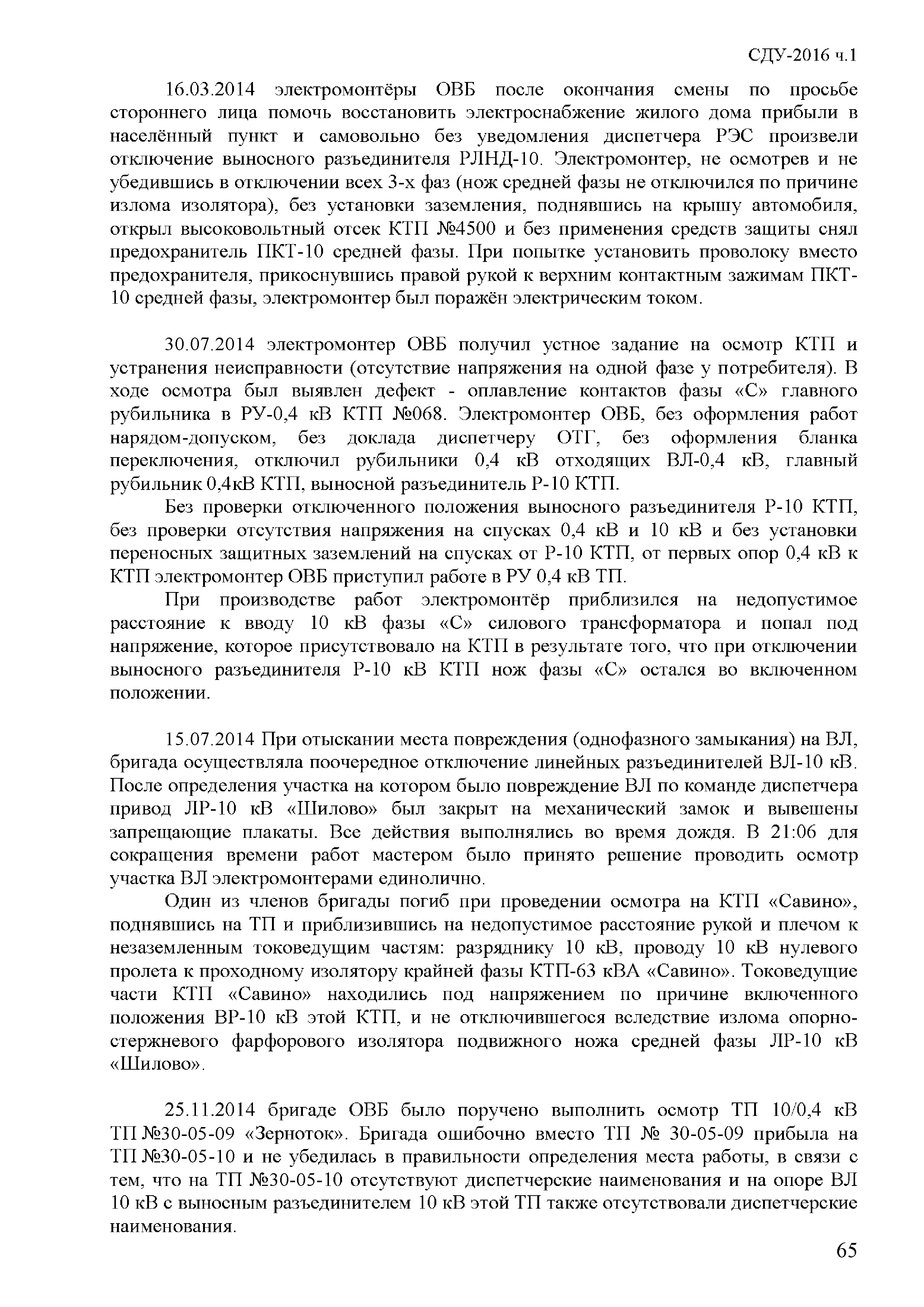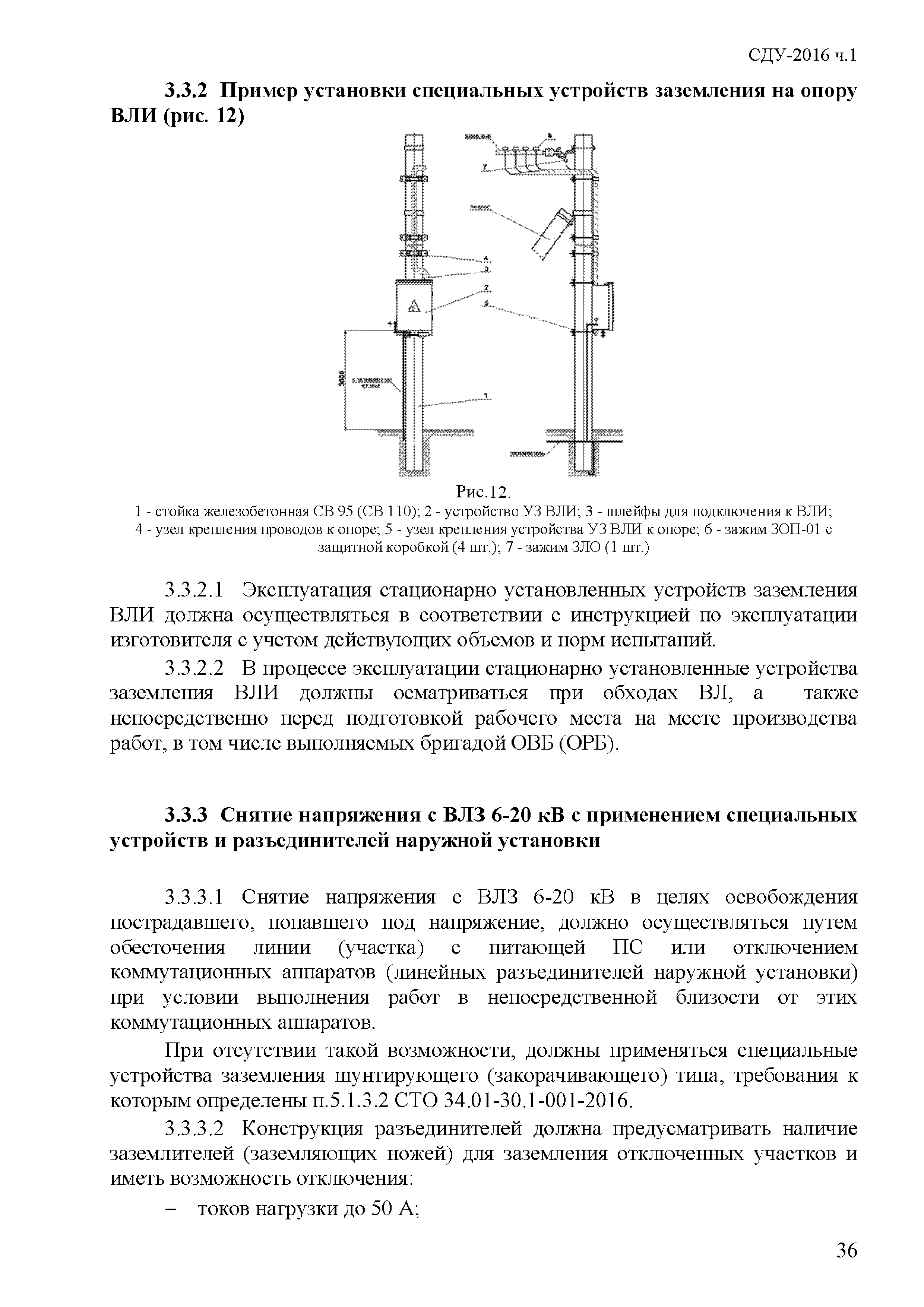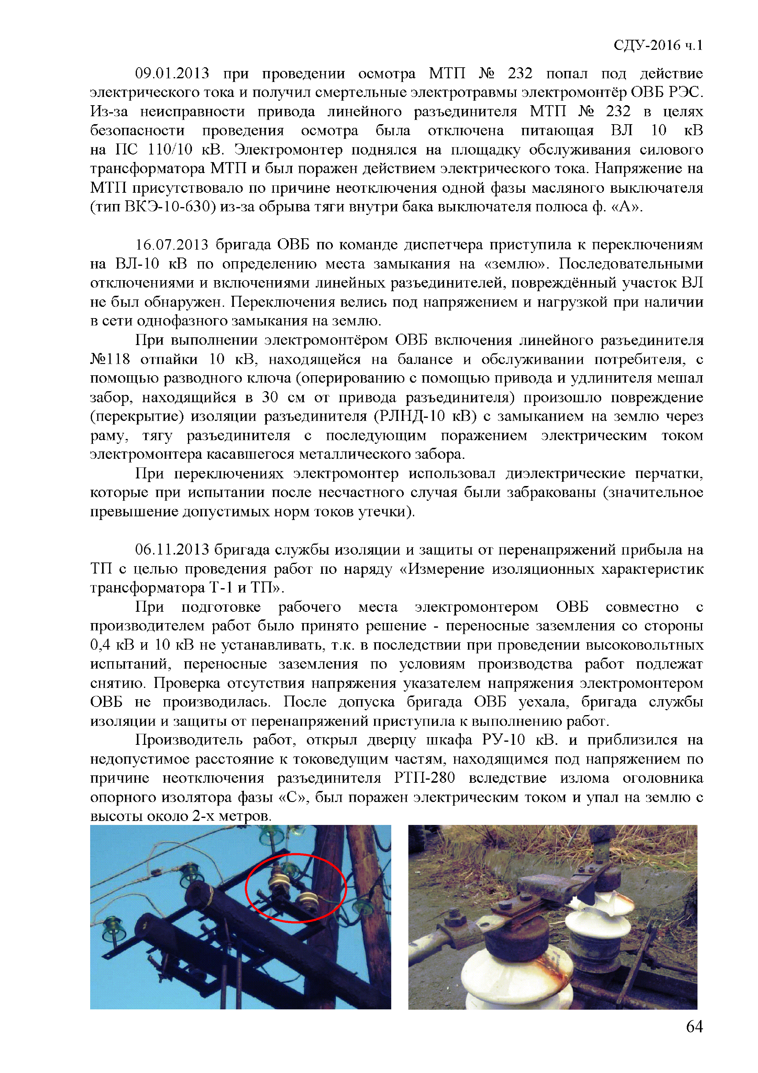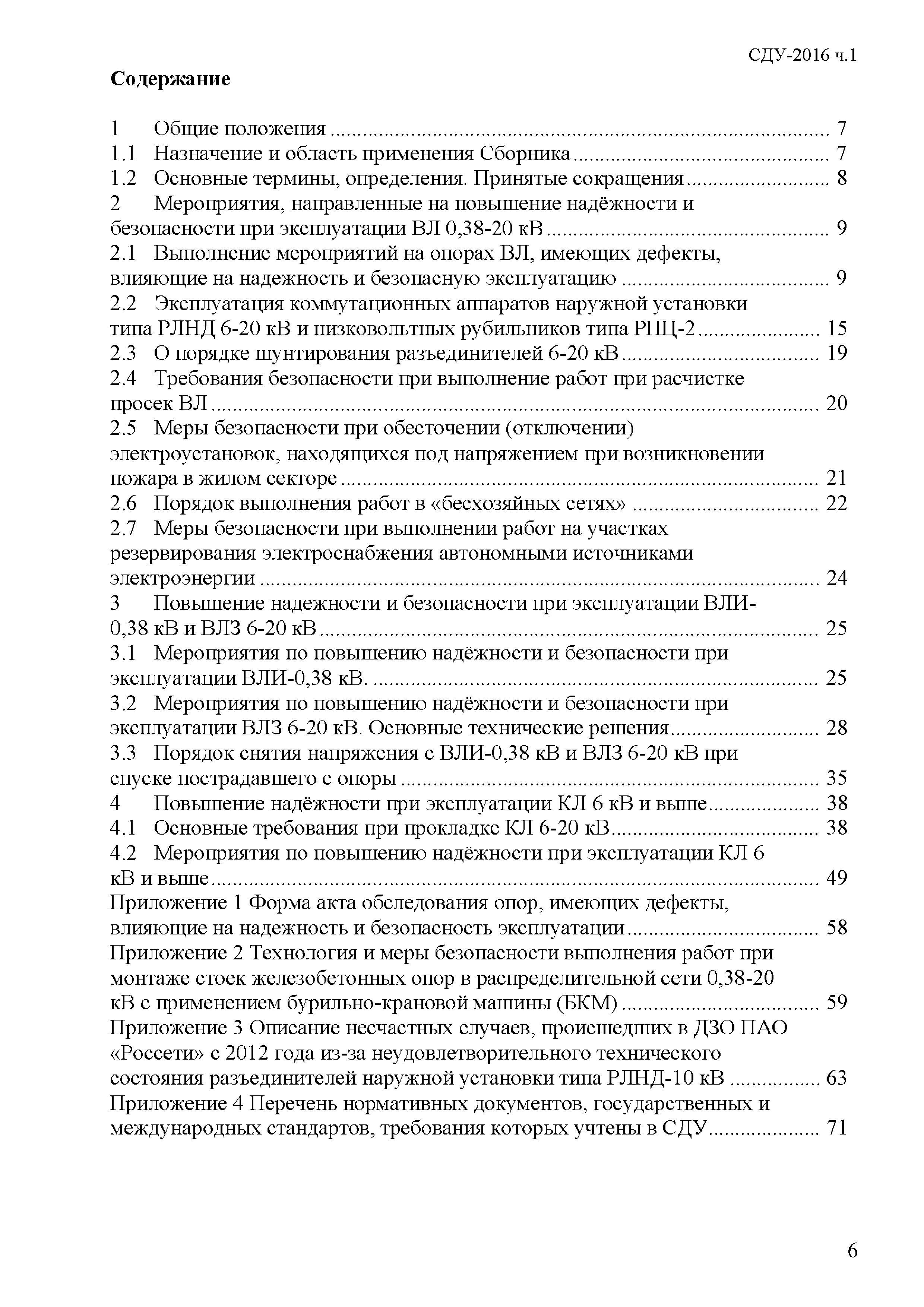 | Оглавление: | 1 Общие положения . 1.1 Назначение и область применения Сборника 1.2 Основные термины, определения. Принятые сокращения 2 Мероприятия, направленные на повышение надёжности и безопасности при эксплуатации ВЛ 0,38 - 20 кВ 2.1 Выполнение мероприятий на опорах ВЛ, имеющих дефекты, влияющие на надежность и безопасную эксплуатацию 2.2 Эксплуатация коммутационных аппаратов наружной установки типа РЛНД 6 - 20 кВ и низковольтных рубильников типа РПЦ-2 2.3 О порядке шунтирования разъединителей 6 - 20 кВ 2.4 Требования безопасности при выполнение работ при расчистке просек ВЛ 2.5 Меры безопасности при обесточении (отключении) электроустановок, находящихся под напряжением при возникновении пожара в жилом секторе 2.6 Порядок выполнения работ в "бесхозяйных сетях" 2.7 Меры безопасности при выполнении работ на участках резервирования электроснабжения автономными источниками электроэнергии 3 Повышение надежности и безопасности при эксплуатации ВЛИ 0,38 кВ и ВЛЗ 6 - 20 кВ 3.1 Мероприятия по повышению надёжности и безопасности при эксплуатации ВЛИ - 0,38 кВ 3.2 Мероприятия по повышению надёжности и безопасности при эксплуатации ВЛЗ 6 - 20 кВ. Основные технические решения 3.3 Порядок снятия напряжения с ВЛИ-0,38 кВ и ВЛЗ 6 - 20 кВ при спуске пострадавшего с опоры 4 Повышение надёжности при эксплуатации КЛ 6 кВ и выше 4.1 Основные требования при прокладке КЛ 6 - 20 кВ 4.2 Мероприятия по повышению надёжности при эксплуатации КЛ 6 кВ и выше Приложение 1. Форма акта обследования опор, имеющих дефекты, влияющие на надежность и безопасность эксплуатации Приложение 2. Технология и меры безопасности выполнения работ при монтаже стоек железобетонных опор в распределительной сети 0,38 - 20 кВ с применением бурильно-крановой машины (БКМ) Приложение 3. Описание несчастных случаев, происшедших в ДЗО ПАО "Россети" с 2012 года из-за неудовлетворительного технического состояния разъединителей наружной установки типа РЛНД - 10 кВ Приложение 4. Перечень нормативных документов, государственных и международных стандартов, требования которых учтены в СДУ |