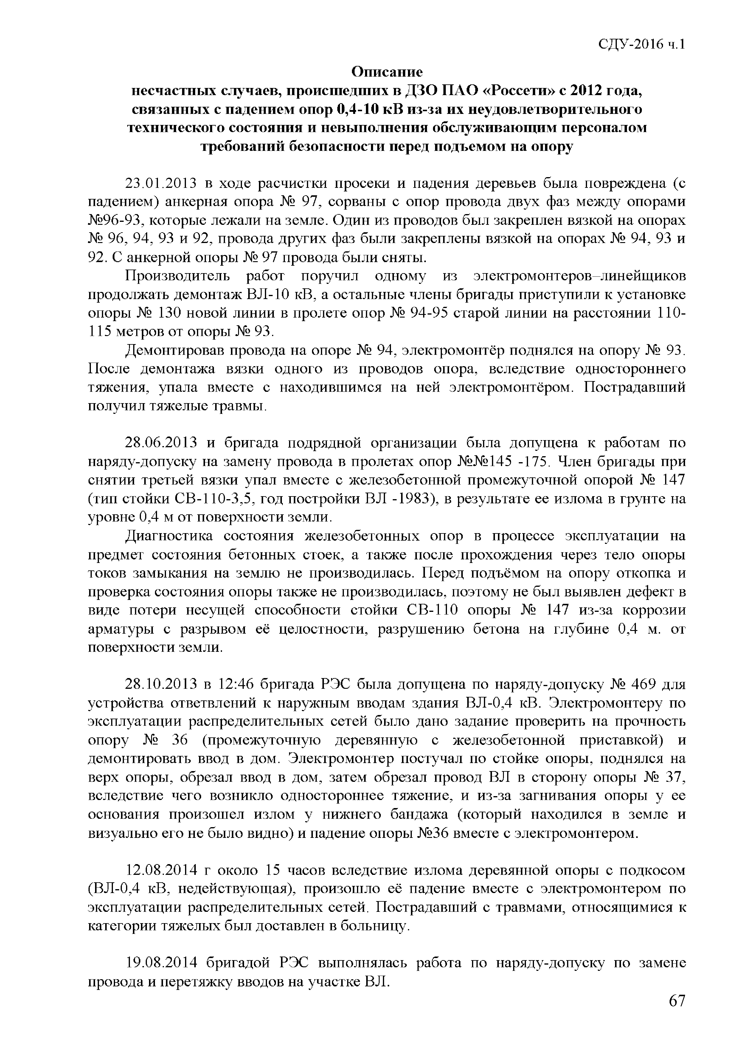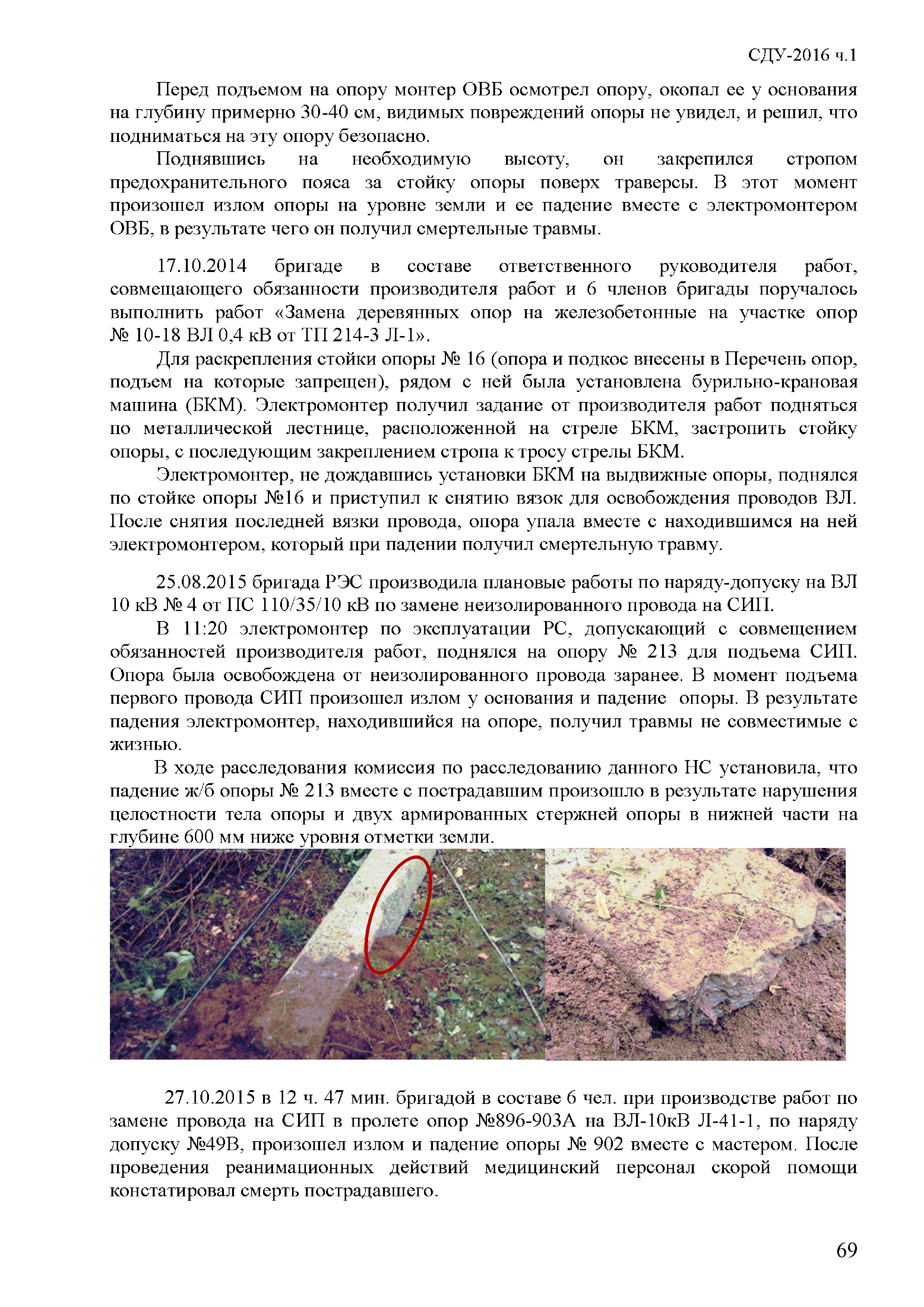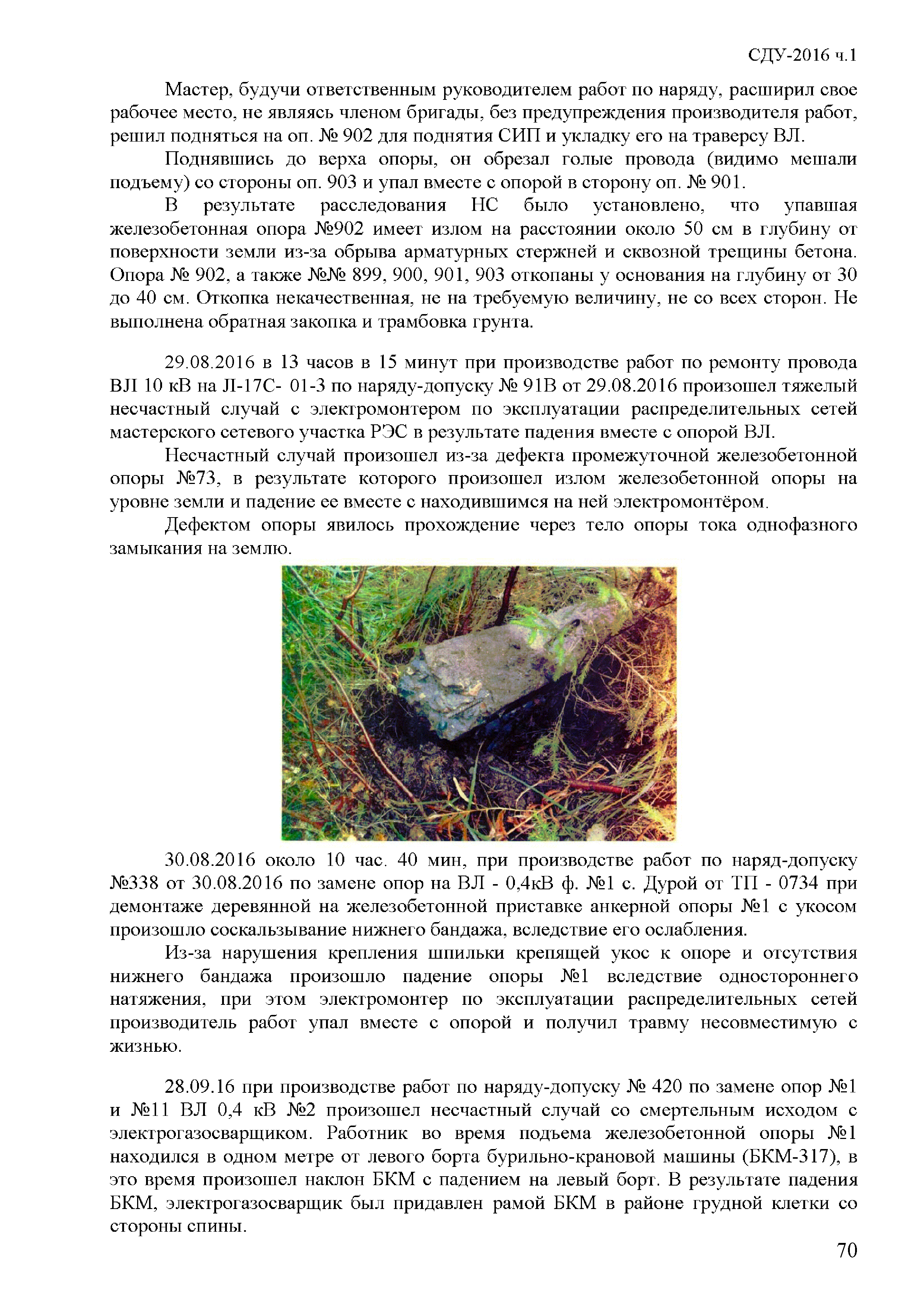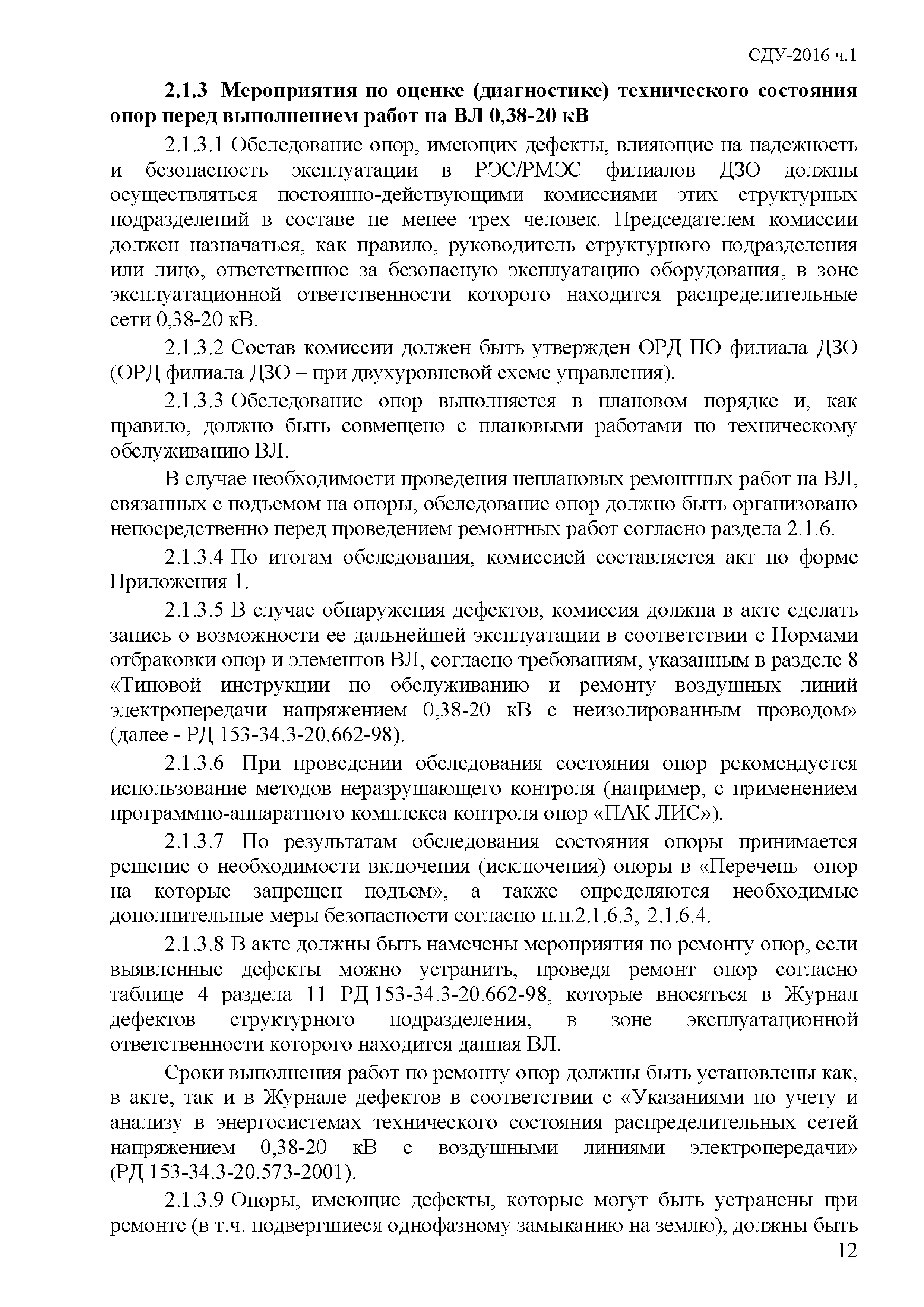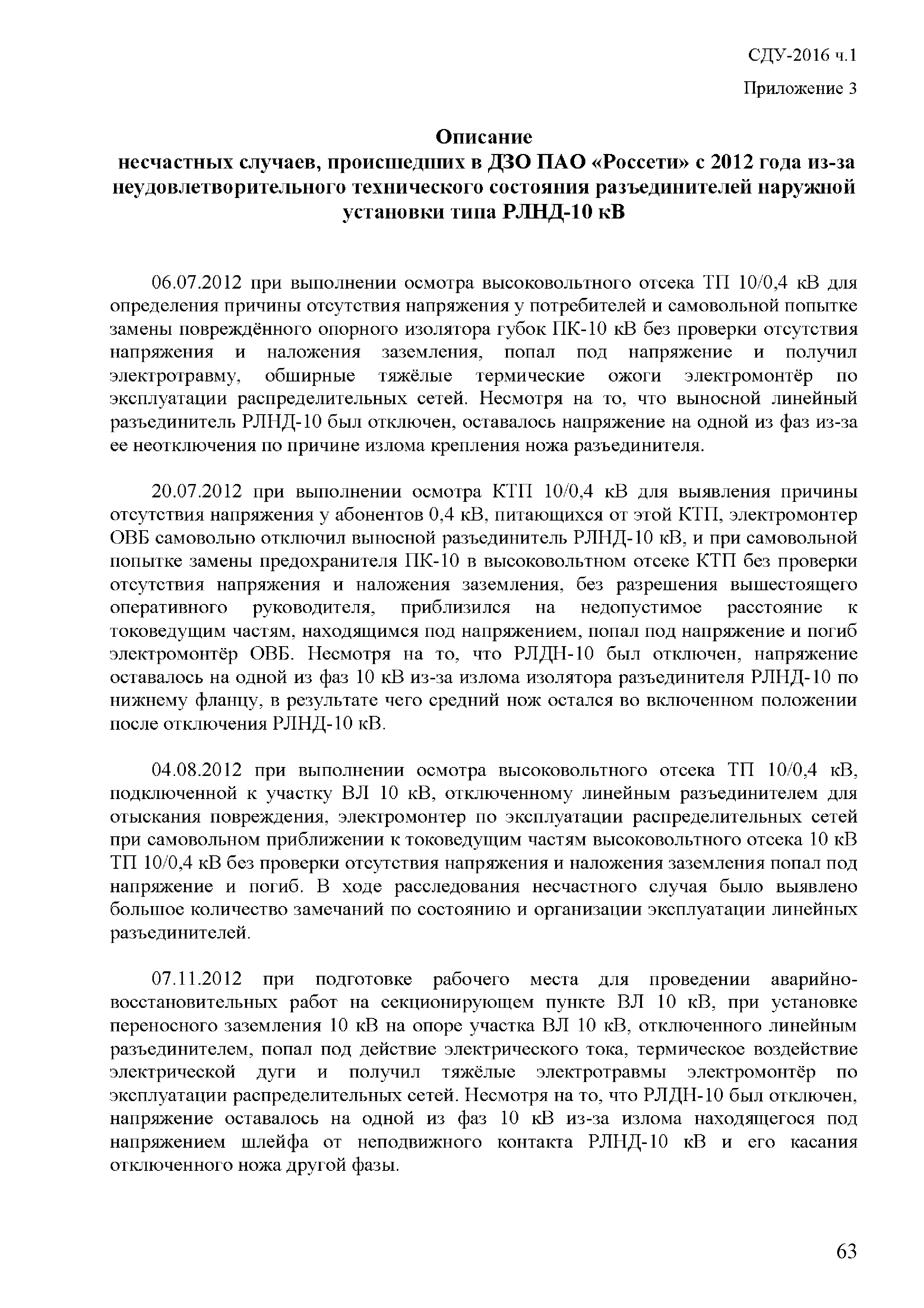 | Оглавление: | 1 Общие положения . 1.1 Назначение и область применения Сборника 1.2 Основные термины, определения. Принятые сокращения 2 Мероприятия, направленные на повышение надёжности и безопасности при эксплуатации ВЛ 0,38 - 20 кВ 2.1 Выполнение мероприятий на опорах ВЛ, имеющих дефекты, влияющие на надежность и безопасную эксплуатацию 2.2 Эксплуатация коммутационных аппаратов наружной установки типа РЛНД 6 - 20 кВ и низковольтных рубильников типа РПЦ-2 2.3 О порядке шунтирования разъединителей 6 - 20 кВ 2.4 Требования безопасности при выполнение работ при расчистке просек ВЛ 2.5 Меры безопасности при обесточении (отключении) электроустановок, находящихся под напряжением при возникновении пожара в жилом секторе 2.6 Порядок выполнения работ в "бесхозяйных сетях" 2.7 Меры безопасности при выполнении работ на участках резервирования электроснабжения автономными источниками электроэнергии 3 Повышение надежности и безопасности при эксплуатации ВЛИ 0,38 кВ и ВЛЗ 6 - 20 кВ 3.1 Мероприятия по повышению надёжности и безопасности при эксплуатации ВЛИ - 0,38 кВ 3.2 Мероприятия по повышению надёжности и безопасности при эксплуатации ВЛЗ 6 - 20 кВ. Основные технические решения 3.3 Порядок снятия напряжения с ВЛИ-0,38 кВ и ВЛЗ 6 - 20 кВ при спуске пострадавшего с опоры 4 Повышение надёжности при эксплуатации КЛ 6 кВ и выше 4.1 Основные требования при прокладке КЛ 6 - 20 кВ 4.2 Мероприятия по повышению надёжности при эксплуатации КЛ 6 кВ и выше Приложение 1. Форма акта обследования опор, имеющих дефекты, влияющие на надежность и безопасность эксплуатации Приложение 2. Технология и меры безопасности выполнения работ при монтаже стоек железобетонных опор в распределительной сети 0,38 - 20 кВ с применением бурильно-крановой машины (БКМ) Приложение 3. Описание несчастных случаев, происшедших в ДЗО ПАО "Россети" с 2012 года из-за неудовлетворительного технического состояния разъединителей наружной установки типа РЛНД - 10 кВ Приложение 4. Перечень нормативных документов, государственных и международных стандартов, требования которых учтены в СДУ |