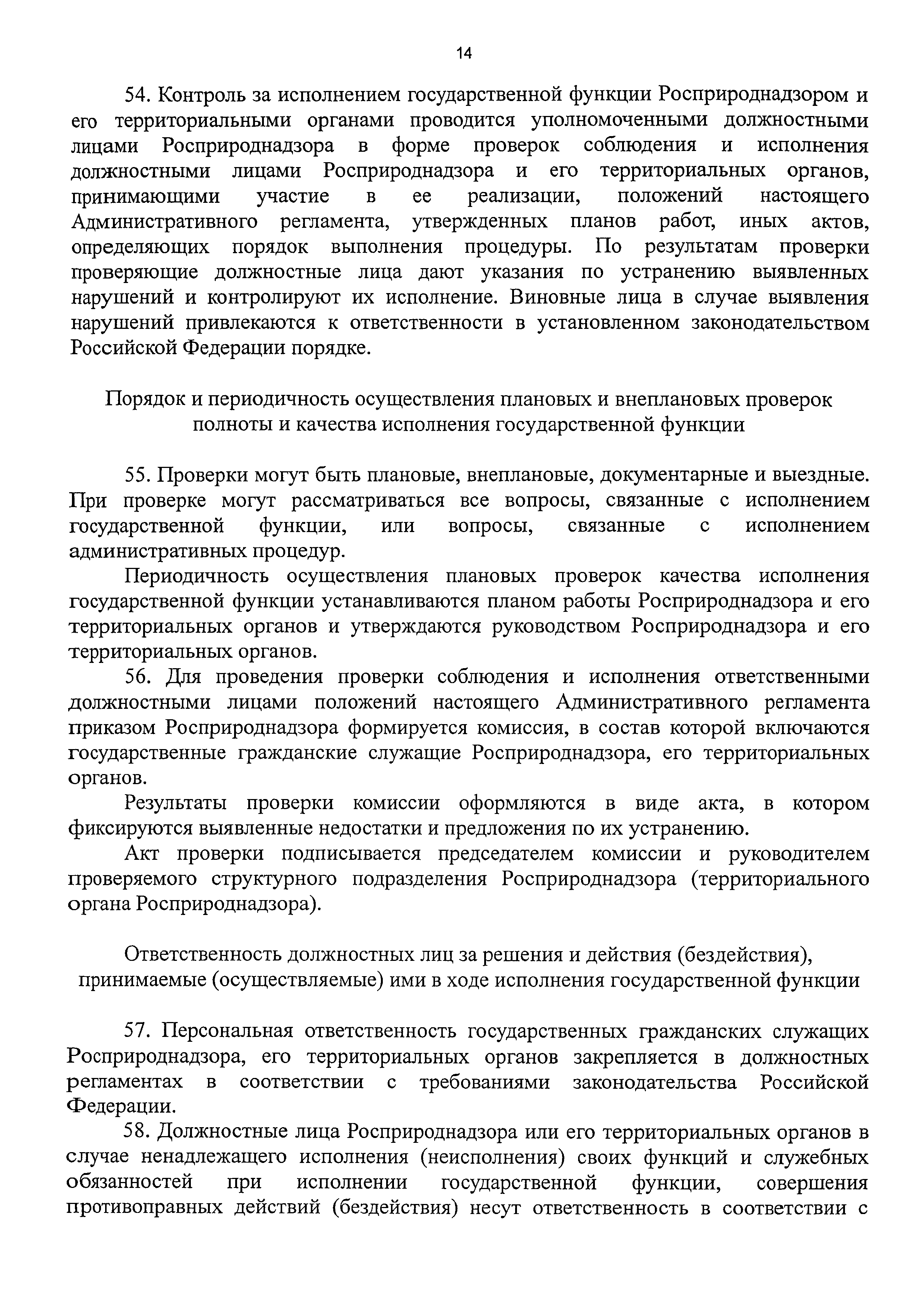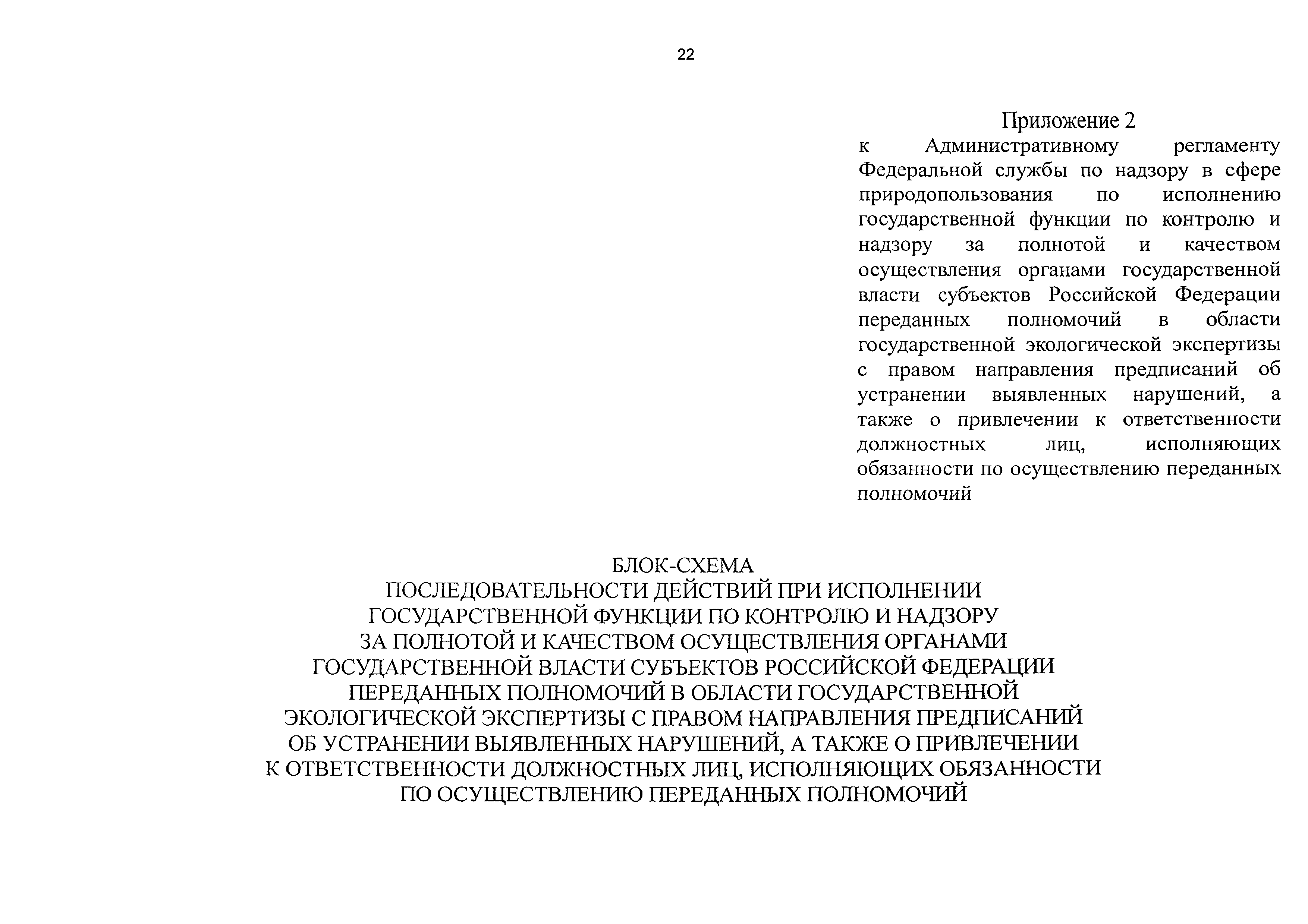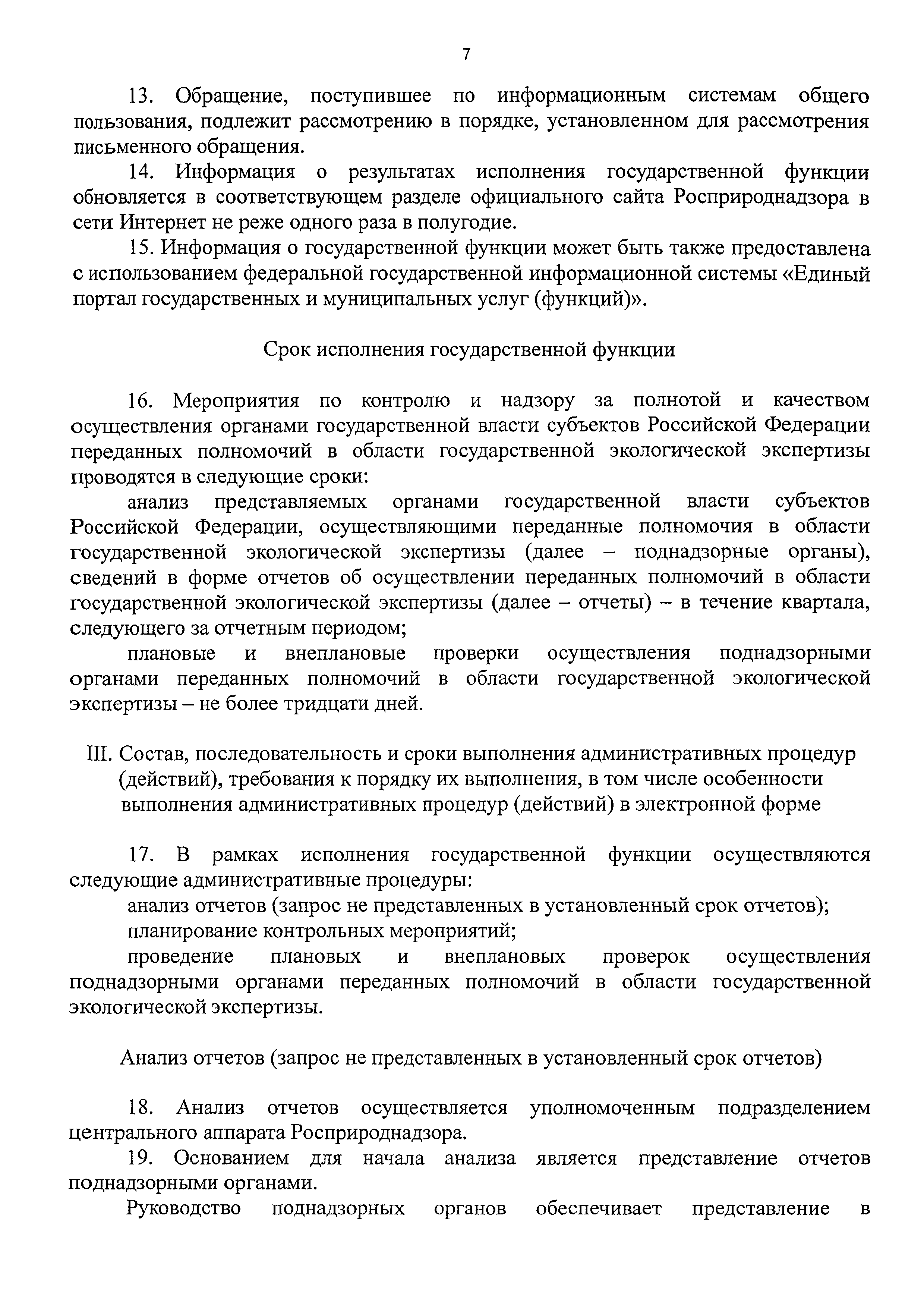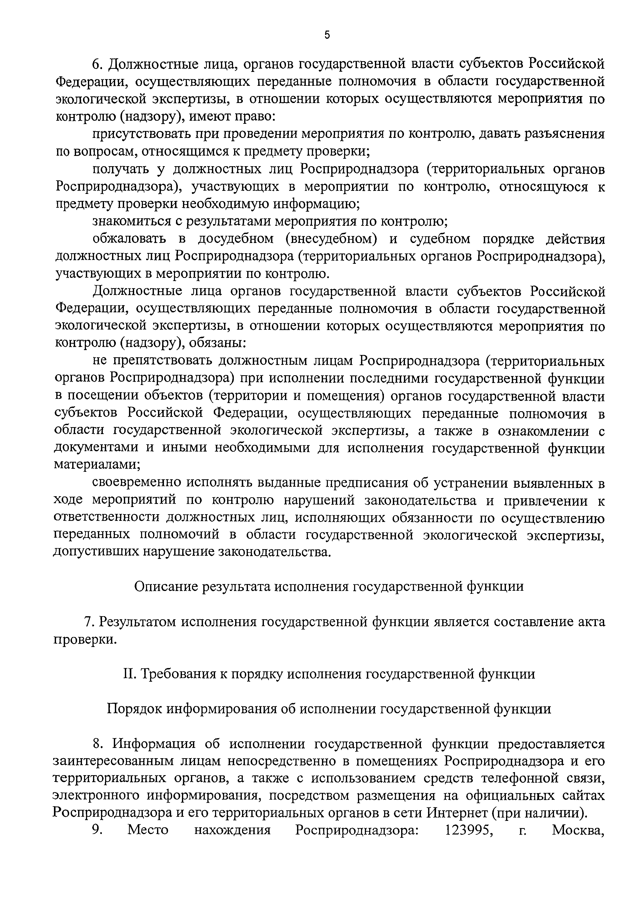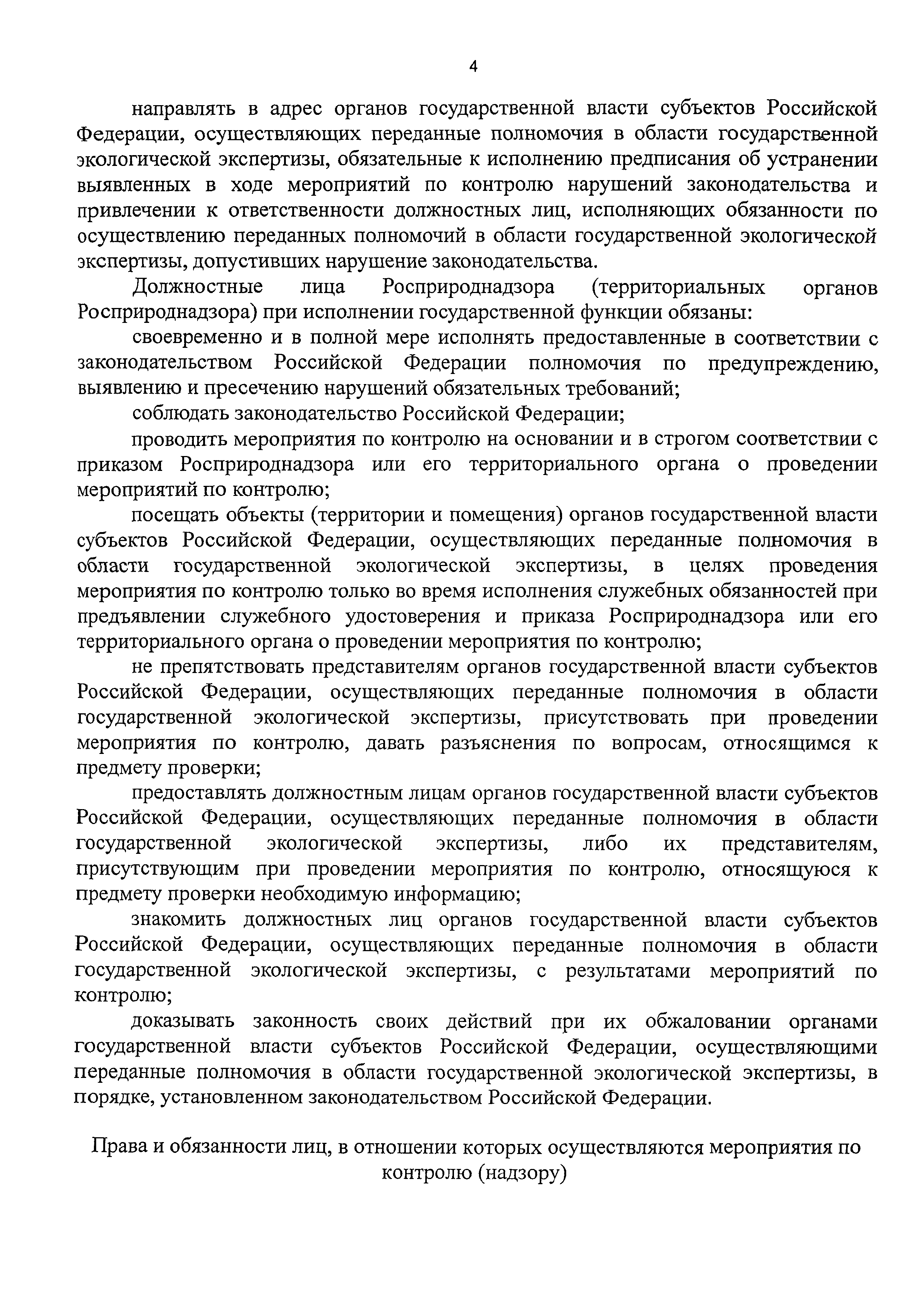 | Оглавление: | I. Общие положения II. Требования к порядку исполнения государственной функции III. Состав, последовательность и сроки выполнения административных процедур (действий), требования к порядку их выполнения, в том числе особенности выполнения административных процедур (действий) в электронной форме IV. Порядок и формы контроля за исполнением государственной функции V. Досудебный (внесудебный) порядок обжалования решений и действий (бездействия) должностных лиц Росприроднадзора (территориальных органов Росприроднадзора) при исполнении государственной функции Приложение 1. Список территориальных органов Федеральной службы по надзору в сфере природопользования Приложение 2. Блок-схема последовательности действий при исполнении государственной функции по контролю и надзору за полнотой и качеством осуществления органами государственной власти субъектов Российской Федерации переданных полномочий в области государственной экологической экспертизы с правом направления предписаний об устранении выявленных нарушений, а также о привлечении к ответственности должностных лиц, исполняющих обязанности по осуществлению переданных полномочий |