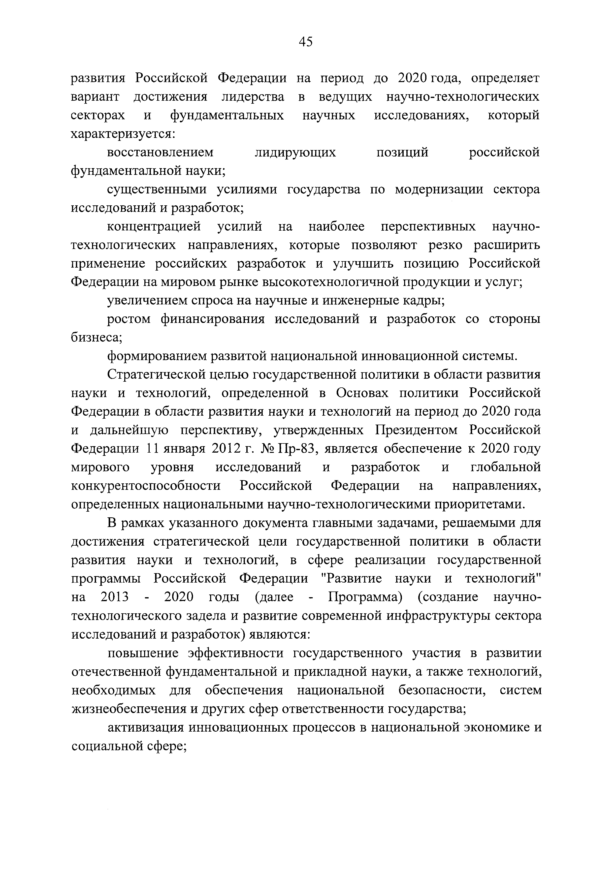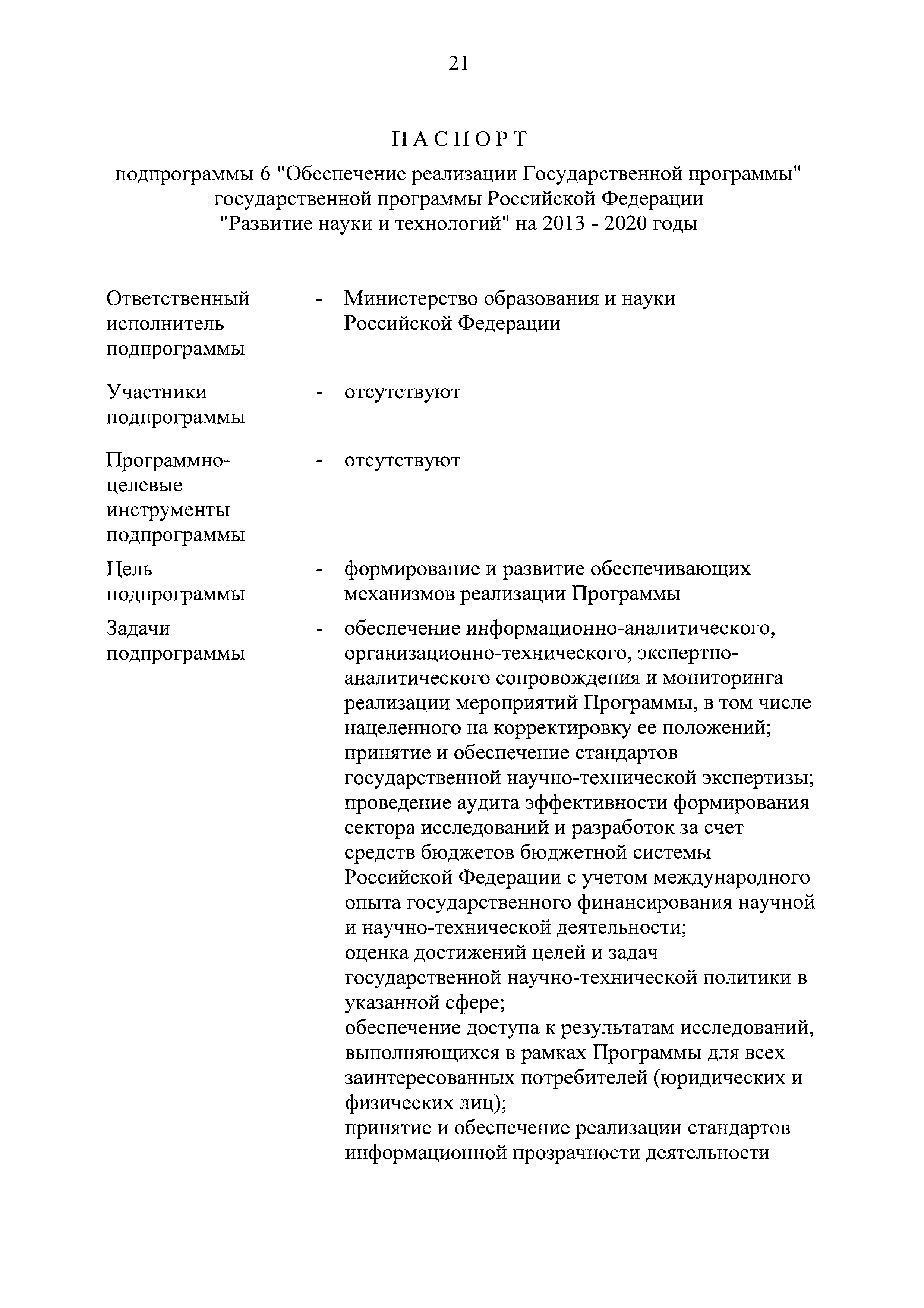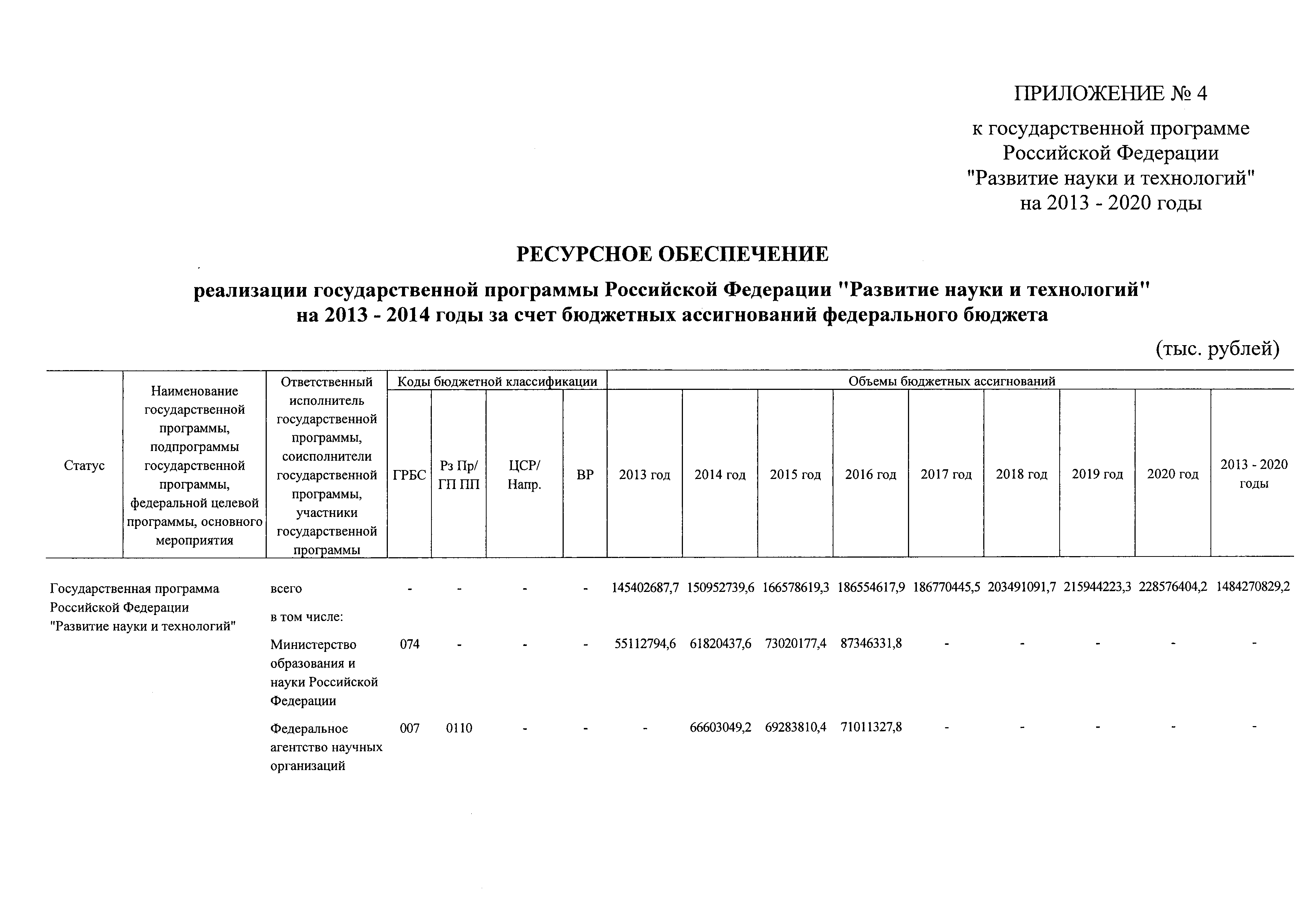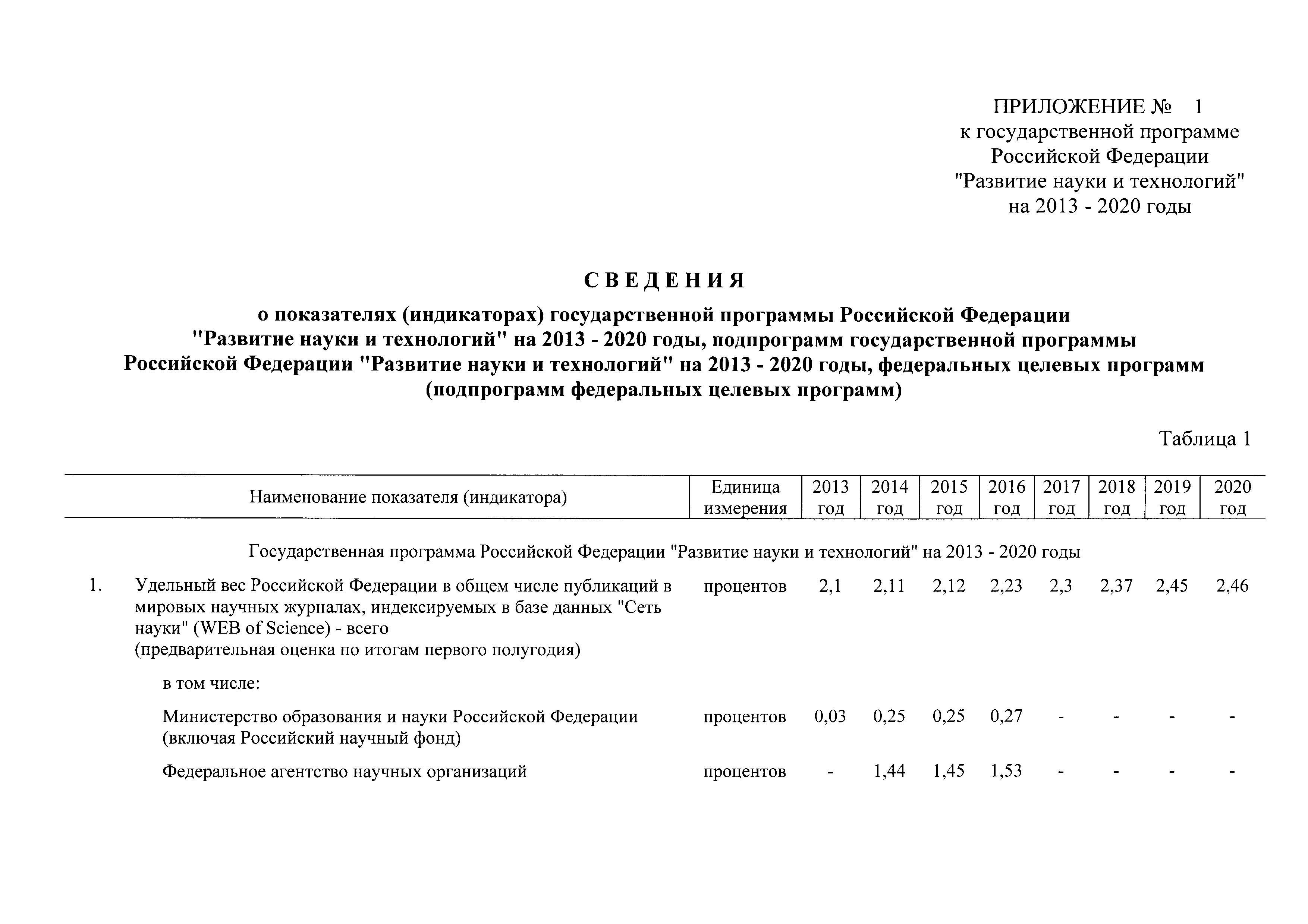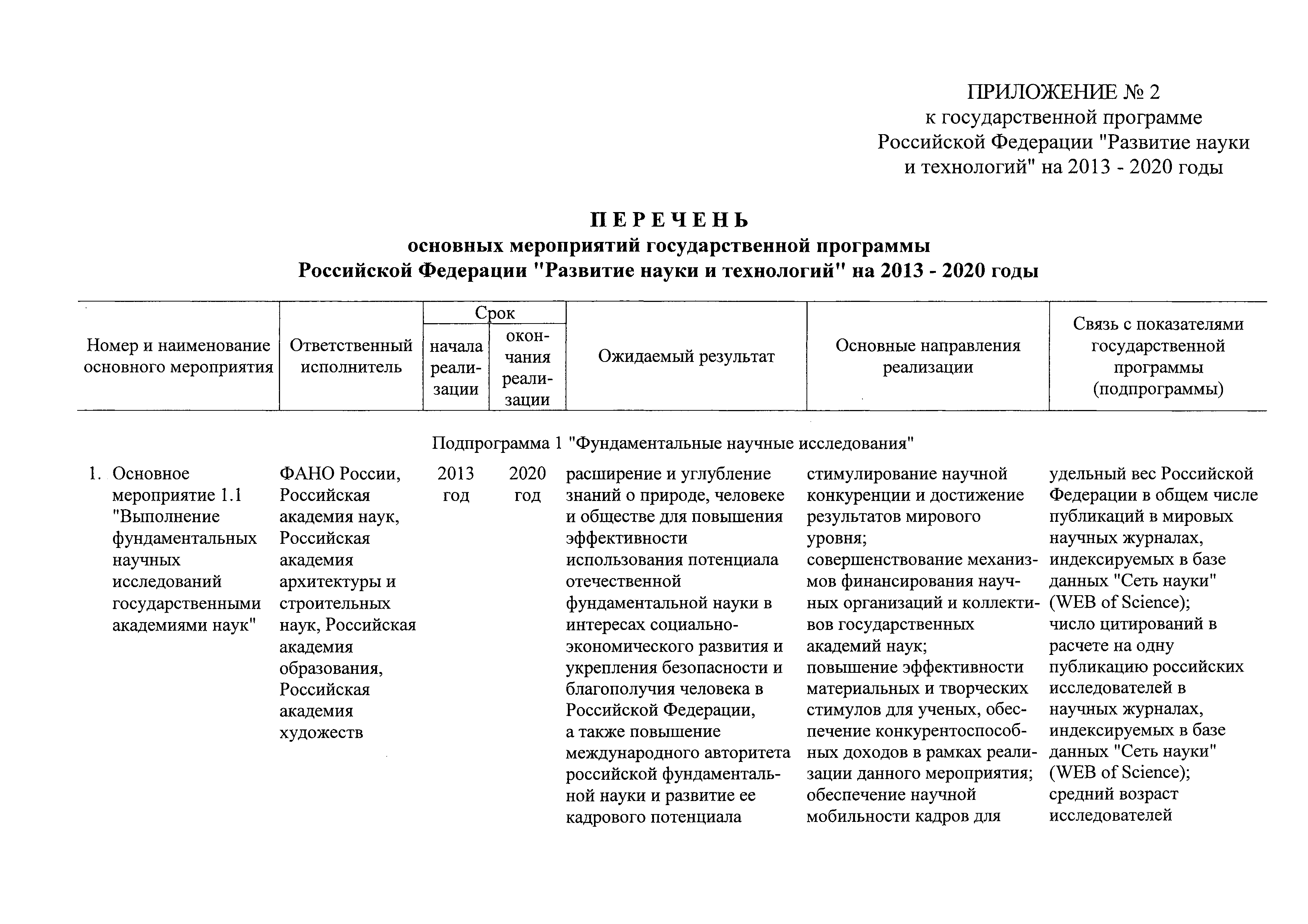 | Оглавление: | Паспорт государственной программы Российской Федерации "Развитие науки и технологий" на 2013 - 2020 годы Паспорт подпрограммы 1 "Фундаментальные научные исследования" государственной программы Российской Федерации "Развитие науки и технологий" на 2013 - 2020 годы Паспорт подпрограммы 2 "Прикладные проблемно ориентированные исследования и развитие научно-технологического задела в области перспективных технологий" государственной программы Российской Федерации "Развитие науки и технологий" на 2013 - 2020 годы Паспорт подпрограммы 3 "Институциональное развитие научно-исследовательского сектора" государственной программы Российской Федерации "Развитие науки и технологий" на 2013 - 2020 годы Паспорт подпрограммы 4 "Развитие межотраслевой инфраструктуры сектора исследований и разработок" государственной программы Российской Федерации "Развитие науки и технологий" на 2013 - 2020 годы Паспорт подпрограммы 5 "Международное сотрудничество в сфере науки" государственной программы Российской Федерации "Развитие науки и технологий" на 2013 - 2020 годы Паспорт подпрограммы 6 "Обеспечение реализации Государственной программы" государственной программы Российской Федерации "Развитие науки и технологий" на 2013 - 2020 годы Федеральная целевая программа "Исследования и разработки по приоритетным направлениям развития научно-технологического комплекса России на 2007 - 2013 годы" Паспорт федеральной целевой программы "Исследования и разработки по приоритетным направлениям развития научно-технологического комплекса России на 2007 - 2013 годы" Федеральная целевая программа "Исследования и разработки по приоритетным направлениям развития научно-технологического комплекса России на 2014 - 2020 годы" Паспорт федеральной целевой программы "Исследования и разработки по приоритетным направлениям развития научно-технологического комплекса России на 2014 - 2020 годы" Федеральная целевая программа "Научные и научно-педагогические кадры инновационной России" на 2009 - 2013 годы Паспорт федеральной целевой программы "Научные и научно-педагогические кадры инновационной России" на 2009 - 2013 годы Федеральная целевая программа "Научные и научно-педагогические кадры инновационной России" на 2014 - 2020 годы Паспорт федеральной целевой программы "Научные и научно-педагогические кадры инновационной России" на 2014 - 2020 годы Федеральная целевая программа "Мировой океан" Паспорт федеральной целевой программы "Мировой океан" Приоритеты и цели государственной политики в сфере реализации государственной программы Российской Федерации "Развитие науки и технологий" на 2013 - 2020 годы Приложение № 1. Сведения о показателях (индикаторах) государственной программы Российской Федерации "Развитие науки и технологий" на 2013 - 2020 годы, подпрограмм государственной программы Российской Федерации "Развитие науки и технологий" на 2013 - 2020 годы, федеральных целевых программ (подпрограмм федеральных целевых программ) Приложение № 2. Перечень основных мероприятий государственной программы Российской Федерации "Развитие науки и технологий" на 2013 - 2020 годы Приложение № 3. Сведения об основных мерах правового регулирования в сфере реализации государственной программы Российской Федерации "Развитие науки и технологий" на 2013 - 2020 годы Приложение № 4. Ресурсное обеспечение реализации государственной прогр