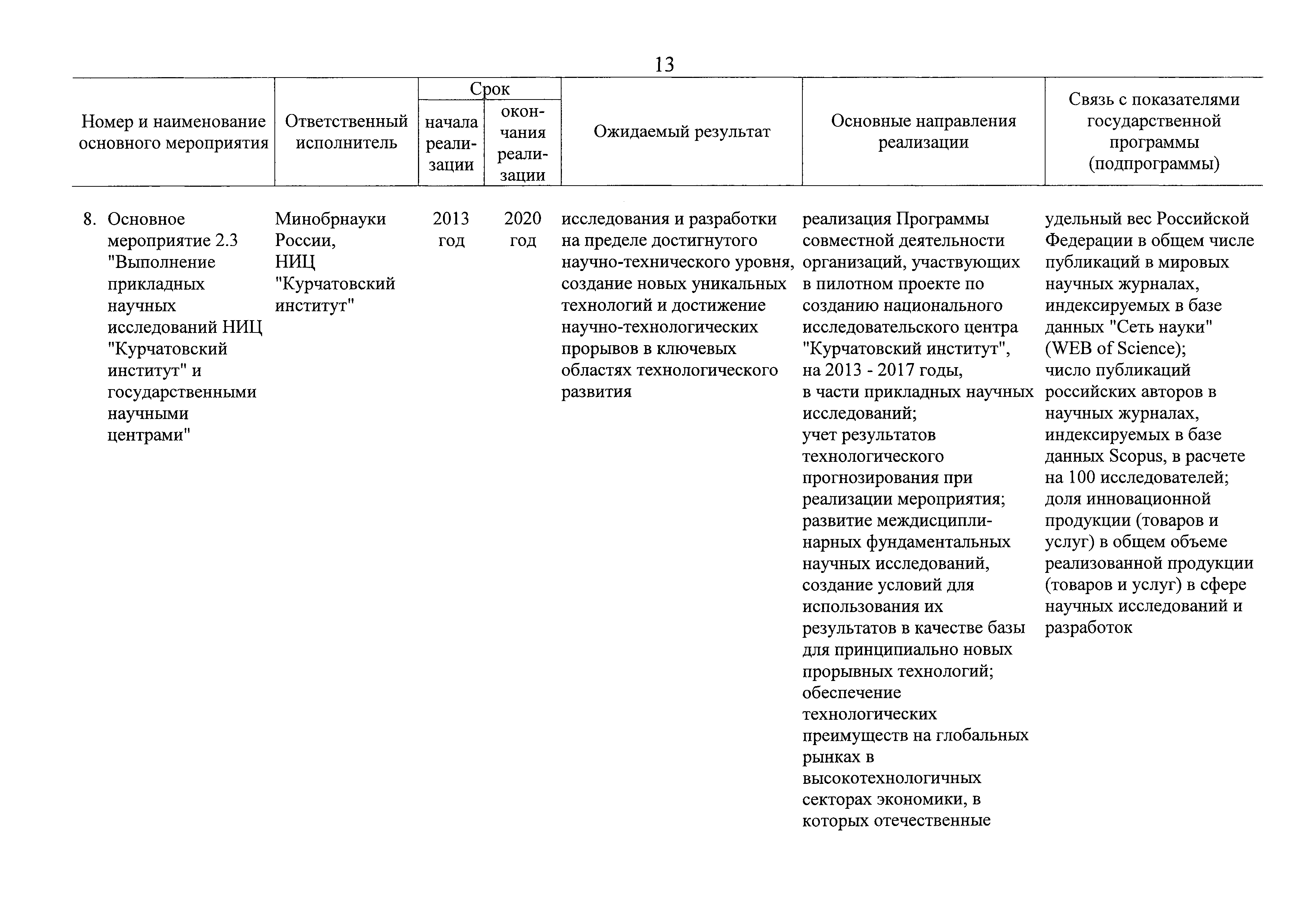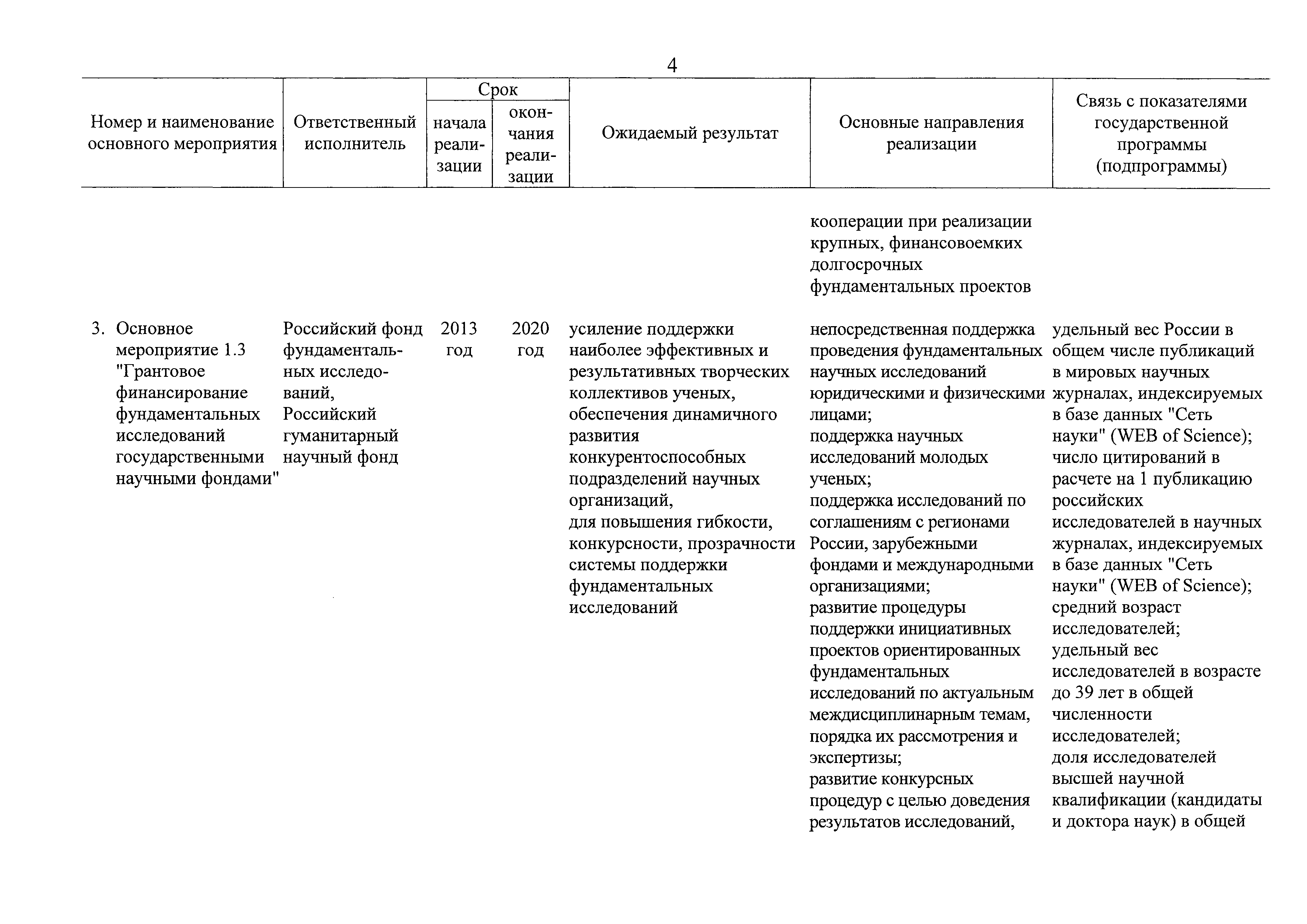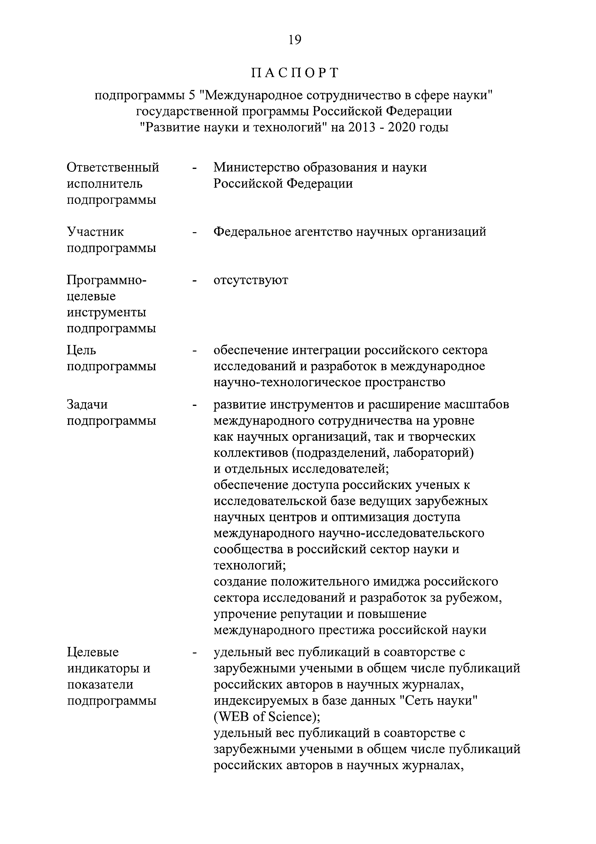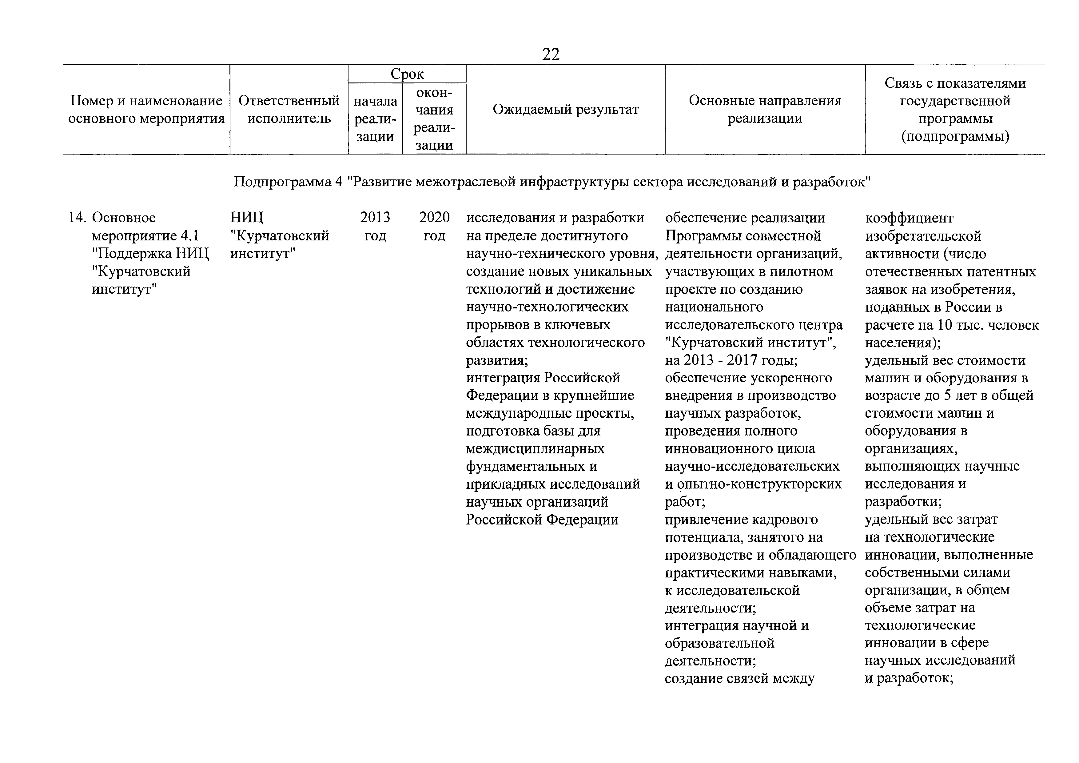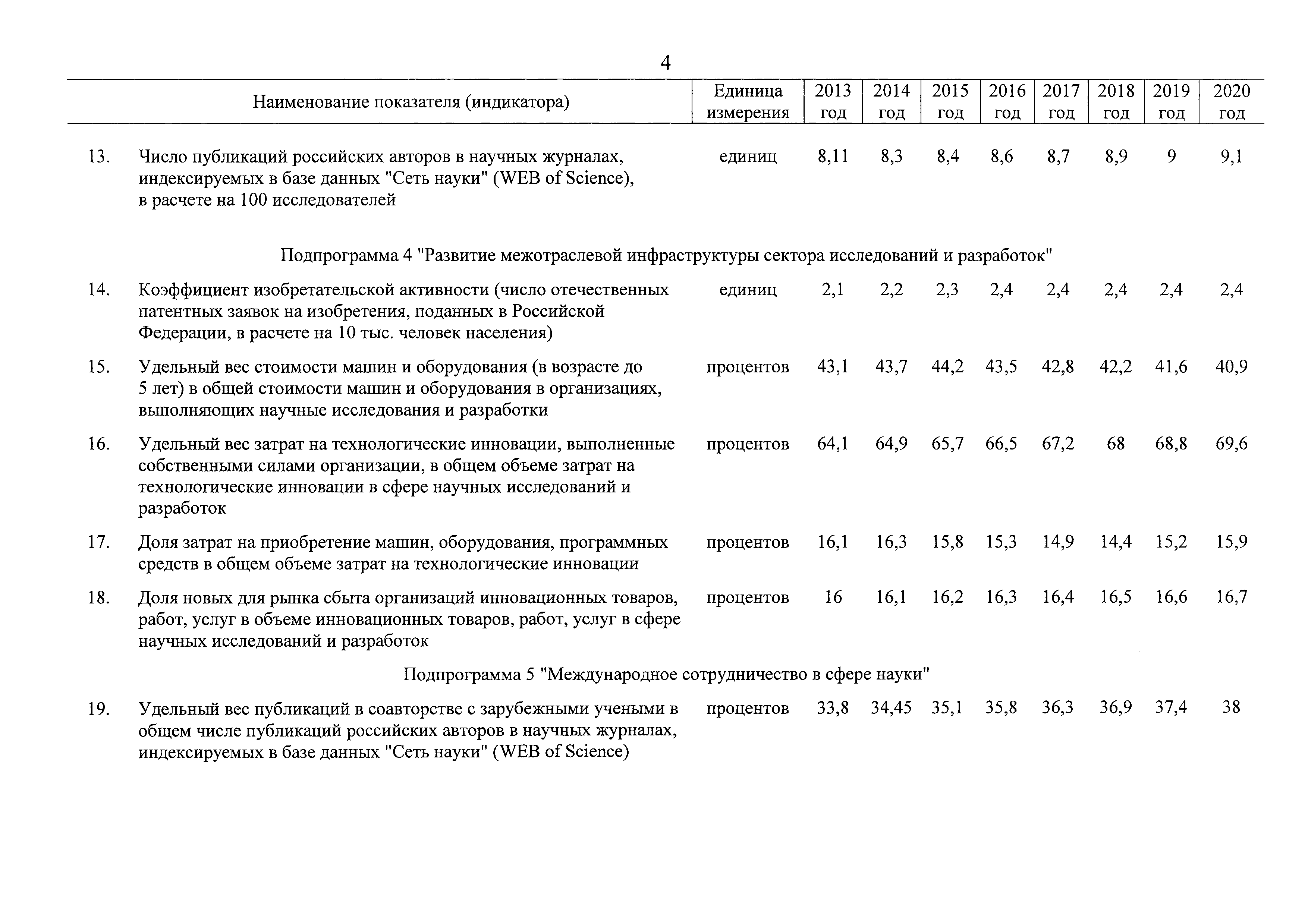| Оглавление: | Паспорт государственной программы Российской Федерации "Развитие науки и технологий" на 2013 - 2020 годы Паспорт подпрограммы 1 "Фундаментальные научные исследования" государственной программы Российской Федерации "Развитие науки и технологий" на 2013 - 2020 годы Паспорт подпрограммы 2 "Прикладные проблемно ориентированные исследования и развитие научно-технологического задела в области перспективных технологий" государственной программы Российской Федерации "Развитие науки и технологий" на 2013 - 2020 годы Паспорт подпрограммы 3 "Институциональное развитие научно-исследовательского сектора" государственной программы Российской Федерации "Развитие науки и технологий" на 2013 - 2020 годы Паспорт подпрограммы 4 "Развитие межотраслевой инфраструктуры сектора исследований и разработок" государственной программы Российской Федерации "Развитие науки и технологий" на 2013 - 2020 годы Паспорт подпрограммы 5 "Международное сотрудничество в сфере науки" государственной программы Российской Федерации "Развитие науки и технологий" на 2013 - 2020 годы Паспорт подпрограммы 6 "Обеспечение реализации Государственной программы" государственной программы Российской Федерации "Развитие науки и технологий" на 2013 - 2020 годы Федеральная целевая программа "Исследования и разработки по приоритетным направлениям развития научно-технологического комплекса России на 2007 - 2013 годы" Паспорт федеральной целевой программы "Исследования и разработки по приоритетным направлениям развития научно-технологического комплекса России на 2007 - 2013 годы" Федеральная целевая программа "Исследования и разработки по приоритетным направлениям развития научно-технологического комплекса России на 2014 - 2020 годы" Паспорт федеральной целевой программы "Исследования и разработки по приоритетным направлениям развития научно-технологического комплекса России на 2014 - 2020 годы" Федеральная целевая программа "Научные и научно-педагогические кадры инновационной России" на 2009 - 2013 годы Паспорт федеральной целевой программы "Научные и научно-педагогические кадры инновационной России" на 2009 - 2013 годы Федеральная целевая программа "Научные и научно-педагогические кадры инновационной России" на 2014 - 2020 годы Паспорт федеральной целевой программы "Научные и научно-педагогические кадры инновационной России" на 2014 - 2020 годы Федеральная целевая программа "Мировой океан" Паспорт федеральной целевой программы "Мировой океан" Приоритеты и цели государственной политики в сфере реализации государственной программы Российской Федерации "Развитие науки и технологий" на 2013 - 2020 годы Приложение № 1. Сведения о показателях (индикаторах) государственной программы Российской Федерации "Развитие науки и технологий" на 2013 - 2020 годы, подпрограмм государственной программы Российской Федерации "Развитие науки и технологий" на 2013 - 2020 годы, федеральных целевых программ (подпрограмм федеральных целевых программ) Приложение № 2. Перечень основных мероприятий государственной программы Российской Федерации "Развитие науки и технологий" на 2013 - 2020 годы Приложение № 3. Сведения об основных мерах правового регулирования в сфере реализации государственной программы Российской Федерации "Развитие науки и технологий" на 2013 - 2020 годы Приложение № 4. Ресурсное обеспечение реализации государственной прогр