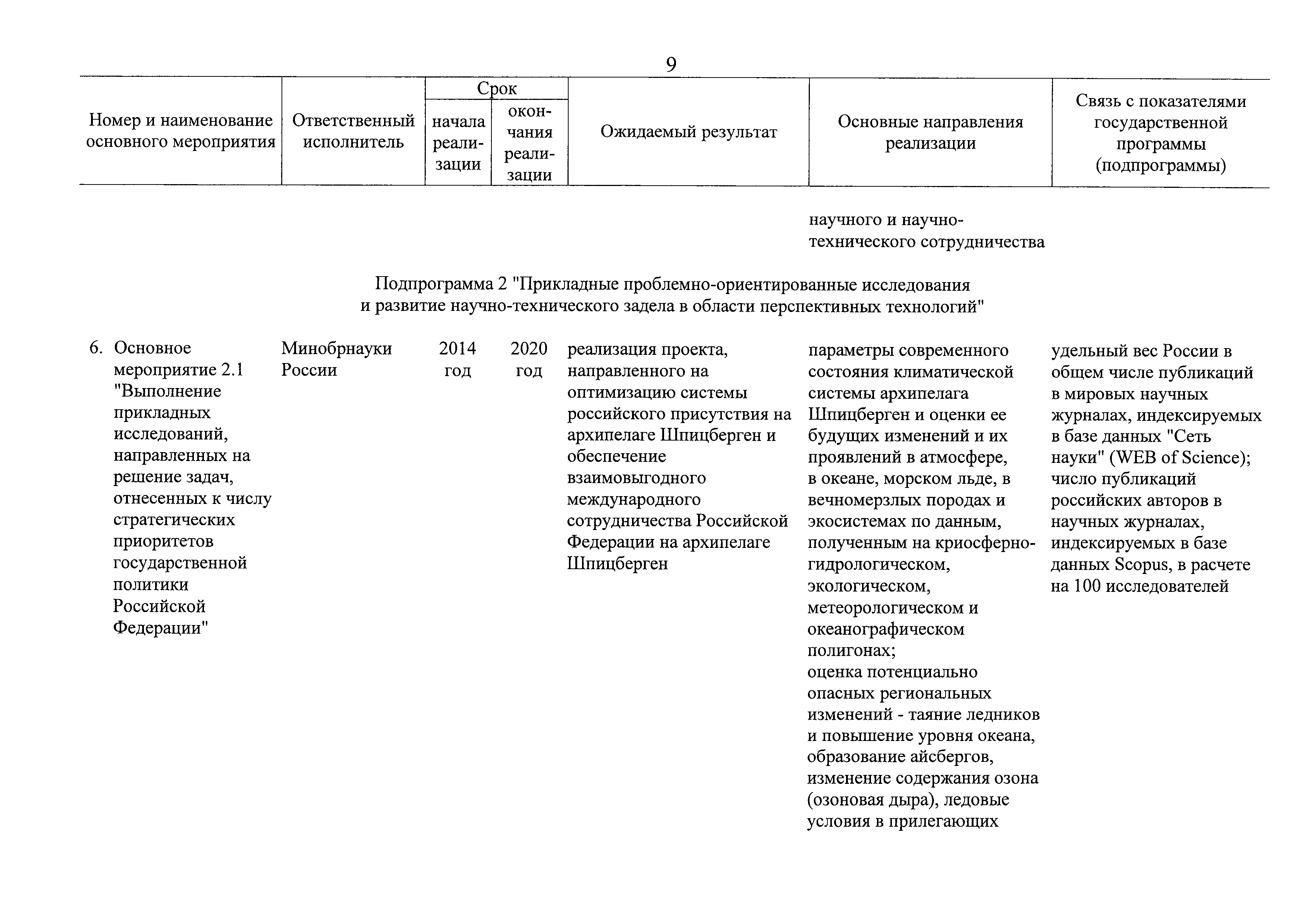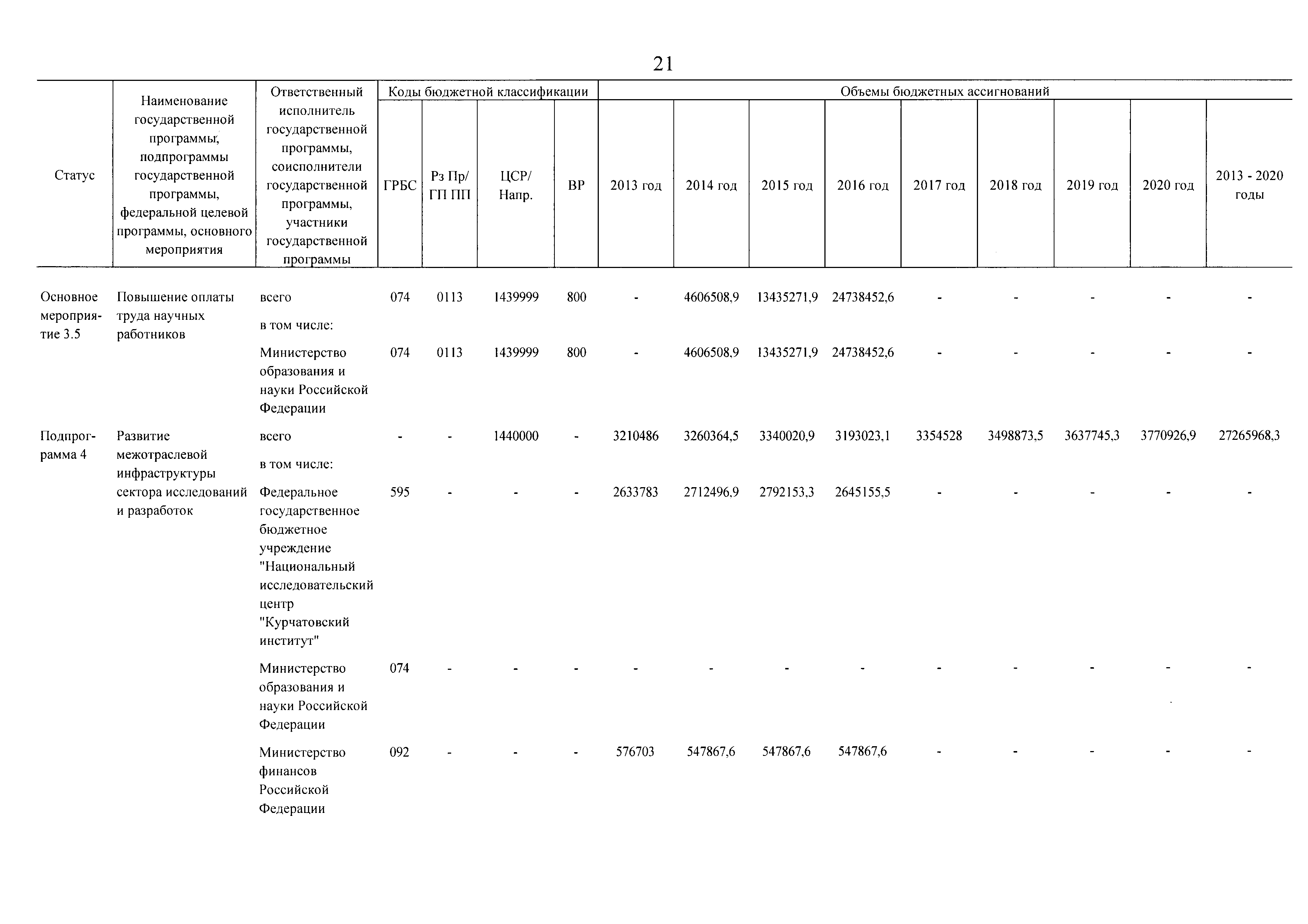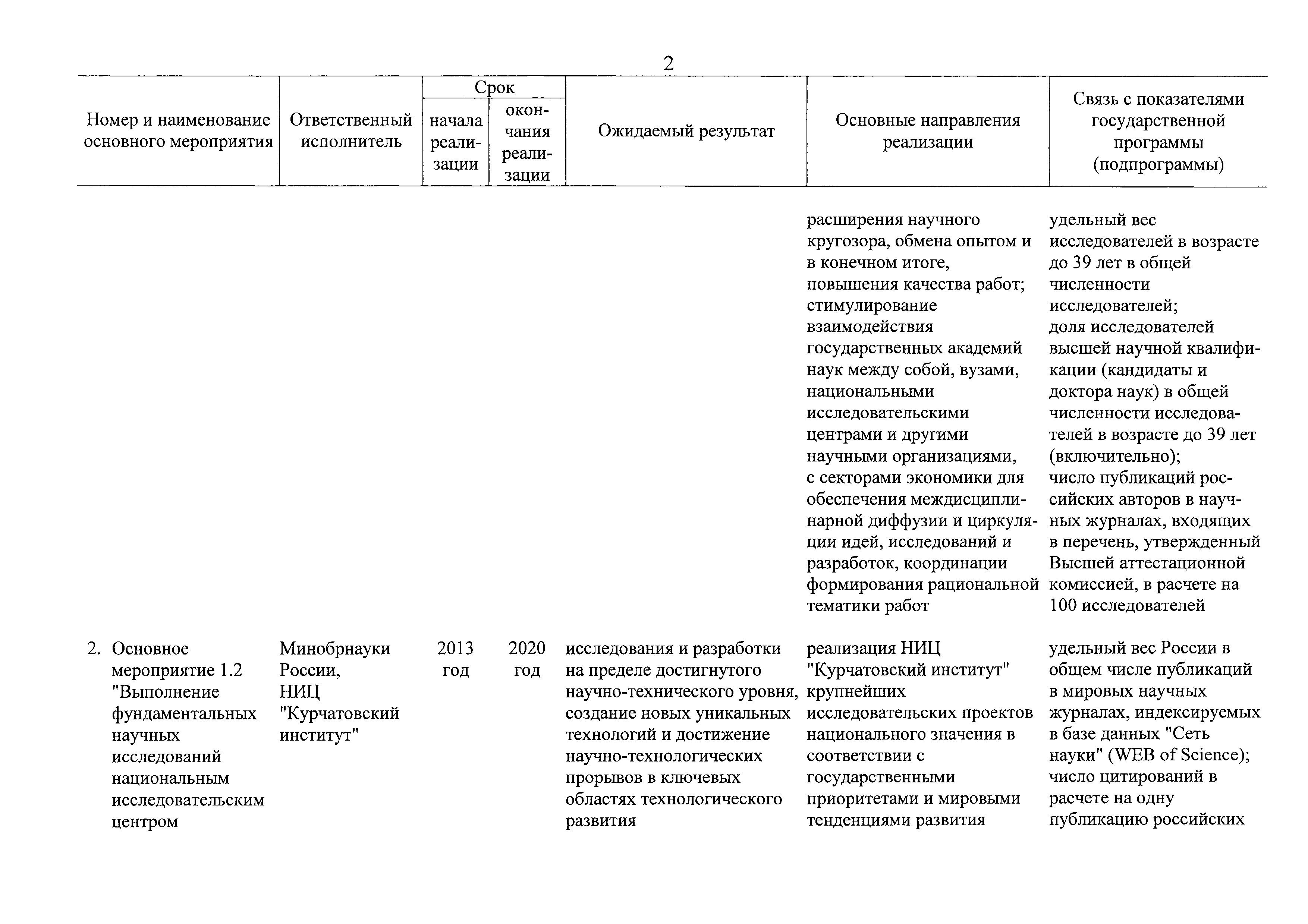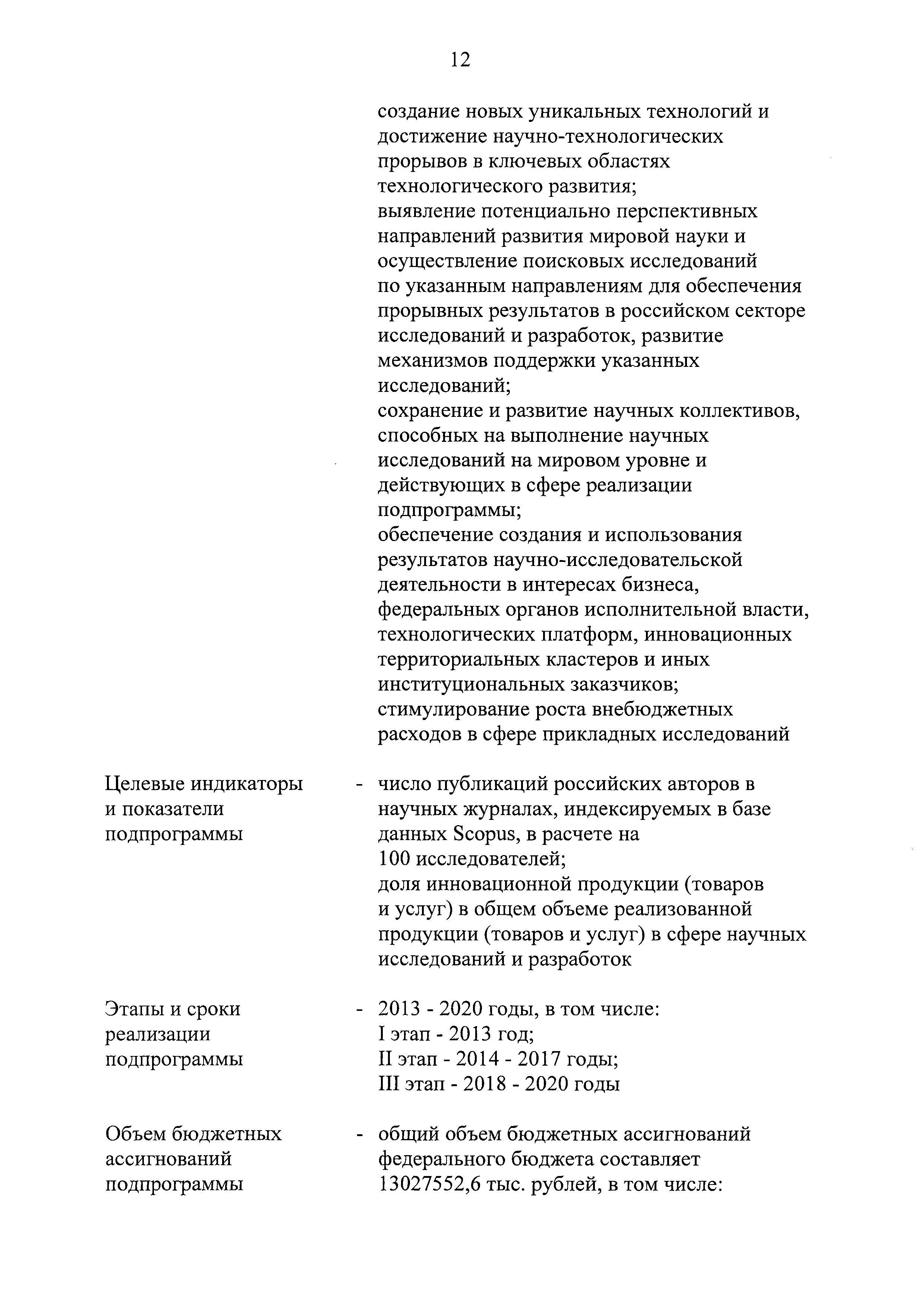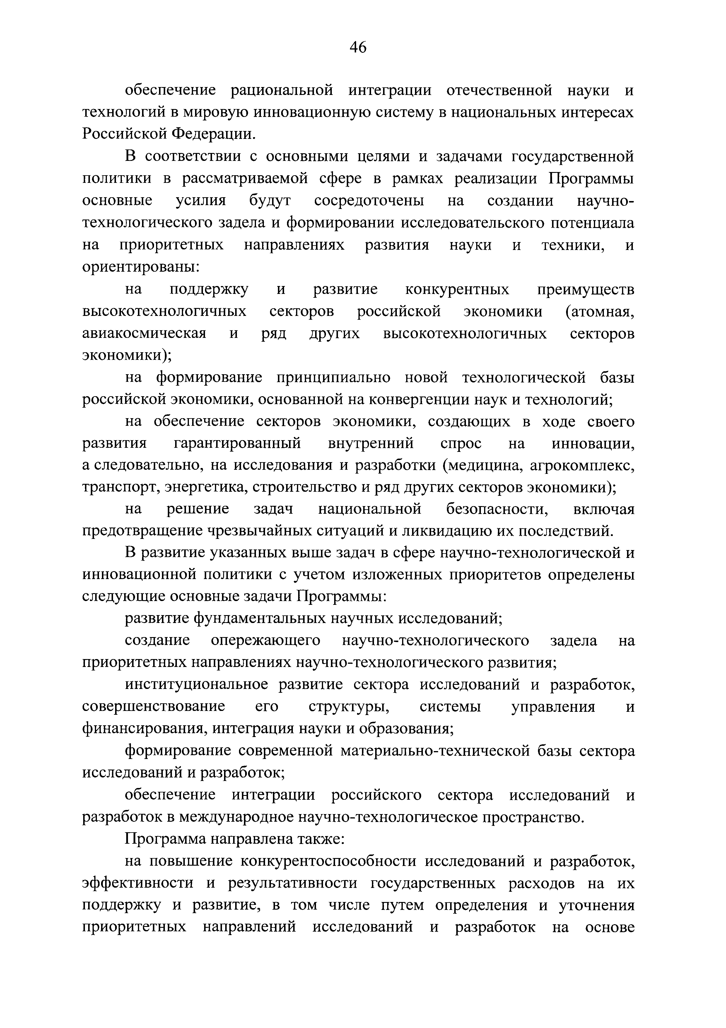 | Оглавление: | Паспорт государственной программы Российской Федерации "Развитие науки и технологий" на 2013 - 2020 годы Паспорт подпрограммы 1 "Фундаментальные научные исследования" государственной программы Российской Федерации "Развитие науки и технологий" на 2013 - 2020 годы Паспорт подпрограммы 2 "Прикладные проблемно ориентированные исследования и развитие научно-технологического задела в области перспективных технологий" государственной программы Российской Федерации "Развитие науки и технологий" на 2013 - 2020 годы Паспорт подпрограммы 3 "Институциональное развитие научно-исследовательского сектора" государственной программы Российской Федерации "Развитие науки и технологий" на 2013 - 2020 годы Паспорт подпрограммы 4 "Развитие межотраслевой инфраструктуры сектора исследований и разработок" государственной программы Российской Федерации "Развитие науки и технологий" на 2013 - 2020 годы Паспорт подпрограммы 5 "Международное сотрудничество в сфере науки" государственной программы Российской Федерации "Развитие науки и технологий" на 2013 - 2020 годы Паспорт подпрограммы 6 "Обеспечение реализации Государственной программы" государственной программы Российской Федерации "Развитие науки и технологий" на 2013 - 2020 годы Федеральная целевая программа "Исследования и разработки по приоритетным направлениям развития научно-технологического комплекса России на 2007 - 2013 годы" Паспорт федеральной целевой программы "Исследования и разработки по приоритетным направлениям развития научно-технологического комплекса России на 2007 - 2013 годы" Федеральная целевая программа "Исследования и разработки по приоритетным направлениям развития научно-технологического комплекса России на 2014 - 2020 годы" Паспорт федеральной целевой программы "Исследования и разработки по приоритетным направлениям развития научно-технологического комплекса России на 2014 - 2020 годы" Федеральная целевая программа "Научные и научно-педагогические кадры инновационной России" на 2009 - 2013 годы Паспорт федеральной целевой программы "Научные и научно-педагогические кадры инновационной России" на 2009 - 2013 годы Федеральная целевая программа "Научные и научно-педагогические кадры инновационной России" на 2014 - 2020 годы Паспорт федеральной целевой программы "Научные и научно-педагогические кадры инновационной России" на 2014 - 2020 годы Федеральная целевая программа "Мировой океан" Паспорт федеральной целевой программы "Мировой океан" Приоритеты и цели государственной политики в сфере реализации государственной программы Российской Федерации "Развитие науки и технологий" на 2013 - 2020 годы Приложение № 1. Сведения о показателях (индикаторах) государственной программы Российской Федерации "Развитие науки и технологий" на 2013 - 2020 годы, подпрограмм государственной программы Российской Федерации "Развитие науки и технологий" на 2013 - 2020 годы, федеральных целевых программ (подпрограмм федеральных целевых программ) Приложение № 2. Перечень основных мероприятий государственной программы Российской Федерации "Развитие науки и технологий" на 2013 - 2020 годы Приложение № 3. Сведения об основных мерах правового регулирования в сфере реализации государственной программы Российской Федерации "Развитие науки и технологий" на 2013 - 2020 годы Приложение № 4. Ресурсное обеспечение реализации государственной прогр
