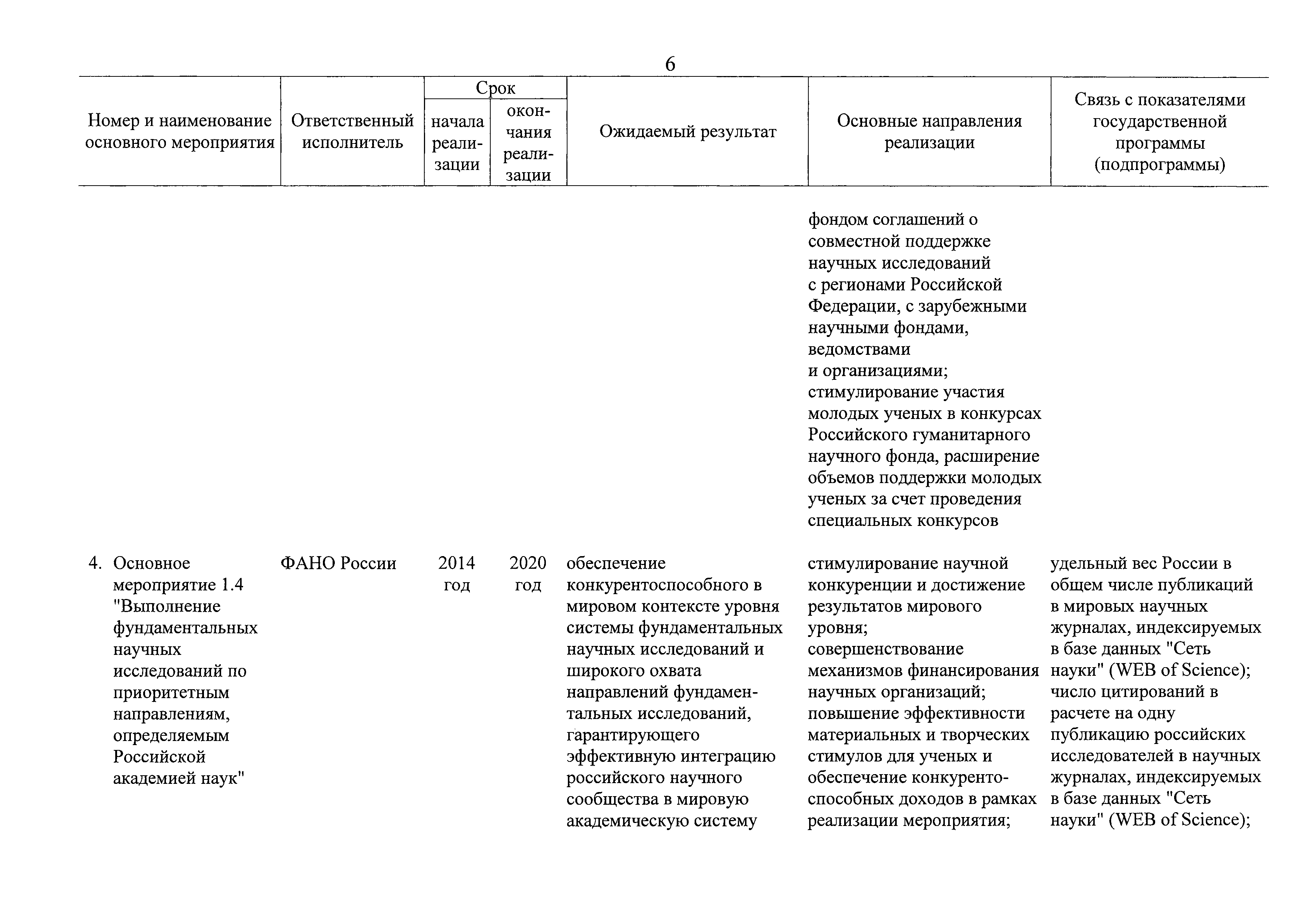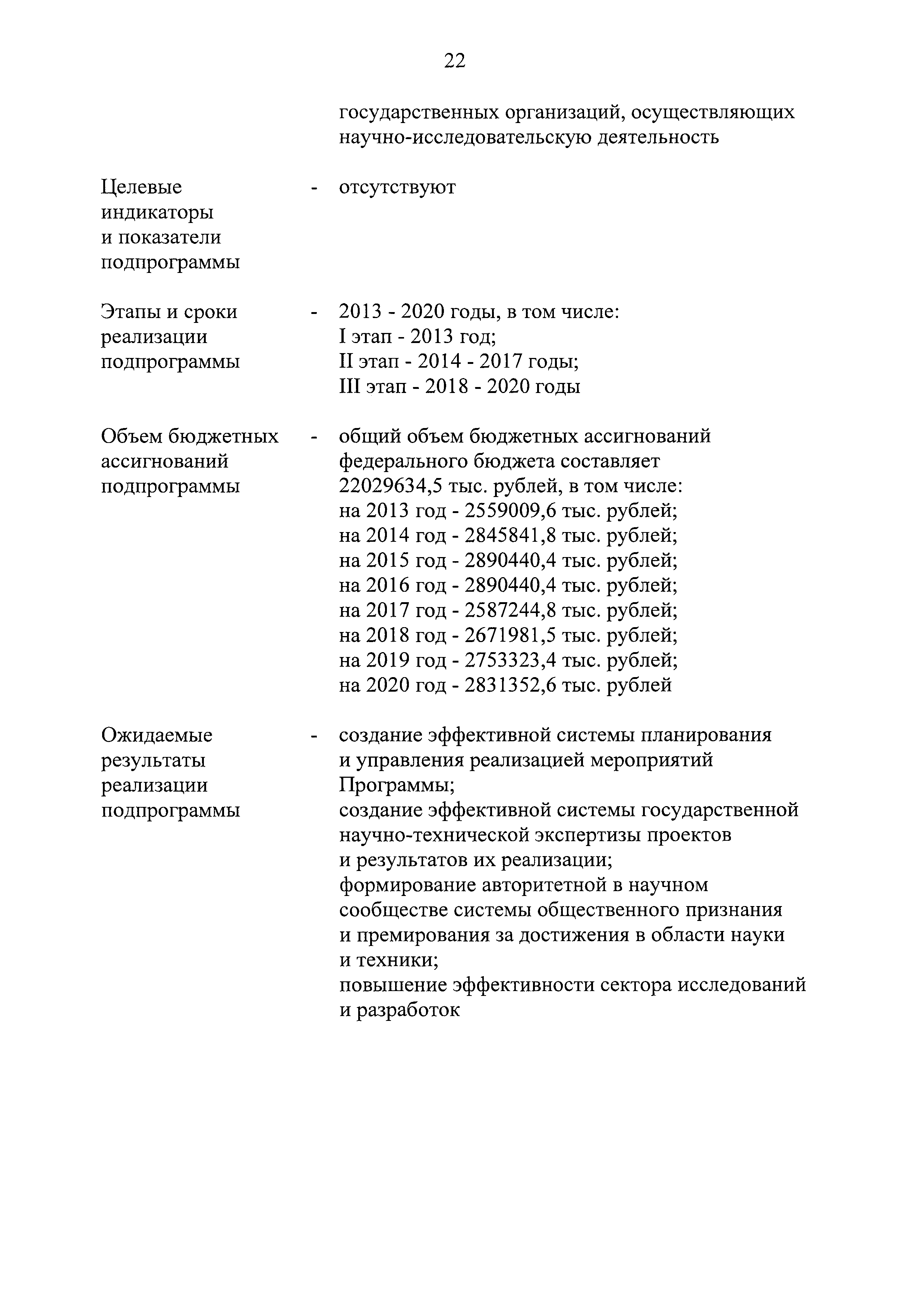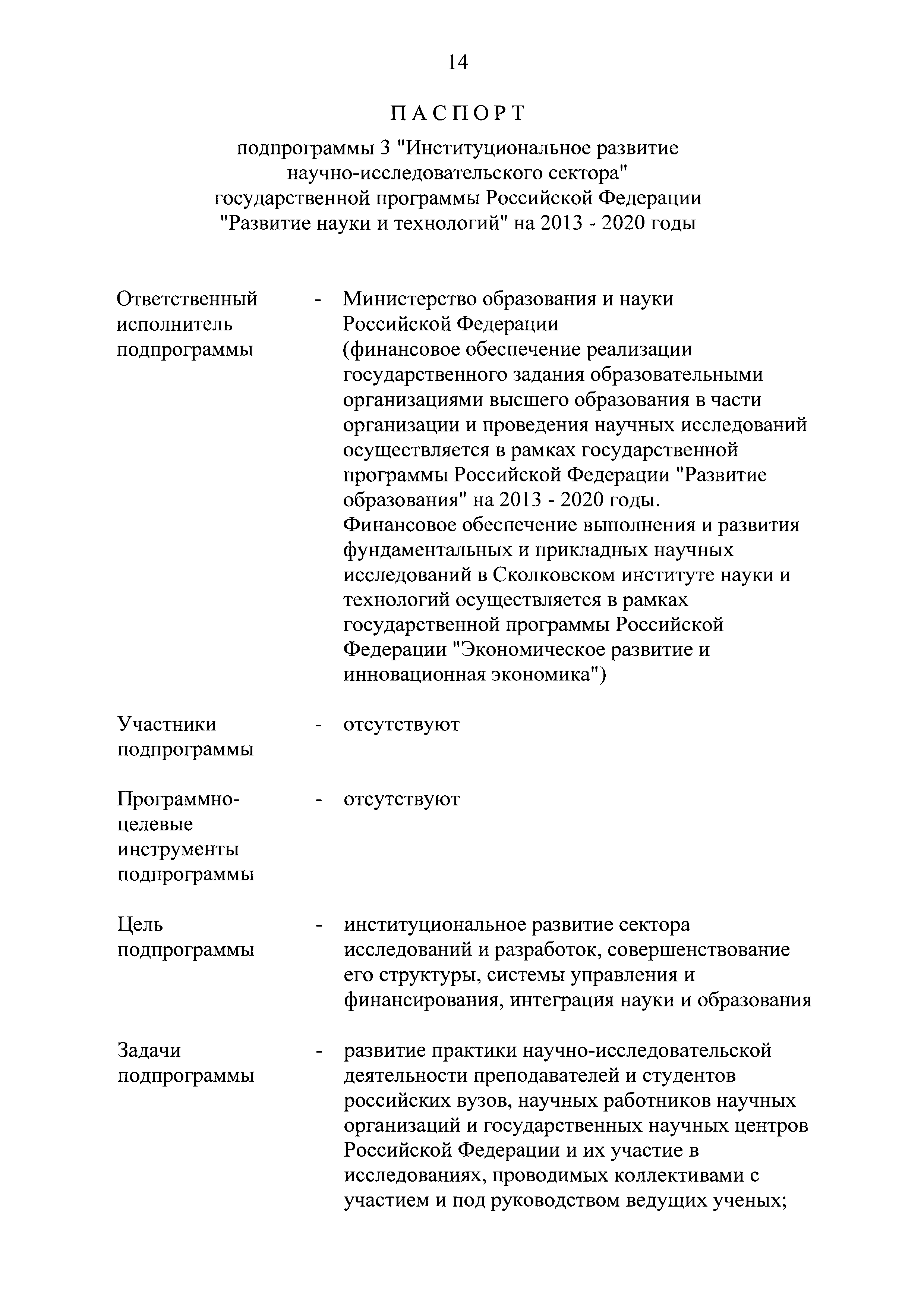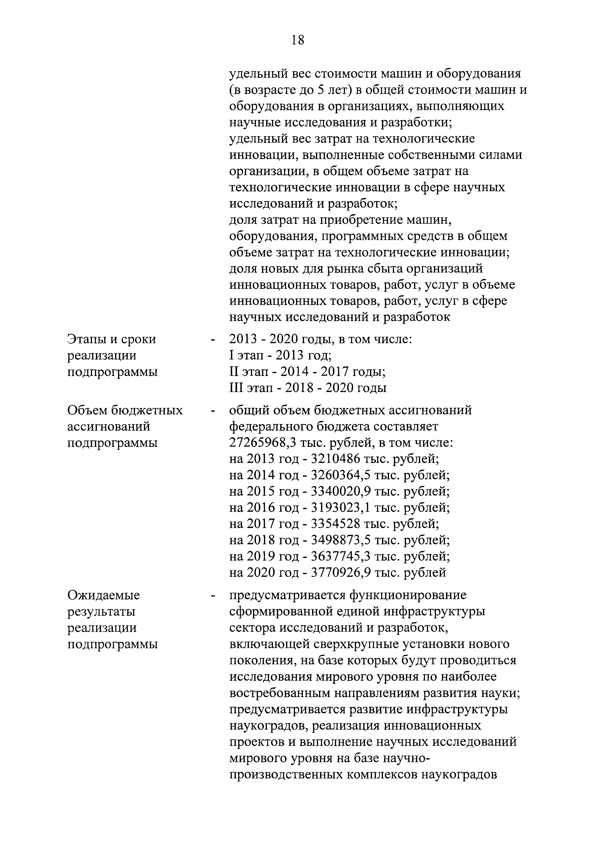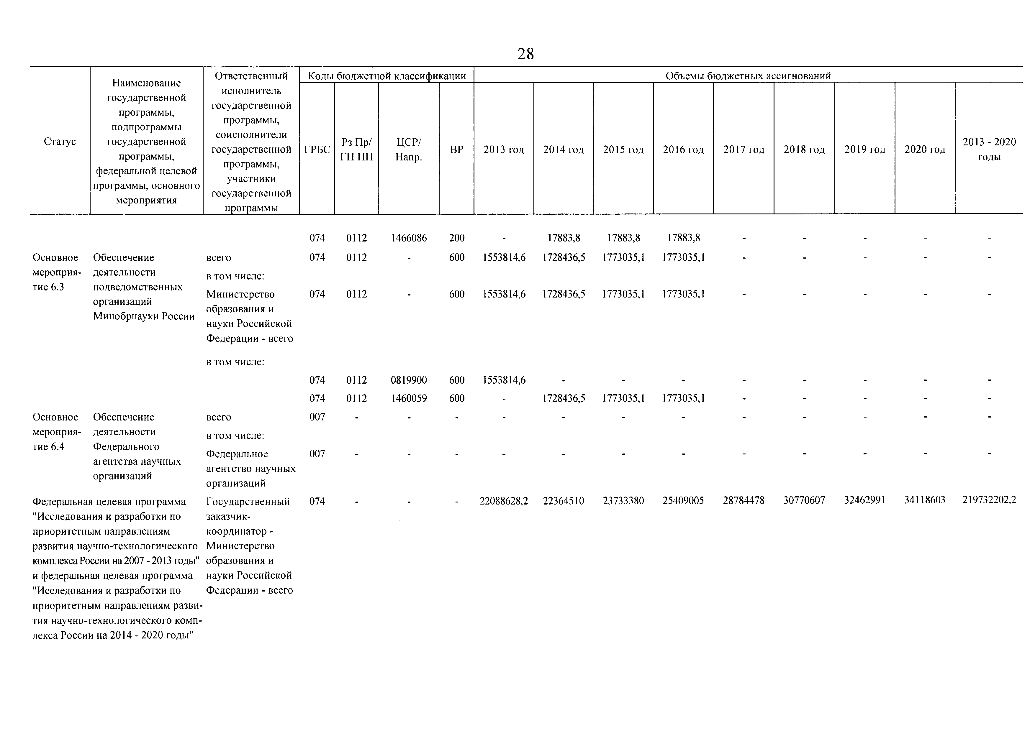 | Оглавление: | Паспорт государственной программы Российской Федерации "Развитие науки и технологий" на 2013 - 2020 годы Паспорт подпрограммы 1 "Фундаментальные научные исследования" государственной программы Российской Федерации "Развитие науки и технологий" на 2013 - 2020 годы Паспорт подпрограммы 2 "Прикладные проблемно ориентированные исследования и развитие научно-технологического задела в области перспективных технологий" государственной программы Российской Федерации "Развитие науки и технологий" на 2013 - 2020 годы Паспорт подпрограммы 3 "Институциональное развитие научно-исследовательского сектора" государственной программы Российской Федерации "Развитие науки и технологий" на 2013 - 2020 годы Паспорт подпрограммы 4 "Развитие межотраслевой инфраструктуры сектора исследований и разработок" государственной программы Российской Федерации "Развитие науки и технологий" на 2013 - 2020 годы Паспорт подпрограммы 5 "Международное сотрудничество в сфере науки" государственной программы Российской Федерации "Развитие науки и технологий" на 2013 - 2020 годы Паспорт подпрограммы 6 "Обеспечение реализации Государственной программы" государственной программы Российской Федерации "Развитие науки и технологий" на 2013 - 2020 годы Федеральная целевая программа "Исследования и разработки по приоритетным направлениям развития научно-технологического комплекса России на 2007 - 2013 годы" Паспорт федеральной целевой программы "Исследования и разработки по приоритетным направлениям развития научно-технологического комплекса России на 2007 - 2013 годы" Федеральная целевая программа "Исследования и разработки по приоритетным направлениям развития научно-технологического комплекса России на 2014 - 2020 годы" Паспорт федеральной целевой программы "Исследования и разработки по приоритетным направлениям развития научно-технологического комплекса России на 2014 - 2020 годы" Федеральная целевая программа "Научные и научно-педагогические кадры инновационной России" на 2009 - 2013 годы Паспорт федеральной целевой программы "Научные и научно-педагогические кадры инновационной России" на 2009 - 2013 годы Федеральная целевая программа "Научные и научно-педагогические кадры инновационной России" на 2014 - 2020 годы Паспорт федеральной целевой программы "Научные и научно-педагогические кадры инновационной России" на 2014 - 2020 годы Федеральная целевая программа "Мировой океан" Паспорт федеральной целевой программы "Мировой океан" Приоритеты и цели государственной политики в сфере реализации государственной программы Российской Федерации "Развитие науки и технологий" на 2013 - 2020 годы Приложение № 1. Сведения о показателях (индикаторах) государственной программы Российской Федерации "Развитие науки и технологий" на 2013 - 2020 годы, подпрограмм государственной программы Российской Федерации "Развитие науки и технологий" на 2013 - 2020 годы, федеральных целевых программ (подпрограмм федеральных целевых программ) Приложение № 2. Перечень основных мероприятий государственной программы Российской Федерации "Развитие науки и технологий" на 2013 - 2020 годы Приложение № 3. Сведения об основных мерах правового регулирования в сфере реализации государственной программы Российской Федерации "Развитие науки и технологий" на 2013 - 2020 годы Приложение № 4. Ресурсное обеспечение реализации государственной прогр