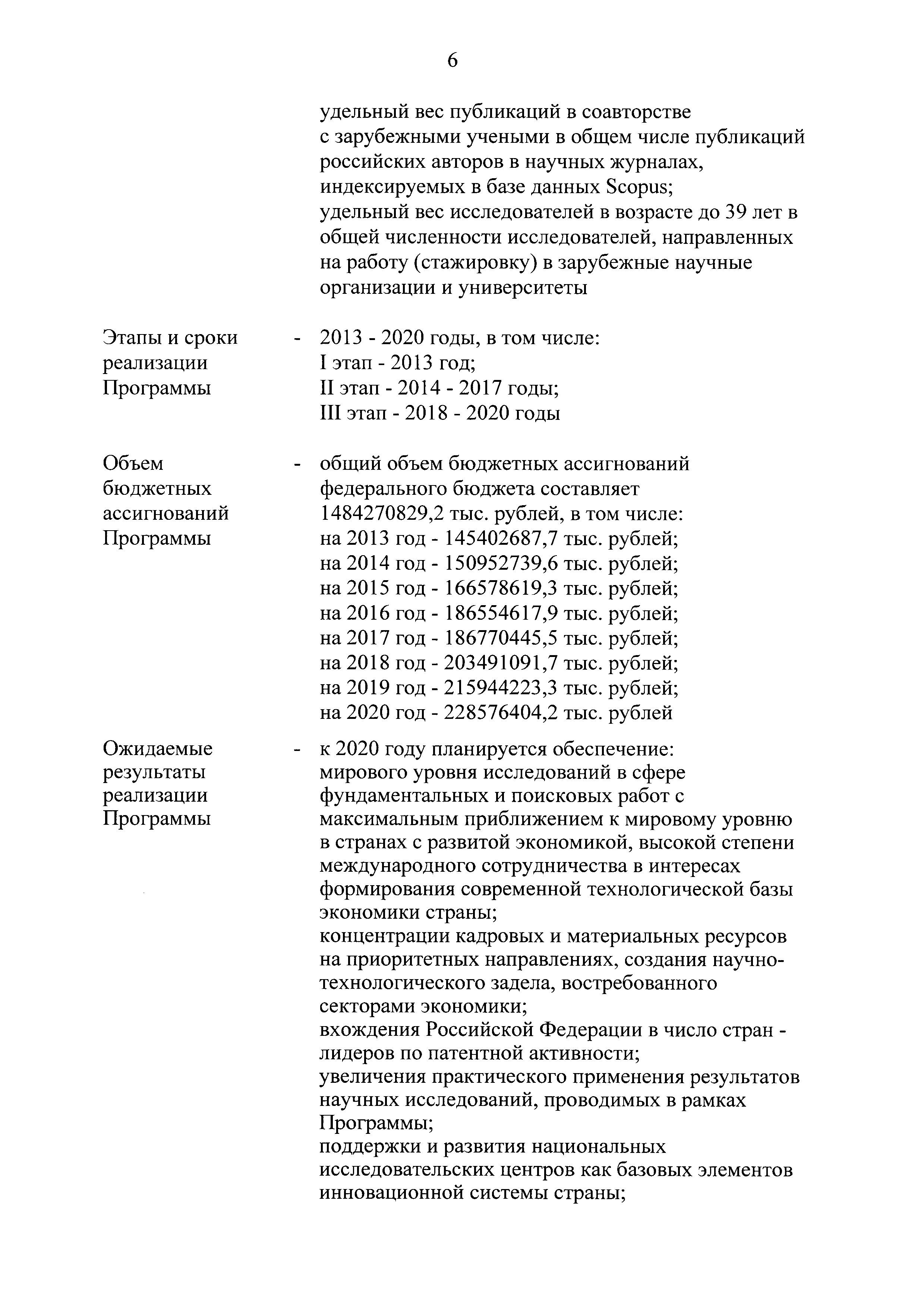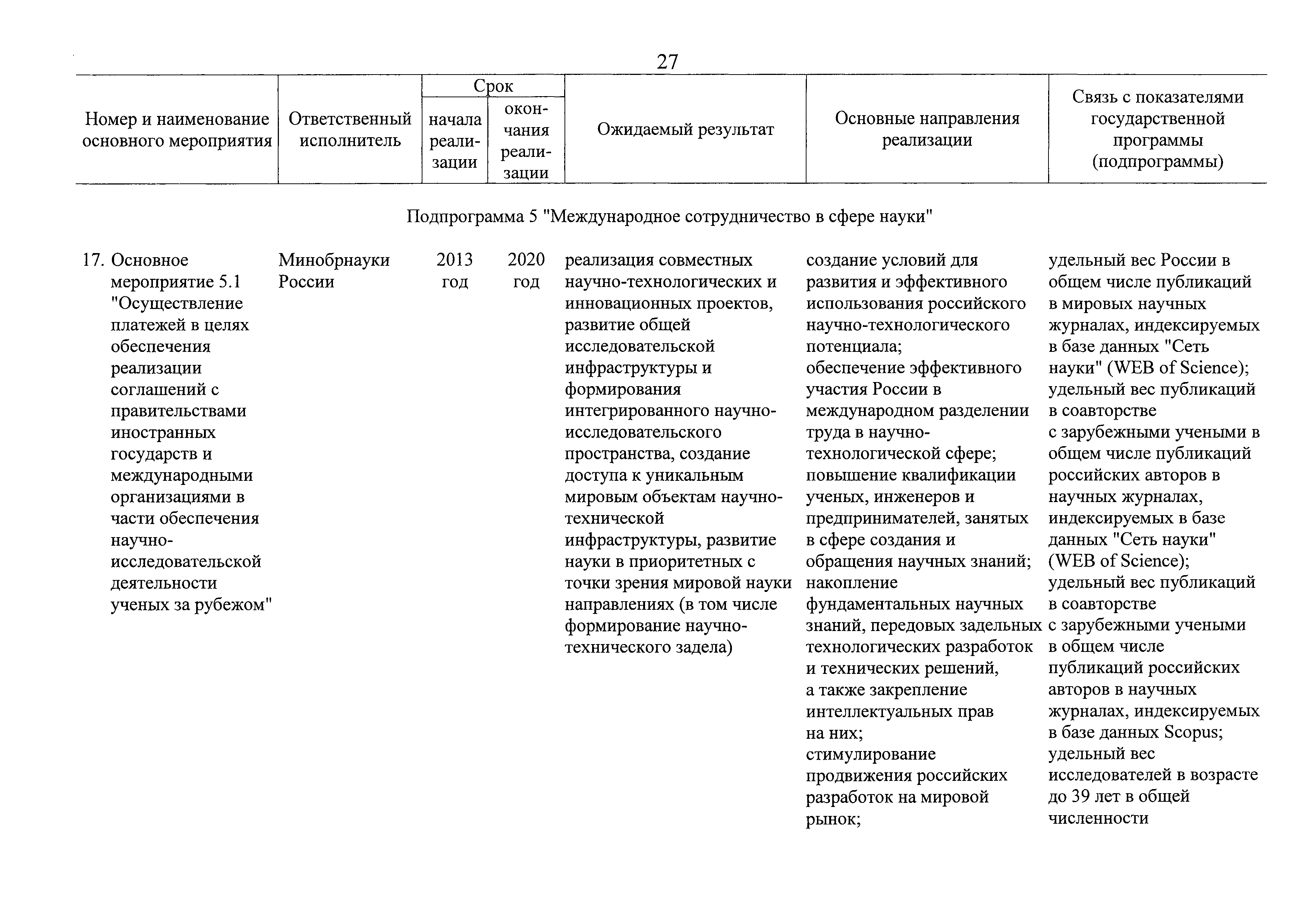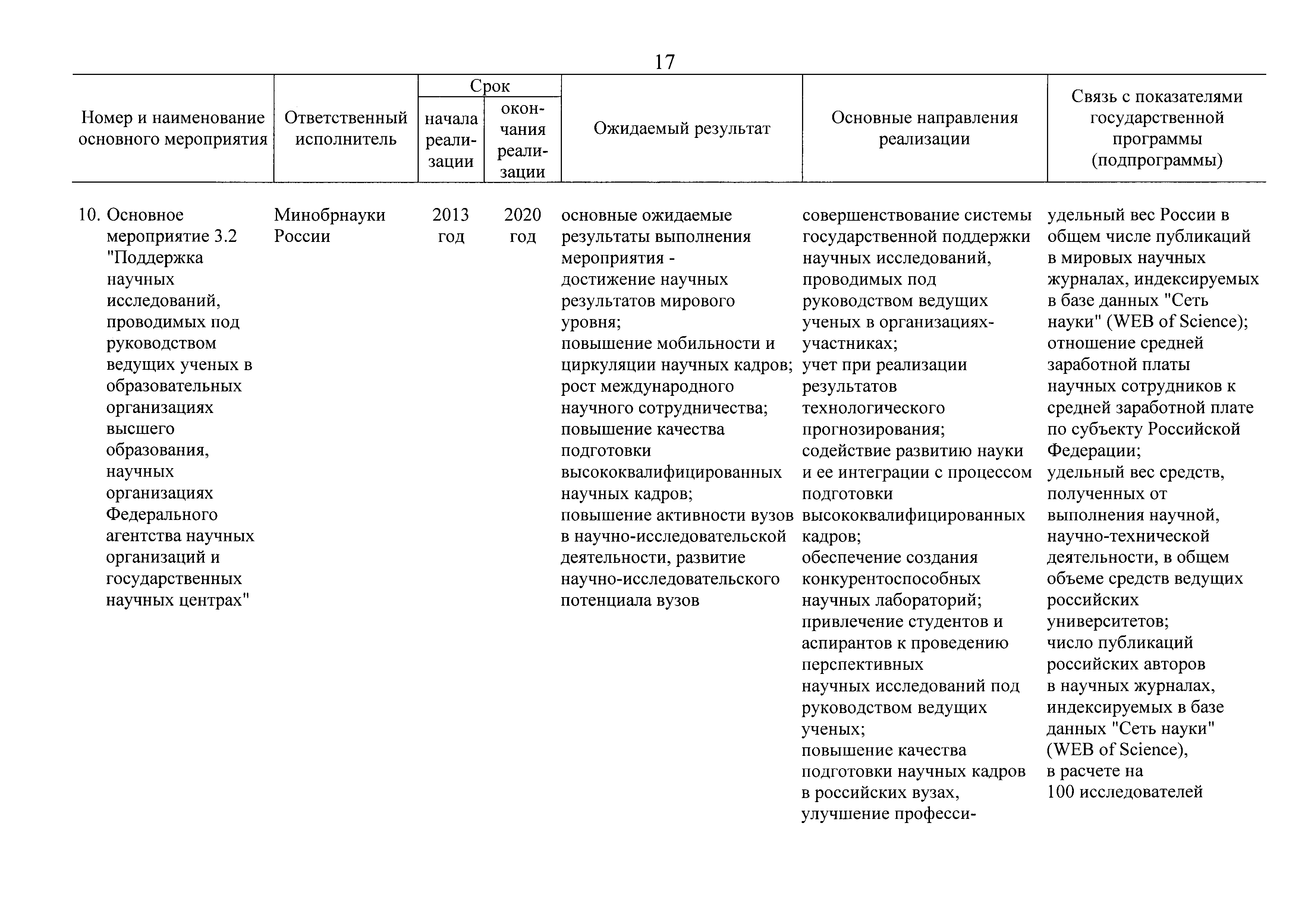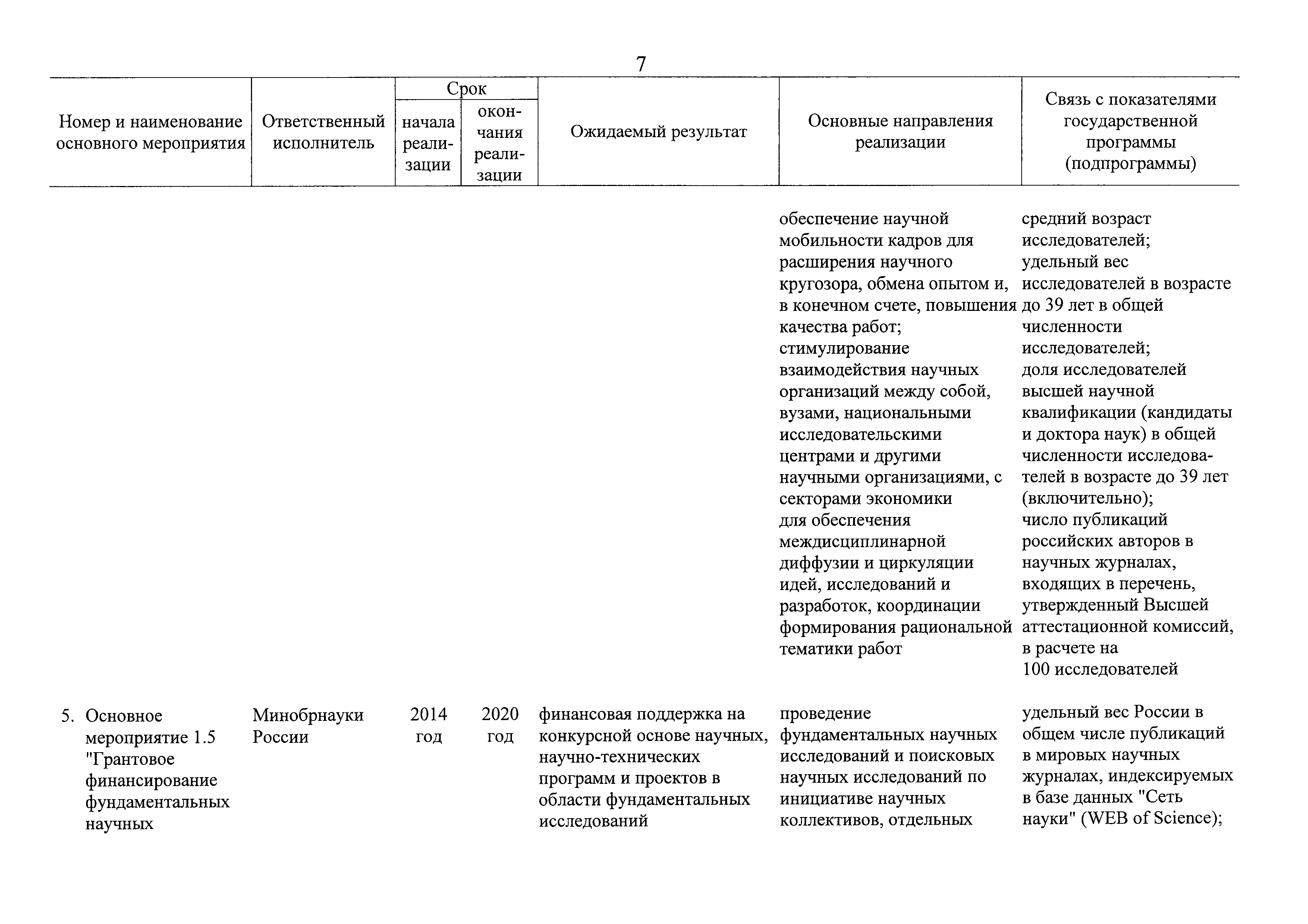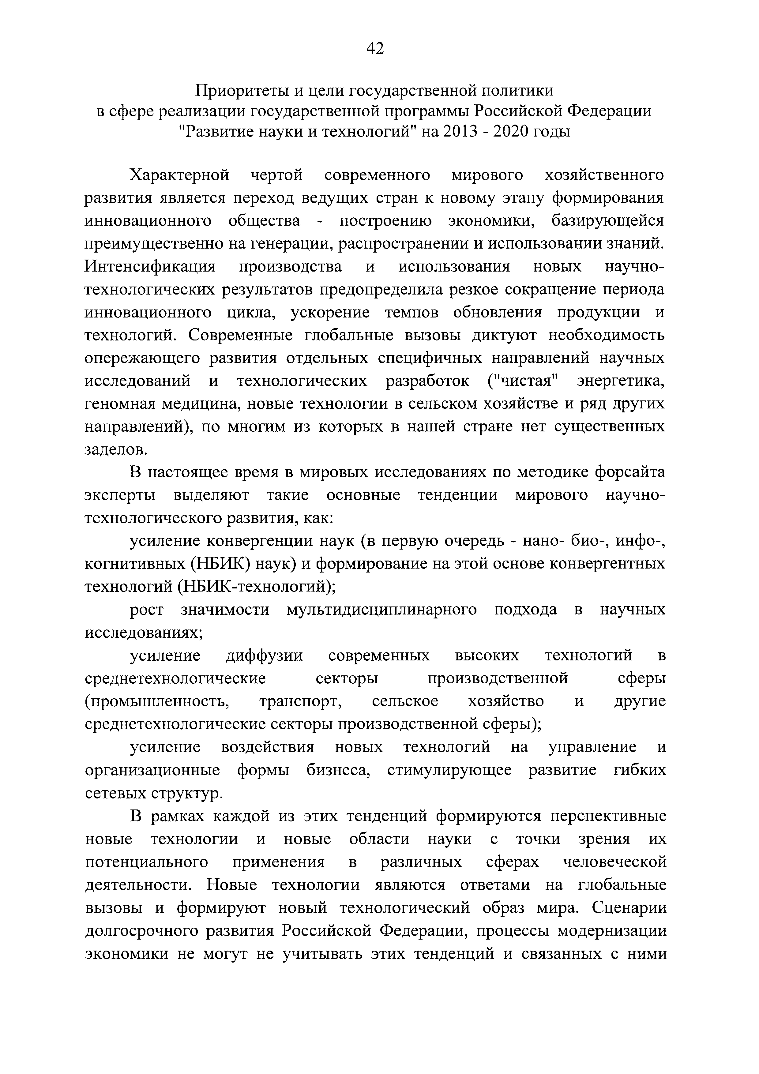 | Оглавление: | Паспорт государственной программы Российской Федерации "Развитие науки и технологий" на 2013 - 2020 годы Паспорт подпрограммы 1 "Фундаментальные научные исследования" государственной программы Российской Федерации "Развитие науки и технологий" на 2013 - 2020 годы Паспорт подпрограммы 2 "Прикладные проблемно ориентированные исследования и развитие научно-технологического задела в области перспективных технологий" государственной программы Российской Федерации "Развитие науки и технологий" на 2013 - 2020 годы Паспорт подпрограммы 3 "Институциональное развитие научно-исследовательского сектора" государственной программы Российской Федерации "Развитие науки и технологий" на 2013 - 2020 годы Паспорт подпрограммы 4 "Развитие межотраслевой инфраструктуры сектора исследований и разработок" государственной программы Российской Федерации "Развитие науки и технологий" на 2013 - 2020 годы Паспорт подпрограммы 5 "Международное сотрудничество в сфере науки" государственной программы Российской Федерации "Развитие науки и технологий" на 2013 - 2020 годы Паспорт подпрограммы 6 "Обеспечение реализации Государственной программы" государственной программы Российской Федерации "Развитие науки и технологий" на 2013 - 2020 годы Федеральная целевая программа "Исследования и разработки по приоритетным направлениям развития научно-технологического комплекса России на 2007 - 2013 годы" Паспорт федеральной целевой программы "Исследования и разработки по приоритетным направлениям развития научно-технологического комплекса России на 2007 - 2013 годы" Федеральная целевая программа "Исследования и разработки по приоритетным направлениям развития научно-технологического комплекса России на 2014 - 2020 годы" Паспорт федеральной целевой программы "Исследования и разработки по приоритетным направлениям развития научно-технологического комплекса России на 2014 - 2020 годы" Федеральная целевая программа "Научные и научно-педагогические кадры инновационной России" на 2009 - 2013 годы Паспорт федеральной целевой программы "Научные и научно-педагогические кадры инновационной России" на 2009 - 2013 годы Федеральная целевая программа "Научные и научно-педагогические кадры инновационной России" на 2014 - 2020 годы Паспорт федеральной целевой программы "Научные и научно-педагогические кадры инновационной России" на 2014 - 2020 годы Федеральная целевая программа "Мировой океан" Паспорт федеральной целевой программы "Мировой океан" Приоритеты и цели государственной политики в сфере реализации государственной программы Российской Федерации "Развитие науки и технологий" на 2013 - 2020 годы Приложение № 1. Сведения о показателях (индикаторах) государственной программы Российской Федерации "Развитие науки и технологий" на 2013 - 2020 годы, подпрограмм государственной программы Российской Федерации "Развитие науки и технологий" на 2013 - 2020 годы, федеральных целевых программ (подпрограмм федеральных целевых программ) Приложение № 2. Перечень основных мероприятий государственной программы Российской Федерации "Развитие науки и технологий" на 2013 - 2020 годы Приложение № 3. Сведения об основных мерах правового регулирования в сфере реализации государственной программы Российской Федерации "Развитие науки и технологий" на 2013 - 2020 годы Приложение № 4. Ресурсное обеспечение реализации государственной прогр