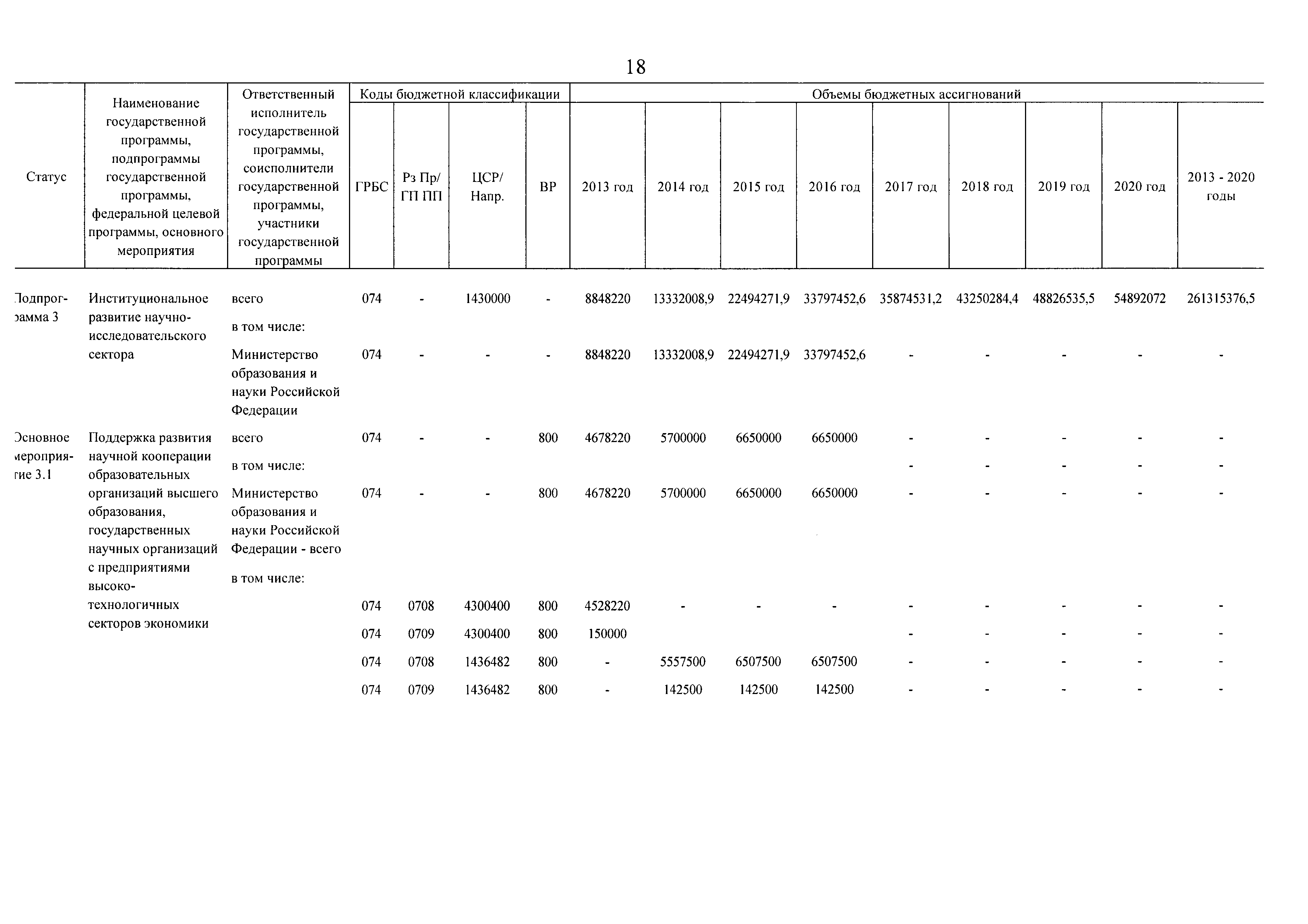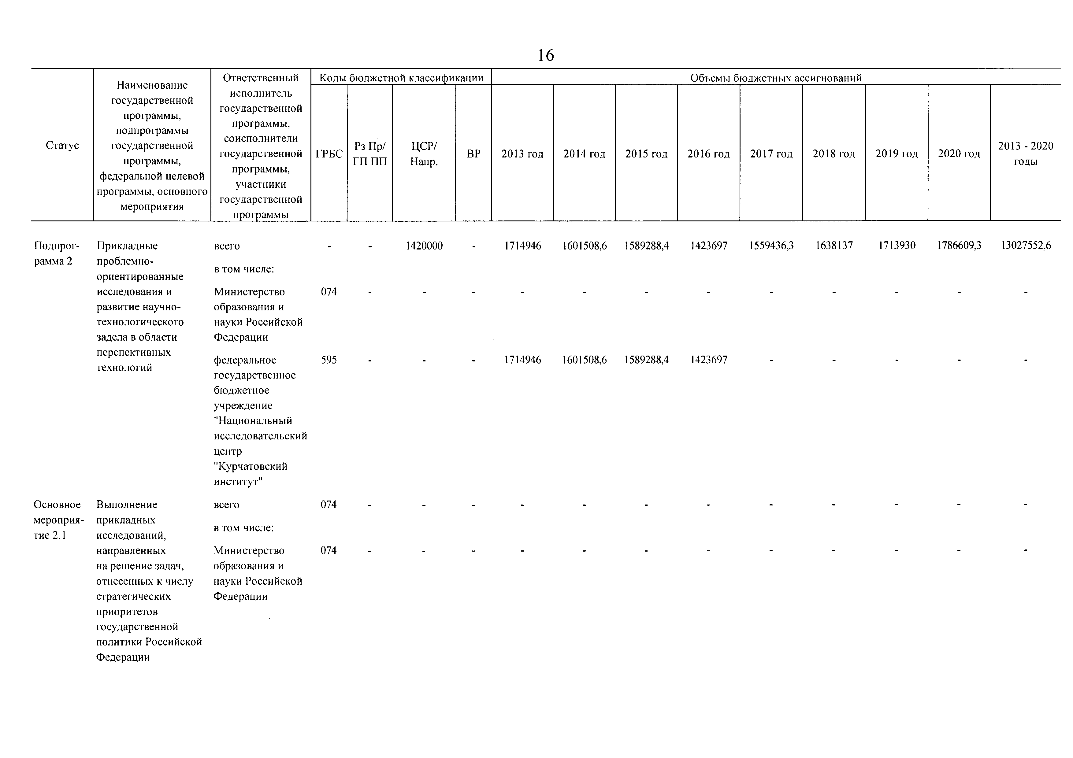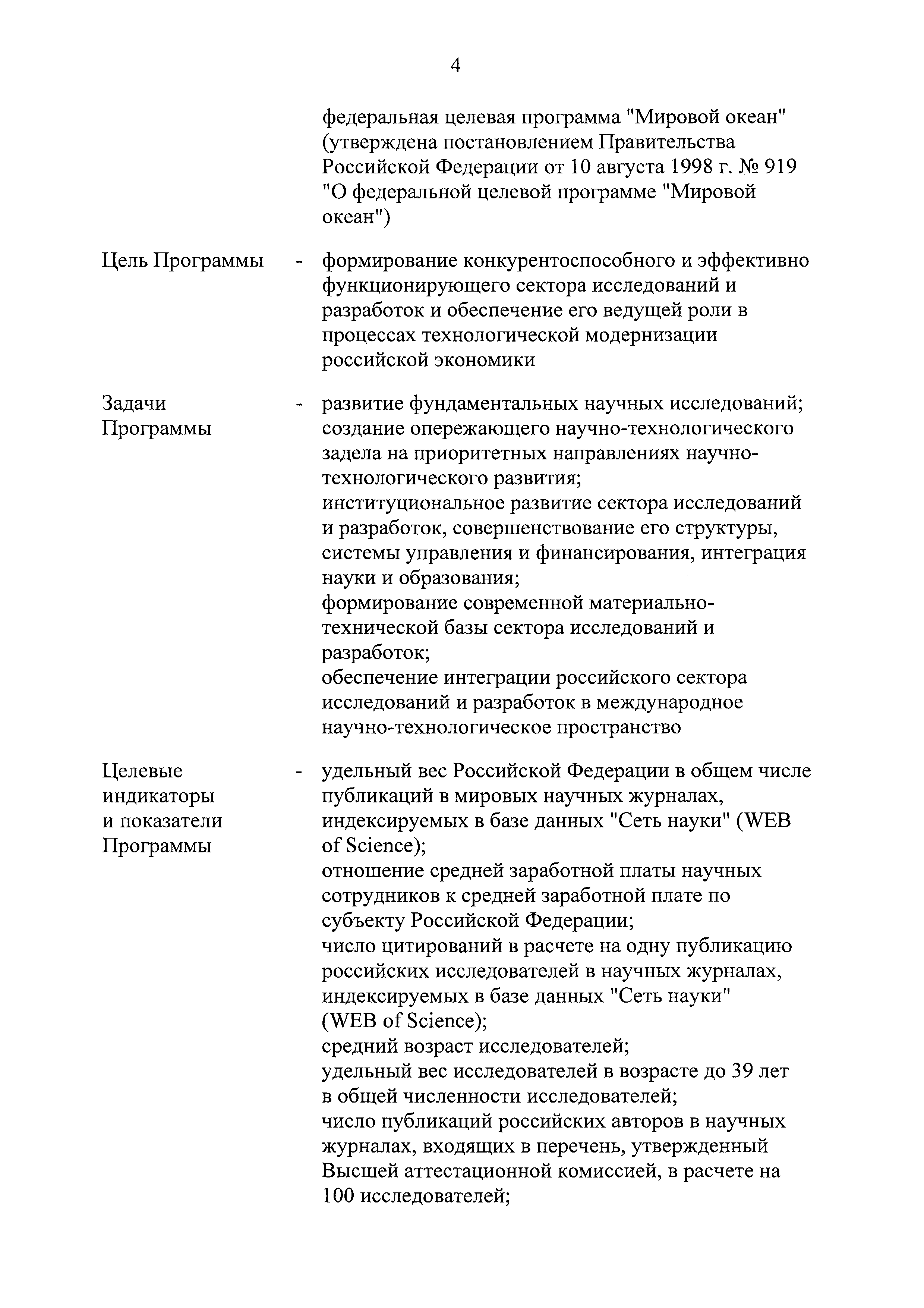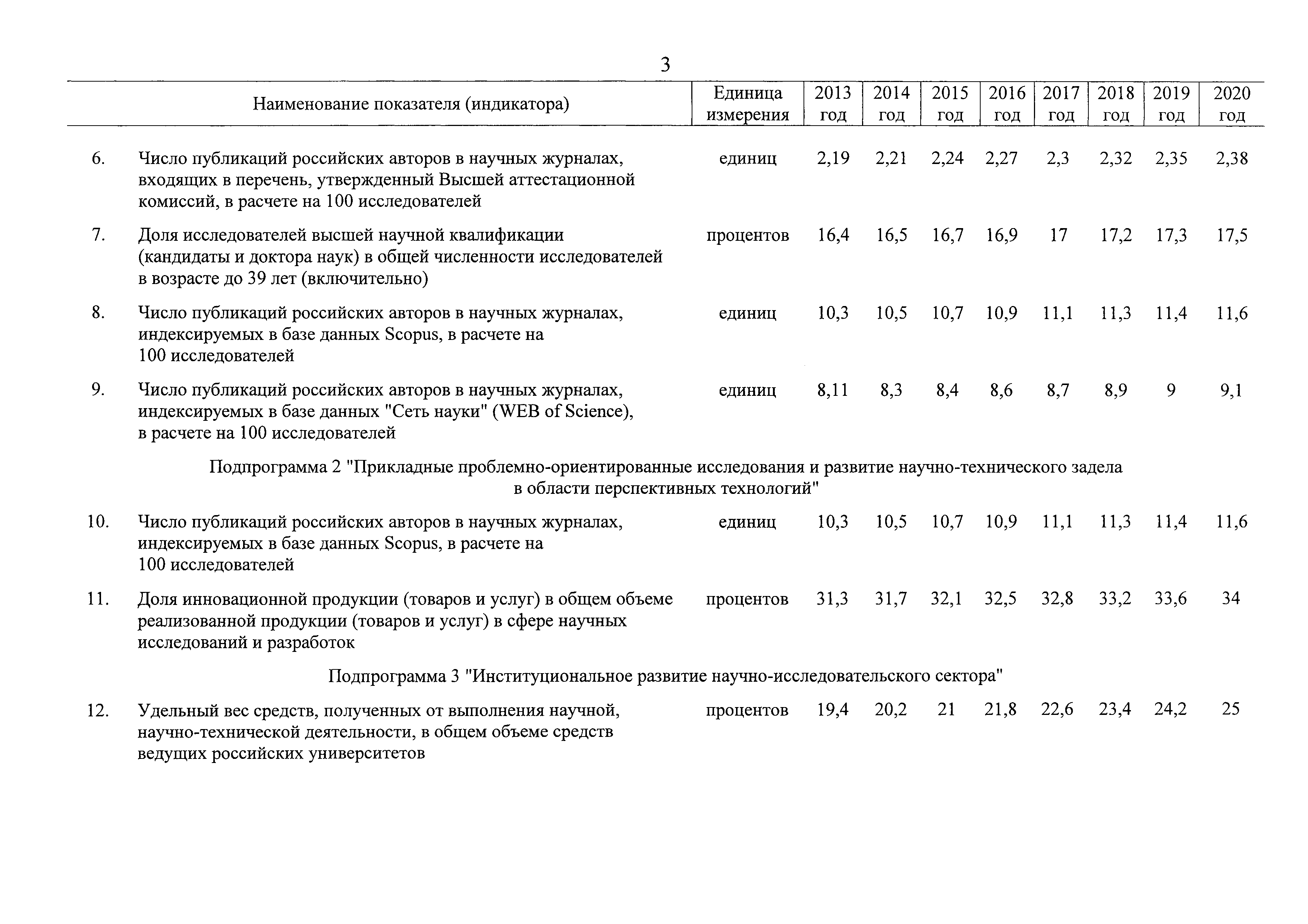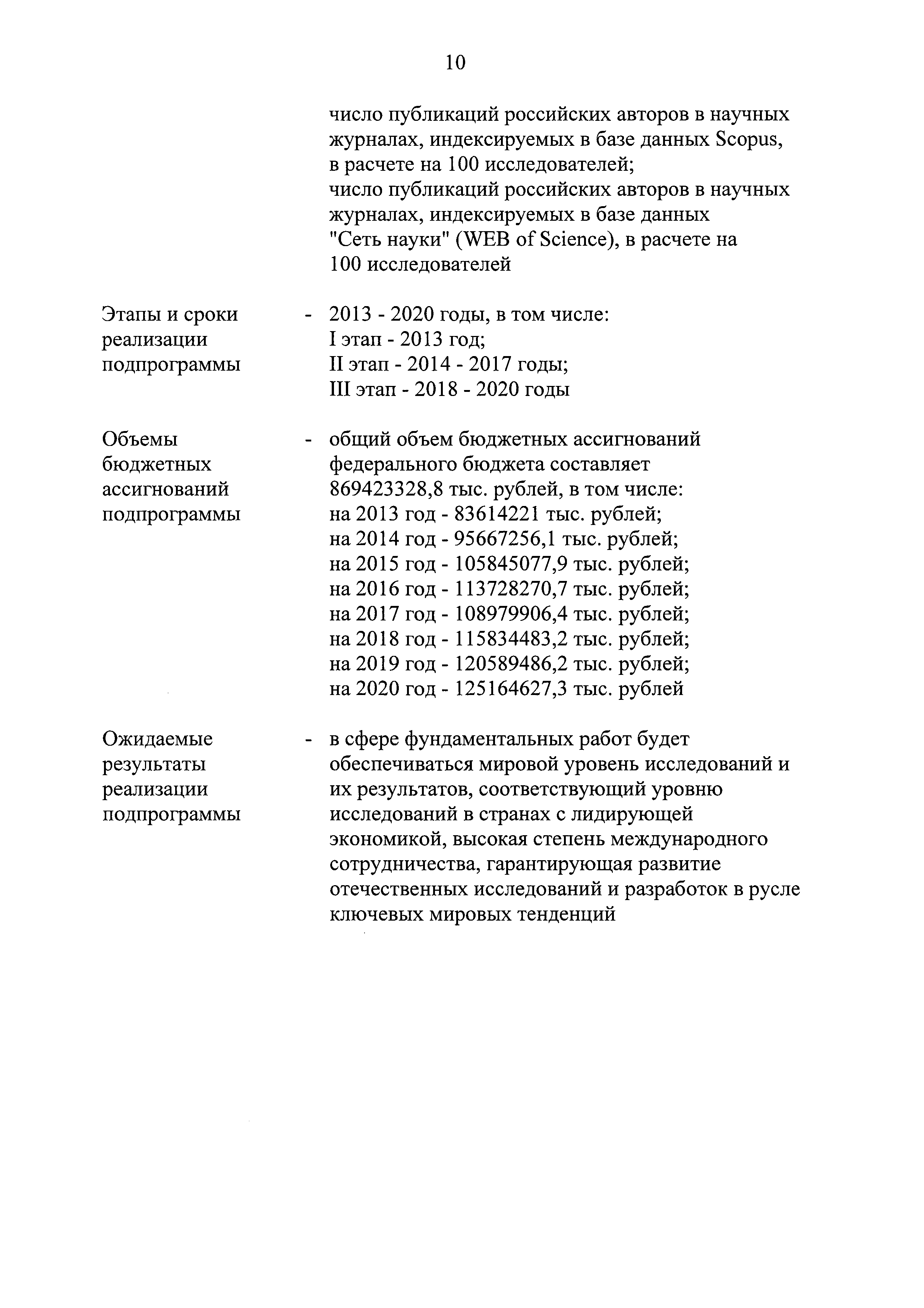 | Оглавление: | Паспорт государственной программы Российской Федерации "Развитие науки и технологий" на 2013 - 2020 годы Паспорт подпрограммы 1 "Фундаментальные научные исследования" государственной программы Российской Федерации "Развитие науки и технологий" на 2013 - 2020 годы Паспорт подпрограммы 2 "Прикладные проблемно ориентированные исследования и развитие научно-технологического задела в области перспективных технологий" государственной программы Российской Федерации "Развитие науки и технологий" на 2013 - 2020 годы Паспорт подпрограммы 3 "Институциональное развитие научно-исследовательского сектора" государственной программы Российской Федерации "Развитие науки и технологий" на 2013 - 2020 годы Паспорт подпрограммы 4 "Развитие межотраслевой инфраструктуры сектора исследований и разработок" государственной программы Российской Федерации "Развитие науки и технологий" на 2013 - 2020 годы Паспорт подпрограммы 5 "Международное сотрудничество в сфере науки" государственной программы Российской Федерации "Развитие науки и технологий" на 2013 - 2020 годы Паспорт подпрограммы 6 "Обеспечение реализации Государственной программы" государственной программы Российской Федерации "Развитие науки и технологий" на 2013 - 2020 годы Федеральная целевая программа "Исследования и разработки по приоритетным направлениям развития научно-технологического комплекса России на 2007 - 2013 годы" Паспорт федеральной целевой программы "Исследования и разработки по приоритетным направлениям развития научно-технологического комплекса России на 2007 - 2013 годы" Федеральная целевая программа "Исследования и разработки по приоритетным направлениям развития научно-технологического комплекса России на 2014 - 2020 годы" Паспорт федеральной целевой программы "Исследования и разработки по приоритетным направлениям развития научно-технологического комплекса России на 2014 - 2020 годы" Федеральная целевая программа "Научные и научно-педагогические кадры инновационной России" на 2009 - 2013 годы Паспорт федеральной целевой программы "Научные и научно-педагогические кадры инновационной России" на 2009 - 2013 годы Федеральная целевая программа "Научные и научно-педагогические кадры инновационной России" на 2014 - 2020 годы Паспорт федеральной целевой программы "Научные и научно-педагогические кадры инновационной России" на 2014 - 2020 годы Федеральная целевая программа "Мировой океан" Паспорт федеральной целевой программы "Мировой океан" Приоритеты и цели государственной политики в сфере реализации государственной программы Российской Федерации "Развитие науки и технологий" на 2013 - 2020 годы Приложение № 1. Сведения о показателях (индикаторах) государственной программы Российской Федерации "Развитие науки и технологий" на 2013 - 2020 годы, подпрограмм государственной программы Российской Федерации "Развитие науки и технологий" на 2013 - 2020 годы, федеральных целевых программ (подпрограмм федеральных целевых программ) Приложение № 2. Перечень основных мероприятий государственной программы Российской Федерации "Развитие науки и технологий" на 2013 - 2020 годы Приложение № 3. Сведения об основных мерах правового регулирования в сфере реализации государственной программы Российской Федерации "Развитие науки и технологий" на 2013 - 2020 годы Приложение № 4. Ресурсное обеспечение реализации государственной прогр
