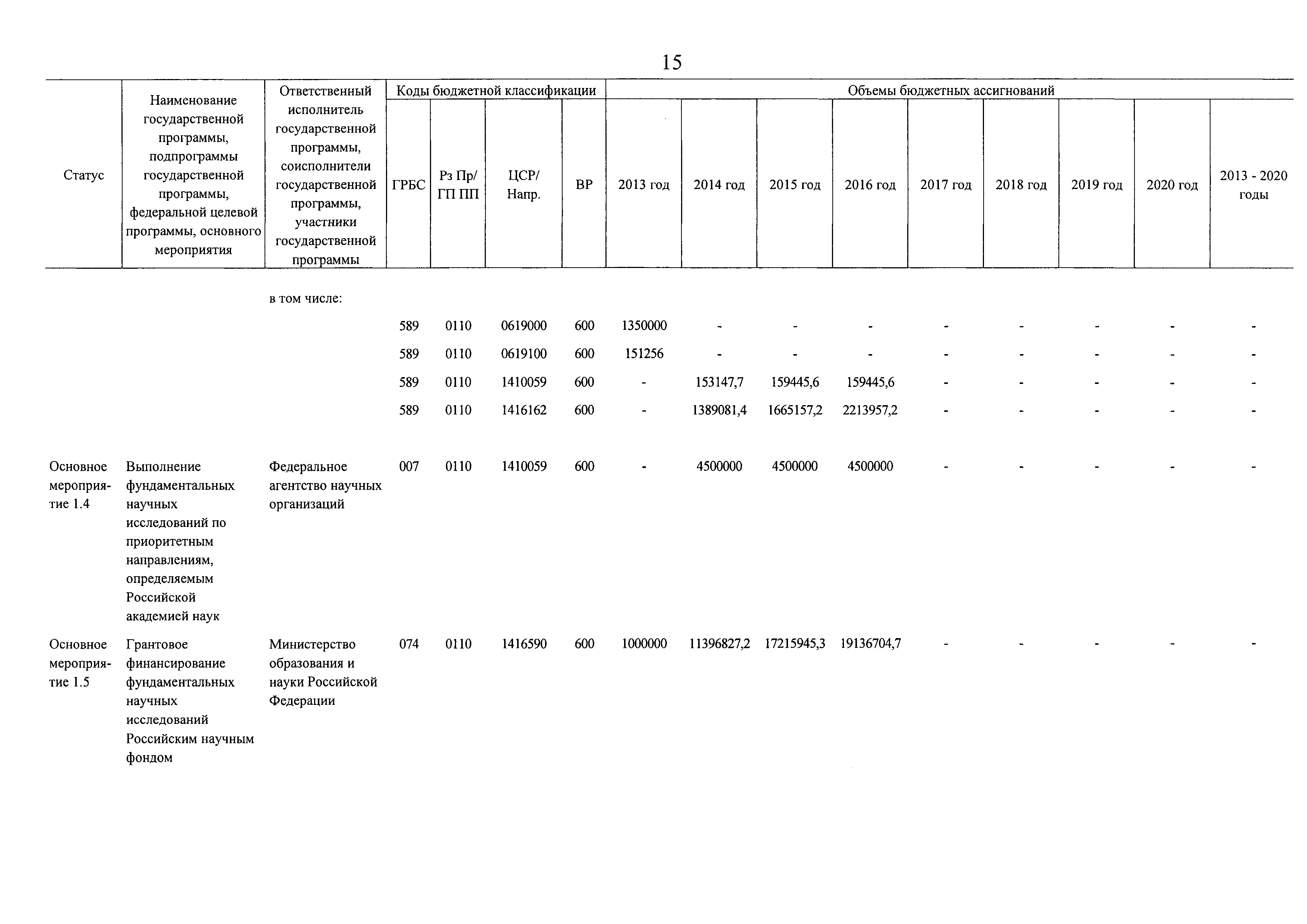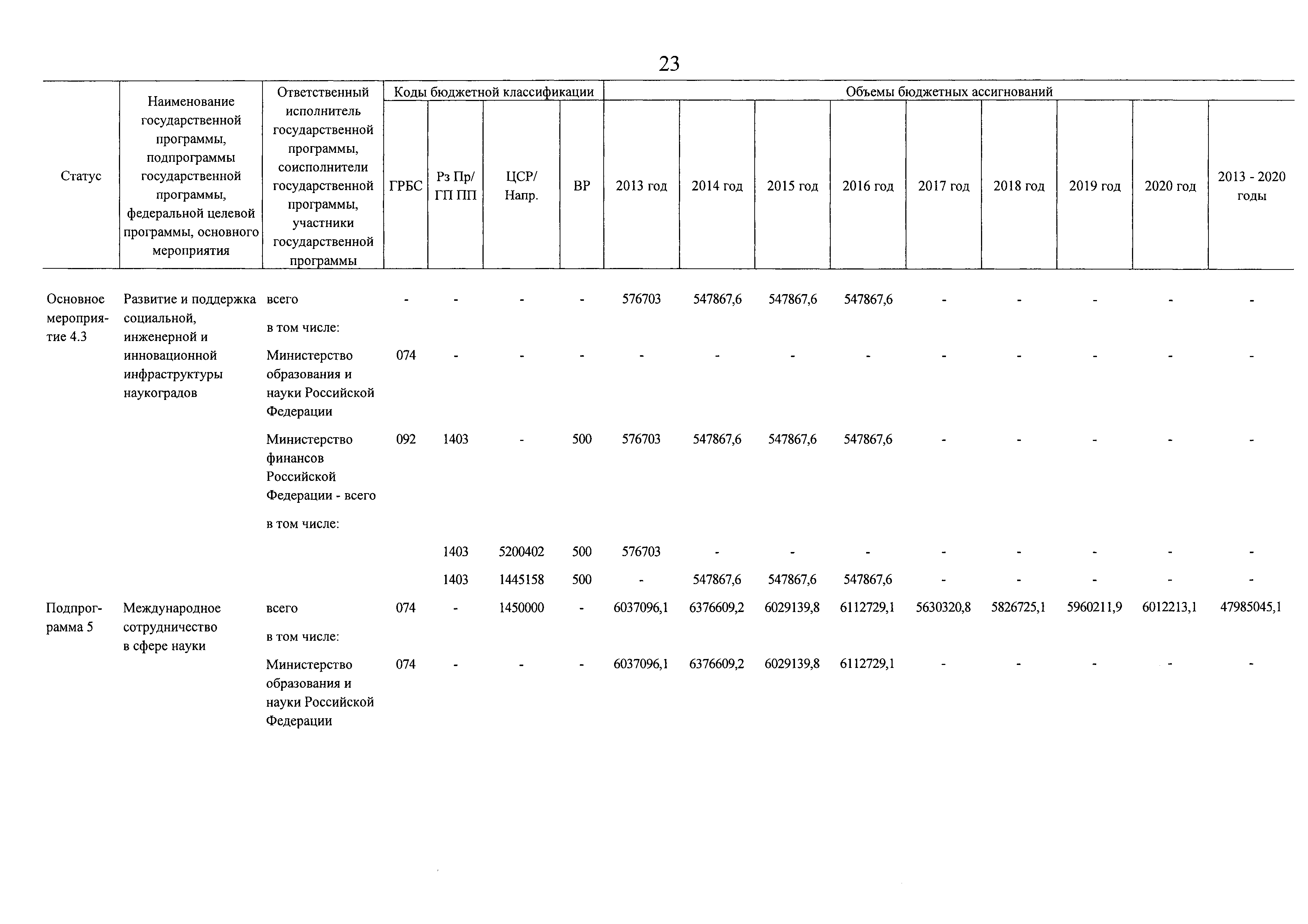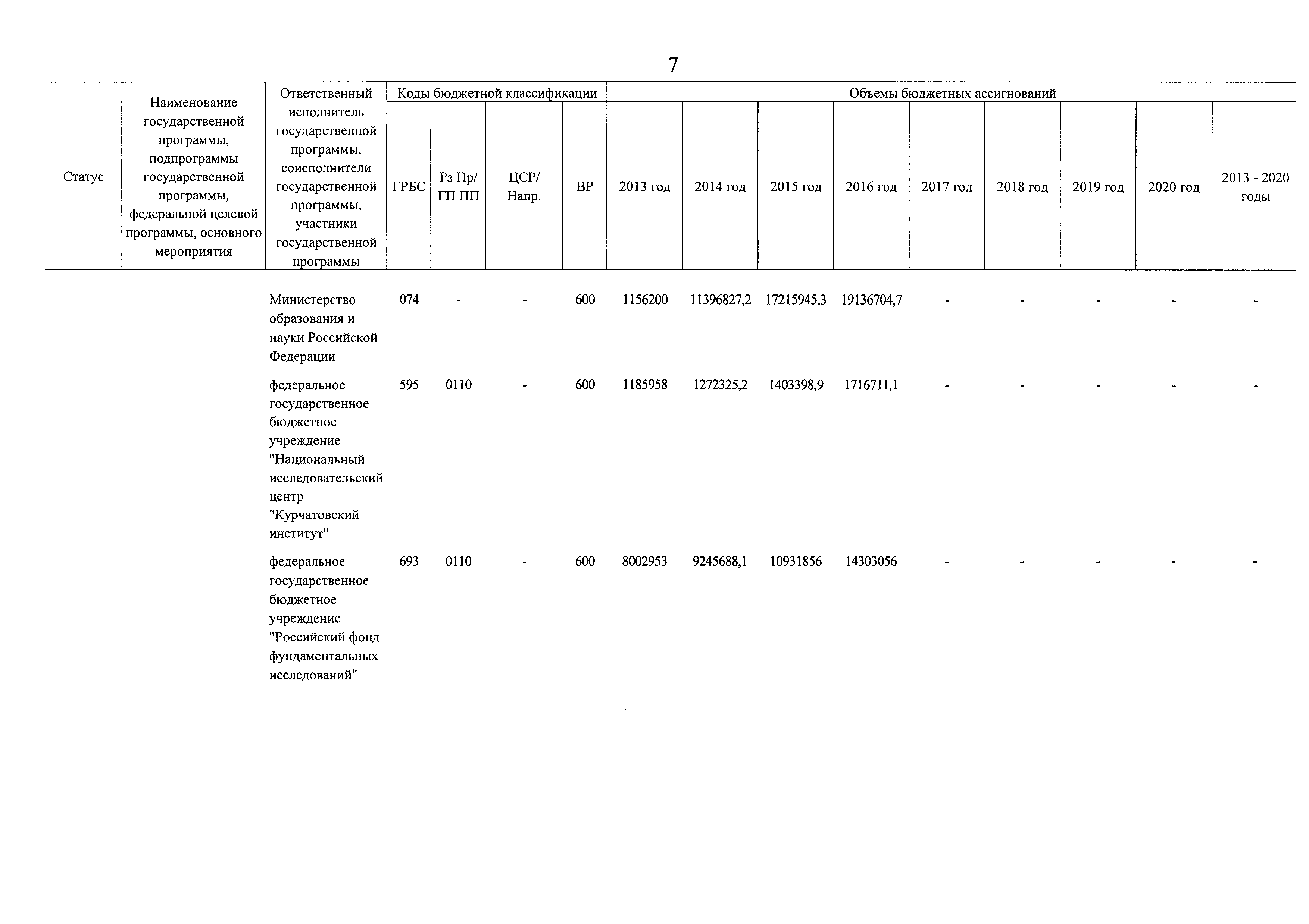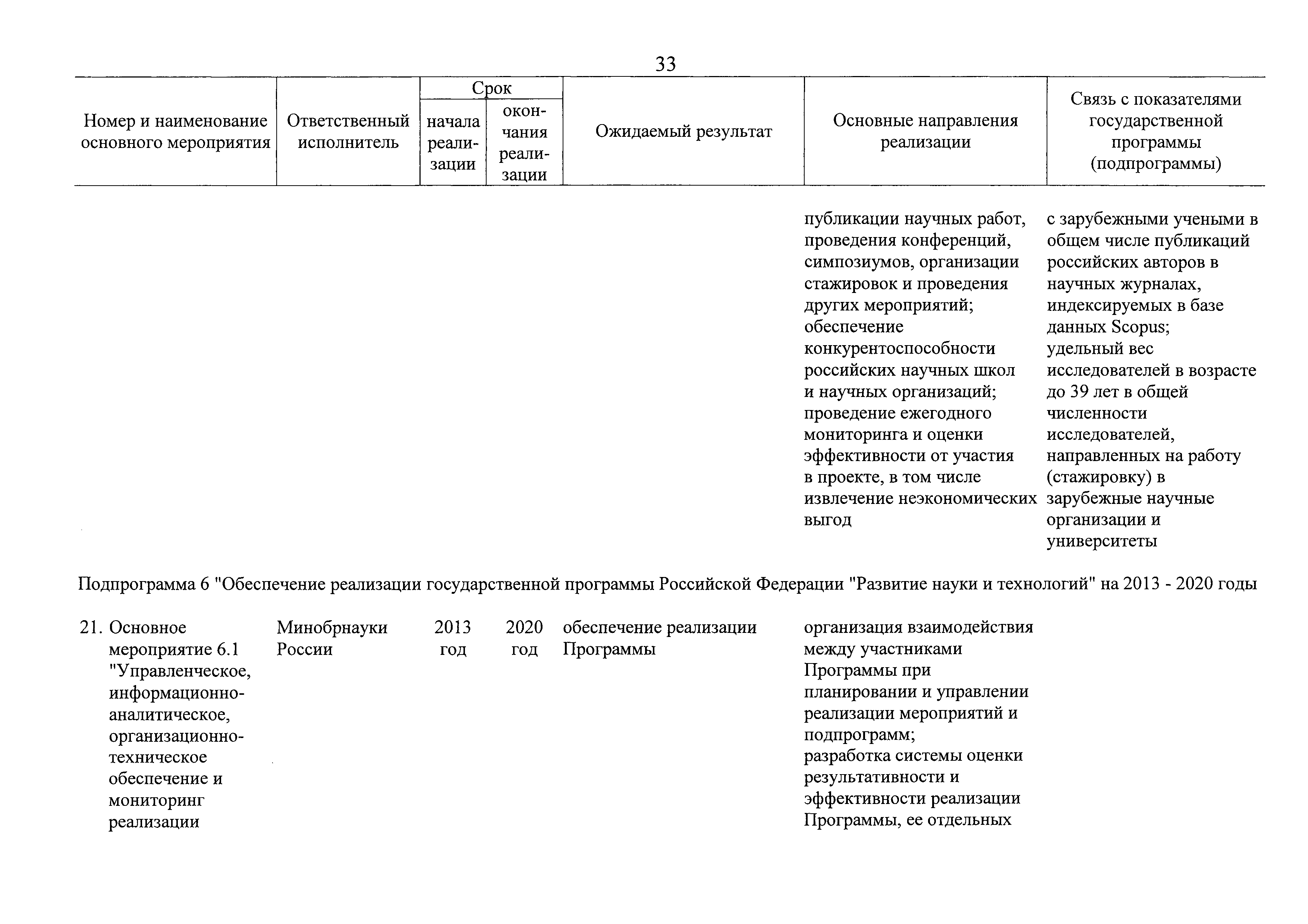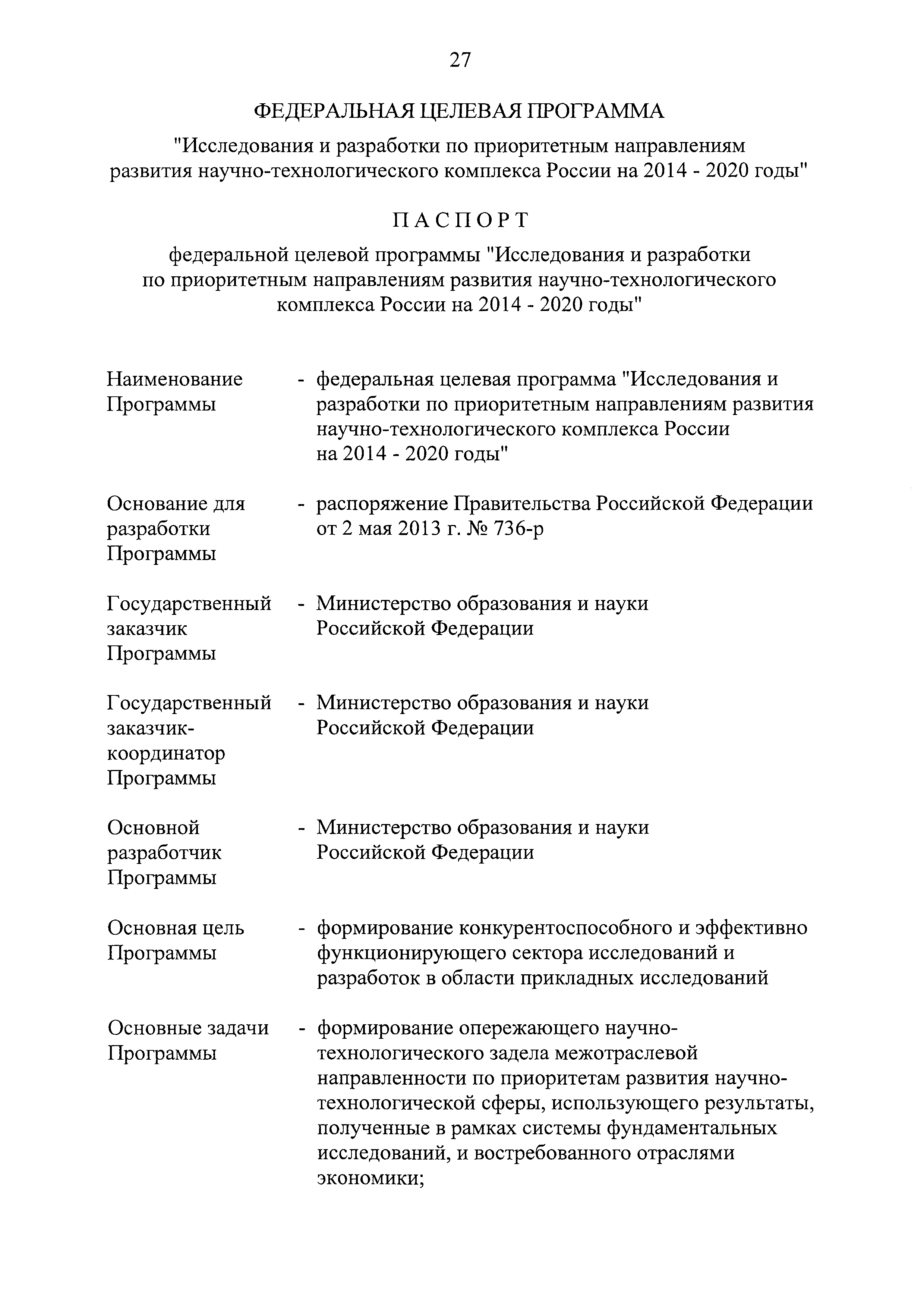 | Оглавление: | Паспорт государственной программы Российской Федерации "Развитие науки и технологий" на 2013 - 2020 годы Паспорт подпрограммы 1 "Фундаментальные научные исследования" государственной программы Российской Федерации "Развитие науки и технологий" на 2013 - 2020 годы Паспорт подпрограммы 2 "Прикладные проблемно ориентированные исследования и развитие научно-технологического задела в области перспективных технологий" государственной программы Российской Федерации "Развитие науки и технологий" на 2013 - 2020 годы Паспорт подпрограммы 3 "Институциональное развитие научно-исследовательского сектора" государственной программы Российской Федерации "Развитие науки и технологий" на 2013 - 2020 годы Паспорт подпрограммы 4 "Развитие межотраслевой инфраструктуры сектора исследований и разработок" государственной программы Российской Федерации "Развитие науки и технологий" на 2013 - 2020 годы Паспорт подпрограммы 5 "Международное сотрудничество в сфере науки" государственной программы Российской Федерации "Развитие науки и технологий" на 2013 - 2020 годы Паспорт подпрограммы 6 "Обеспечение реализации Государственной программы" государственной программы Российской Федерации "Развитие науки и технологий" на 2013 - 2020 годы Федеральная целевая программа "Исследования и разработки по приоритетным направлениям развития научно-технологического комплекса России на 2007 - 2013 годы" Паспорт федеральной целевой программы "Исследования и разработки по приоритетным направлениям развития научно-технологического комплекса России на 2007 - 2013 годы" Федеральная целевая программа "Исследования и разработки по приоритетным направлениям развития научно-технологического комплекса России на 2014 - 2020 годы" Паспорт федеральной целевой программы "Исследования и разработки по приоритетным направлениям развития научно-технологического комплекса России на 2014 - 2020 годы" Федеральная целевая программа "Научные и научно-педагогические кадры инновационной России" на 2009 - 2013 годы Паспорт федеральной целевой программы "Научные и научно-педагогические кадры инновационной России" на 2009 - 2013 годы Федеральная целевая программа "Научные и научно-педагогические кадры инновационной России" на 2014 - 2020 годы Паспорт федеральной целевой программы "Научные и научно-педагогические кадры инновационной России" на 2014 - 2020 годы Федеральная целевая программа "Мировой океан" Паспорт федеральной целевой программы "Мировой океан" Приоритеты и цели государственной политики в сфере реализации государственной программы Российской Федерации "Развитие науки и технологий" на 2013 - 2020 годы Приложение № 1. Сведения о показателях (индикаторах) государственной программы Российской Федерации "Развитие науки и технологий" на 2013 - 2020 годы, подпрограмм государственной программы Российской Федерации "Развитие науки и технологий" на 2013 - 2020 годы, федеральных целевых программ (подпрограмм федеральных целевых программ) Приложение № 2. Перечень основных мероприятий государственной программы Российской Федерации "Развитие науки и технологий" на 2013 - 2020 годы Приложение № 3. Сведения об основных мерах правового регулирования в сфере реализации государственной программы Российской Федерации "Развитие науки и технологий" на 2013 - 2020 годы Приложение № 4. Ресурсное обеспечение реализации государственной прогр