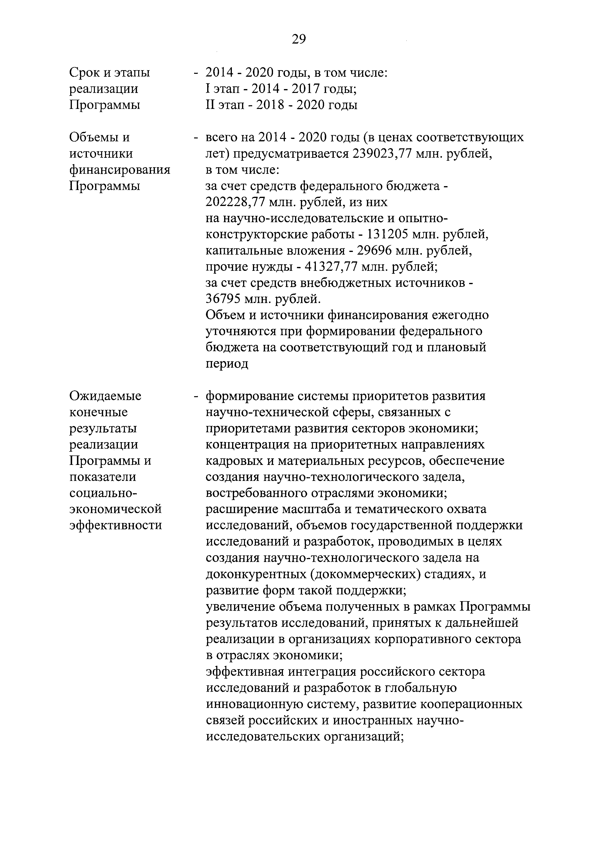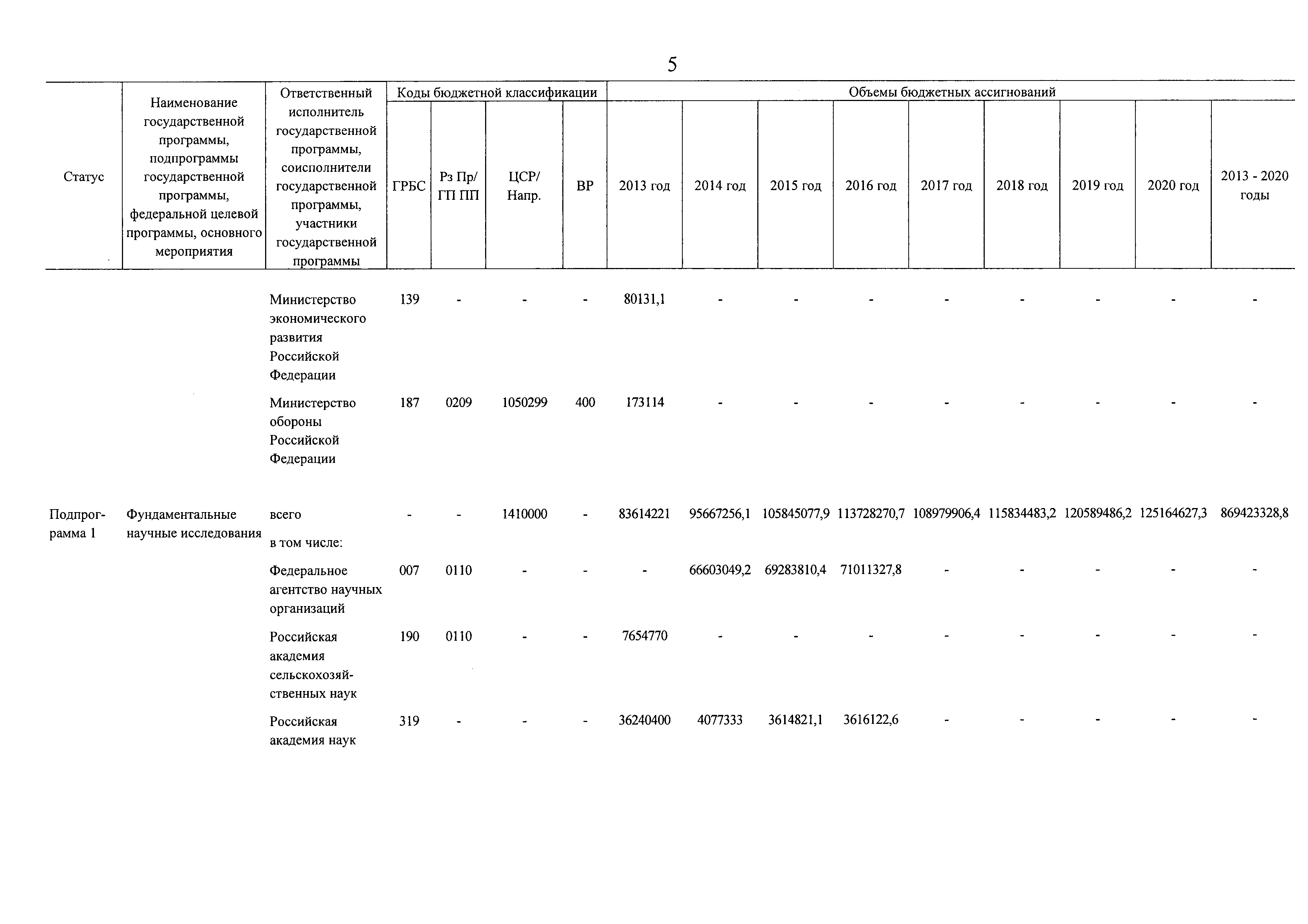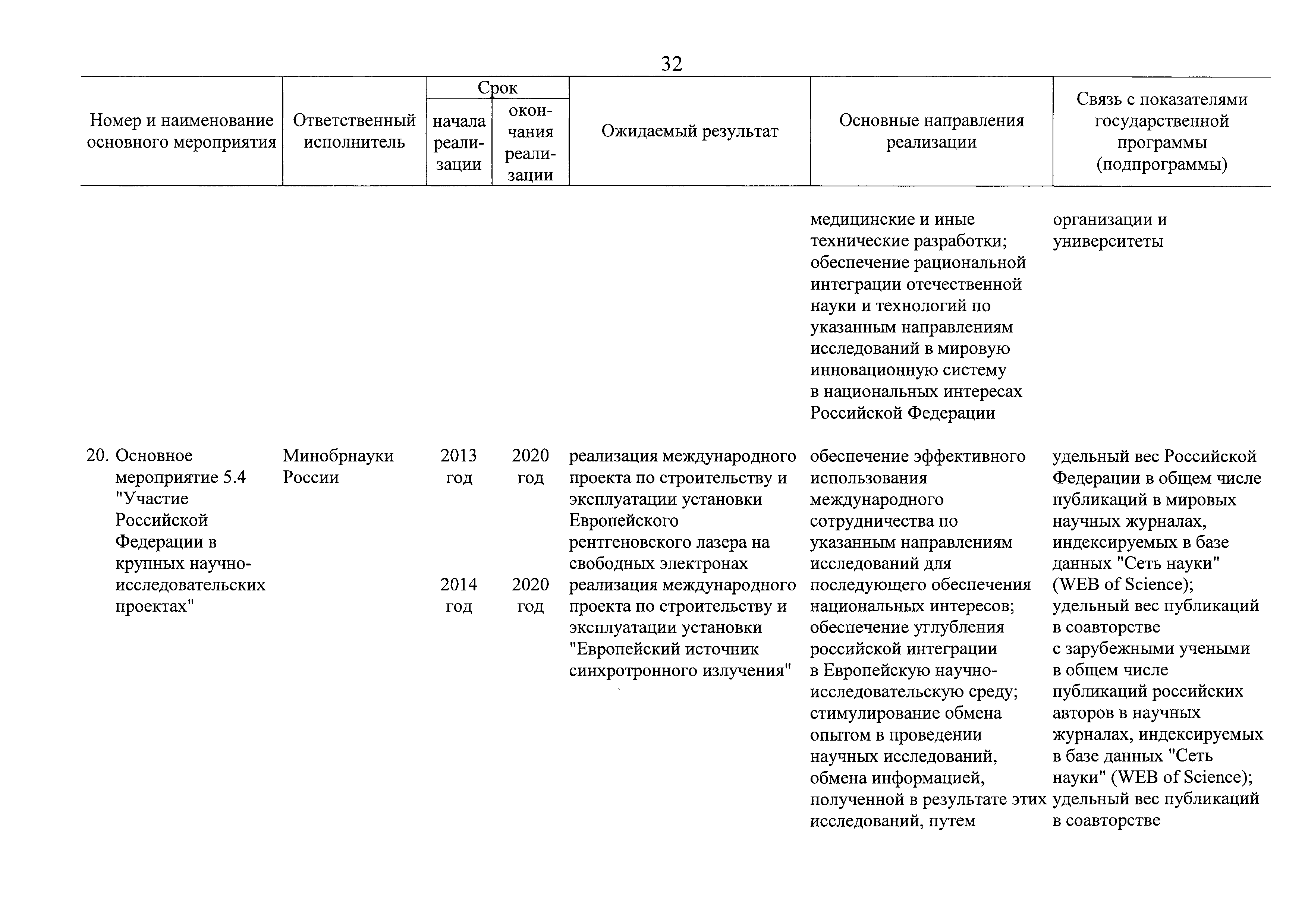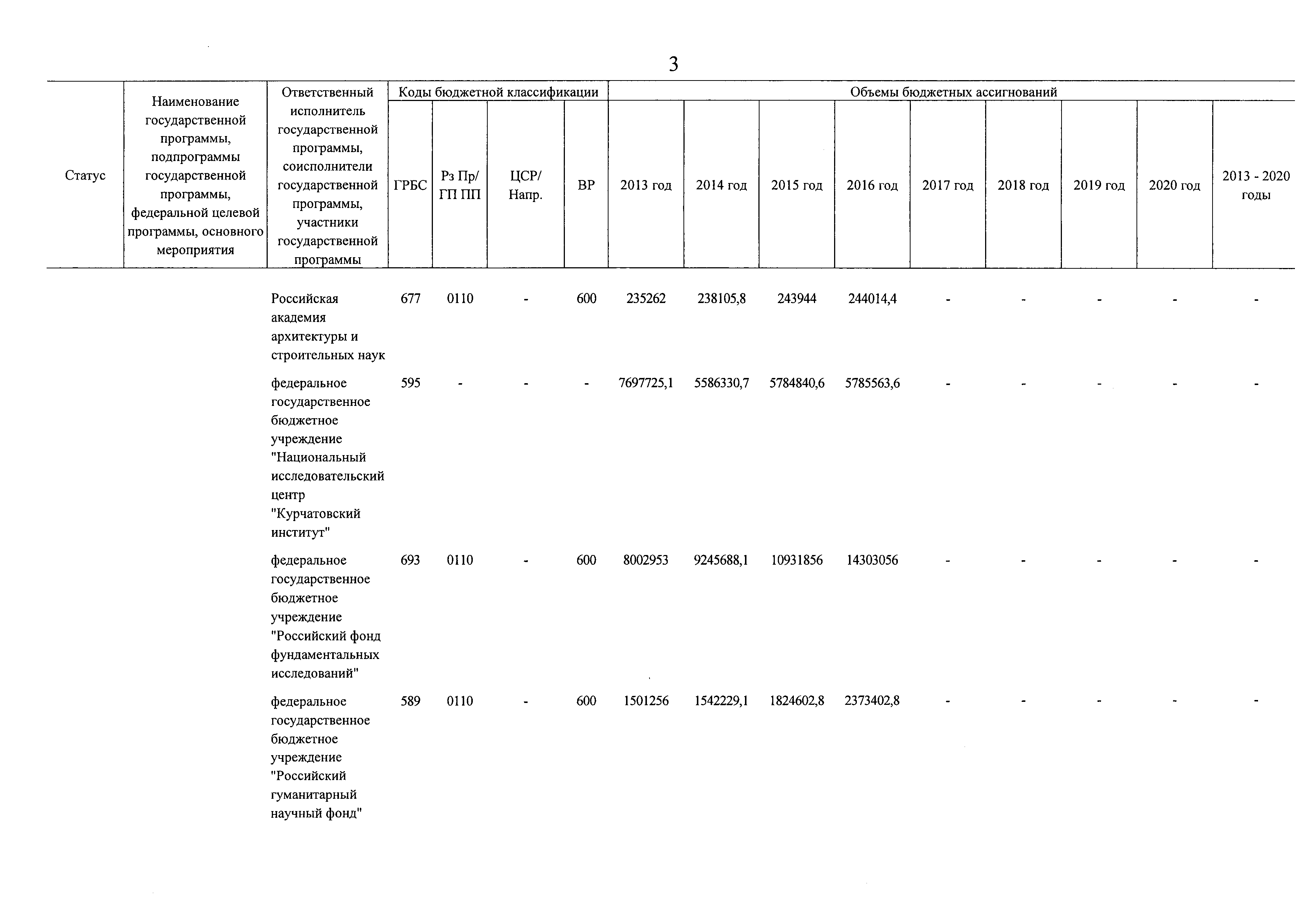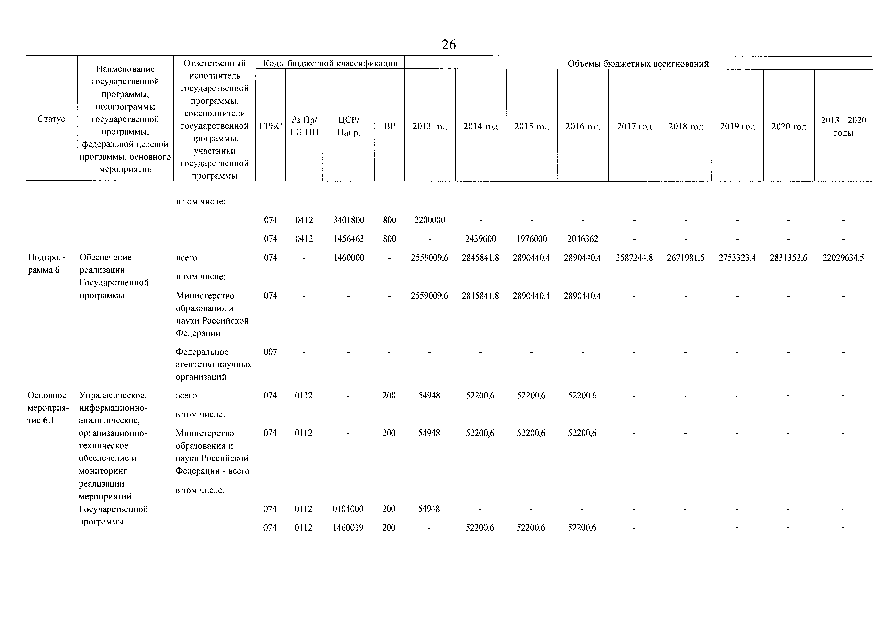 | Оглавление: | Паспорт государственной программы Российской Федерации "Развитие науки и технологий" на 2013 - 2020 годы Паспорт подпрограммы 1 "Фундаментальные научные исследования" государственной программы Российской Федерации "Развитие науки и технологий" на 2013 - 2020 годы Паспорт подпрограммы 2 "Прикладные проблемно ориентированные исследования и развитие научно-технологического задела в области перспективных технологий" государственной программы Российской Федерации "Развитие науки и технологий" на 2013 - 2020 годы Паспорт подпрограммы 3 "Институциональное развитие научно-исследовательского сектора" государственной программы Российской Федерации "Развитие науки и технологий" на 2013 - 2020 годы Паспорт подпрограммы 4 "Развитие межотраслевой инфраструктуры сектора исследований и разработок" государственной программы Российской Федерации "Развитие науки и технологий" на 2013 - 2020 годы Паспорт подпрограммы 5 "Международное сотрудничество в сфере науки" государственной программы Российской Федерации "Развитие науки и технологий" на 2013 - 2020 годы Паспорт подпрограммы 6 "Обеспечение реализации Государственной программы" государственной программы Российской Федерации "Развитие науки и технологий" на 2013 - 2020 годы Федеральная целевая программа "Исследования и разработки по приоритетным направлениям развития научно-технологического комплекса России на 2007 - 2013 годы" Паспорт федеральной целевой программы "Исследования и разработки по приоритетным направлениям развития научно-технологического комплекса России на 2007 - 2013 годы" Федеральная целевая программа "Исследования и разработки по приоритетным направлениям развития научно-технологического комплекса России на 2014 - 2020 годы" Паспорт федеральной целевой программы "Исследования и разработки по приоритетным направлениям развития научно-технологического комплекса России на 2014 - 2020 годы" Федеральная целевая программа "Научные и научно-педагогические кадры инновационной России" на 2009 - 2013 годы Паспорт федеральной целевой программы "Научные и научно-педагогические кадры инновационной России" на 2009 - 2013 годы Федеральная целевая программа "Научные и научно-педагогические кадры инновационной России" на 2014 - 2020 годы Паспорт федеральной целевой программы "Научные и научно-педагогические кадры инновационной России" на 2014 - 2020 годы Федеральная целевая программа "Мировой океан" Паспорт федеральной целевой программы "Мировой океан" Приоритеты и цели государственной политики в сфере реализации государственной программы Российской Федерации "Развитие науки и технологий" на 2013 - 2020 годы Приложение № 1. Сведения о показателях (индикаторах) государственной программы Российской Федерации "Развитие науки и технологий" на 2013 - 2020 годы, подпрограмм государственной программы Российской Федерации "Развитие науки и технологий" на 2013 - 2020 годы, федеральных целевых программ (подпрограмм федеральных целевых программ) Приложение № 2. Перечень основных мероприятий государственной программы Российской Федерации "Развитие науки и технологий" на 2013 - 2020 годы Приложение № 3. Сведения об основных мерах правового регулирования в сфере реализации государственной программы Российской Федерации "Развитие науки и технологий" на 2013 - 2020 годы Приложение № 4. Ресурсное обеспечение реализации государственной прогр