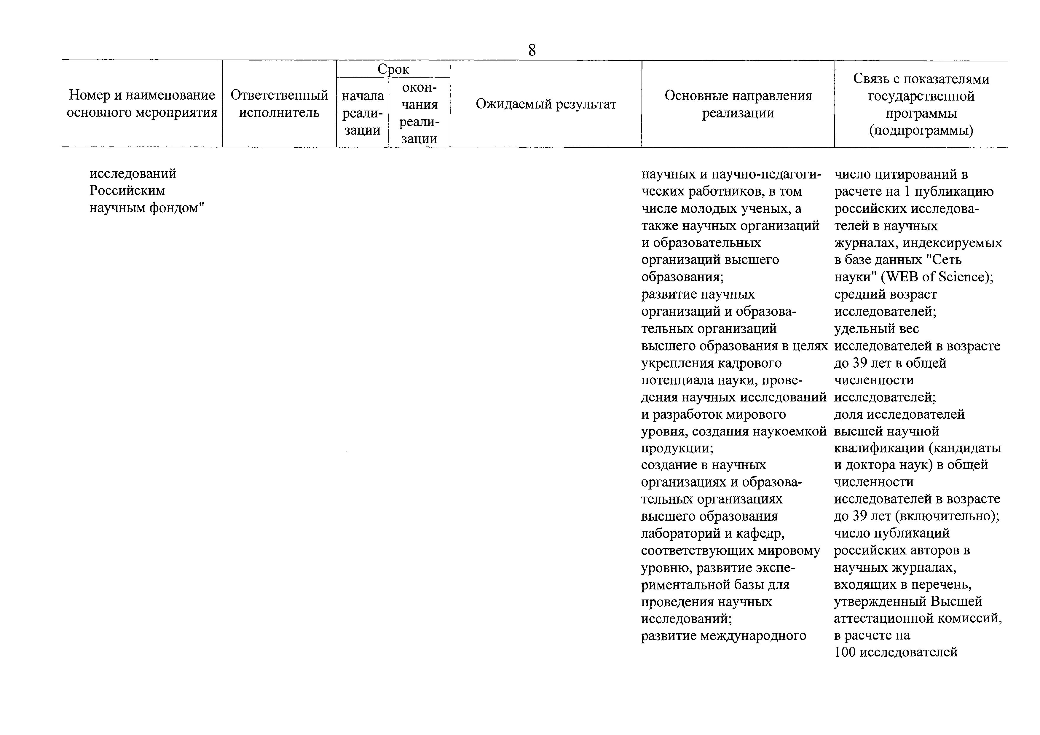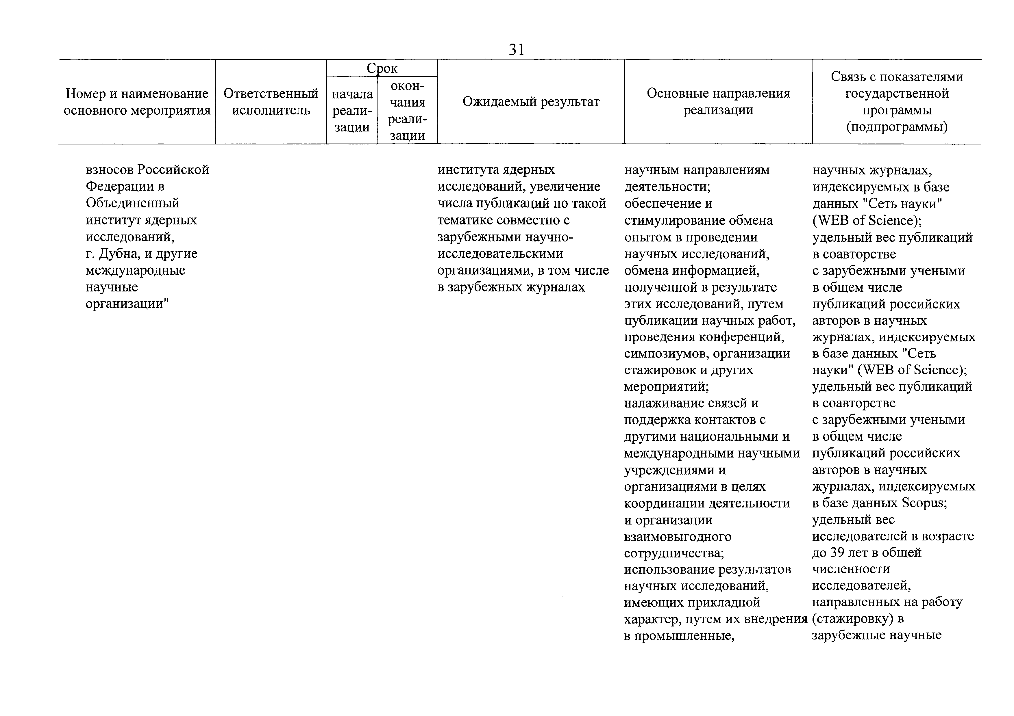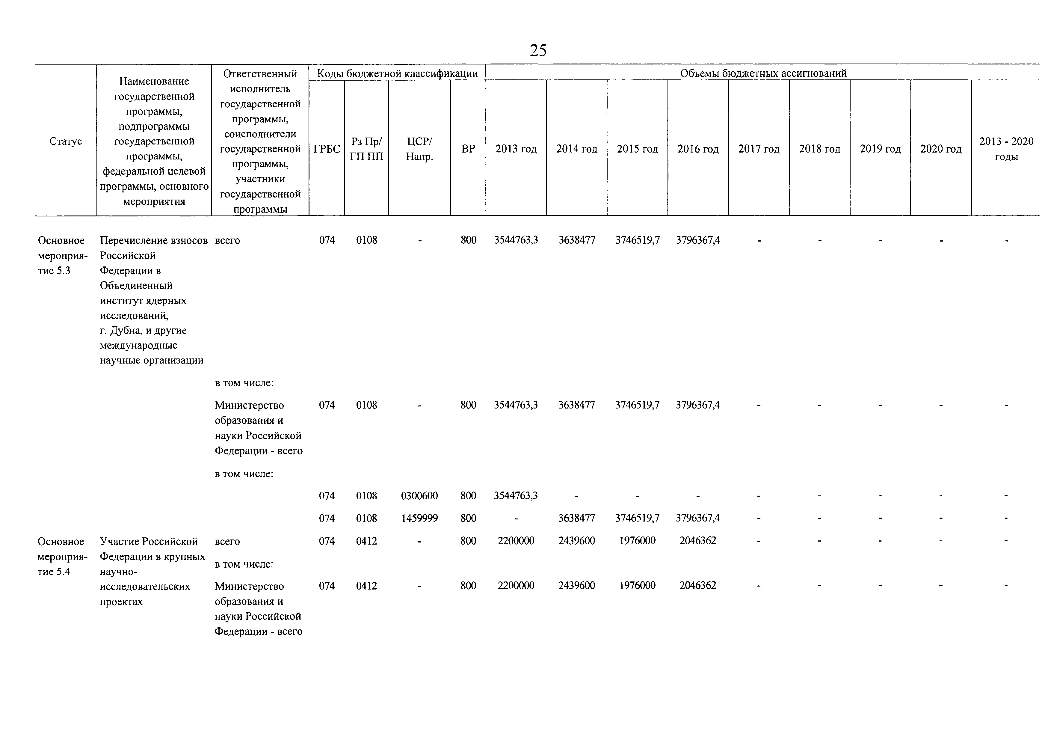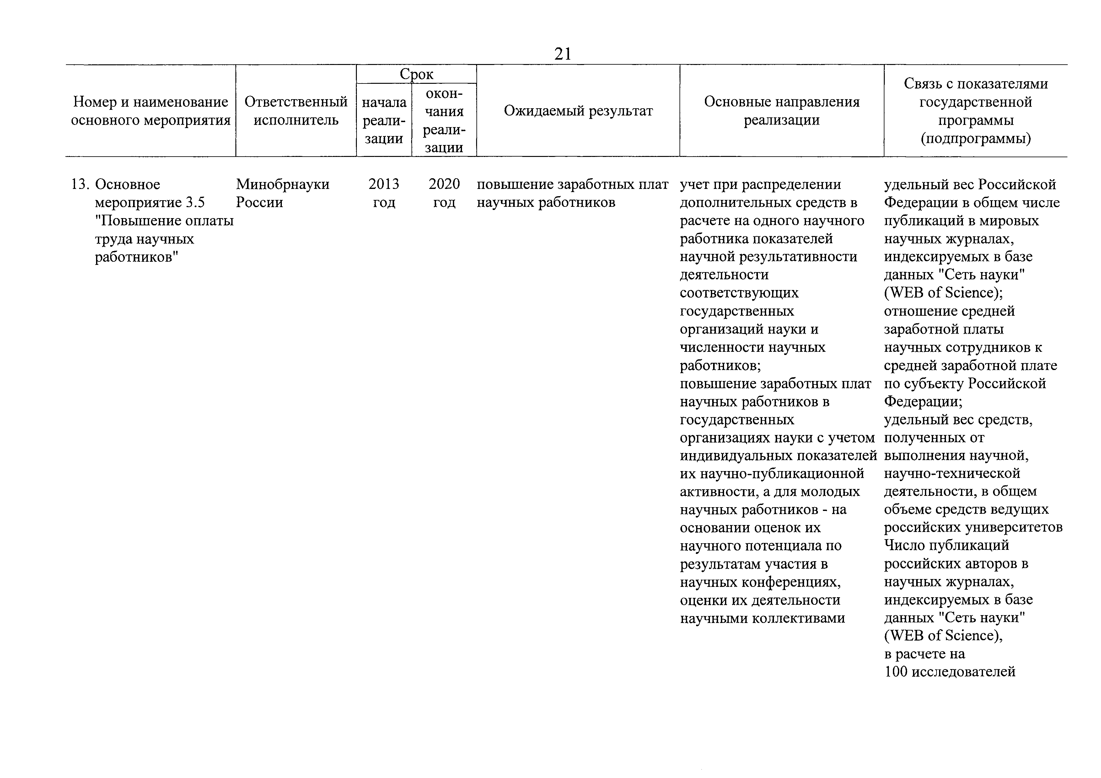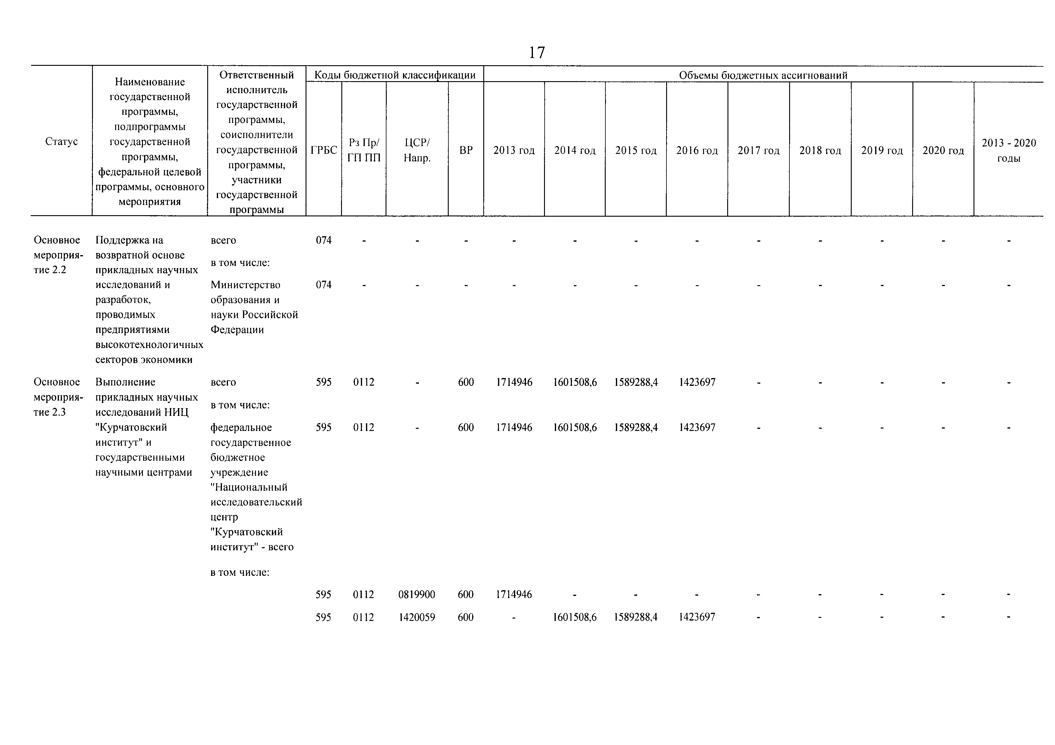 | Оглавление: | Паспорт государственной программы Российской Федерации "Развитие науки и технологий" на 2013 - 2020 годы Паспорт подпрограммы 1 "Фундаментальные научные исследования" государственной программы Российской Федерации "Развитие науки и технологий" на 2013 - 2020 годы Паспорт подпрограммы 2 "Прикладные проблемно ориентированные исследования и развитие научно-технологического задела в области перспективных технологий" государственной программы Российской Федерации "Развитие науки и технологий" на 2013 - 2020 годы Паспорт подпрограммы 3 "Институциональное развитие научно-исследовательского сектора" государственной программы Российской Федерации "Развитие науки и технологий" на 2013 - 2020 годы Паспорт подпрограммы 4 "Развитие межотраслевой инфраструктуры сектора исследований и разработок" государственной программы Российской Федерации "Развитие науки и технологий" на 2013 - 2020 годы Паспорт подпрограммы 5 "Международное сотрудничество в сфере науки" государственной программы Российской Федерации "Развитие науки и технологий" на 2013 - 2020 годы Паспорт подпрограммы 6 "Обеспечение реализации Государственной программы" государственной программы Российской Федерации "Развитие науки и технологий" на 2013 - 2020 годы Федеральная целевая программа "Исследования и разработки по приоритетным направлениям развития научно-технологического комплекса России на 2007 - 2013 годы" Паспорт федеральной целевой программы "Исследования и разработки по приоритетным направлениям развития научно-технологического комплекса России на 2007 - 2013 годы" Федеральная целевая программа "Исследования и разработки по приоритетным направлениям развития научно-технологического комплекса России на 2014 - 2020 годы" Паспорт федеральной целевой программы "Исследования и разработки по приоритетным направлениям развития научно-технологического комплекса России на 2014 - 2020 годы" Федеральная целевая программа "Научные и научно-педагогические кадры инновационной России" на 2009 - 2013 годы Паспорт федеральной целевой программы "Научные и научно-педагогические кадры инновационной России" на 2009 - 2013 годы Федеральная целевая программа "Научные и научно-педагогические кадры инновационной России" на 2014 - 2020 годы Паспорт федеральной целевой программы "Научные и научно-педагогические кадры инновационной России" на 2014 - 2020 годы Федеральная целевая программа "Мировой океан" Паспорт федеральной целевой программы "Мировой океан" Приоритеты и цели государственной политики в сфере реализации государственной программы Российской Федерации "Развитие науки и технологий" на 2013 - 2020 годы Приложение № 1. Сведения о показателях (индикаторах) государственной программы Российской Федерации "Развитие науки и технологий" на 2013 - 2020 годы, подпрограмм государственной программы Российской Федерации "Развитие науки и технологий" на 2013 - 2020 годы, федеральных целевых программ (подпрограмм федеральных целевых программ) Приложение № 2. Перечень основных мероприятий государственной программы Российской Федерации "Развитие науки и технологий" на 2013 - 2020 годы Приложение № 3. Сведения об основных мерах правового регулирования в сфере реализации государственной программы Российской Федерации "Развитие науки и технологий" на 2013 - 2020 годы Приложение № 4. Ресурсное обеспечение реализации государственной прогр