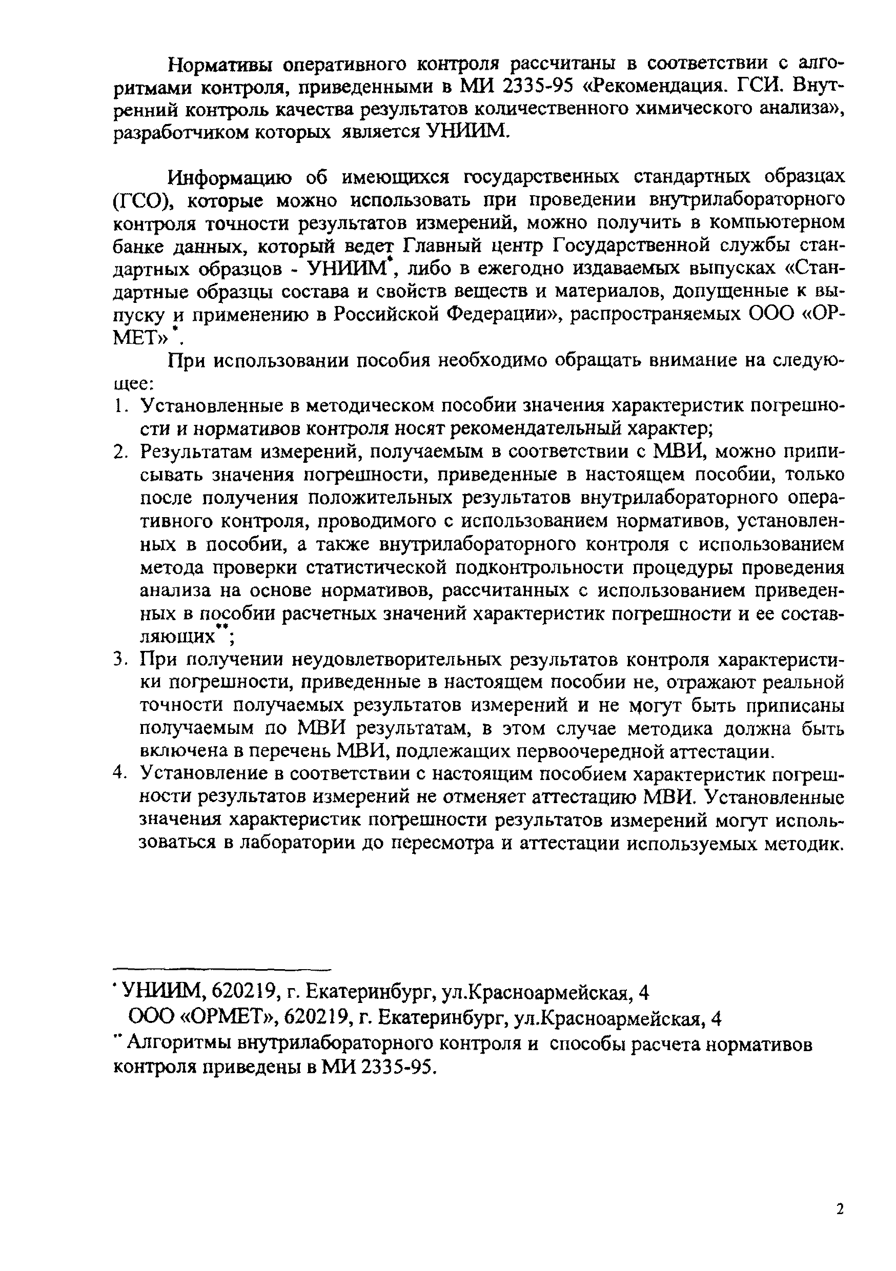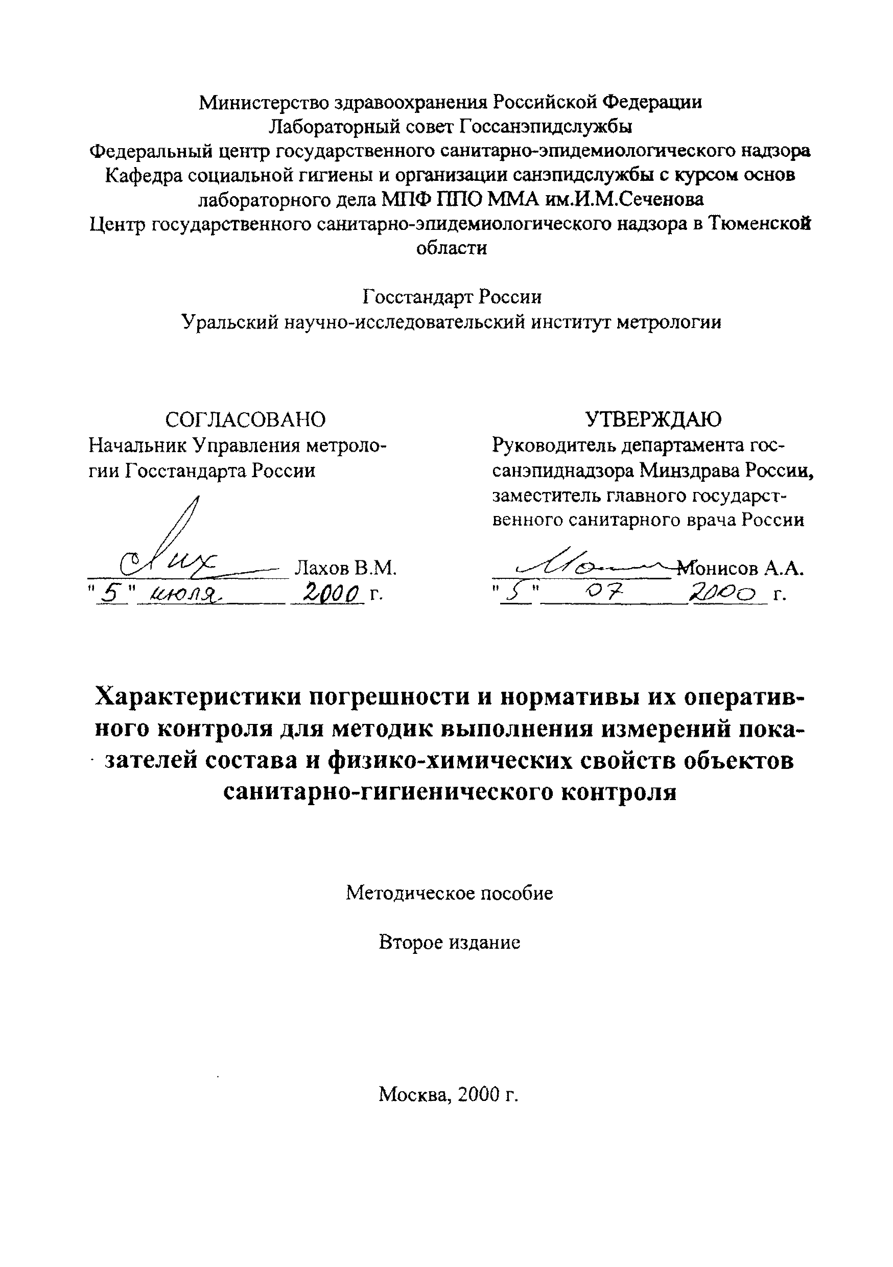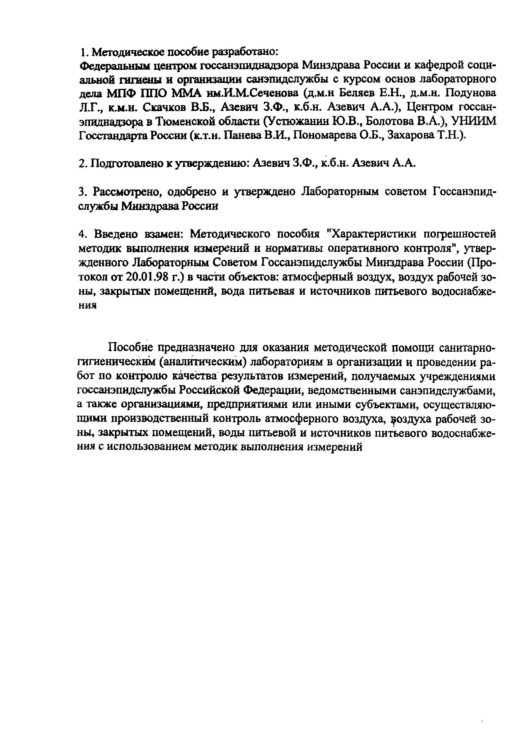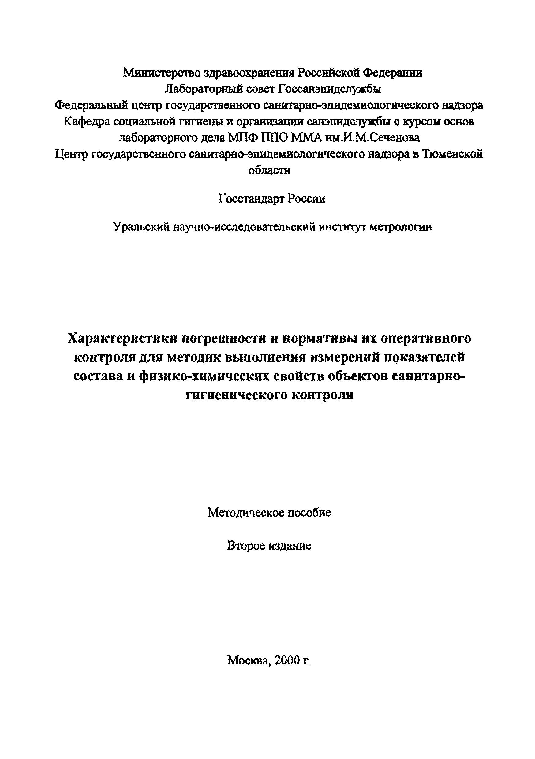 | Область применения: | Пособие предназначено для оказания методической помощи санитарно-гигиеническим (аналитическим) лабораториям в организации и проведении работ по контролю качества результатов измерений, получаемых учреждениями госсанэпидслужбы Российской Федерации, ведомственными санэпидслужбами, а также организациями, предприятиями или иными субъектами, осуществляющими производственный контроль атмосферного воздуха, воздуха рабочей зоны закрытых помещений, воды питьевой и источников питьевого водоснабжения с использованием методик выполнения измерений |