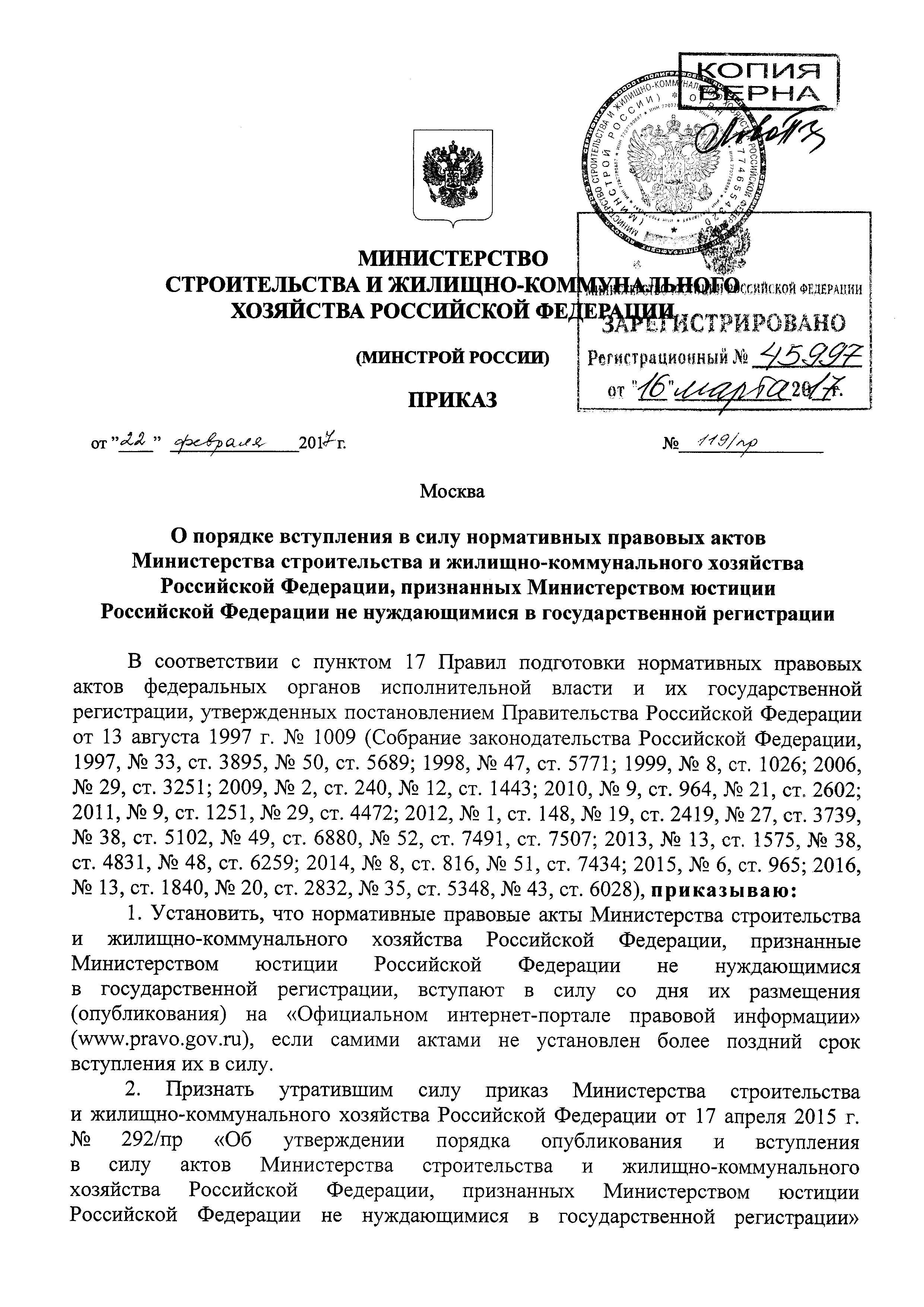 О порядке вступления в силу нормативных правовых актов Министерства строительства и жилищно-коммунального хозяйства Российской Федерации, признанных Министерством юстиции Российской Федерации не нуждающимися в государственной регистрации| Статус: | действует | | Название рус.: | О порядке вступления в силу нормативных правовых актов Министерства строительства и жилищно-коммунального хозяйства Российской Федерации, признанных Министерством юстиции Российской Федерации не нуждающимися в государственной регистрации | | Дата добавления в базу: | 05.05.2017 | | Дата актуализации: | 01.01.2021 | | Дата введения: | 31.03.2017 | | Утверждён: | 22.02.2017 Министерство строительства и жилищно-коммунального хозяйства Российской Федерации (119/пр)