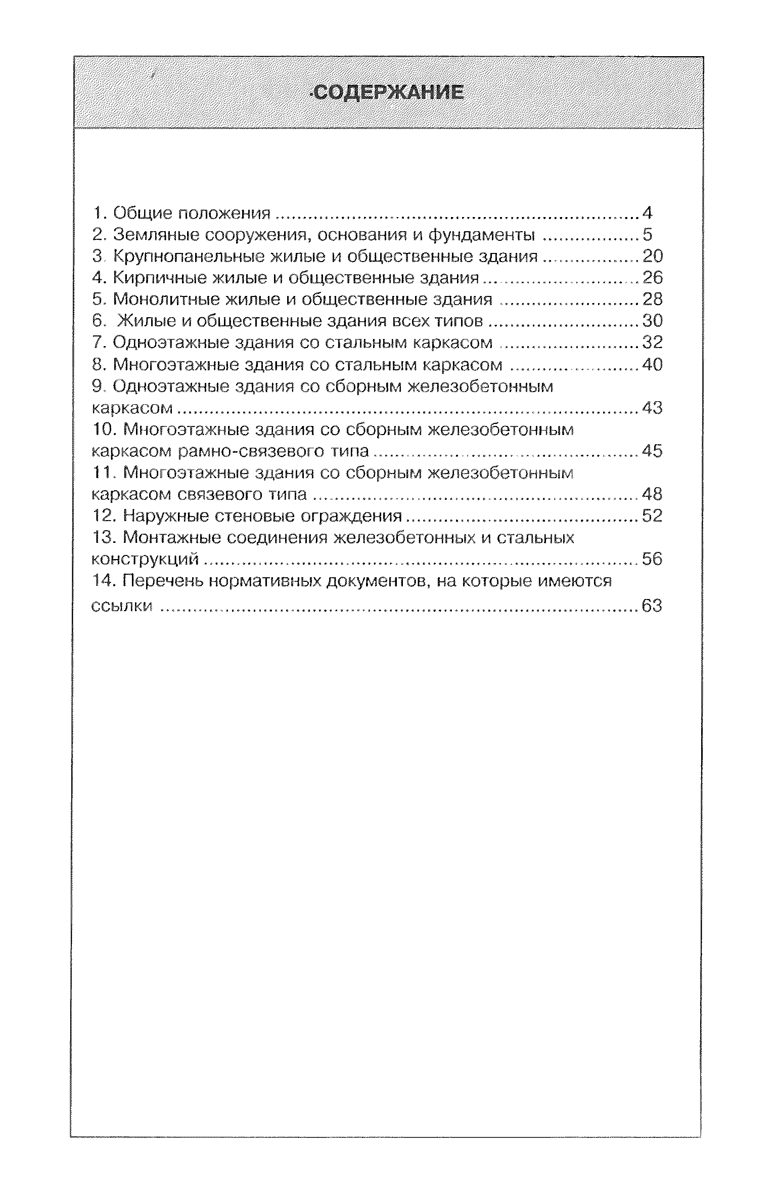 | Оглавление: | 1. Общие положения 2. Земляные сооружения, основания и фундаменты 3. Крупнопанельные жилые и общественные здания 4. Кирпичные жилые и общественные здания 5. Монолитные жилые и общественные здания 6. Жилые и общественные здания всех типов 7. Одноэтажные здания со стальным каркасом 8. Многоэтажные здания со стальным каркасом 9. Одноэтажные здания со сборным железобетонным каркасом 10. Многоэтажные здания со сборным железобетонным каркасом рамно-связевого типа 11. Многоэтажные здания со сборным железобетонным каркасом связевого типа 12. Наружные стеновые ограждения 13. Монтажные соединения железобетонных и стальных конструкций 14. Перечень нормативных документов, на которые имеются ссылки |