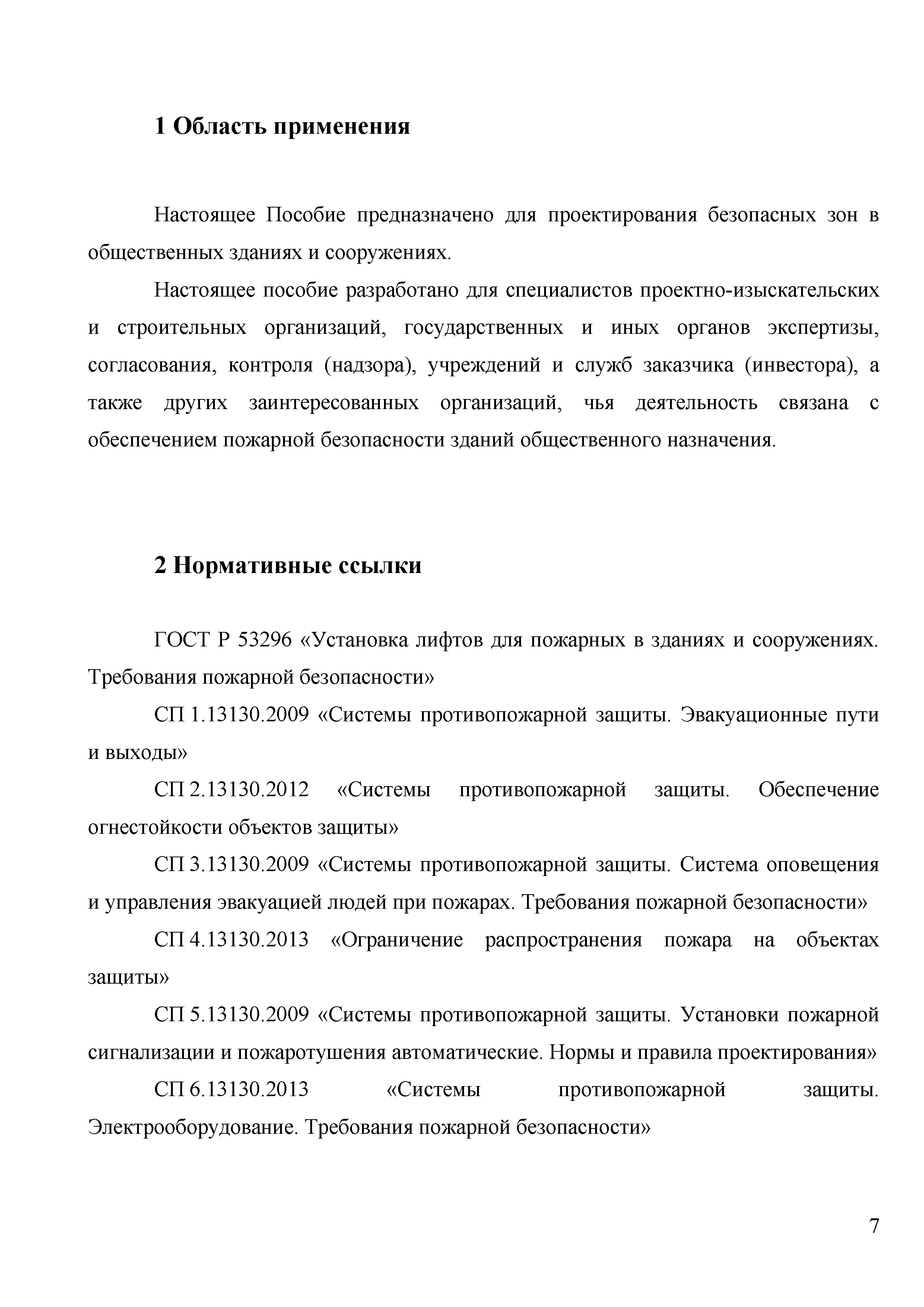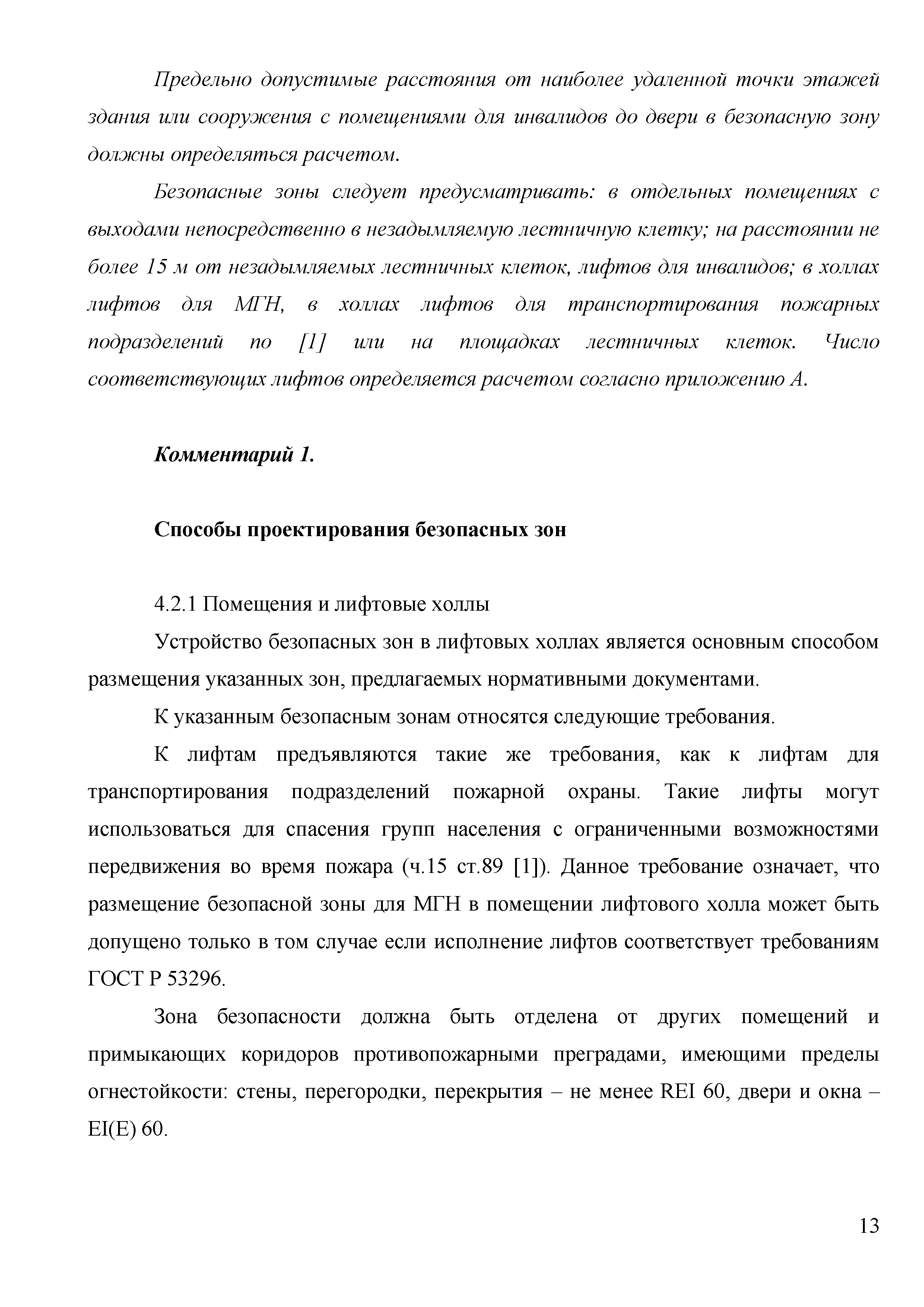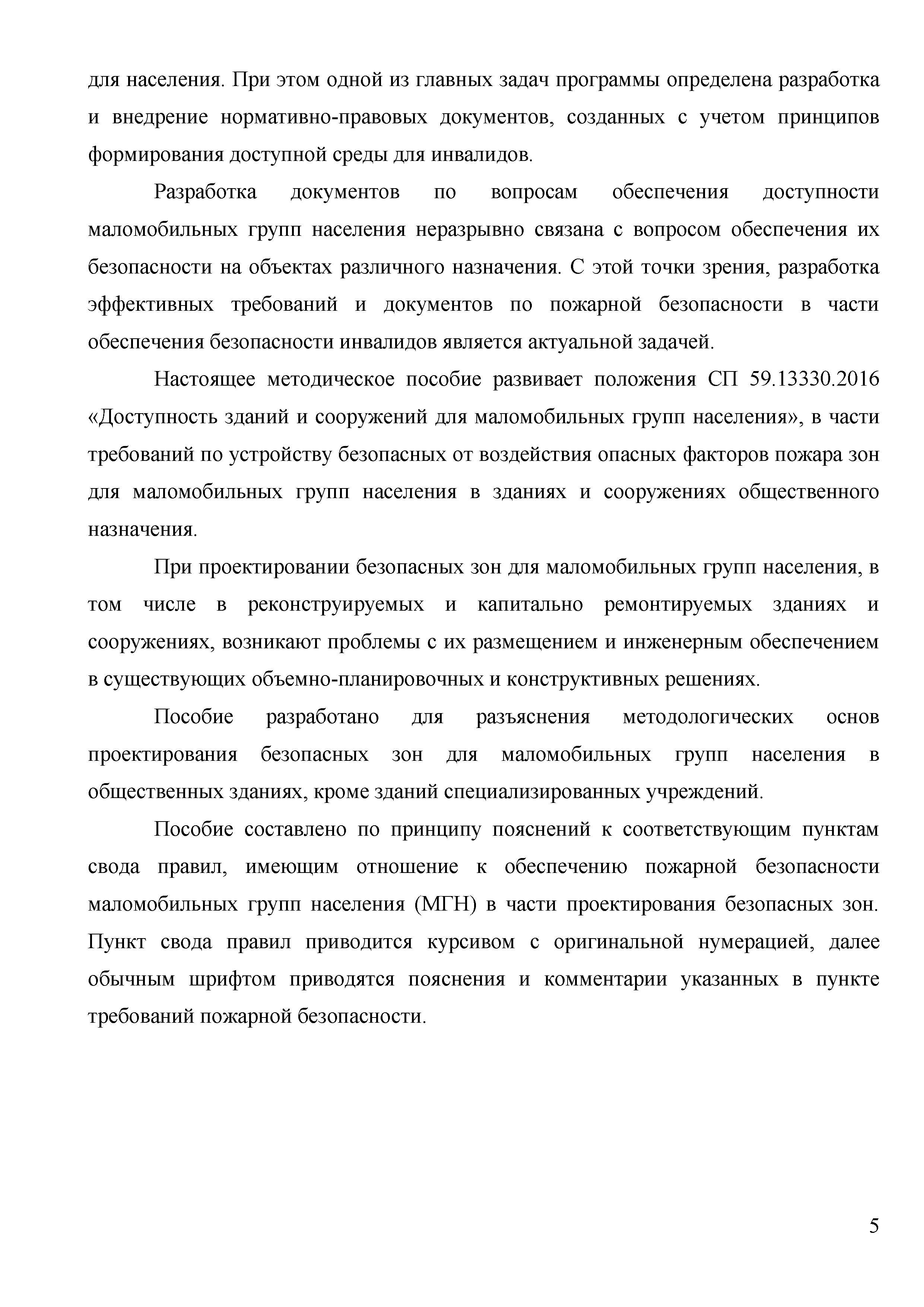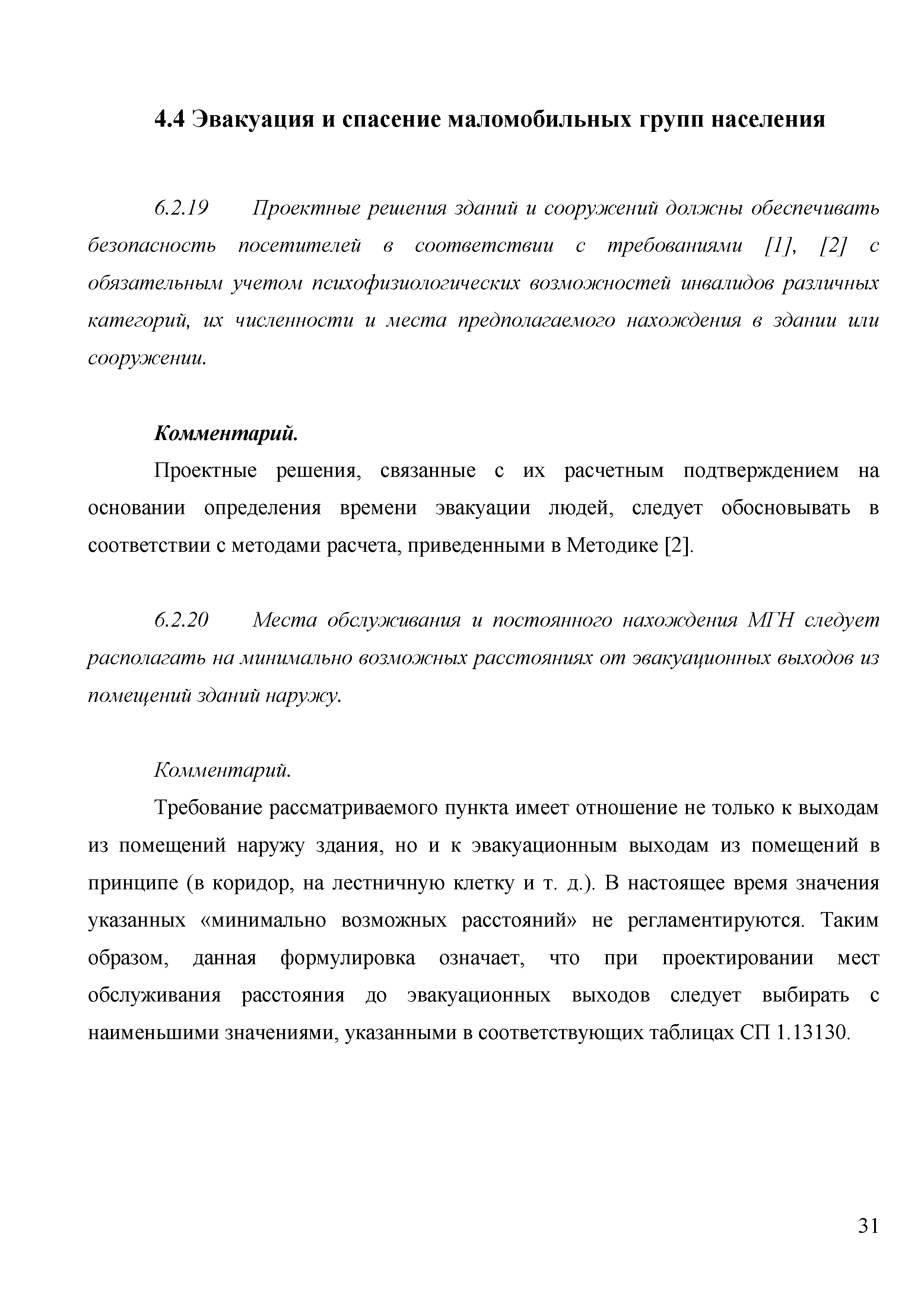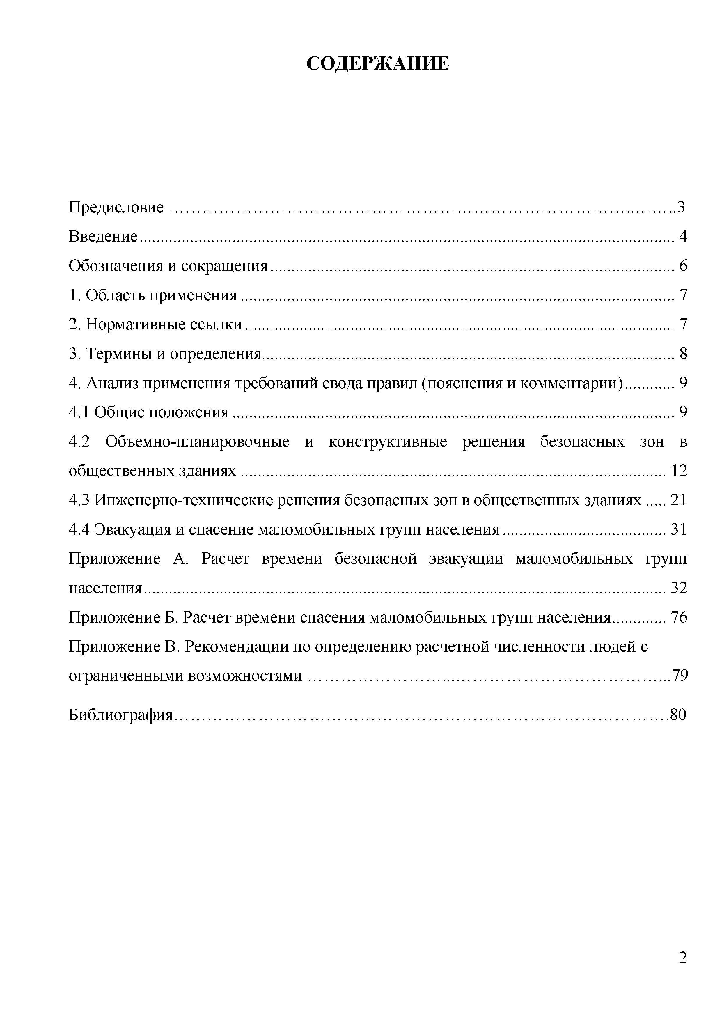 | Оглавление: | Предисловие Введение Обозначения и сокращения 1. Область применения 2. Нормативные ссылки 3. Термины и определения 4. Анализ применения требований свода правил (пояснения и комментарии) 4.1 Общие положения 4.2 Объемно-планировочные и конструктивные решения безопасных зон общественных зданиях 4.3 Инженерно-технические решения безопасных зон в общественных зданиях 4.4 Эвакуация и спасение маломобильных групп населения Приложение А. Расчет времени безопасной эвакуации маломобильных групп населения Приложение Б. Расчет времени спасения маломобильных групп населения Приложение В. Рекомендации по определению расчетной численности людей с ограниченными возможностями Библиография |