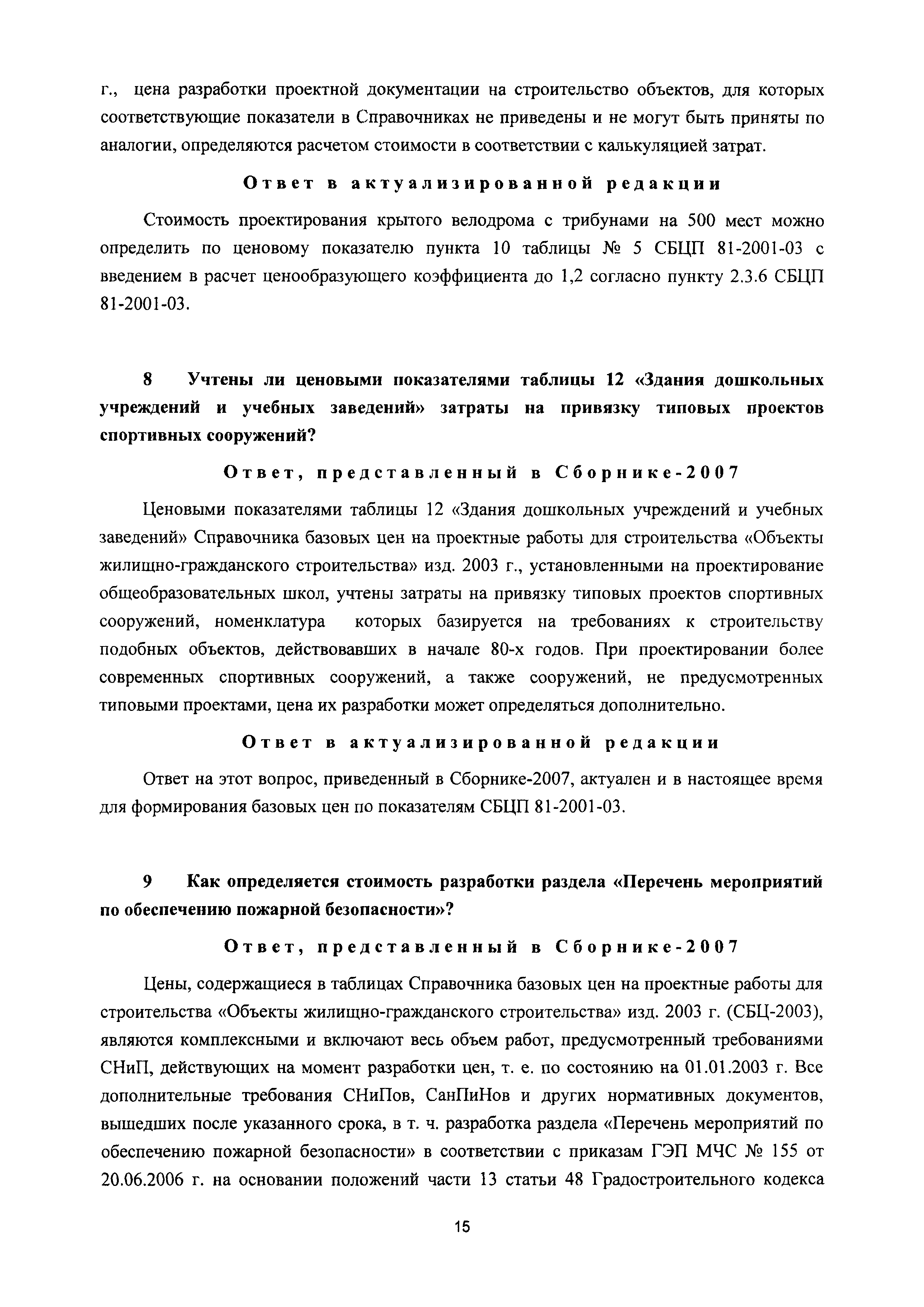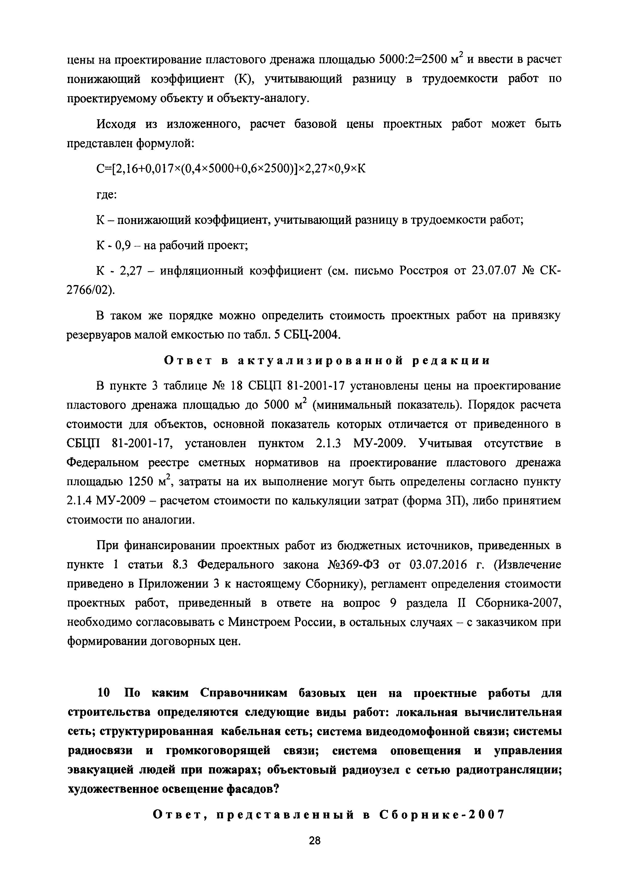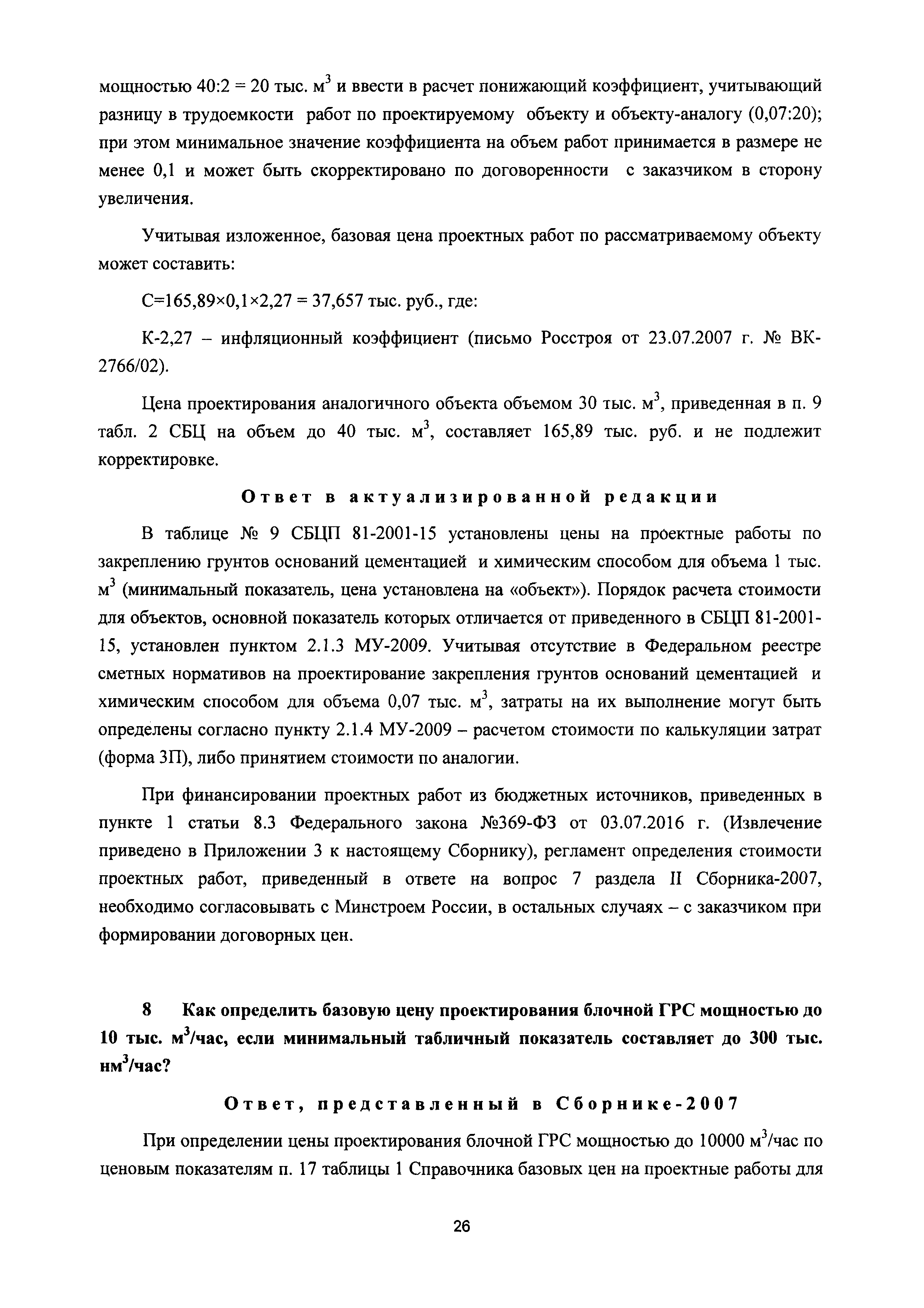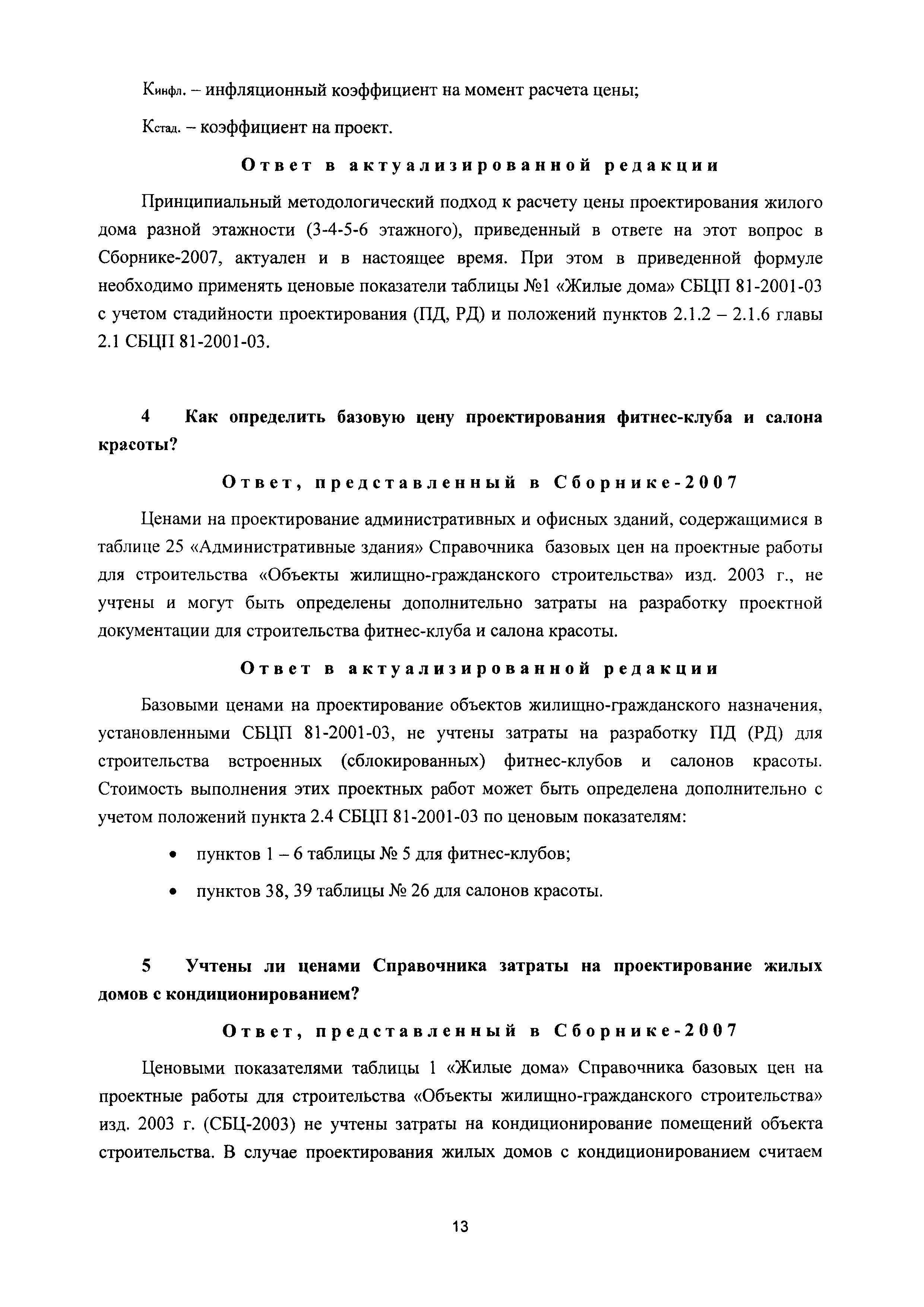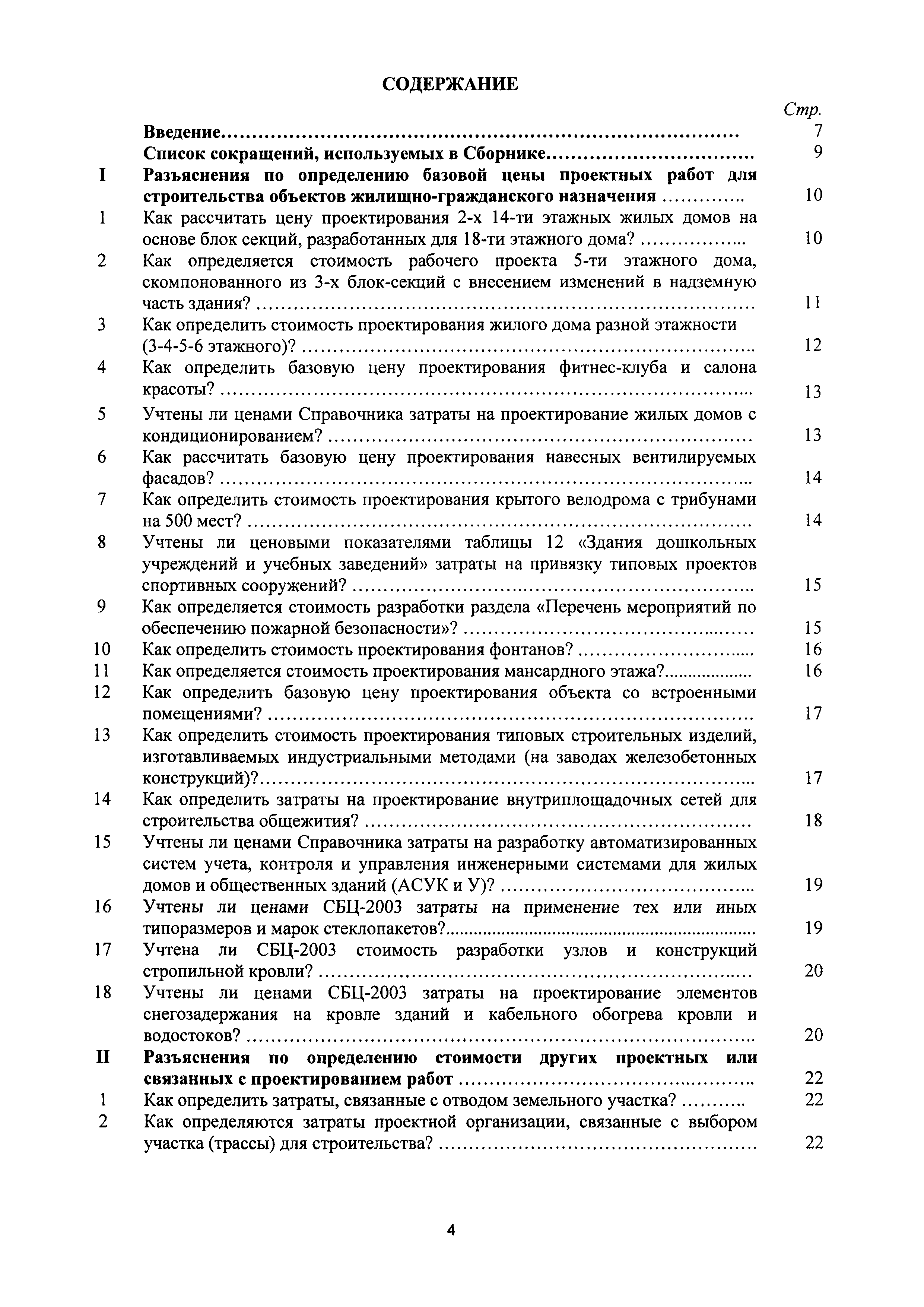 Сборник разъяснений по применению Сборника цен и Справочников базовых цен на проектные работы для строительства*. (Вопросы и ответы) 2007 - 2017| Статус: | справочные материалы, мп, тпр | | Название рус.: | Сборник разъяснений по применению Сборника цен и Справочников базовых цен на проектные работы для строительства*. (Вопросы и ответы) 2007 - 2017 | | Дата добавления в базу: | 05.05.2017 | | Дата актуализации: | 01.01.2021 | | Область применения: | Сборник разъяснений по применению Сборника цен и Справочников базовых цен на проектные работы для строительства* (Вопросы и ответы) 2007 – 2017 является актуализированной редакцией "Сборника разъяснений по применению Сборника цен и Справочников базовых цен на проектные работы для строительства (Вопросы и ответы)", разработанного Центром в 2007 году, и относится к пособиям, предназначенным для облегчения деятельности проектировщиков при решении ими отдельных конкретных наиболее актуальных вопросов ценообразования и сметного нормирования проектных работ | | Оглавление: | Введение Список сокращений, используемых в Сборнике I Разъяснения по определению базовой цены проектных работ для строительства объектов жилищно-гражданского назначения 1 Как рассчитать цену проектирования 2-х 14-ти этажных жилых домов на основе блок секций, разработанных для 18-ти этажного дома ? 2 Как определяется стоимость рабочего проекта 5-ти этажного дома, скомпонованного из 3-х блок-секций с внесением изменений в надземную часть здания ? 3 Как определить стоимость проектирования жилого дома разной этажности (3-4-5-6 этажного) ? 4 Как определить базовую цену проектирования фитнес-клуба и салона красоты ? 5 Учтены ли ценами Справочника затраты на проектирование жилых домов с кондиционированием ? 6 Как рассчитать базовую цену проектирования навесных вентилируемых фасадов ? 7 Как определить стоимость проектирования крытого велодрома с трибунами на 500 мест ? 8 Учтены ли ценовыми показателями таблицы 12 "Здания дошкольных учреждений и учебных заведений" затраты на привязку типовых проектов спортивных сооружений ? 9 Как определяется стоимость разработки раздела "Перечень мероприятий по обеспечению пожарной безопасности" ? 10 Как определить стоимость проектирования фонтанов ? 11 Как определяется стоимость проектирования мансардного этажа ? 12 Как определить базовую цену проектирования объекта со встроенными помещениями ? 13 Как определить стоимость проектирования типовых строительных изделий, изготавливаемых индустриальными методами (на заводах железобетонных конструкций) ? 14 Как определить затраты на проектирование внутриплощадочных сетей для строительства общежития ? 15 Учтены ли ценами Справочника затраты на разработку автоматизированных систем учета, контроля и управления инженерными системами для жилых домов и общественных зданий (АСУК и У) ? 16 Учтены ли ценами СБЦ-2003 затраты на применение тех или иных типоразмеров и марок стеклопакетов ? 17 Учтена ли СБЦ-2003 стоимость разработки узлов и конструкций стропильной кровли ? 18 Учтены ли ценами СБЦ-2003 затраты на проектирование элементов снегозадержания на кровле зданий и кабельного обогрева кровли и водостоков ? II Разъяснения по определению стоимости других проектных или связанных с проектированием работ 1 Как определить затраты, связанные с отводом земельного участка ? 2 Как определяются затраты п