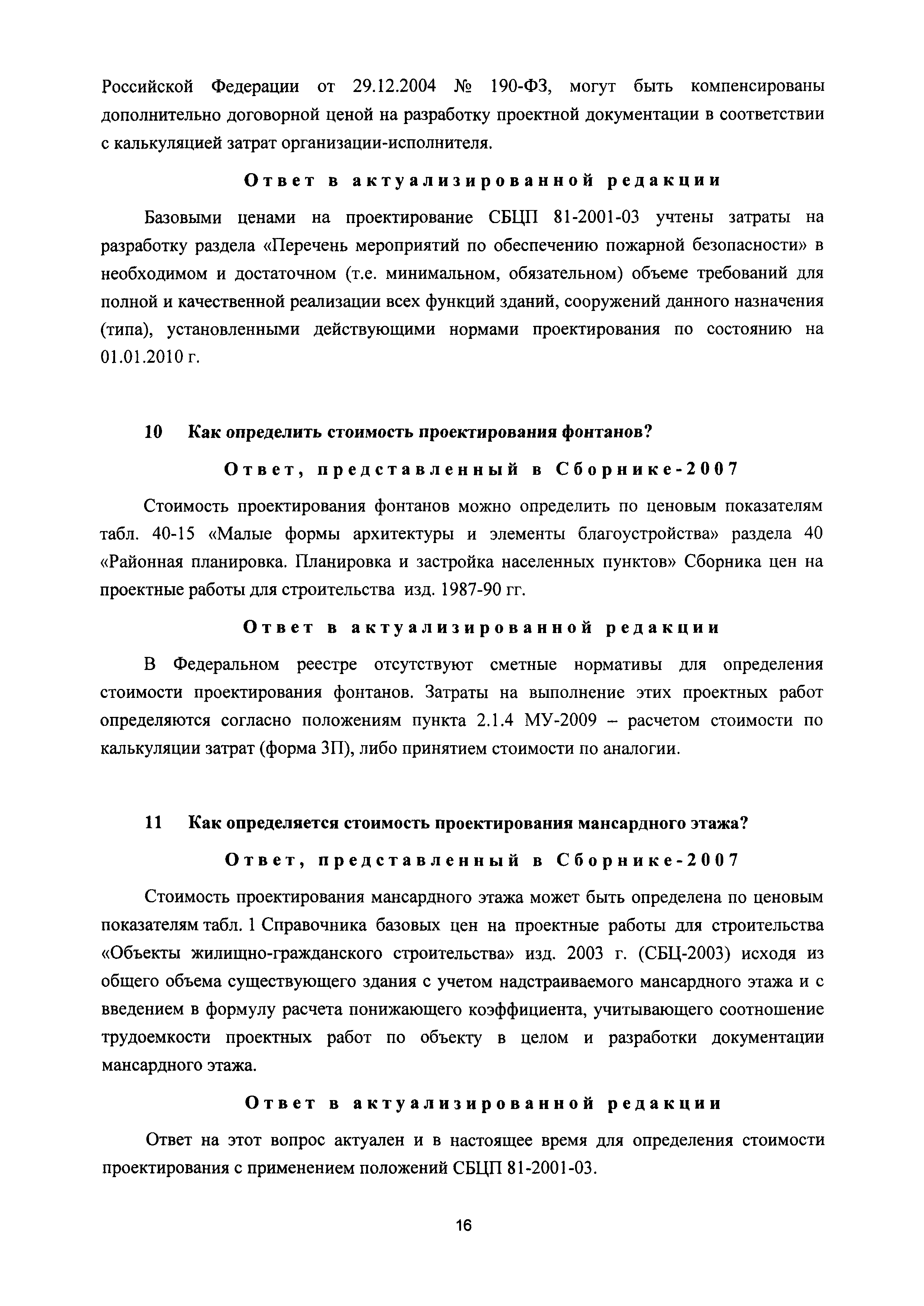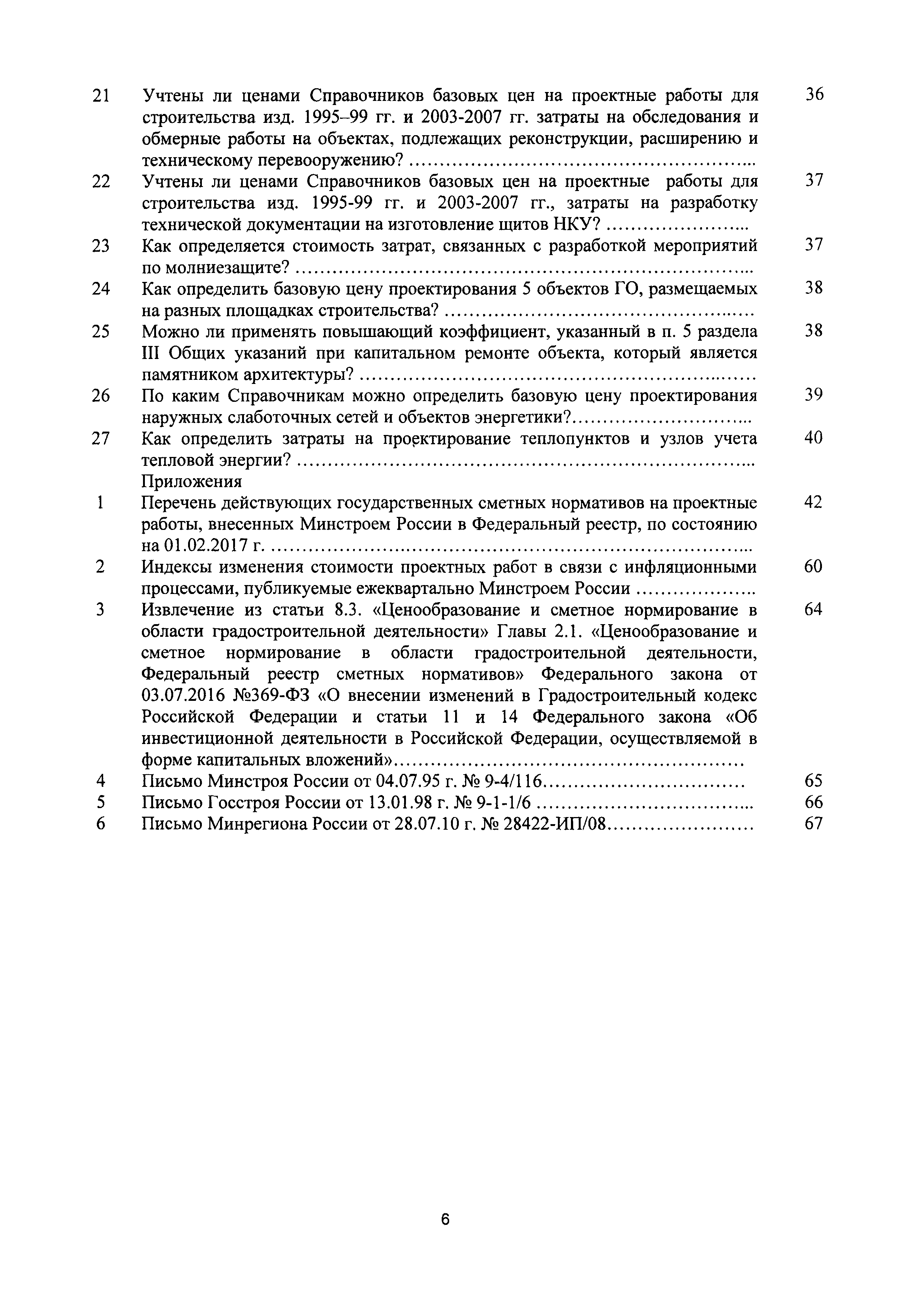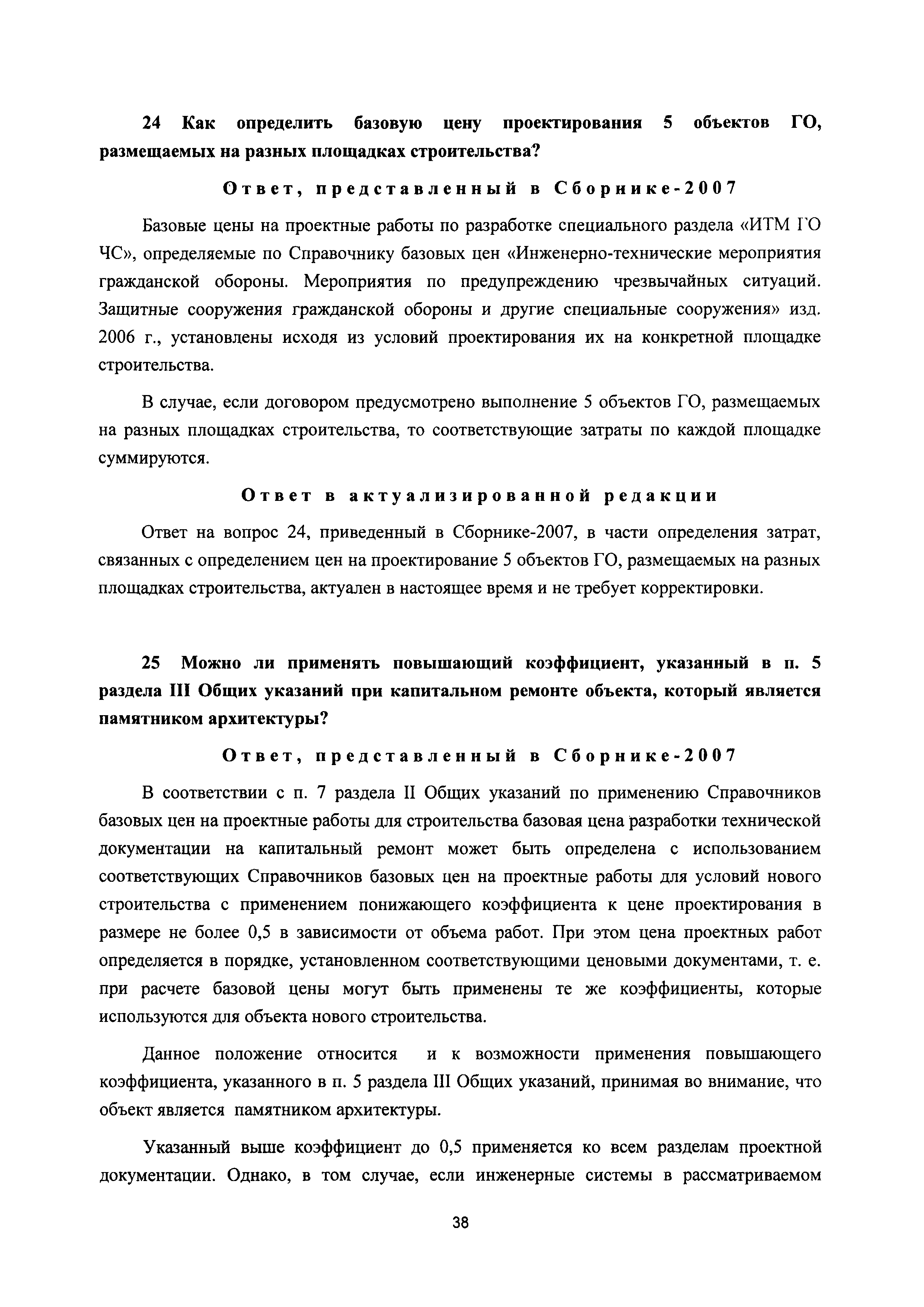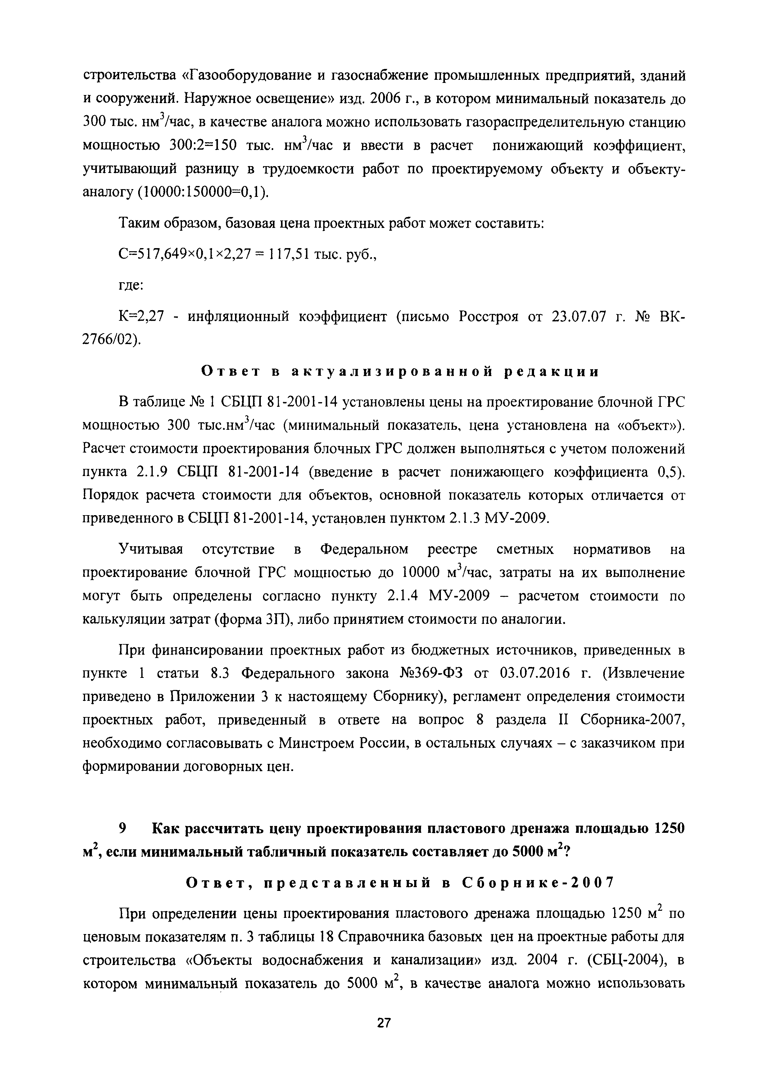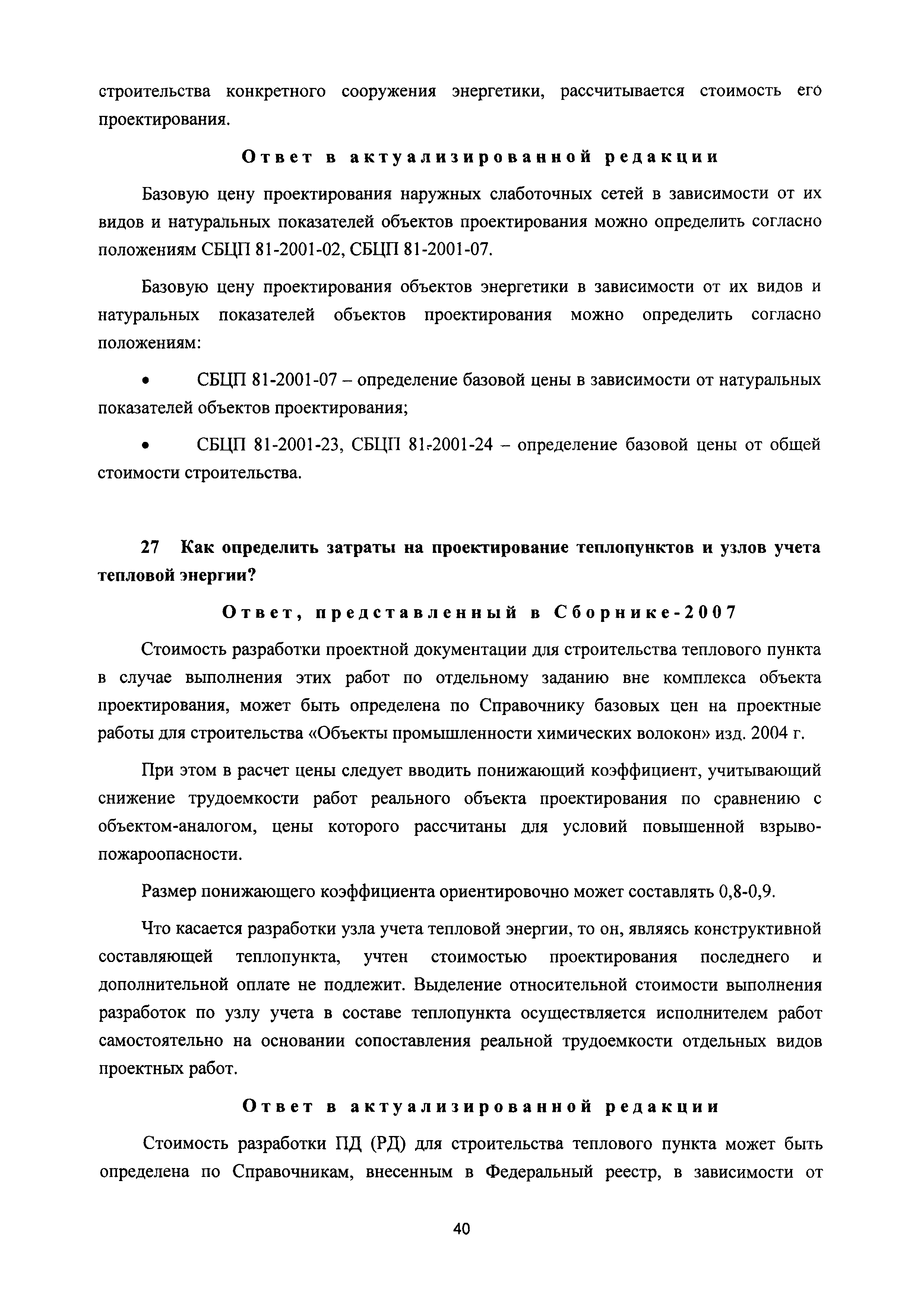 Сборник разъяснений по применению Сборника цен и Справочников базовых цен на проектные работы для строительства*. (Вопросы и ответы) 2007 - 2017| Статус: | справочные материалы, мп, тпр | | Название рус.: | Сборник разъяснений по применению Сборника цен и Справочников базовых цен на проектные работы для строительства*. (Вопросы и ответы) 2007 - 2017 | | Дата добавления в базу: | 05.05.2017 | | Дата актуализации: | 01.01.2021 | | Область применения: | Сборник разъяснений по применению Сборника цен и Справочников базовых цен на проектные работы для строительства* (Вопросы и ответы) 2007 – 2017 является актуализированной редакцией "Сборника разъяснений по применению Сборника цен и Справочников базовых цен на проектные работы для строительства (Вопросы и ответы)", разработанного Центром в 2007 году, и относится к пособиям, предназначенным для облегчения деятельности проектировщиков при решении ими отдельных конкретных наиболее актуальных вопросов ценообразования и сметного нормирования проектных работ | | Оглавление: | Введение Список сокращений, используемых в Сборнике I Разъяснения по определению базовой цены проектных работ для строительства объектов жилищно-гражданского назначения 1 Как рассчитать цену проектирования 2-х 14-ти этажных жилых домов на основе блок секций, разработанных для 18-ти этажного дома ? 2 Как определяется стоимость рабочего проекта 5-ти этажного дома, скомпонованного из 3-х блок-секций с внесением изменений в надземную часть здания ? 3 Как определить стоимость проектирования жилого дома разной этажности (3-4-5-6 этажного) ? 4 Как определить базовую цену проектирования фитнес-клуба и салона красоты ? 5 Учтены ли ценами Справочника затраты на проектирование жилых домов с кондиционированием ? 6 Как рассчитать базовую цену проектирования навесных вентилируемых фасадов ? 7 Как определить стоимость проектирования крытого велодрома с трибунами на 500 мест ? 8 Учтены ли ценовыми показателями таблицы 12 "Здания дошкольных учреждений и учебных заведений" затраты на привязку типовых проектов спортивных сооружений ? 9 Как определяется стоимость разработки раздела "Перечень мероприятий по обеспечению пожарной безопасности" ? 10 Как определить стоимость проектирования фонтанов ? 11 Как определяется стоимость проектирования мансардного этажа ? 12 Как определить базовую цену проектирования объекта со встроенными помещениями ? 13 Как определить стоимость проектирования типовых строительных изделий, изготавливаемых индустриальными методами (на заводах железобетонных конструкций) ? 14 Как определить затраты на проектирование внутриплощадочных сетей для строительства общежития ? 15 Учтены ли ценами Справочника затраты на разработку автоматизированных систем учета, контроля и управления инженерными системами для жилых домов и общественных зданий (АСУК и У) ? 16 Учтены ли ценами СБЦ-2003 затраты на применение тех или иных типоразмеров и марок стеклопакетов ? 17 Учтена ли СБЦ-2003 стоимость разработки узлов и конструкций стропильной кровли ? 18 Учтены ли ценами СБЦ-2003 затраты на проектирование элементов снегозадержания на кровле зданий и кабельного обогрева кровли и водостоков ? II Разъяснения по определению стоимости других проектных или связанных с проектированием работ 1 Как определить затраты, связанные с отводом земельного участка ? 2 Как определяются затраты п