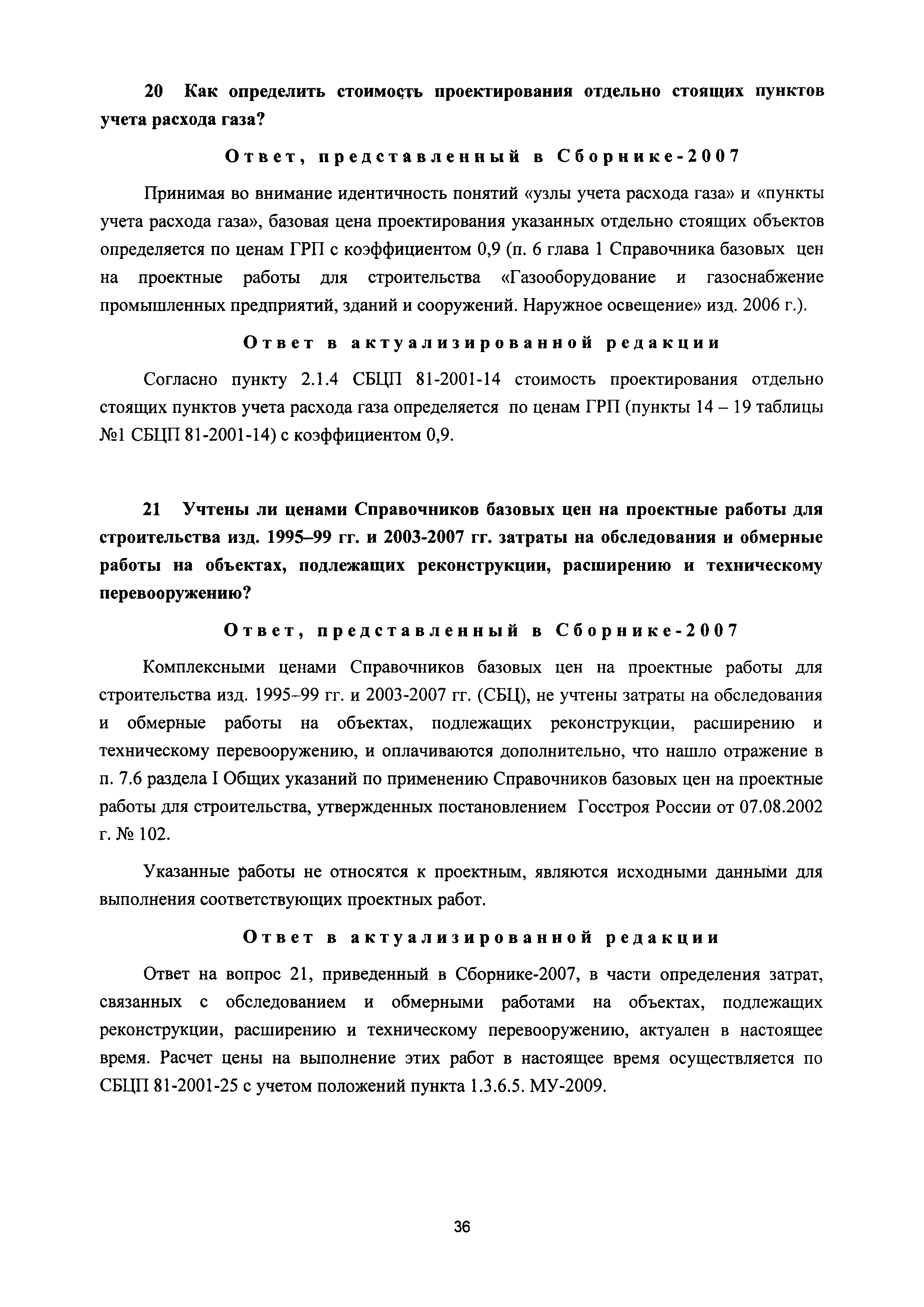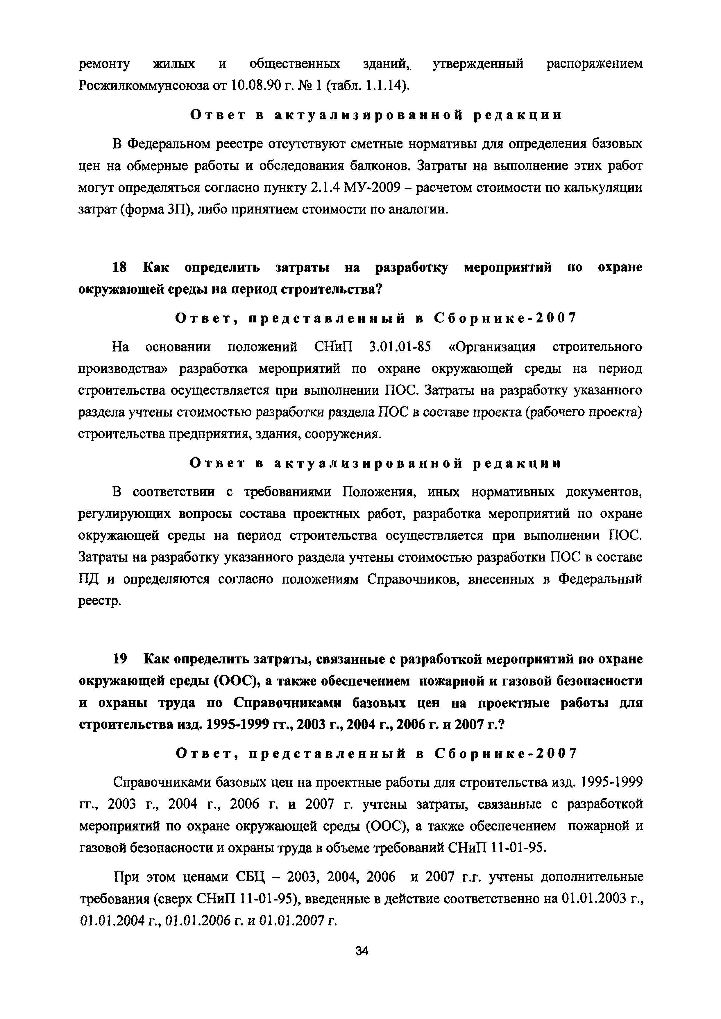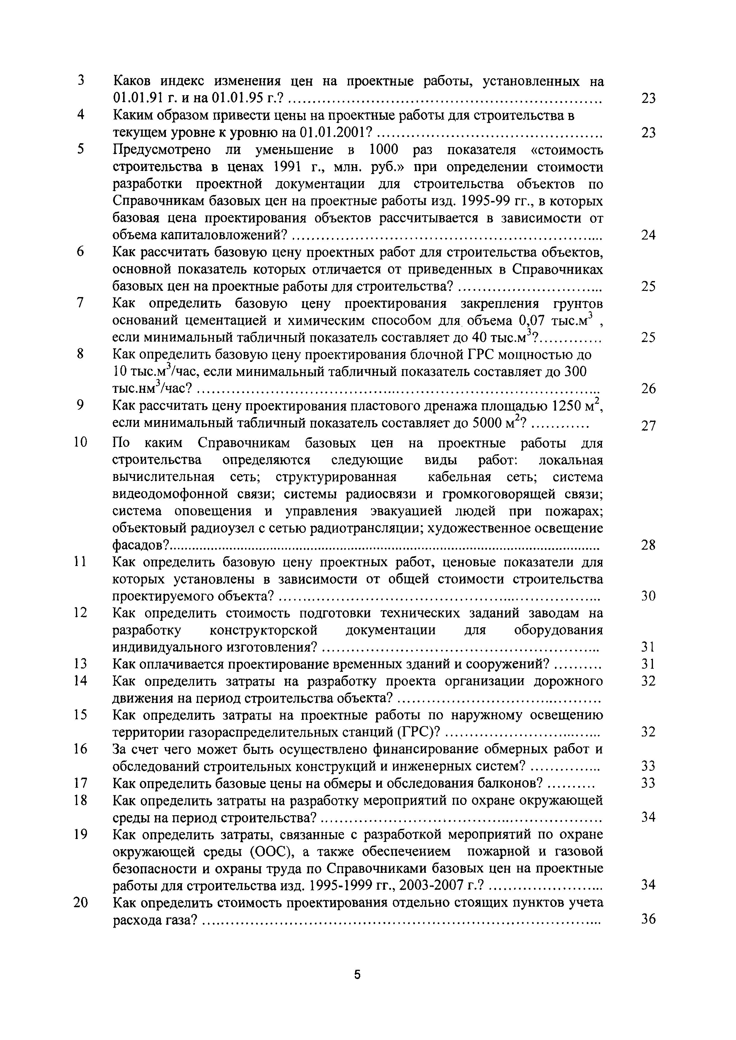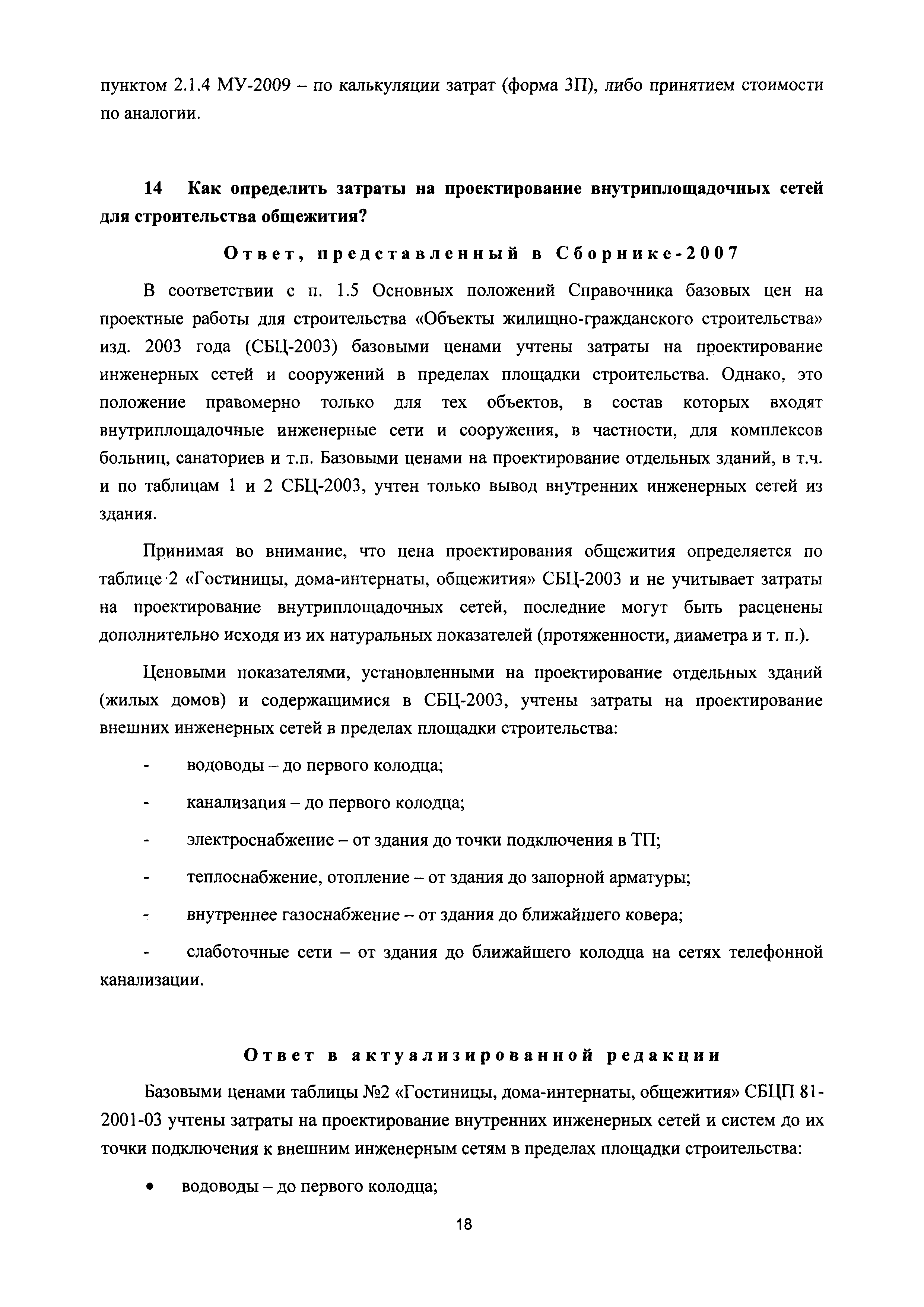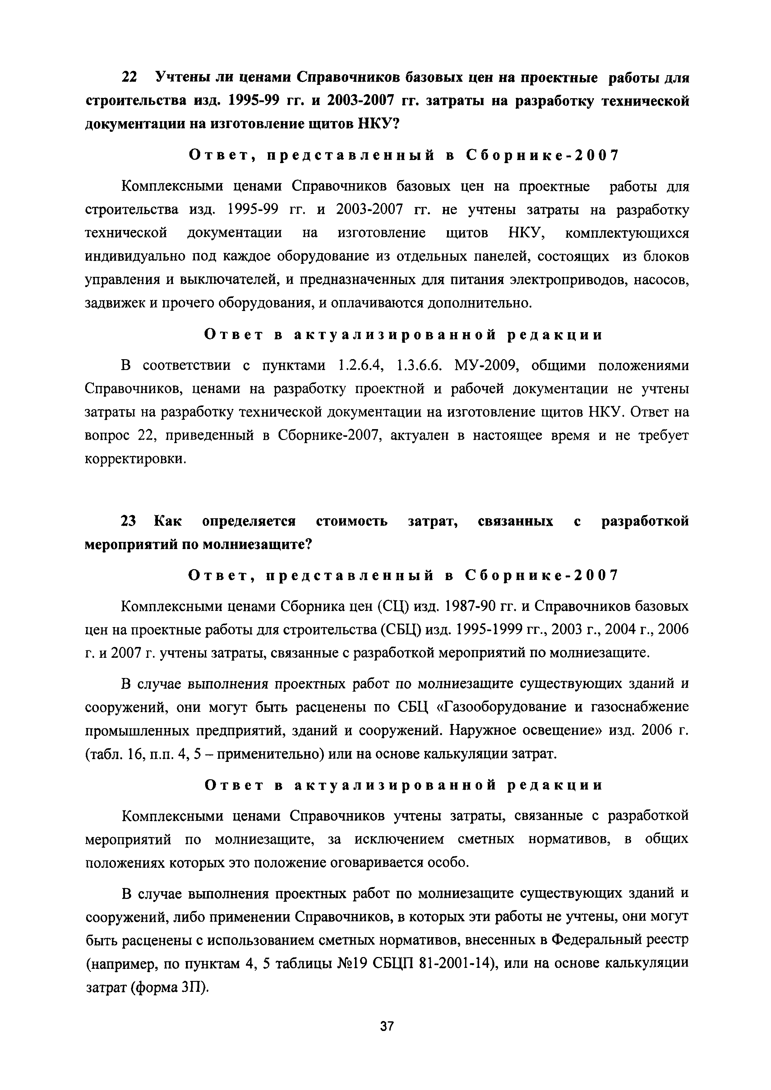 Сборник разъяснений по применению Сборника цен и Справочников базовых цен на проектные работы для строительства*. (Вопросы и ответы) 2007 - 2017| Статус: | справочные материалы, мп, тпр | | Название рус.: | Сборник разъяснений по применению Сборника цен и Справочников базовых цен на проектные работы для строительства*. (Вопросы и ответы) 2007 - 2017 | | Дата добавления в базу: | 05.05.2017 | | Дата актуализации: | 01.01.2021 | | Область применения: | Сборник разъяснений по применению Сборника цен и Справочников базовых цен на проектные работы для строительства* (Вопросы и ответы) 2007 – 2017 является актуализированной редакцией "Сборника разъяснений по применению Сборника цен и Справочников базовых цен на проектные работы для строительства (Вопросы и ответы)", разработанного Центром в 2007 году, и относится к пособиям, предназначенным для облегчения деятельности проектировщиков при решении ими отдельных конкретных наиболее актуальных вопросов ценообразования и сметного нормирования проектных работ | | Оглавление: | Введение Список сокращений, используемых в Сборнике I Разъяснения по определению базовой цены проектных работ для строительства объектов жилищно-гражданского назначения 1 Как рассчитать цену проектирования 2-х 14-ти этажных жилых домов на основе блок секций, разработанных для 18-ти этажного дома ? 2 Как определяется стоимость рабочего проекта 5-ти этажного дома, скомпонованного из 3-х блок-секций с внесением изменений в надземную часть здания ? 3 Как определить стоимость проектирования жилого дома разной этажности (3-4-5-6 этажного) ? 4 Как определить базовую цену проектирования фитнес-клуба и салона красоты ? 5 Учтены ли ценами Справочника затраты на проектирование жилых домов с кондиционированием ? 6 Как рассчитать базовую цену проектирования навесных вентилируемых фасадов ? 7 Как определить стоимость проектирования крытого велодрома с трибунами на 500 мест ? 8 Учтены ли ценовыми показателями таблицы 12 "Здания дошкольных учреждений и учебных заведений" затраты на привязку типовых проектов спортивных сооружений ? 9 Как определяется стоимость разработки раздела "Перечень мероприятий по обеспечению пожарной безопасности" ? 10 Как определить стоимость проектирования фонтанов ? 11 Как определяется стоимость проектирования мансардного этажа ? 12 Как определить базовую цену проектирования объекта со встроенными помещениями ? 13 Как определить стоимость проектирования типовых строительных изделий, изготавливаемых индустриальными методами (на заводах железобетонных конструкций) ? 14 Как определить затраты на проектирование внутриплощадочных сетей для строительства общежития ? 15 Учтены ли ценами Справочника затраты на разработку автоматизированных систем учета, контроля и управления инженерными системами для жилых домов и общественных зданий (АСУК и У) ? 16 Учтены ли ценами СБЦ-2003 затраты на применение тех или иных типоразмеров и марок стеклопакетов ? 17 Учтена ли СБЦ-2003 стоимость разработки узлов и конструкций стропильной кровли ? 18 Учтены ли ценами СБЦ-2003 затраты на проектирование элементов снегозадержания на кровле зданий и кабельного обогрева кровли и водостоков ? II Разъяснения по определению стоимости других проектных или связанных с проектированием работ 1 Как определить затраты, связанные с отводом земельного участка ? 2 Как определяются затраты п