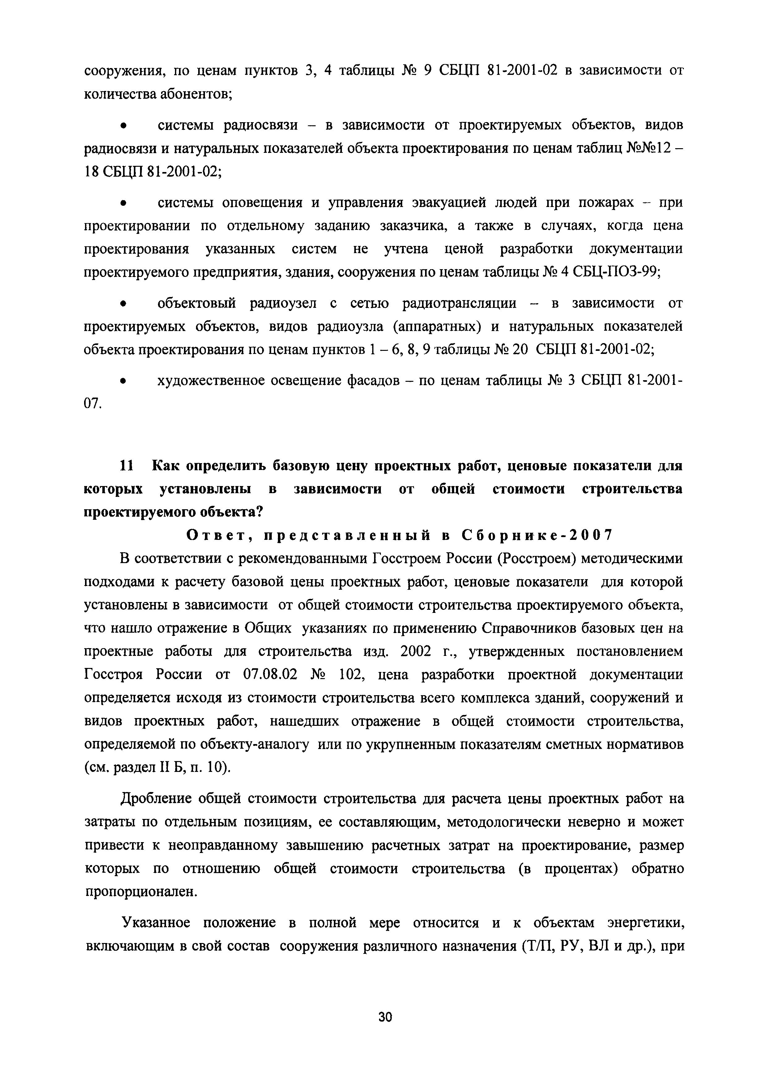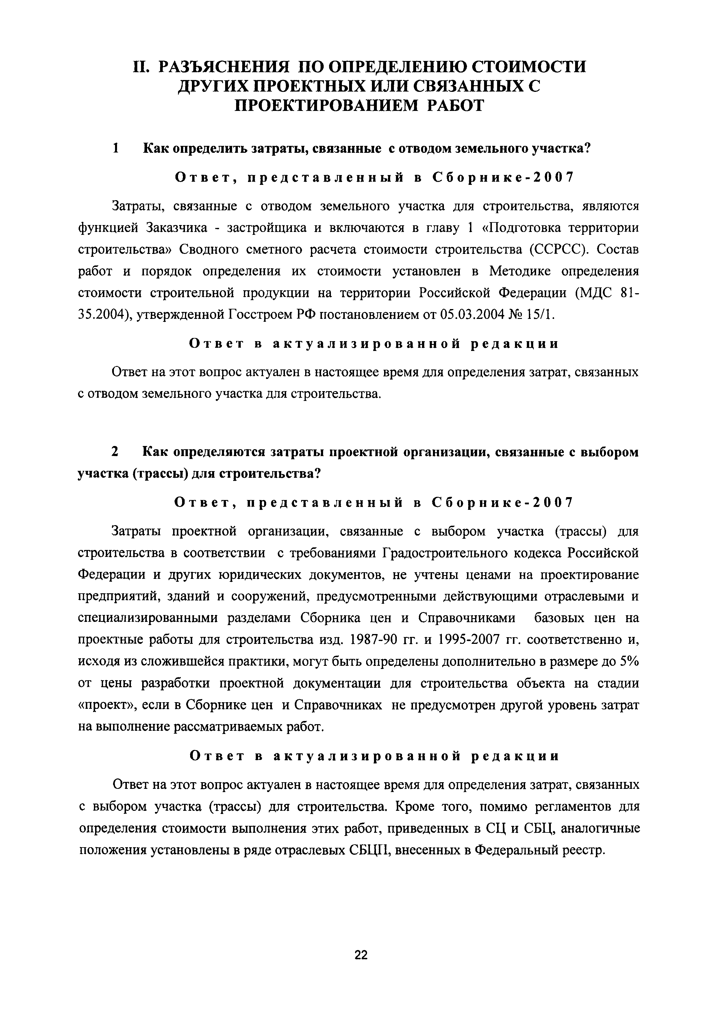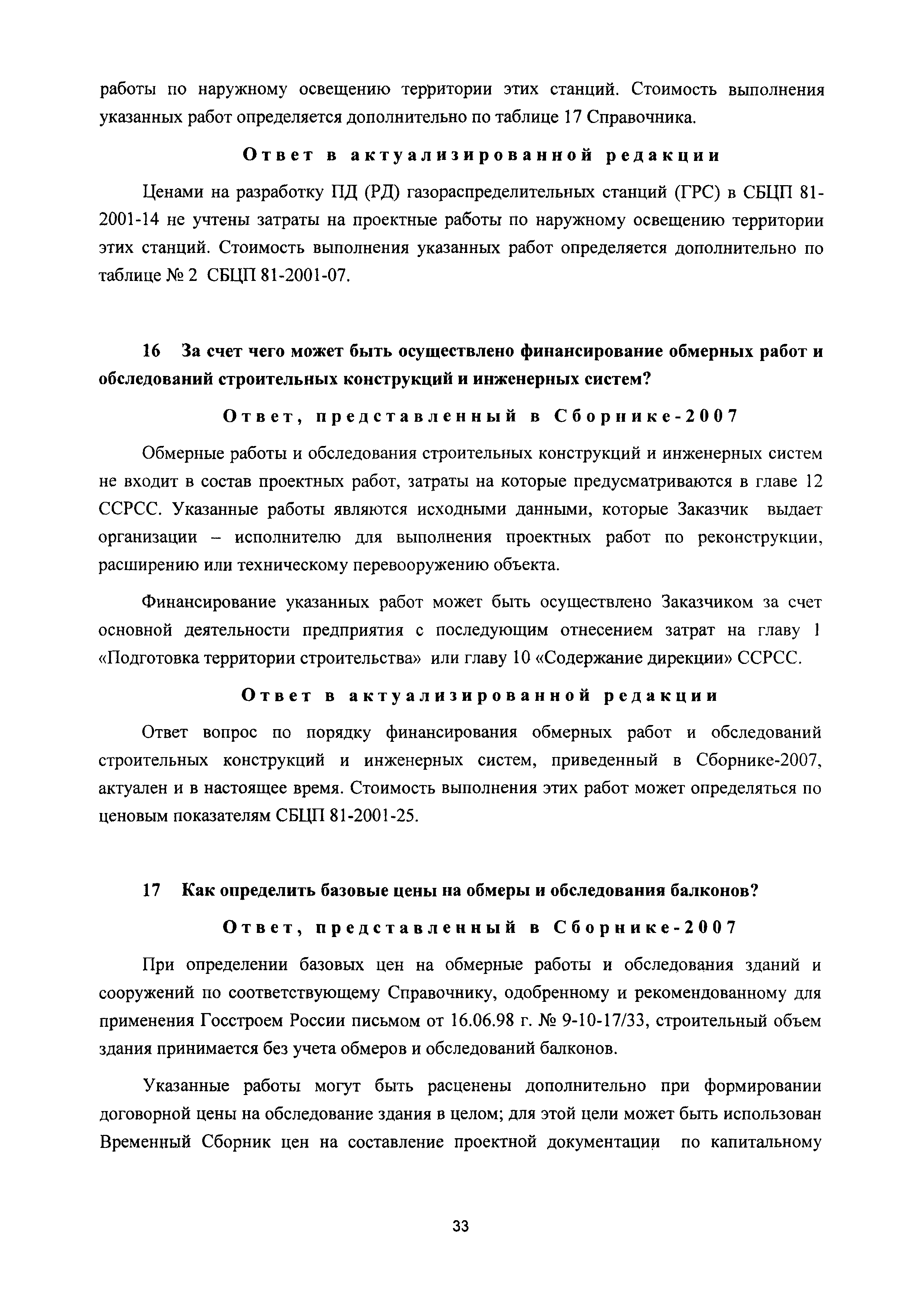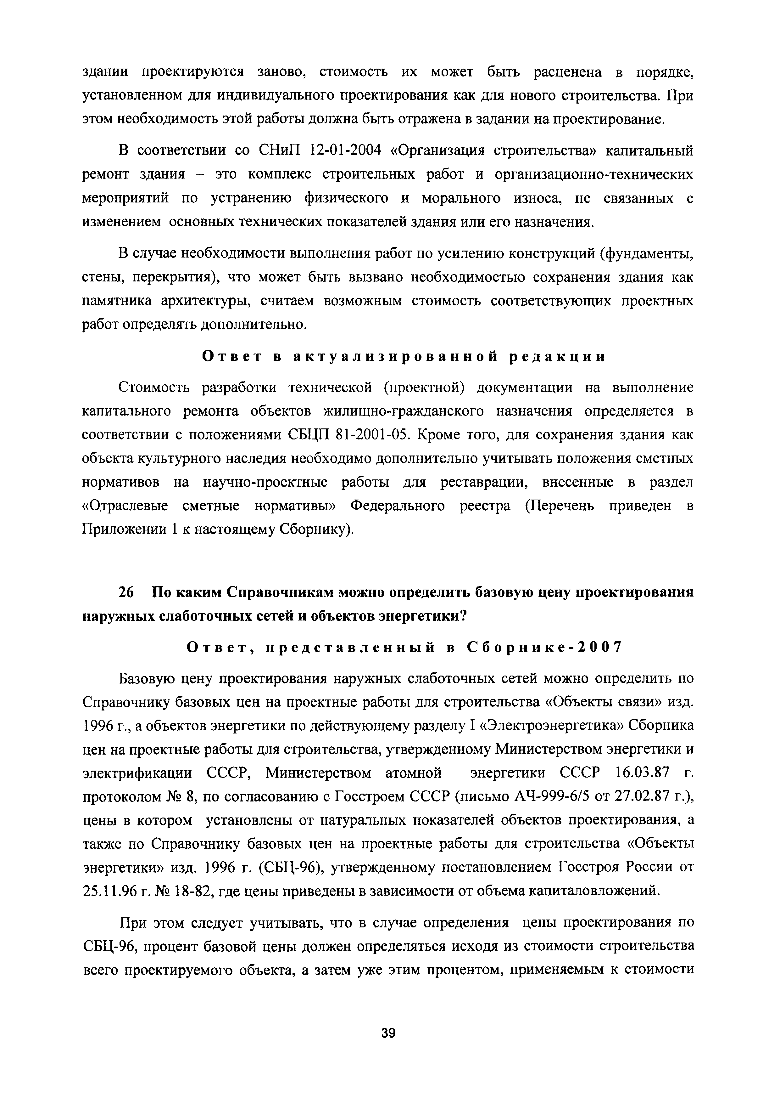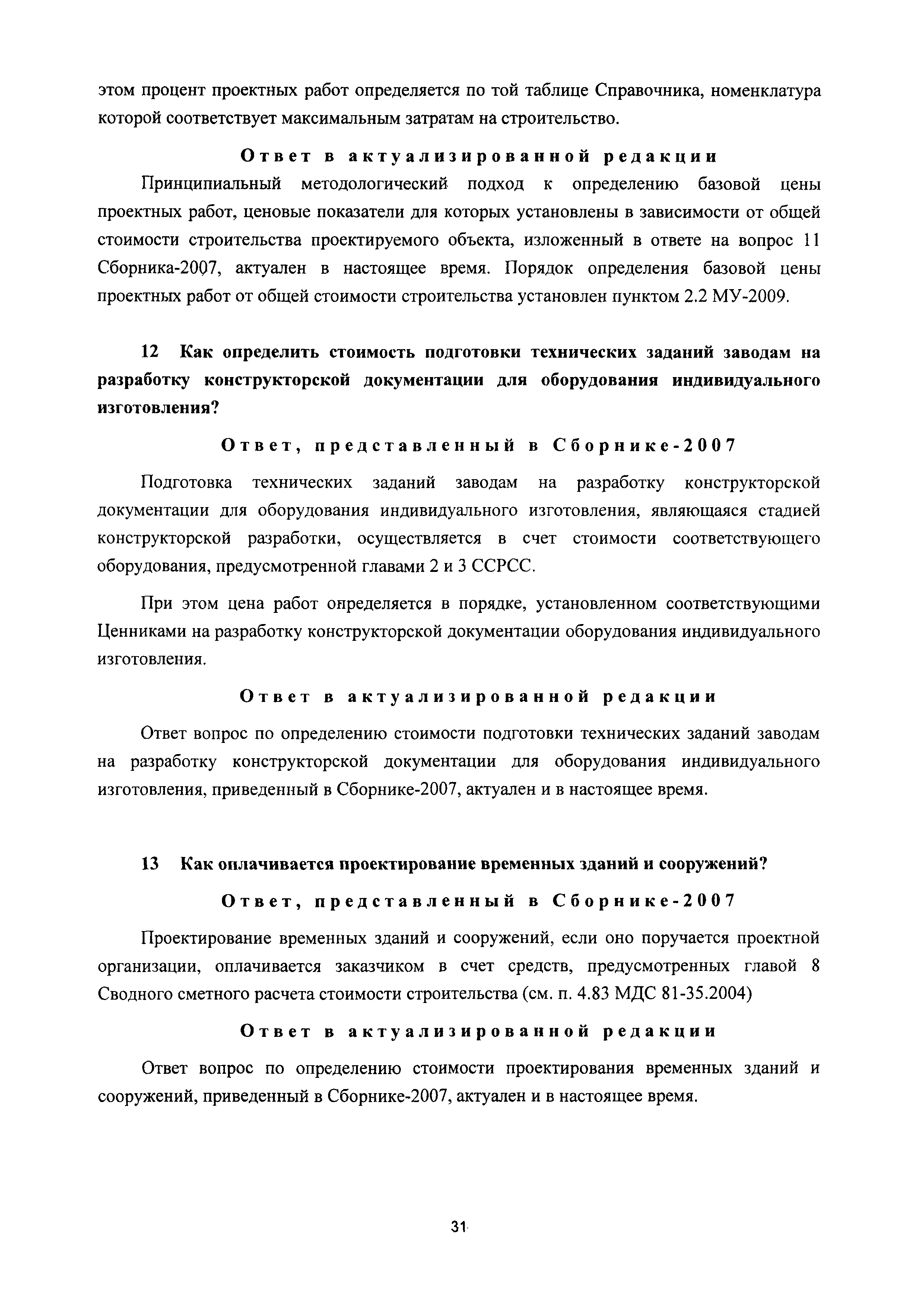 Сборник разъяснений по применению Сборника цен и Справочников базовых цен на проектные работы для строительства*. (Вопросы и ответы) 2007 - 2017| Статус: | справочные материалы, мп, тпр | | Название рус.: | Сборник разъяснений по применению Сборника цен и Справочников базовых цен на проектные работы для строительства*. (Вопросы и ответы) 2007 - 2017 | | Дата добавления в базу: | 05.05.2017 | | Дата актуализации: | 01.01.2021 | | Область применения: | Сборник разъяснений по применению Сборника цен и Справочников базовых цен на проектные работы для строительства* (Вопросы и ответы) 2007 – 2017 является актуализированной редакцией "Сборника разъяснений по применению Сборника цен и Справочников базовых цен на проектные работы для строительства (Вопросы и ответы)", разработанного Центром в 2007 году, и относится к пособиям, предназначенным для облегчения деятельности проектировщиков при решении ими отдельных конкретных наиболее актуальных вопросов ценообразования и сметного нормирования проектных работ | | Оглавление: | Введение Список сокращений, используемых в Сборнике I Разъяснения по определению базовой цены проектных работ для строительства объектов жилищно-гражданского назначения 1 Как рассчитать цену проектирования 2-х 14-ти этажных жилых домов на основе блок секций, разработанных для 18-ти этажного дома ? 2 Как определяется стоимость рабочего проекта 5-ти этажного дома, скомпонованного из 3-х блок-секций с внесением изменений в надземную часть здания ? 3 Как определить стоимость проектирования жилого дома разной этажности (3-4-5-6 этажного) ? 4 Как определить базовую цену проектирования фитнес-клуба и салона красоты ? 5 Учтены ли ценами Справочника затраты на проектирование жилых домов с кондиционированием ? 6 Как рассчитать базовую цену проектирования навесных вентилируемых фасадов ? 7 Как определить стоимость проектирования крытого велодрома с трибунами на 500 мест ? 8 Учтены ли ценовыми показателями таблицы 12 "Здания дошкольных учреждений и учебных заведений" затраты на привязку типовых проектов спортивных сооружений ? 9 Как определяется стоимость разработки раздела "Перечень мероприятий по обеспечению пожарной безопасности" ? 10 Как определить стоимость проектирования фонтанов ? 11 Как определяется стоимость проектирования мансардного этажа ? 12 Как определить базовую цену проектирования объекта со встроенными помещениями ? 13 Как определить стоимость проектирования типовых строительных изделий, изготавливаемых индустриальными методами (на заводах железобетонных конструкций) ? 14 Как определить затраты на проектирование внутриплощадочных сетей для строительства общежития ? 15 Учтены ли ценами Справочника затраты на разработку автоматизированных систем учета, контроля и управления инженерными системами для жилых домов и общественных зданий (АСУК и У) ? 16 Учтены ли ценами СБЦ-2003 затраты на применение тех или иных типоразмеров и марок стеклопакетов ? 17 Учтена ли СБЦ-2003 стоимость разработки узлов и конструкций стропильной кровли ? 18 Учтены ли ценами СБЦ-2003 затраты на проектирование элементов снегозадержания на кровле зданий и кабельного обогрева кровли и водостоков ? II Разъяснения по определению стоимости других проектных или связанных с проектированием работ 1 Как определить затраты, связанные с отводом земельного участка ? 2 Как определяются затраты п