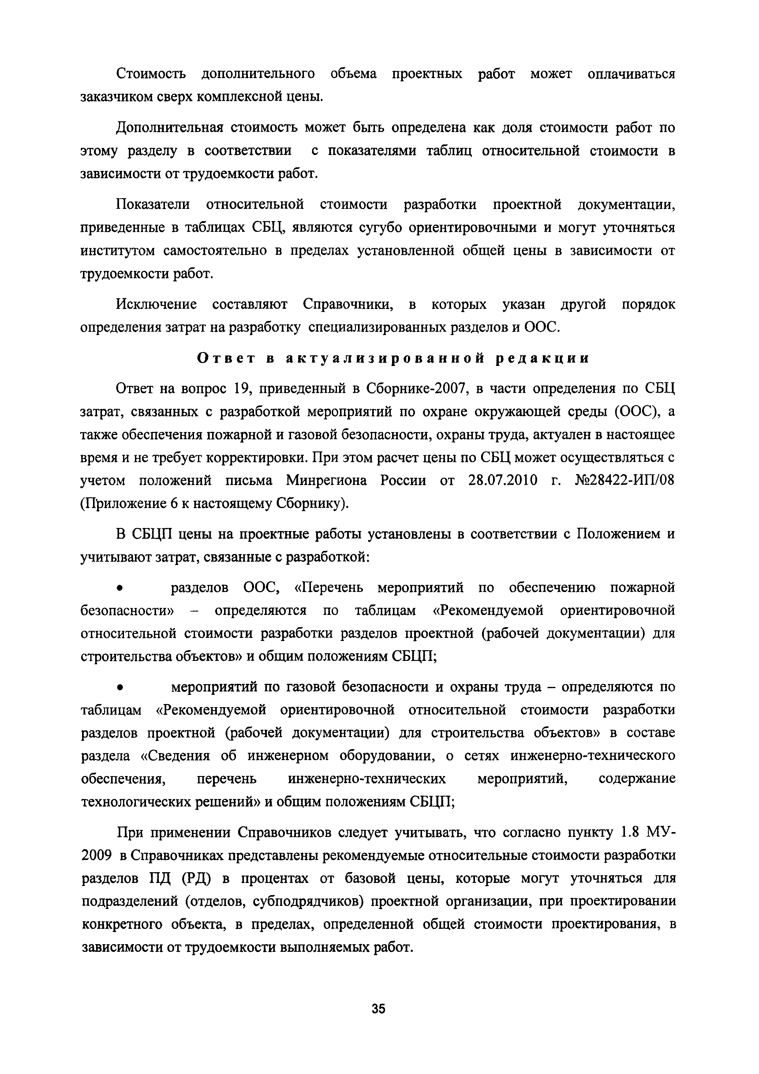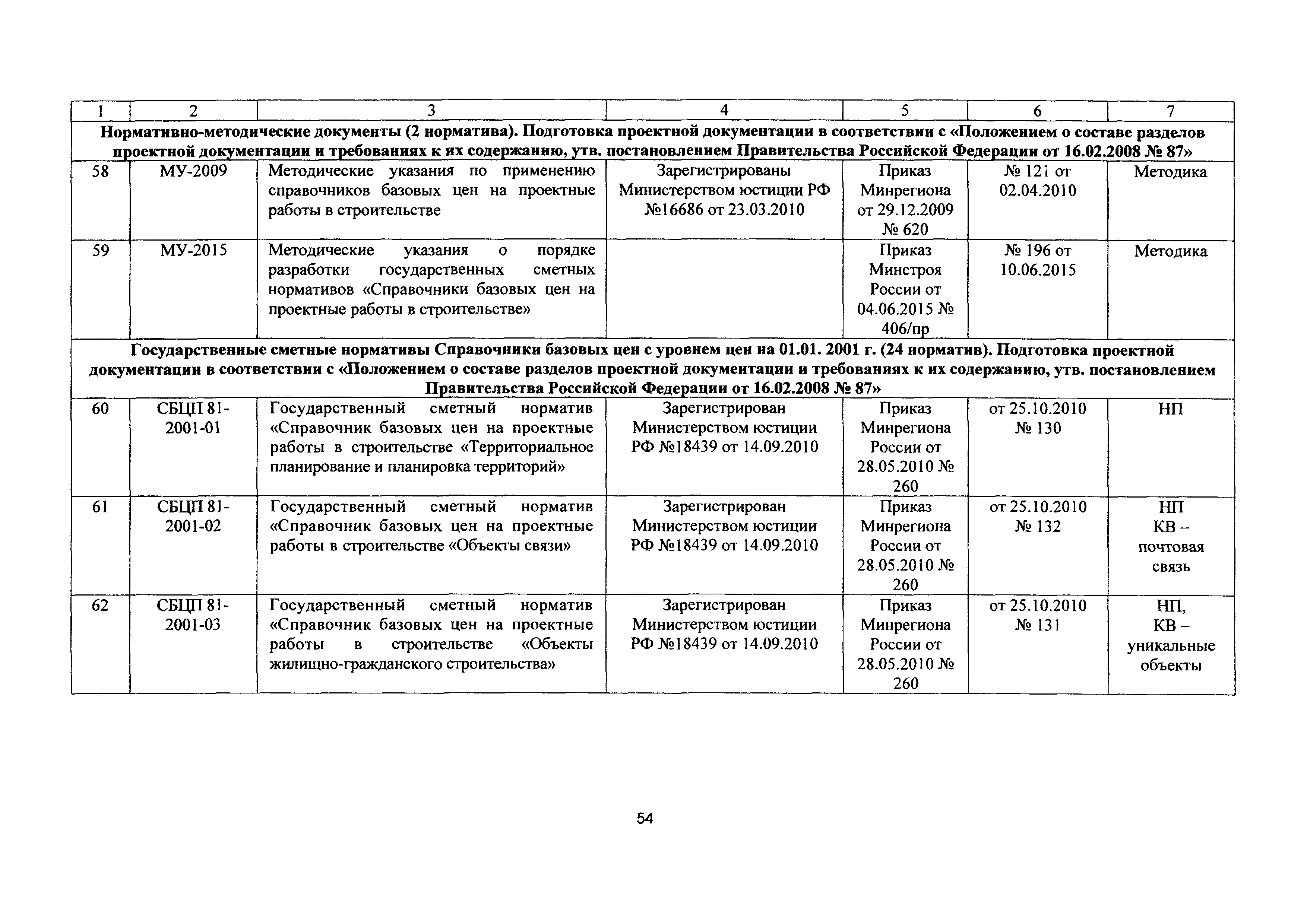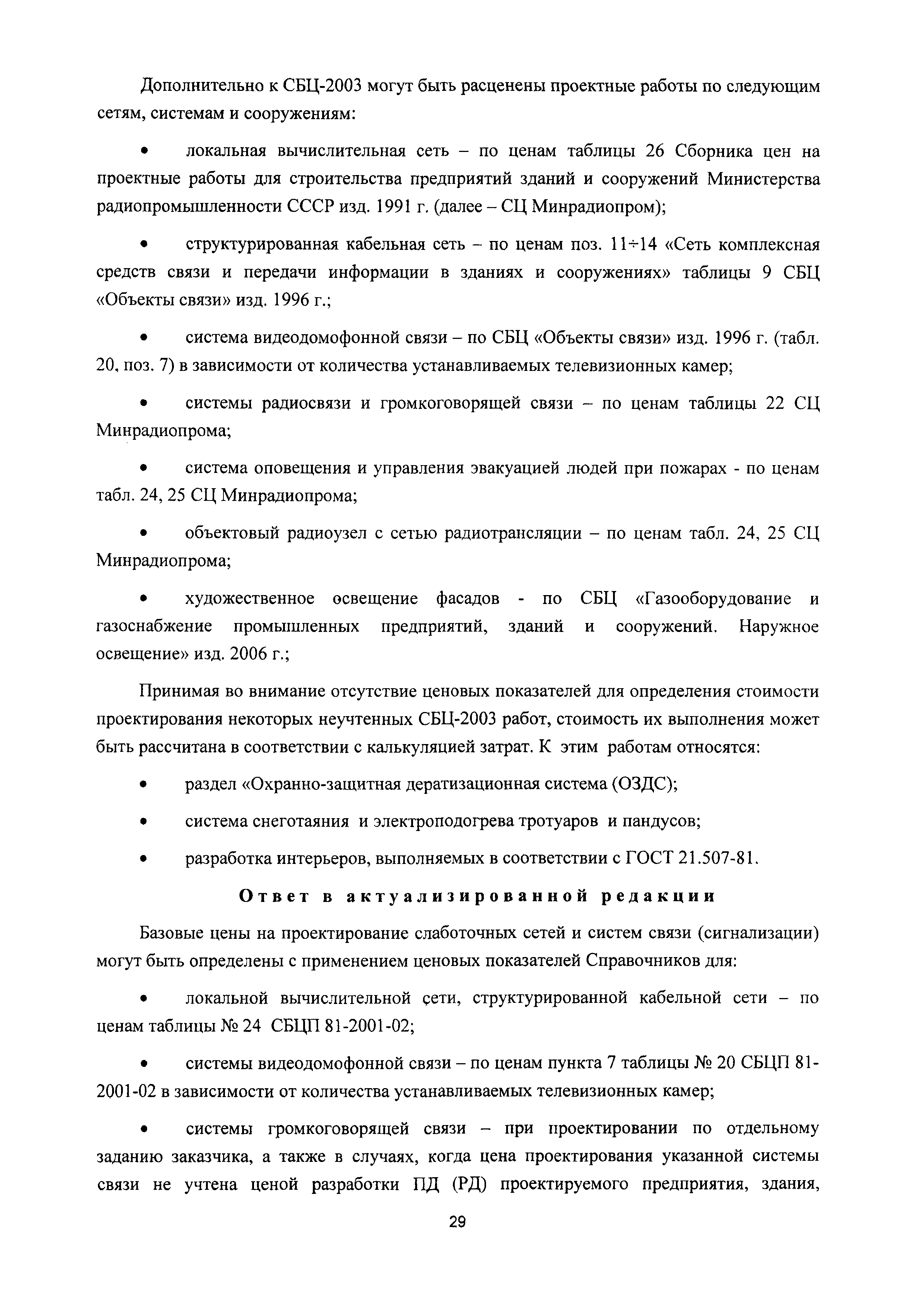 | | Заменяет собой: | | | Нормативные ссылки: |   СНиП 11-01-95 «Инструкция о порядке разработки, согласования, утверждения и составе проектной документации на строительство предприятий, зданий и сооружений»  СН 283-64 «Временные нормы продолжительности проектирования» СП 11-101-95 «Порядок разработки, согласования, утверждения и состав обоснований инвестиций в строительство предприятий, зданий и сооружений»  ГОСТ 21.507-81 «Система проектной документации для строительства. Интерьеры. Рабочие чертежи»  «Положение о составе разделов проектной документации и требованиях к их содержанию»  СБЦП 81-2001-01 «Территориальное планирование и планировка территорий. Справочник базовых цен на проектные работы для строительства»  СБЦП 81-2001-02 «Объекты связи. Справочник базовых цен на проектные работы для строительства»  СБЦП 81-2001-03 «Объекты жилищно-гражданского строительства. Справочник базовых цен на проектные работы для строительства»  Федеральный закон 63-ФЗ «Об электронной подписи»  СБЦП 81-2001-04 «Объекты авиационной промышленности. Справочник базовых цен на проектные работы для строительства»  СБЦП 81-2001-05 «Нормативы подготовки технической документации для капитального ремонта зданий и сооружений жилищно-гражданского назначения. Справочник базовых цен на проектные работы для строительства»  СБЦП 81-2001-06 «Объекты атомной энергетики. Справочник базовых цен на проектные работы для строительства»  СБЦП 81-2001-07 «Коммунальные инженерные сети и сооружения. Справочник базовых цен на проектные работы для строительства»  СБЦП 81-2001-08 «Объекты магистрального трубопроводного транспорта нефти. Справочник базовых цен на проектные работы для строительства»  ГОСТ 21.408-2013 «Система проектной документации для строительства. Правила выполнения рабочей документации автоматизации технологических процессов»  СБЦП 81-2001-09 «Железные дороги. Справочник базовых цен на проектные работы для строительства»  СБЦП 81-2001-11 «Предприятия агропромышленного комплекса, торговли и общественного питания. Справочник базовых цен на проектные работы для строительства»  СБЦП 81-2001-10 «Объекты Министерства обороны Российской Федерации. Справочник базовых цен на проектные работы для строительства»  СБЦП 81-2001-12 «Объекты гражданской авиации. Справочник базовых цен на проектные работы для строительства»  СБЦП 81-2001-13 «Объекты нефтеперерабатывающей и нефтехимической промышленности. Справочник базовых цен на проектные работы для строительства»  СБЦП 81-2001-17 «Объекты водоснабжения и канализации. Справочник базовых цен на проектные работы для строительства»  СБЦП 81-2001-16 «Искусственные сооружения. Справочник базовых цен на проектные работы для строительства»  СБЦП 81-2001-14 «Газооборудование и газоснабжение промышленных предприятий, зданий и сооружений. Справочник базовых цен на проектные работы для строительства»  СБЦП 81-2001-15 «Заглубленные сооружения и конструкции, водопонижение, противооползневые сооружения и мероприятия. Справочник базовых цен на проектные работы для строительства»  СБЦП 81-2001-18 «Объекты черной металлургии. Справочник базовых цен на проектные работы для строительства»  СБЦП 81-2001-19 «Предприятия транспорта, хранения нефтепродуктов и автозаправочные станции. Справочник базовых цен на проектные работы для строительства»  СБЦП 81-2001-20 «Цинковые, свинцовые, медеплавильные, о