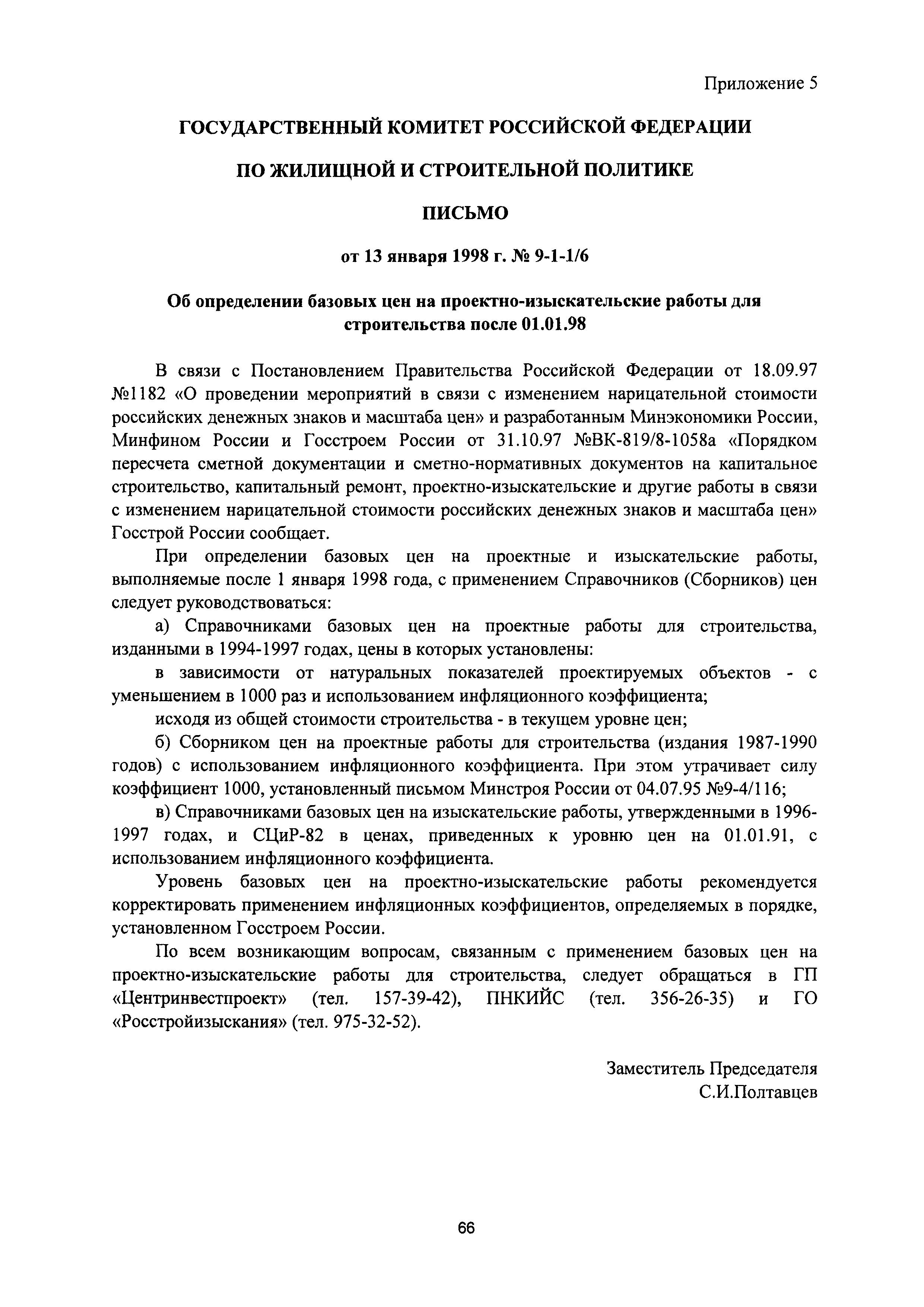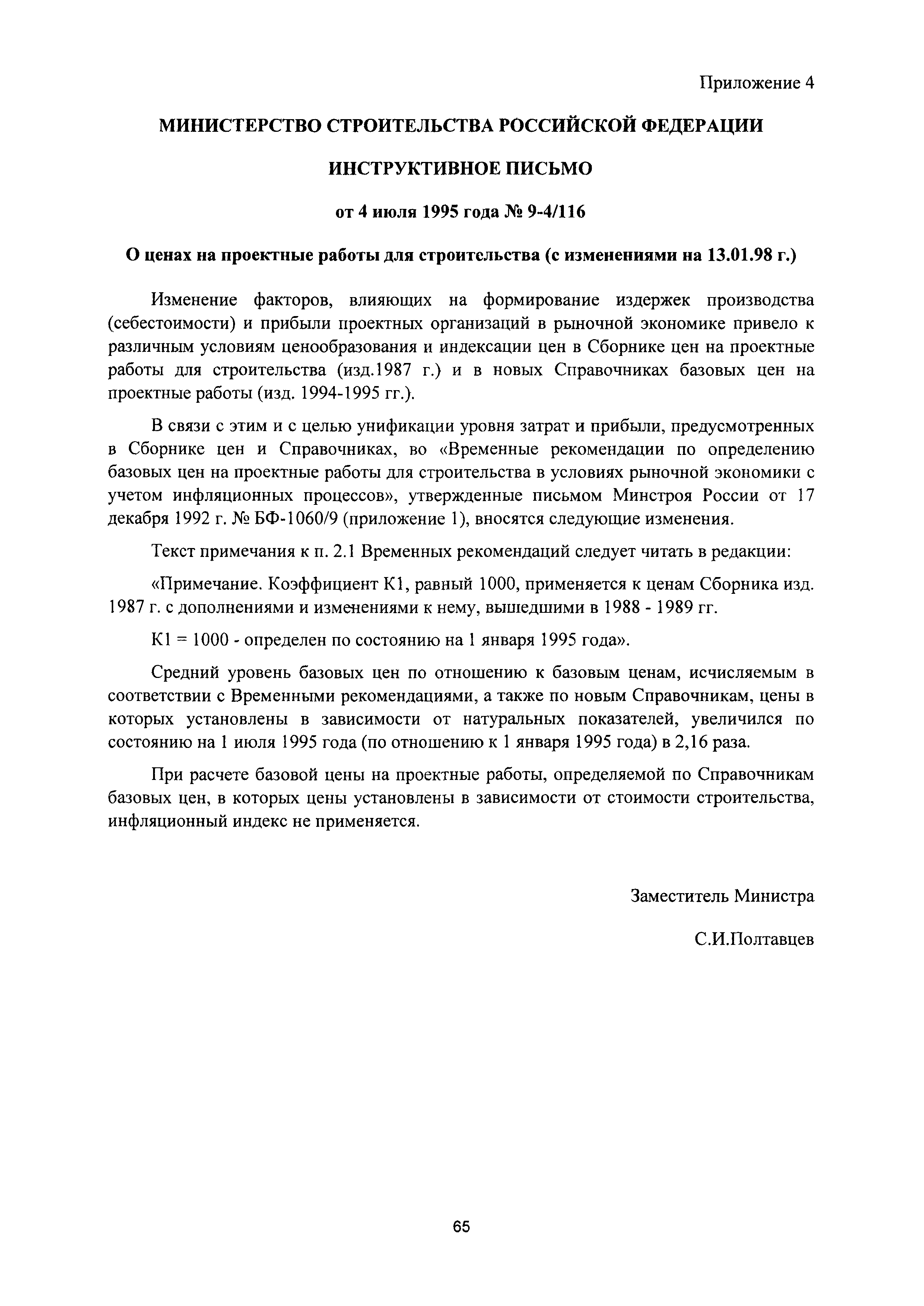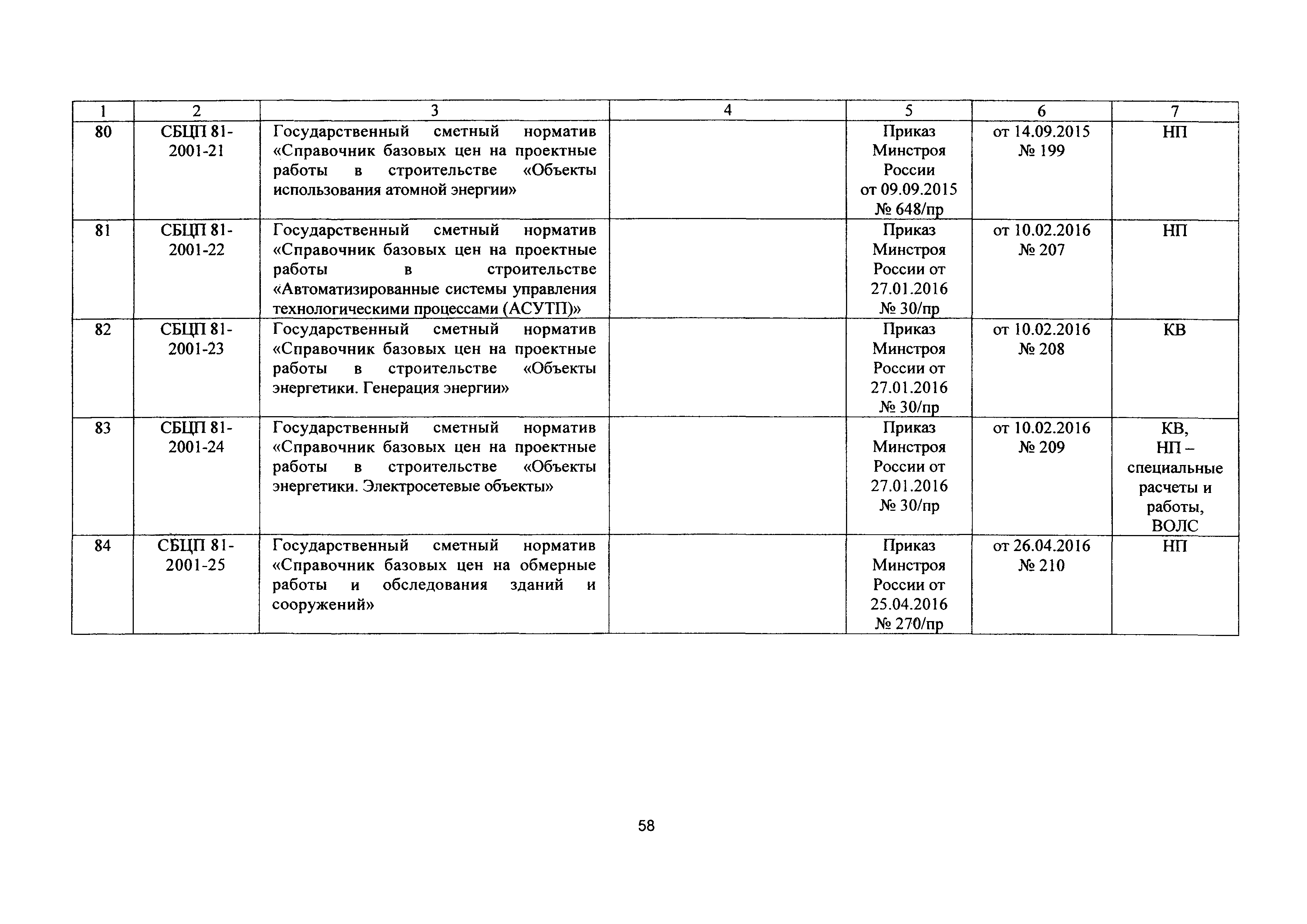 | | Заменяет собой: | | | Нормативные ссылки: |   СНиП 11-01-95 «Инструкция о порядке разработки, согласования, утверждения и составе проектной документации на строительство предприятий, зданий и сооружений»  СН 283-64 «Временные нормы продолжительности проектирования» СП 11-101-95 «Порядок разработки, согласования, утверждения и состав обоснований инвестиций в строительство предприятий, зданий и сооружений»  ГОСТ 21.507-81 «Система проектной документации для строительства. Интерьеры. Рабочие чертежи»  «Положение о составе разделов проектной документации и требованиях к их содержанию»  СБЦП 81-2001-01 «Территориальное планирование и планировка территорий. Справочник базовых цен на проектные работы для строительства»  СБЦП 81-2001-02 «Объекты связи. Справочник базовых цен на проектные работы для строительства»  СБЦП 81-2001-03 «Объекты жилищно-гражданского строительства. Справочник базовых цен на проектные работы для строительства»  Федеральный закон 63-ФЗ «Об электронной подписи»  СБЦП 81-2001-04 «Объекты авиационной промышленности. Справочник базовых цен на проектные работы для строительства»  СБЦП 81-2001-05 «Нормативы подготовки технической документации для капитального ремонта зданий и сооружений жилищно-гражданского назначения. Справочник базовых цен на проектные работы для строительства»  СБЦП 81-2001-06 «Объекты атомной энергетики. Справочник базовых цен на проектные работы для строительства»  СБЦП 81-2001-07 «Коммунальные инженерные сети и сооружения. Справочник базовых цен на проектные работы для строительства»  СБЦП 81-2001-08 «Объекты магистрального трубопроводного транспорта нефти. Справочник базовых цен на проектные работы для строительства»  ГОСТ 21.408-2013 «Система проектной документации для строительства. Правила выполнения рабочей документации автоматизации технологических процессов»  СБЦП 81-2001-09 «Железные дороги. Справочник базовых цен на проектные работы для строительства»  СБЦП 81-2001-11 «Предприятия агропромышленного комплекса, торговли и общественного питания. Справочник базовых цен на проектные работы для строительства»  СБЦП 81-2001-10 «Объекты Министерства обороны Российской Федерации. Справочник базовых цен на проектные работы для строительства»  СБЦП 81-2001-12 «Объекты гражданской авиации. Справочник базовых цен на проектные работы для строительства»  СБЦП 81-2001-13 «Объекты нефтеперерабатывающей и нефтехимической промышленности. Справочник базовых цен на проектные работы для строительства»  СБЦП 81-2001-17 «Объекты водоснабжения и канализации. Справочник базовых цен на проектные работы для строительства»  СБЦП 81-2001-16 «Искусственные сооружения. Справочник базовых цен на проектные работы для строительства»  СБЦП 81-2001-14 «Газооборудование и газоснабжение промышленных предприятий, зданий и сооружений. Справочник базовых цен на проектные работы для строительства»  СБЦП 81-2001-15 «Заглубленные сооружения и конструкции, водопонижение, противооползневые сооружения и мероприятия. Справочник базовых цен на проектные работы для строительства»  СБЦП 81-2001-18 «Объекты черной металлургии. Справочник базовых цен на проектные работы для строительства»  СБЦП 81-2001-19 «Предприятия транспорта, хранения нефтепродуктов и автозаправочные станции. Справочник базовых цен на проектные работы для строительства»  СБЦП 81-2001-20 «Цинковые, свинцовые, медеплавильные, о