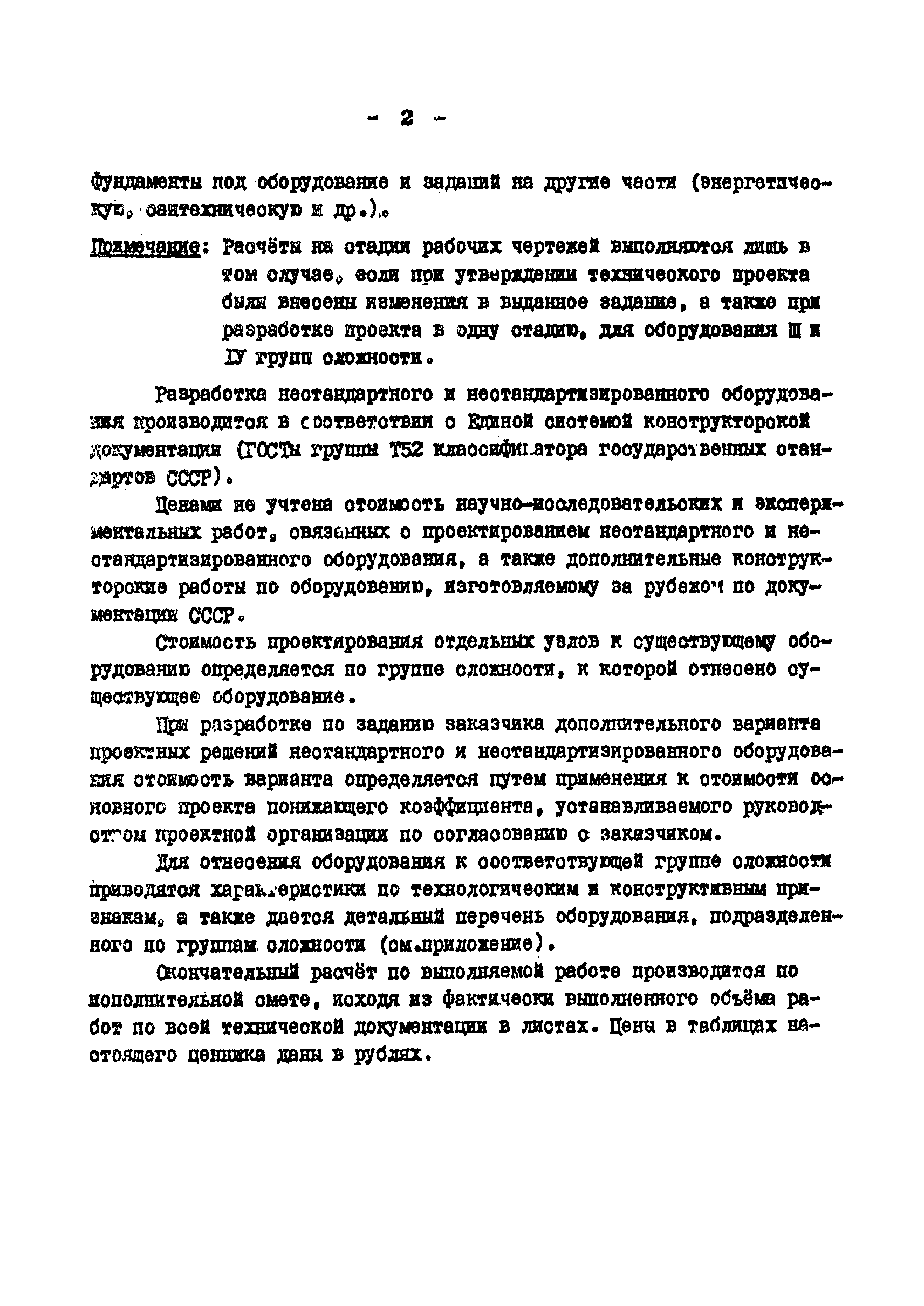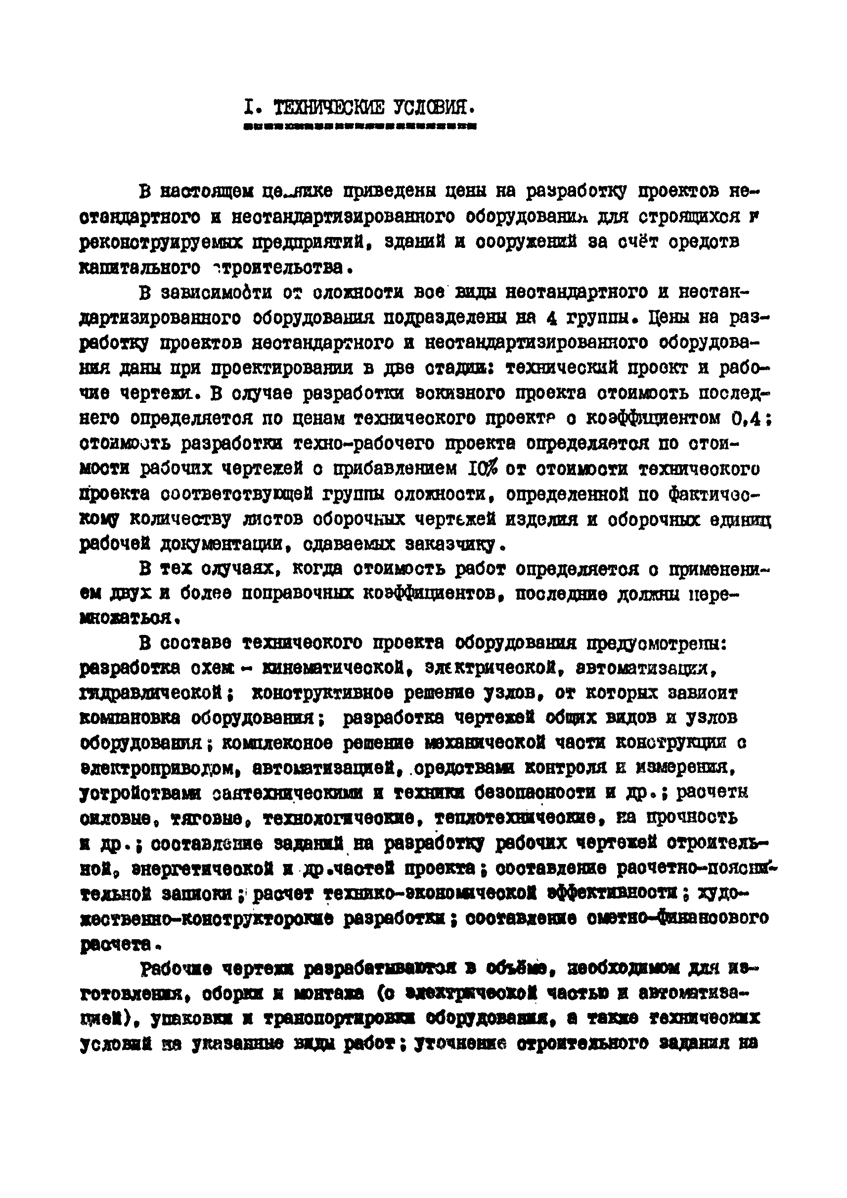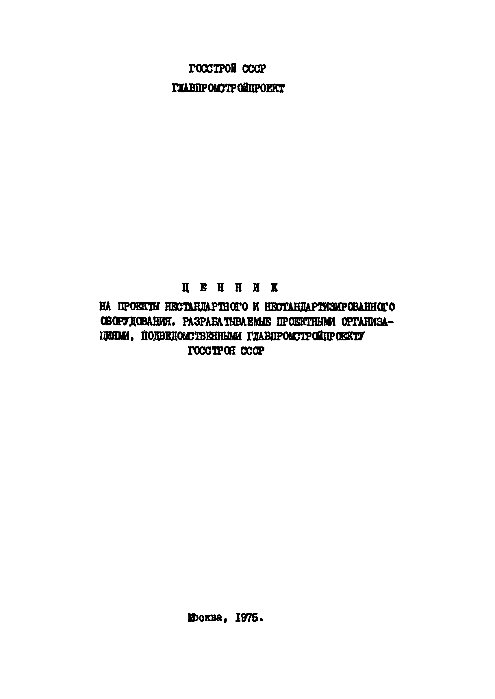 Ценник на проекты нестандартного и нестандартизированного оборудования, разрабатываемые проектными организациями, подведомственными Главпромстройпроекту Госстроя СССР| Статус: | не действует | | Название рус.: | Ценник на проекты нестандартного и нестандартизированного оборудования, разрабатываемые проектными организациями, подведомственными Главпромстройпроекту Госстроя СССР | | Дата добавления в базу: | 05.05.2017 | | Дата актуализации: | 01.01.2021 | | Область применения: | В ценнике приведены цены на разработку проектов нестандартного и нестандартизированного оборудования для строящихся и реконструируемых предприятий, зданий и сооружений за счет средств капитального строительства. | | Оглавление: | 1 Технические условия 2 Характеристика групп сложности 3 Цены Приложение. Перечень нестандартного и нестандартизированного оборудования | | Разработан: | Главпромстройпроект