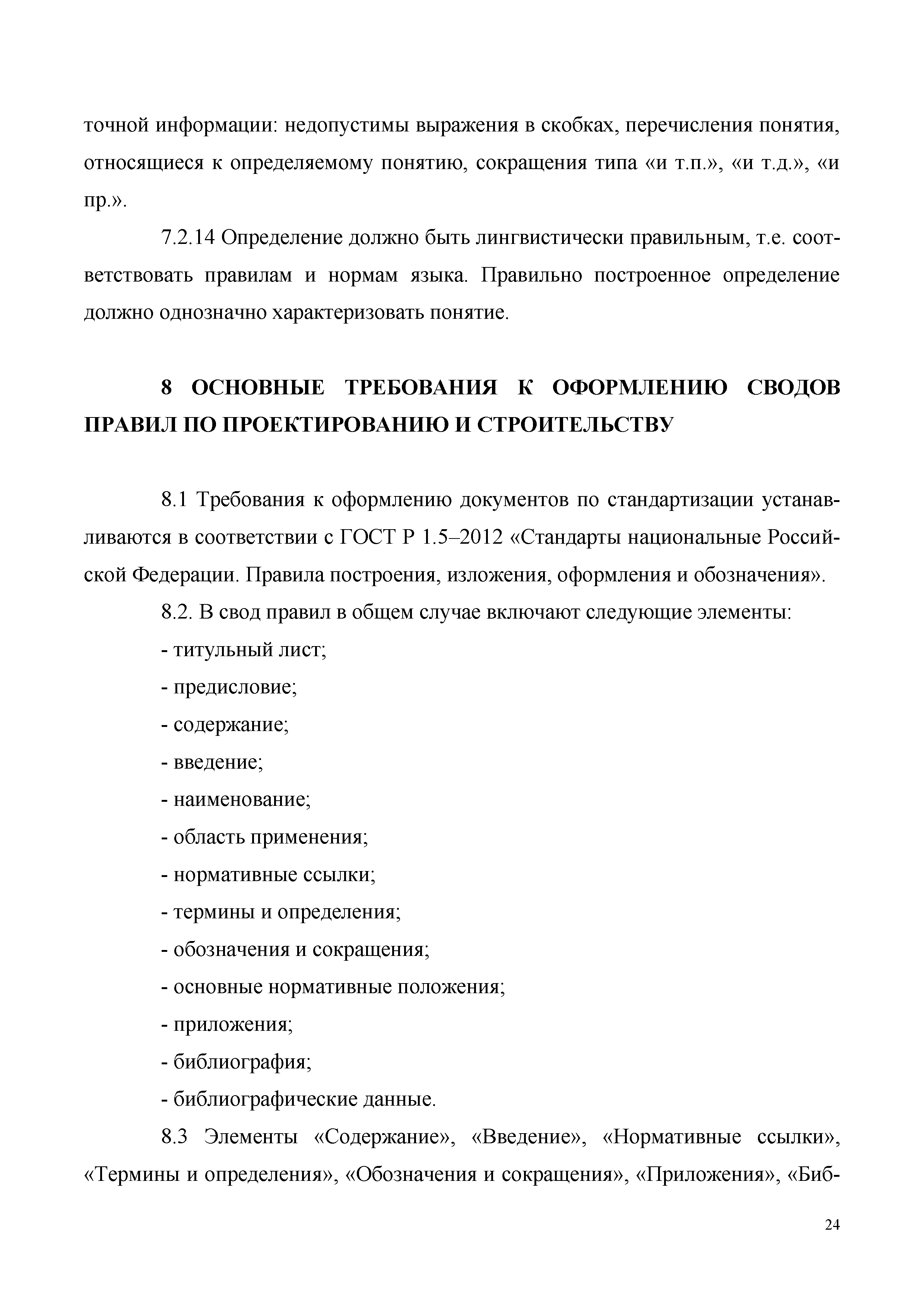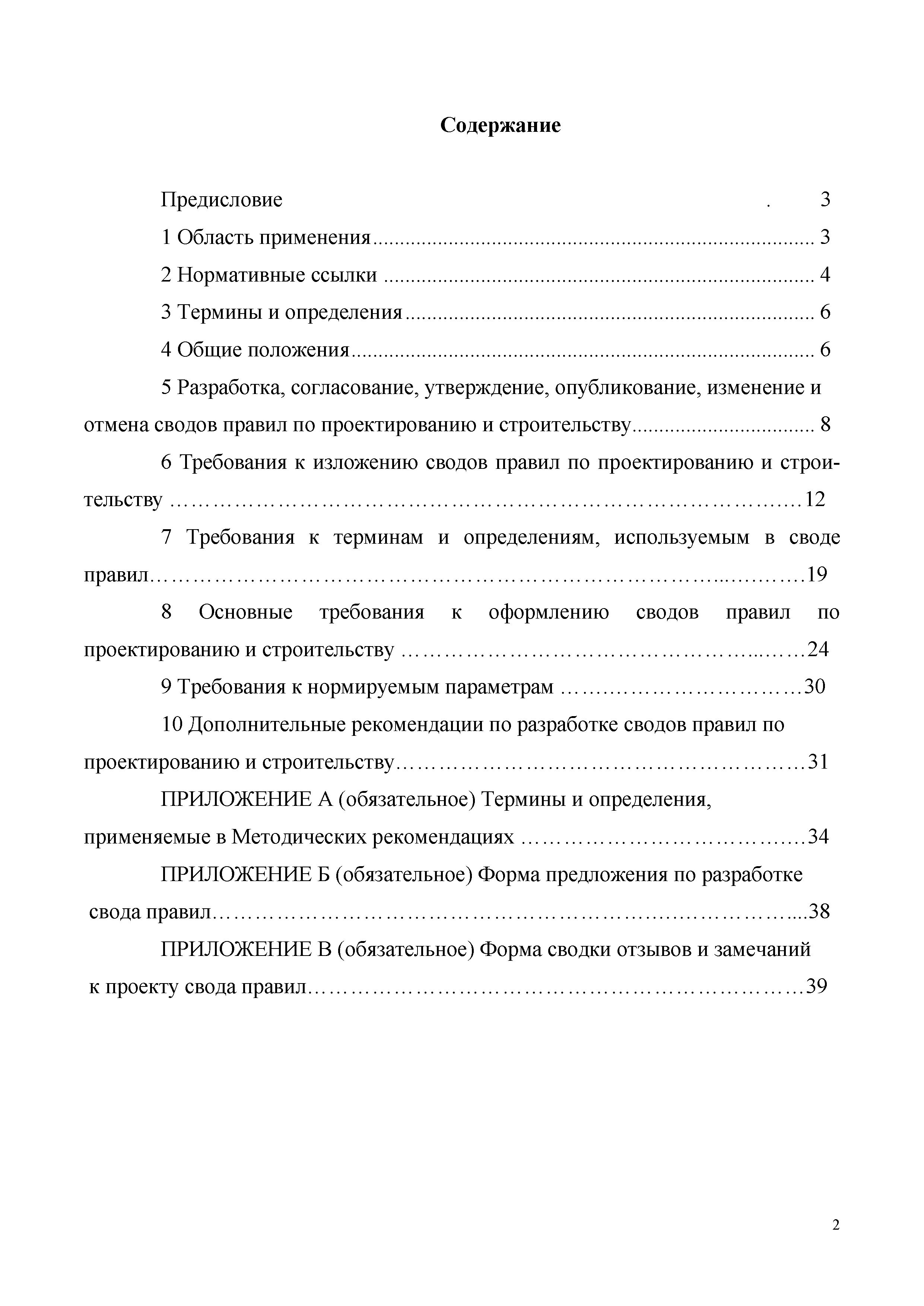 | Оглавление: | Предисловие 1 Область применения 2 Нормативные ссылки 3 Термины и определения 4 Общие положения 5 Разработка, согласование, утверждение, опубликование, изменение отмена сводов правил по проектированию и строительству 6 Требования к изложению сводов правил по проектированию и строительству 7 Требования к терминам и определениям, используемым в своде правил 8 Основные требования к оформлению сводов правил проектированию и строительству 9 Требования к нормируемым параметрам 10 Дополнительные рекомендации по разработке сводов правил по проектированию и строительству Приложение А (обязательное) Термины и определения, применяемые в Методических рекомендациях Приложение Б (обязательное) Форма предложения по разработке свода правил Приложение В (обязательное) Форма сводки отзывов и замечаний к проекту свода правил |