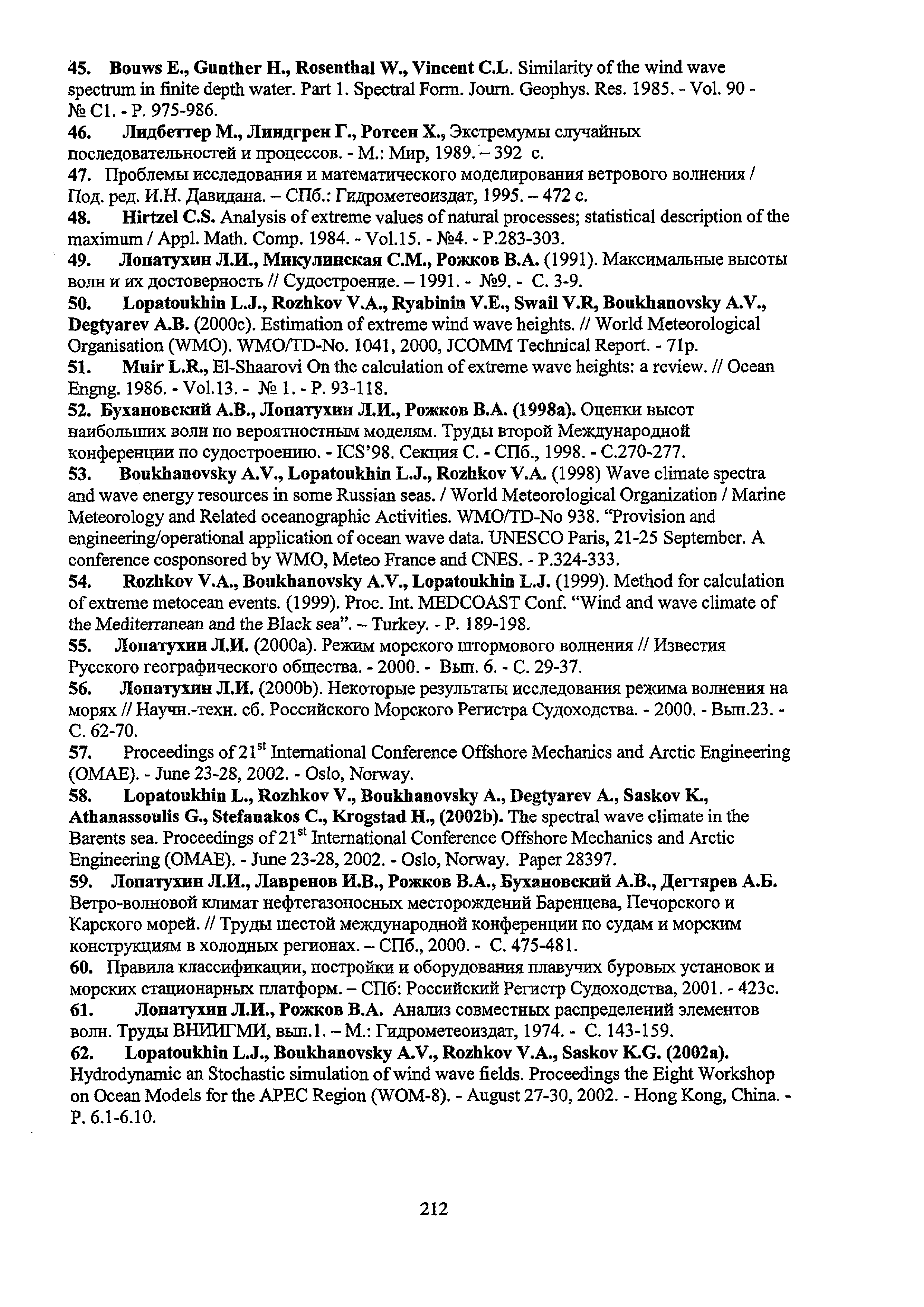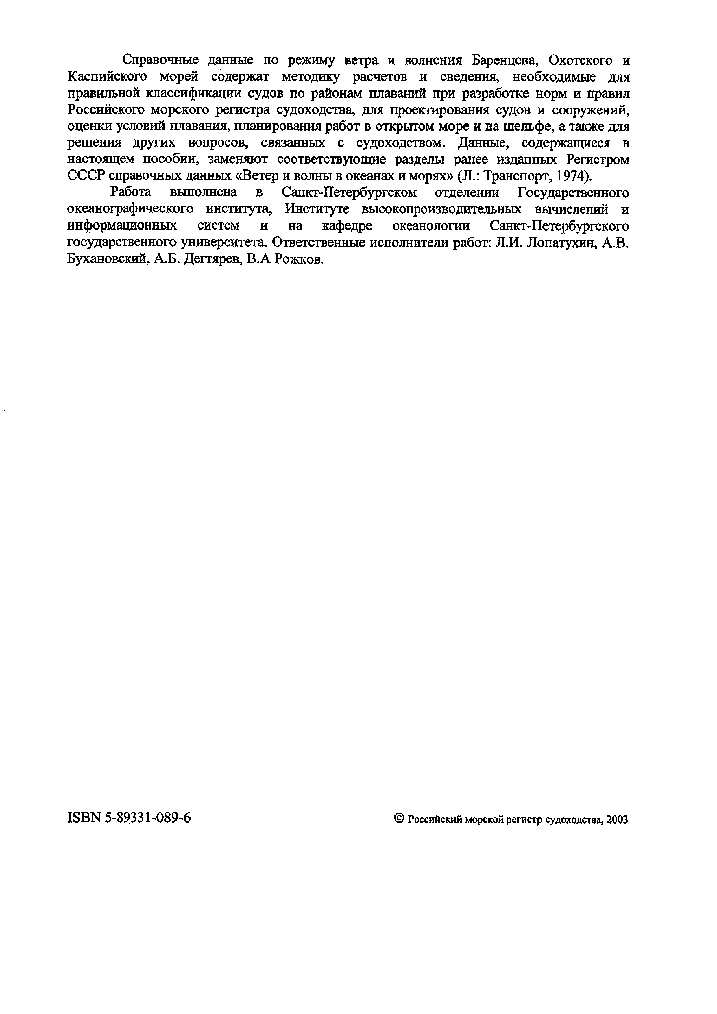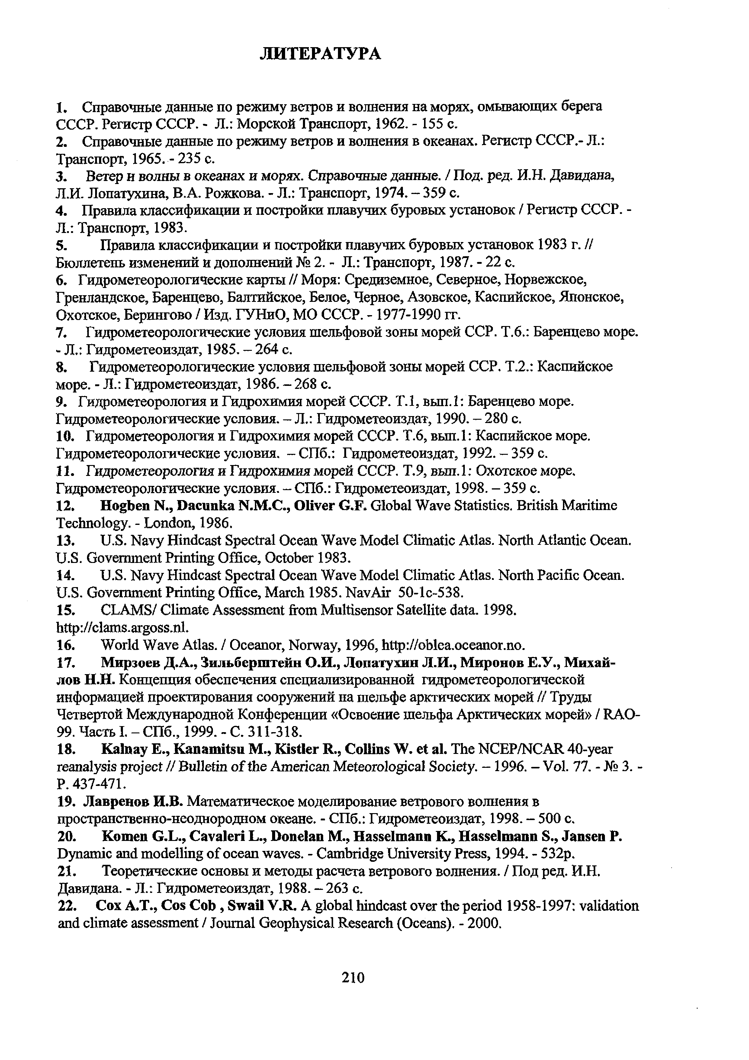 Справочные данные по режиму ветра и волнения Баренцева, Охотского и Каспийского морей| Статус: | взамен | | Название рус.: | Справочные данные по режиму ветра и волнения Баренцева, Охотского и Каспийского морей | | Дата добавления в базу: | 05.05.2017 | | Дата актуализации: | 01.01.2021 | | Область применения: | Справочные данные по режиму ветра и волнения Баренцева, Охотского и Каспийского морей содержат методику расчетов и сведения, необходимые для правильной классификации судов по районам плаваний при разработке норм и правил Российского морского регистра судоходства, для проектирования судов и сооружений, оценки условий плавания, планирования работ в открытом море и на шельфе, а также для решения других вопросов, связанных с судоходством. | | Оглавление: | Часть 1. Методы расчета режима ветра и волнения Введение 1 Краткая характеристика справочных данных по режиму ветра и волнения Баренцева, Охотского и Каспийского морей в соответствии с требованиями Российского морского регистра судоходства 2 Подходы к созданию нового поколения справочных данных по режиму ветра и волнения 2.1 Гидродинамические модели, используемые при расчетах ветра и волнения на морях и океанах 2.2 Проверка соответствия результатов модельных расчетов данным измерений 3 Особенности временной структуры ветра 4 Основные расчетные параметры волнения 4.1 Высоты видимых волн 4.2 Периоды и длины видимых волн 4.3 Высоты гребней волн 4.4 Совместное распределение высот и периодов волн 4.5 Спектральные характеристики волнения 5 Волновой климат (Режимные характеристика волнения) 5.1 Оперативные статистики 5.2 Экстремальные статистики волн Часть 2. Справочные данные по режиму ветра и волнения Баренцева, Охотского и Каспийского морей 1 Баренцево море 2 Охотское море 3 Каспийское море Литература | | Разработан: | Государственный океанографический институт Госкомгидромета Российский морской регистр судоходства СПбГУ