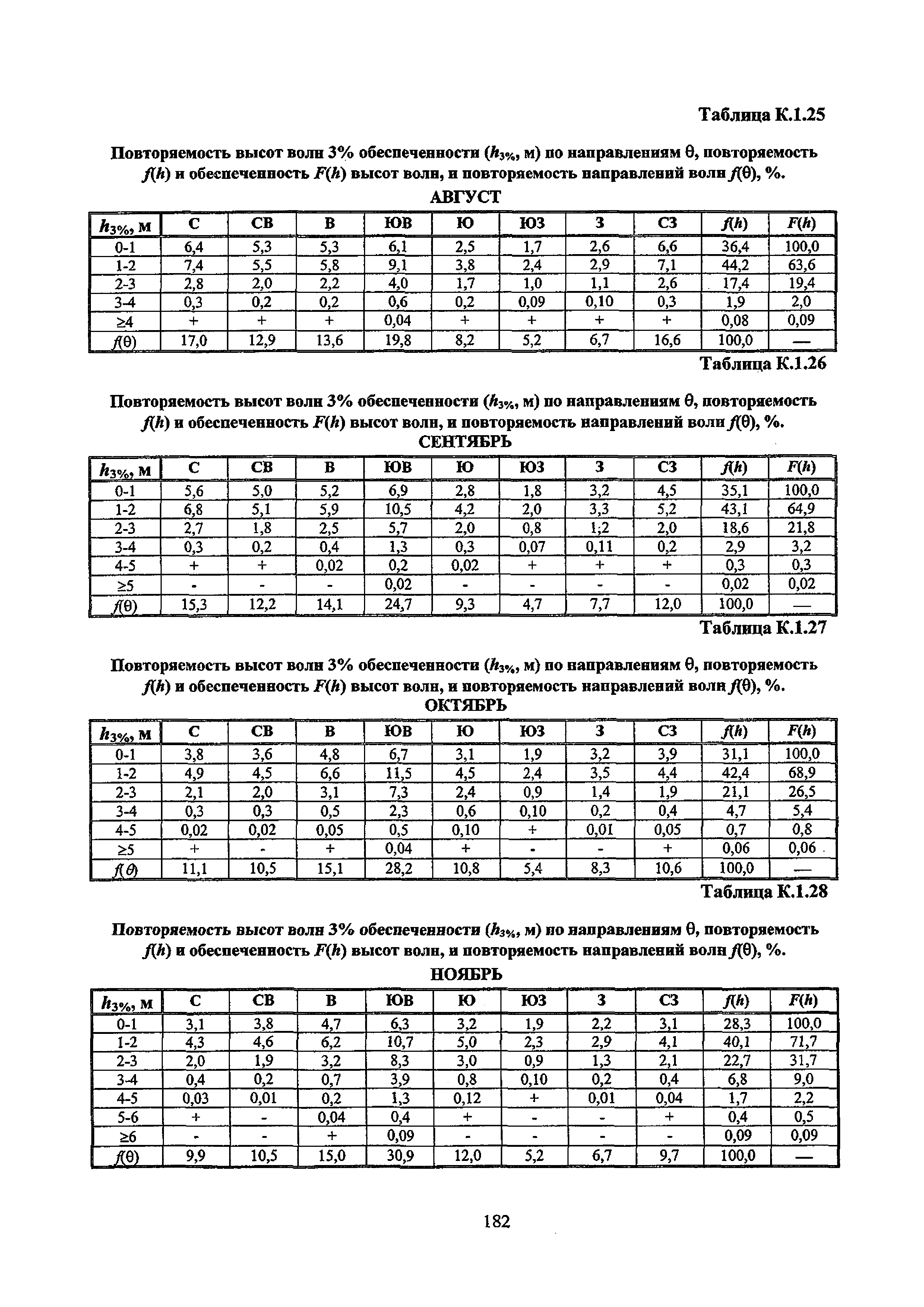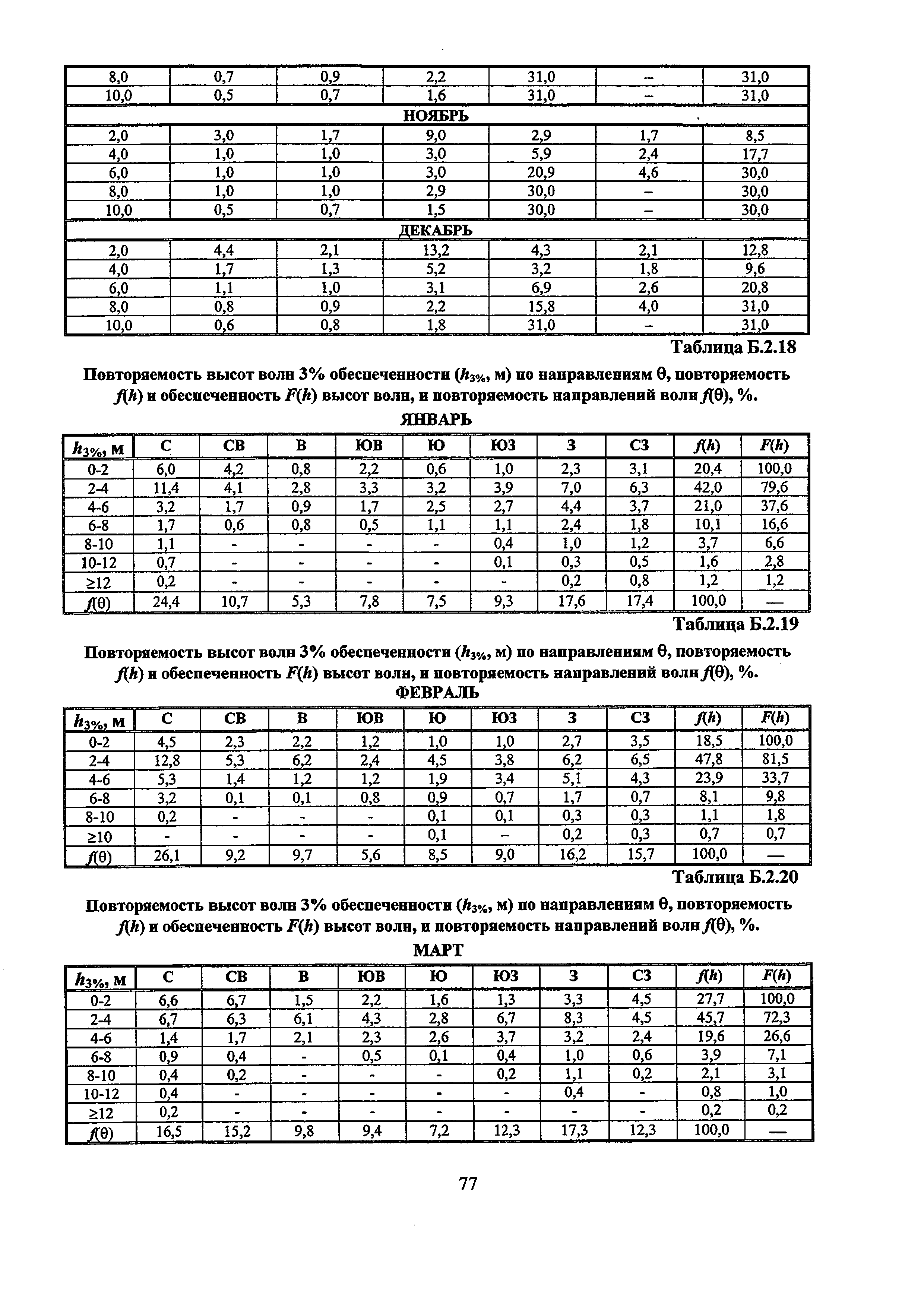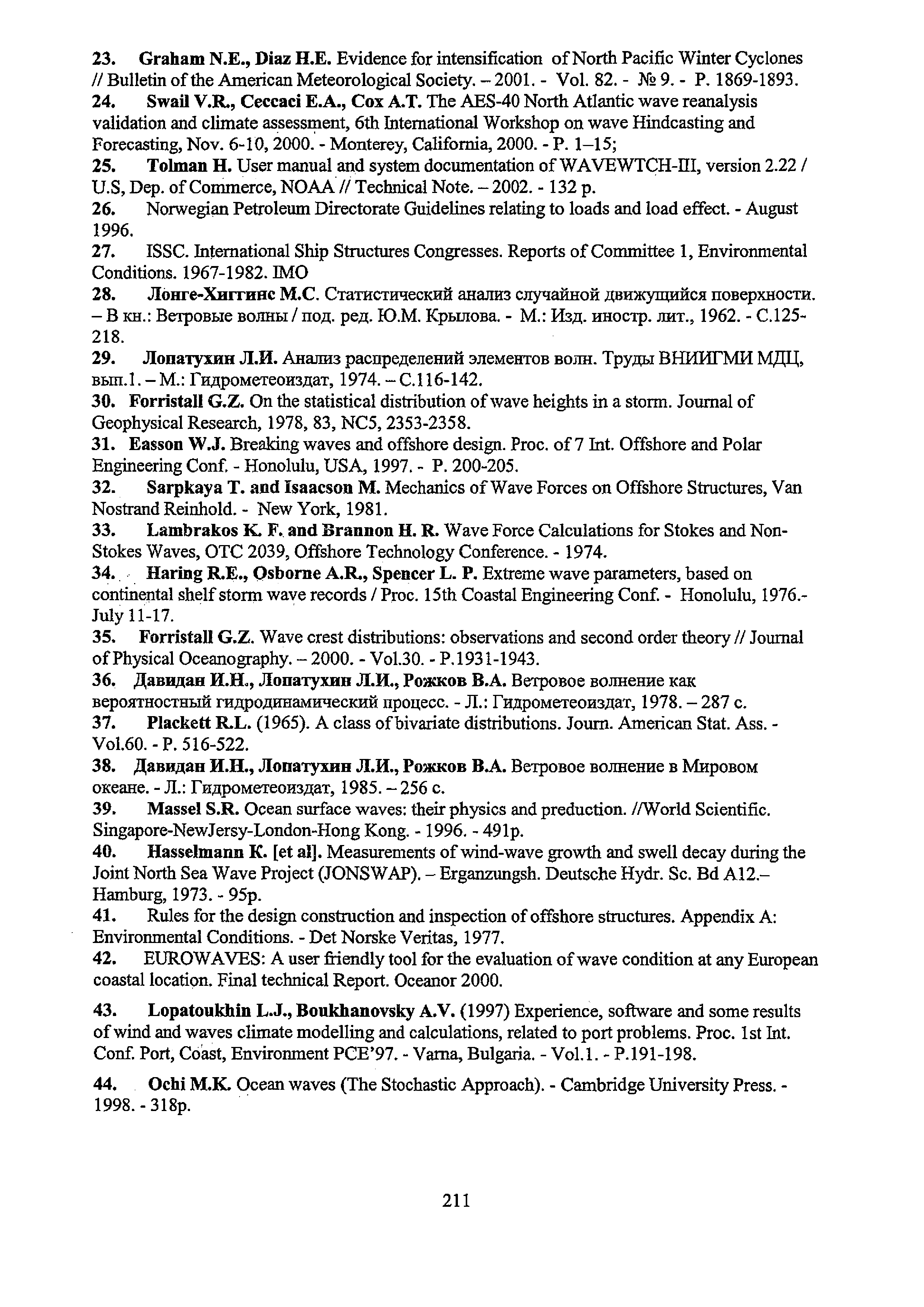 Справочные данные по режиму ветра и волнения Баренцева, Охотского и Каспийского морей| Статус: | взамен | | Название рус.: | Справочные данные по режиму ветра и волнения Баренцева, Охотского и Каспийского морей | | Дата добавления в базу: | 05.05.2017 | | Дата актуализации: | 01.01.2021 | | Область применения: | Справочные данные по режиму ветра и волнения Баренцева, Охотского и Каспийского морей содержат методику расчетов и сведения, необходимые для правильной классификации судов по районам плаваний при разработке норм и правил Российского морского регистра судоходства, для проектирования судов и сооружений, оценки условий плавания, планирования работ в открытом море и на шельфе, а также для решения других вопросов, связанных с судоходством. | | Оглавление: | Часть 1. Методы расчета режима ветра и волнения Введение 1 Краткая характеристика справочных данных по режиму ветра и волнения Баренцева, Охотского и Каспийского морей в соответствии с требованиями Российского морского регистра судоходства 2 Подходы к созданию нового поколения справочных данных по режиму ветра и волнения 2.1 Гидродинамические модели, используемые при расчетах ветра и волнения на морях и океанах 2.2 Проверка соответствия результатов модельных расчетов данным измерений 3 Особенности временной структуры ветра 4 Основные расчетные параметры волнения 4.1 Высоты видимых волн 4.2 Периоды и длины видимых волн 4.3 Высоты гребней волн 4.4 Совместное распределение высот и периодов волн 4.5 Спектральные характеристики волнения 5 Волновой климат (Режимные характеристика волнения) 5.1 Оперативные статистики 5.2 Экстремальные статистики волн Часть 2. Справочные данные по режиму ветра и волнения Баренцева, Охотского и Каспийского морей 1 Баренцево море 2 Охотское море 3 Каспийское море Литература | | Разработан: | Государственный океанографический институт Госкомгидромета Российский морской регистр судоходства СПбГУ