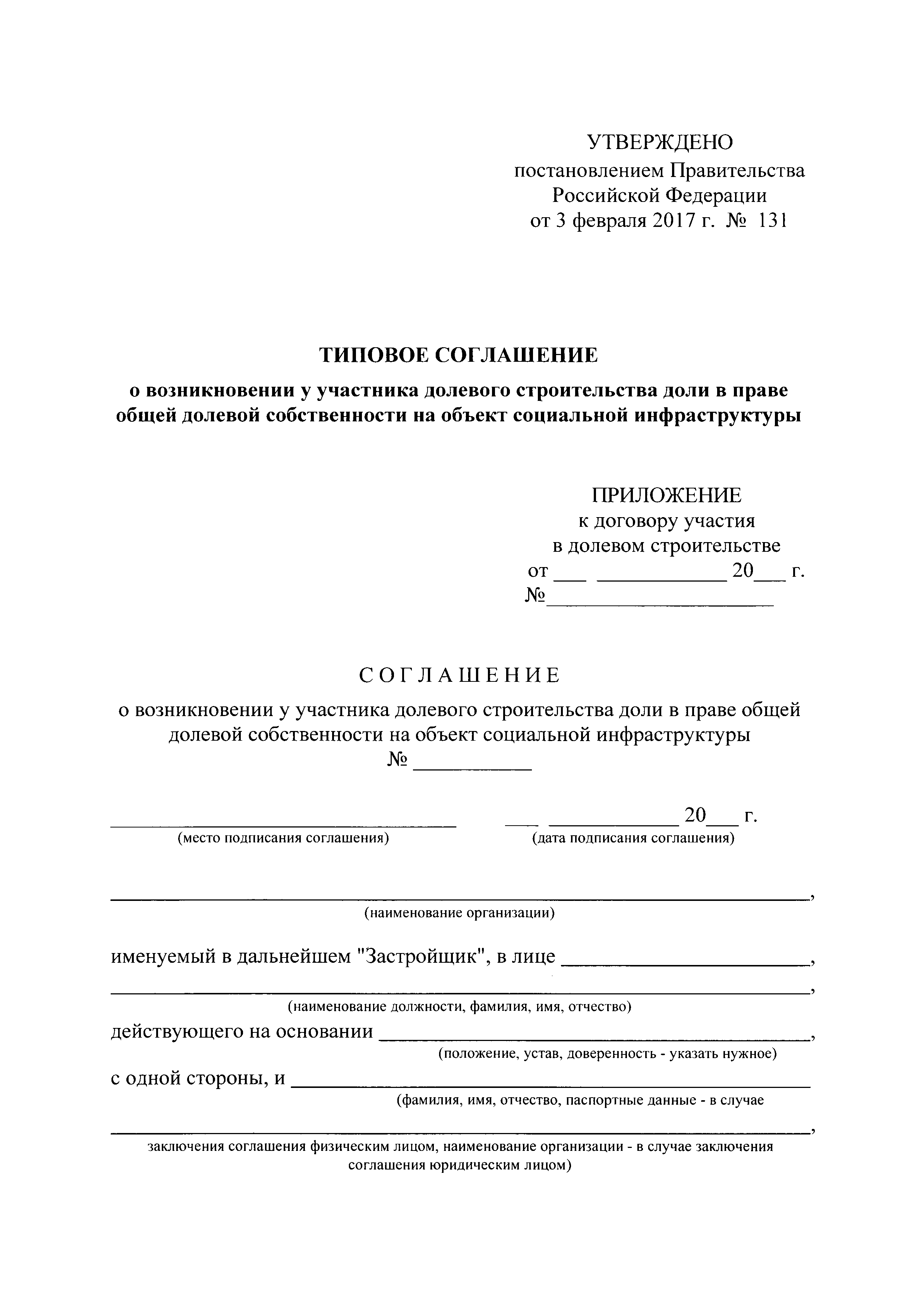 | Название рус.: | Типовое соглашение о возникновении у участника долевого строительства доли в праве общей долевой собственности на объект социальной инфраструктуры |