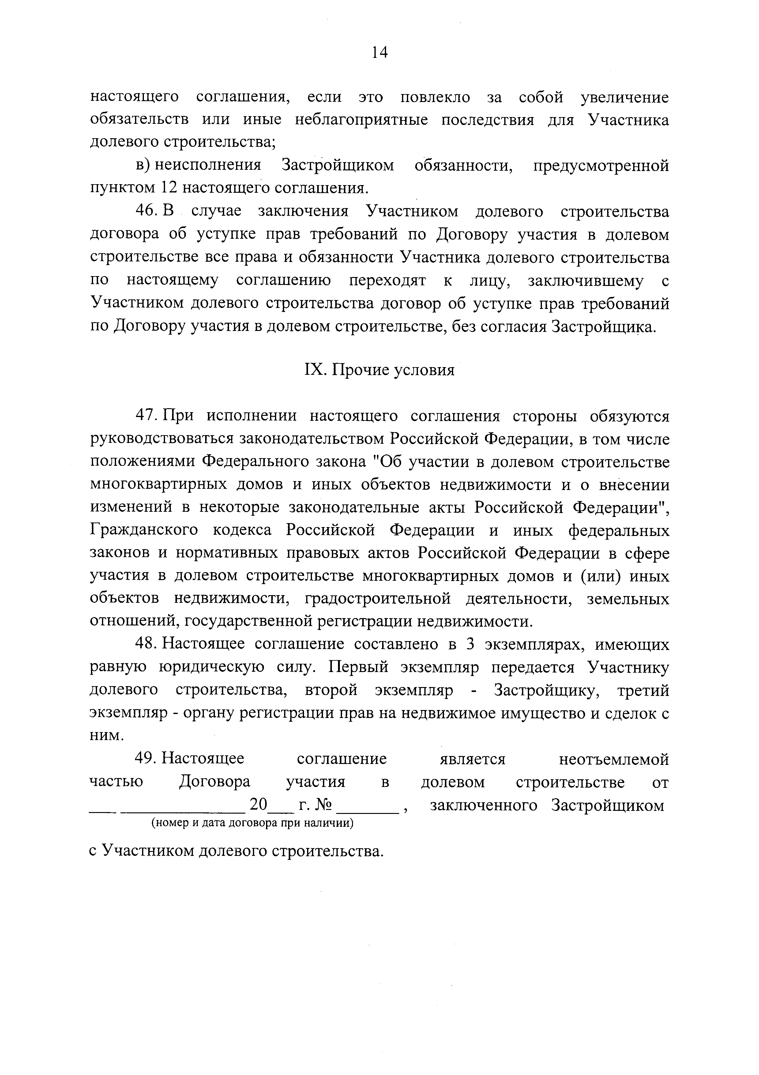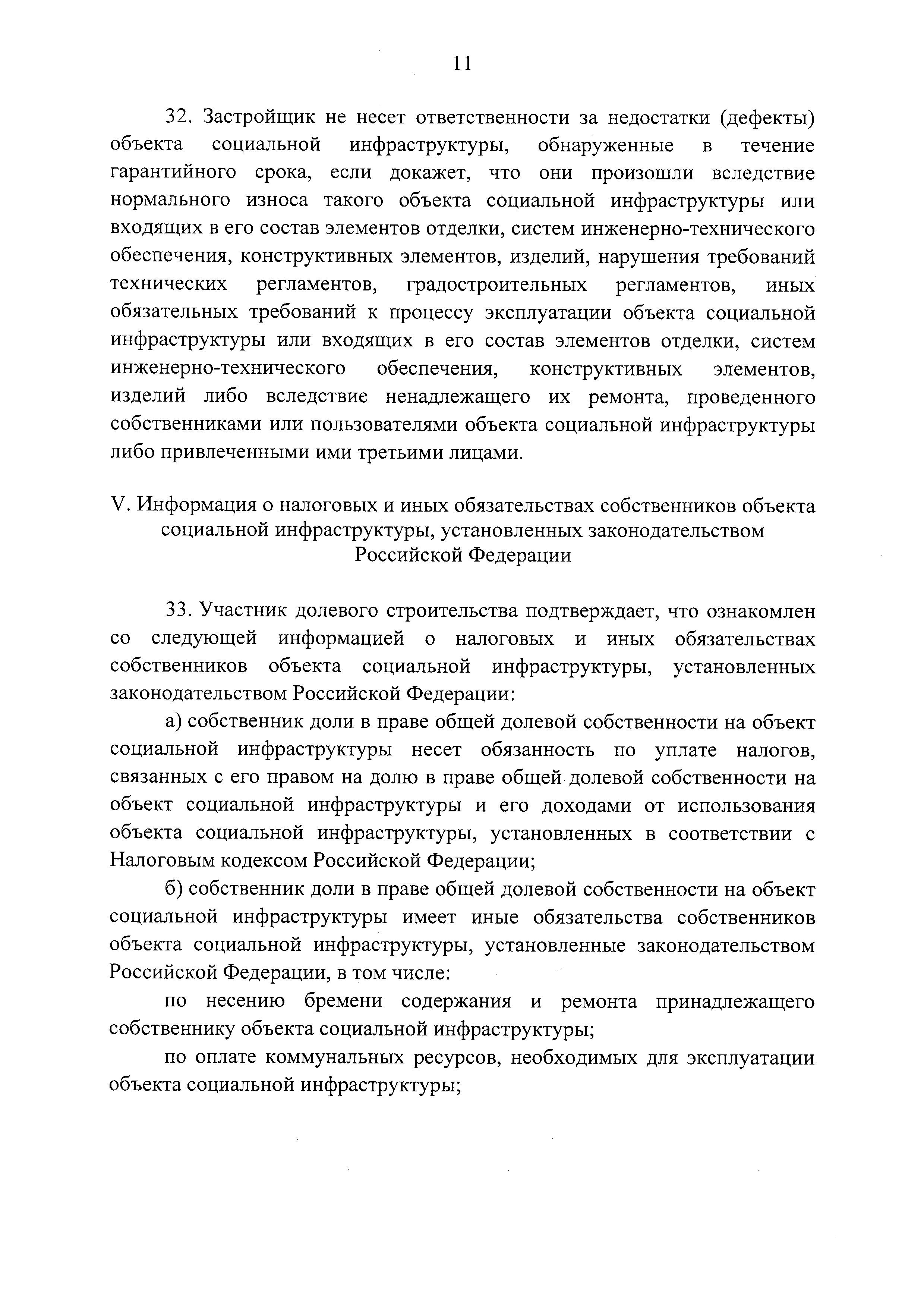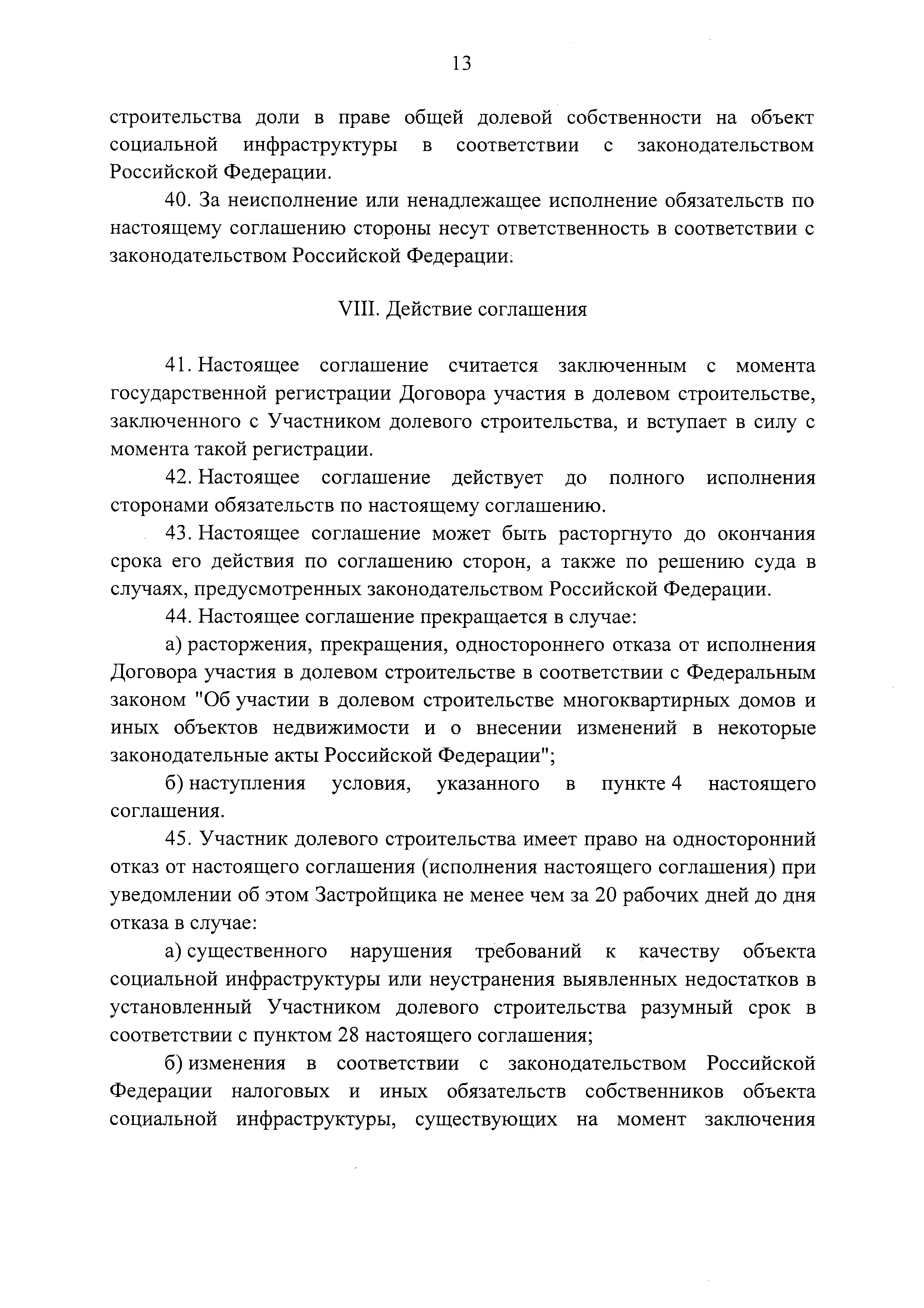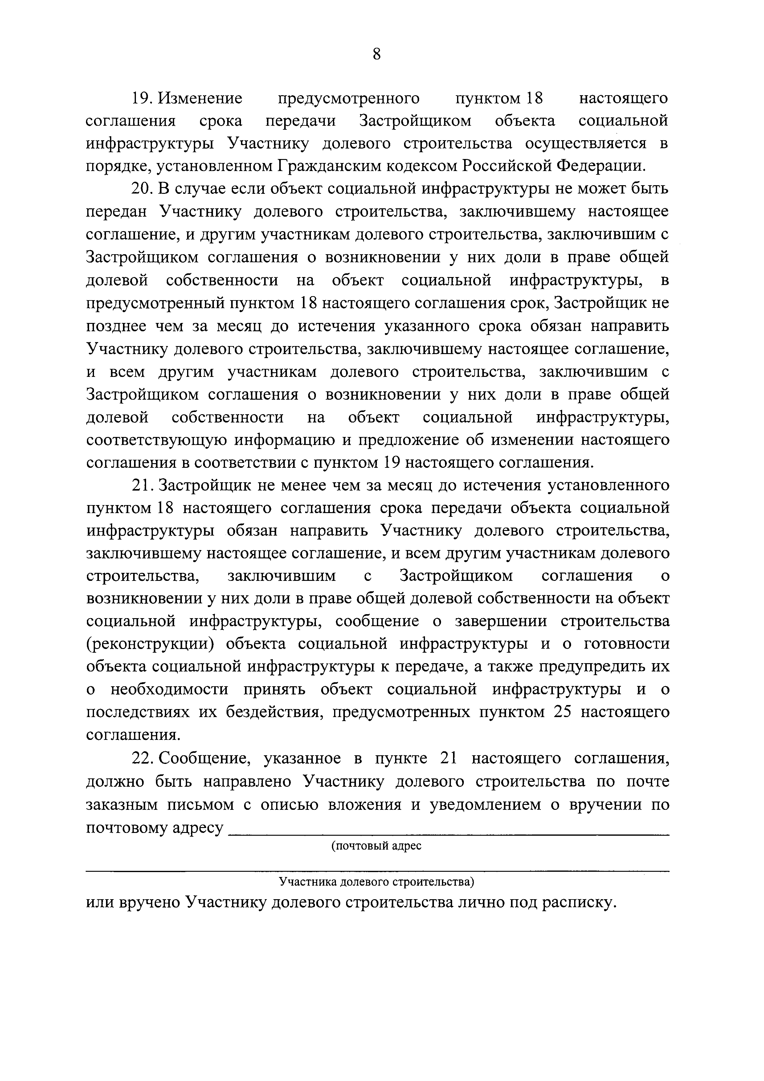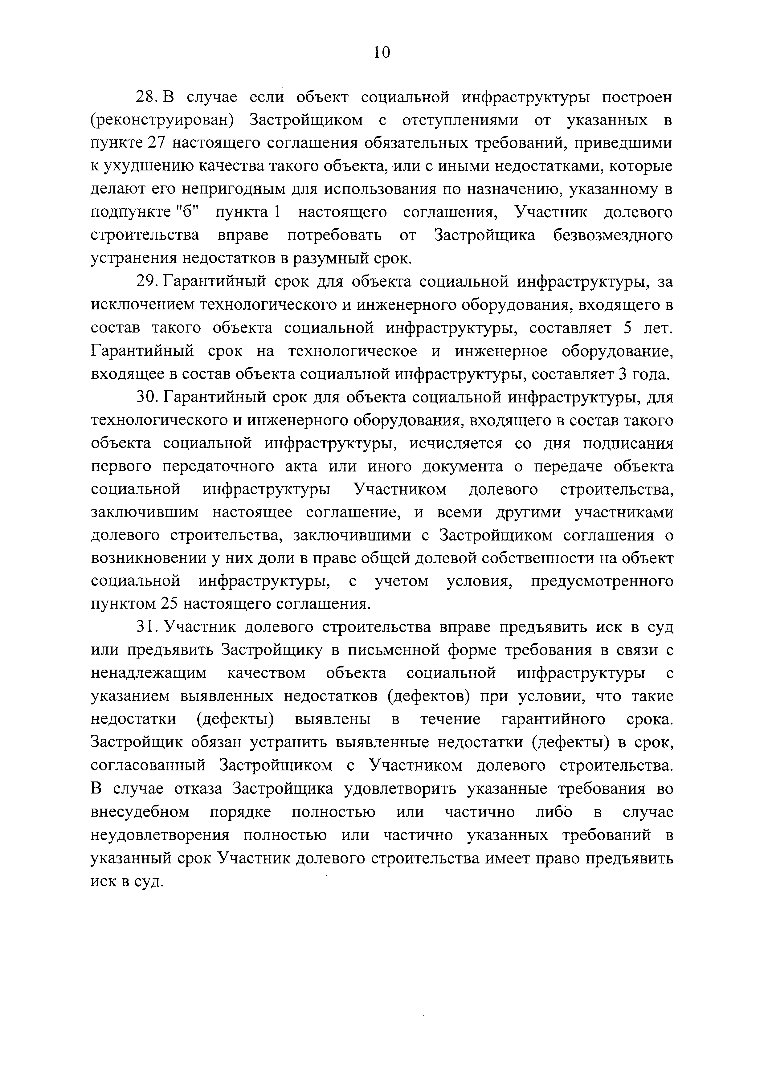 | Оглавление: | I. Предмет соглашения II. Условия и порядок исполнения соглашения III. Порядок и срок передачи объекта социальной инфраструктуры IV. Гарантии качества объекта социальной инфраструктуры V. Информация о налоговых и иных обязательствах собственников объекта социальной инфраструктуры, установленных законодательством Российской Федерации VI. Порядок урегулирования разногласий, возникающих между сторонами VII. Ответственность сторон VIII. Действие соглашения IX. Прочие условия |