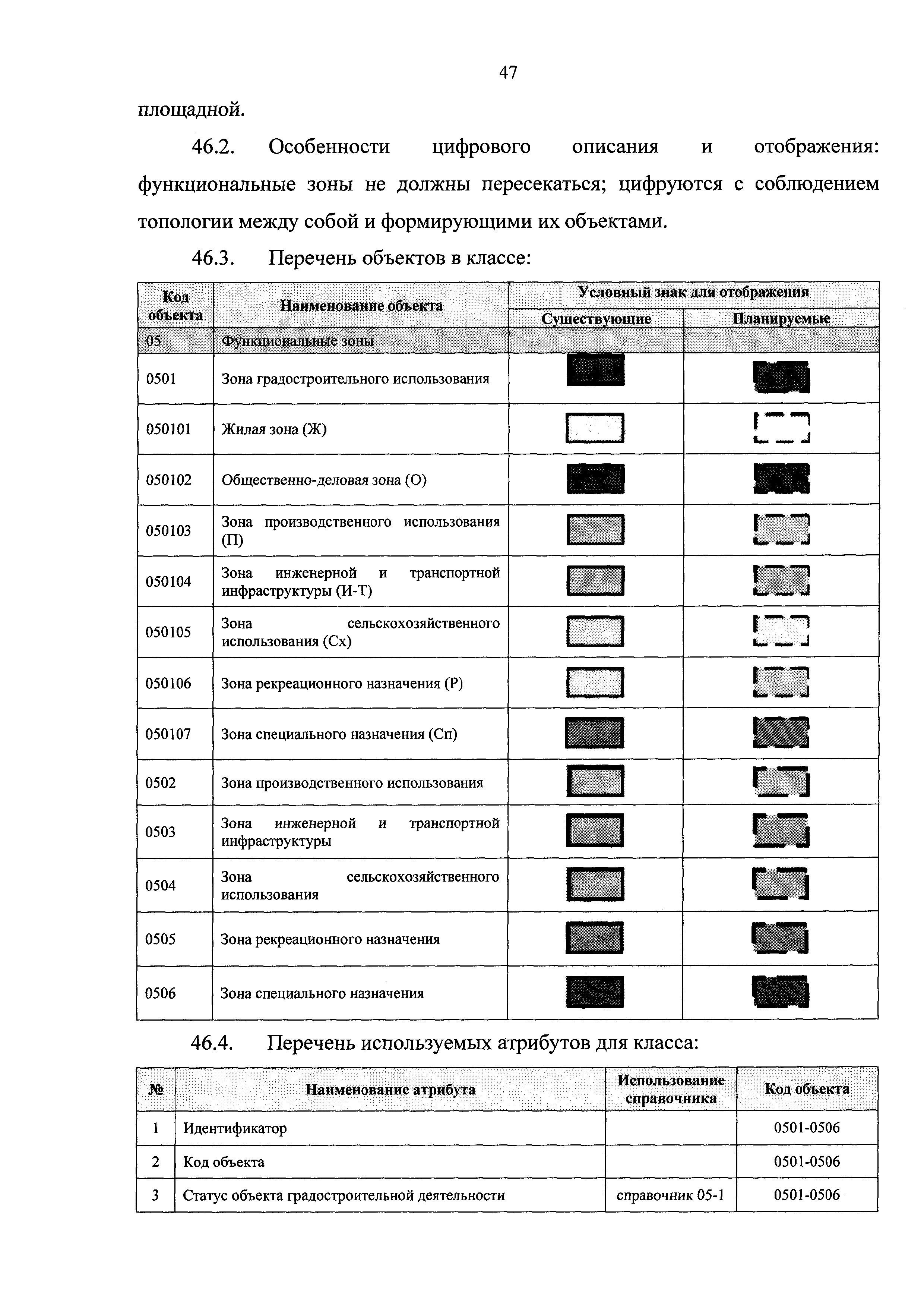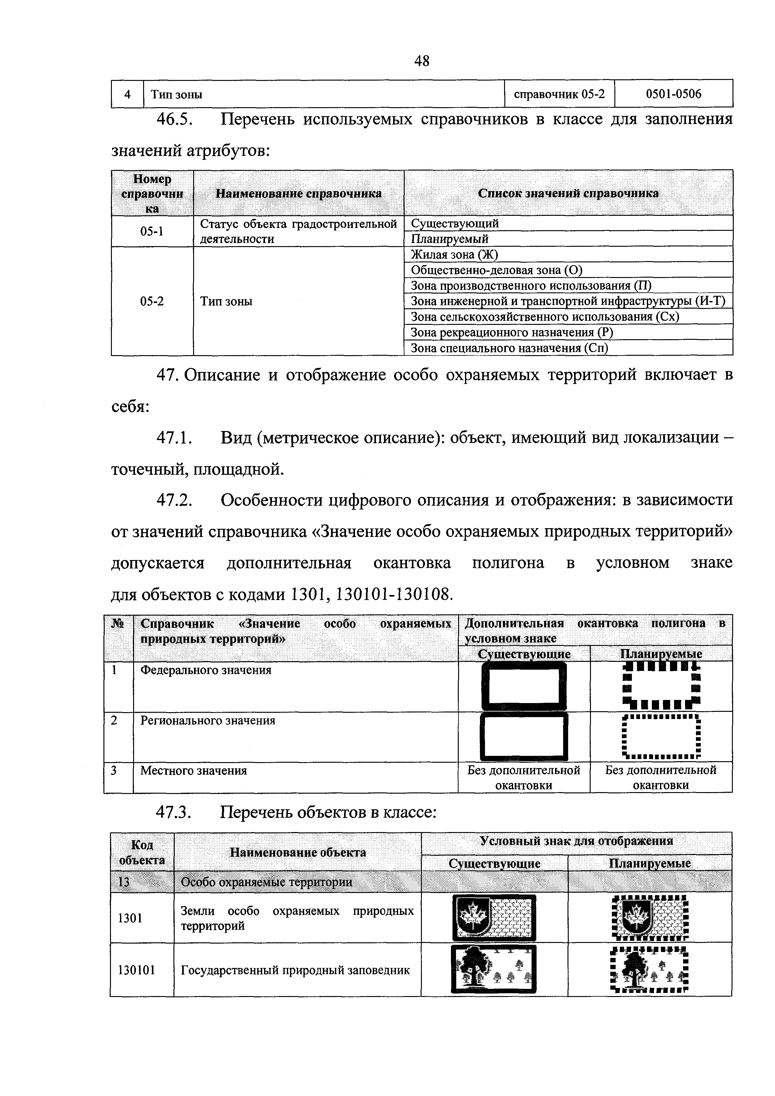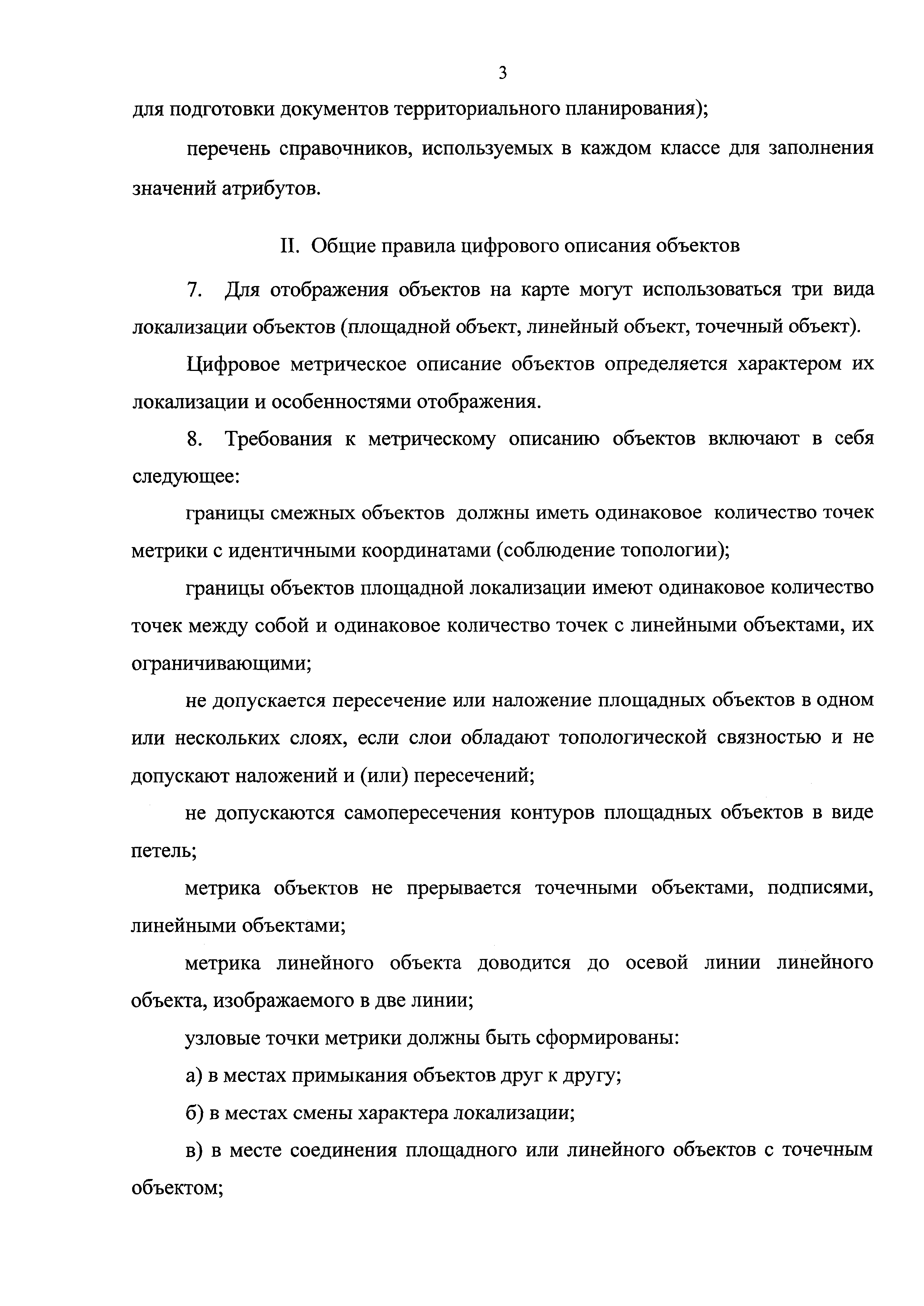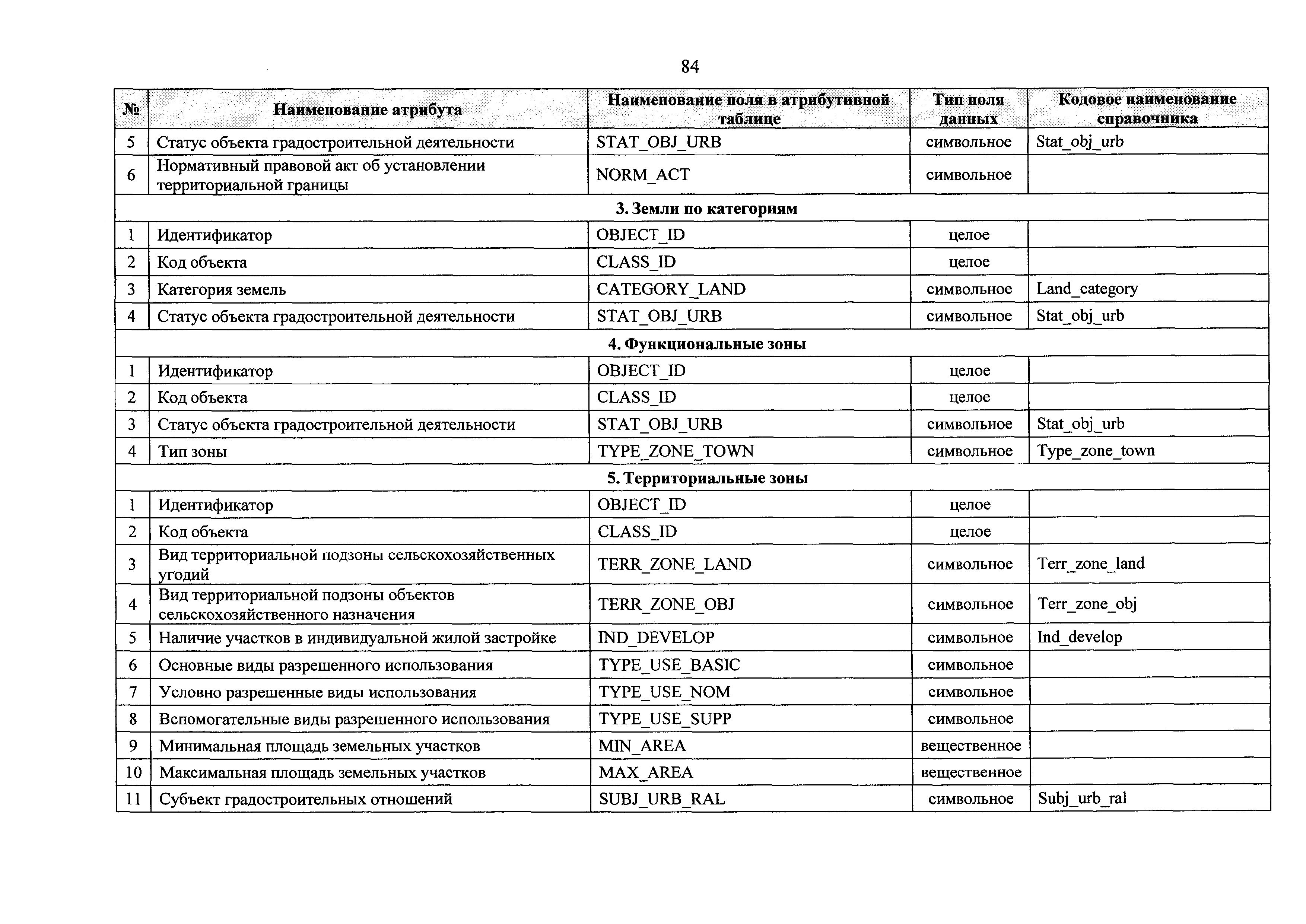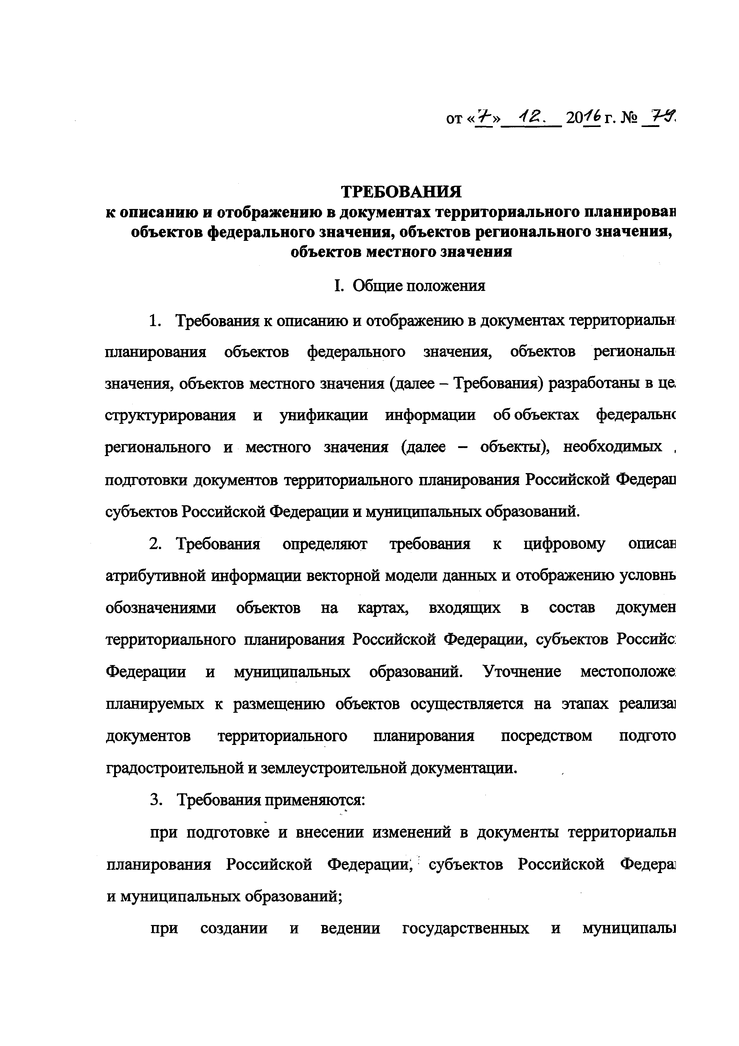Требования к описанию и отображению в документах территориального планирования объектов федерального значения, объектов регионального значения, объектов местного значения| Статус: | утратил силу | | Название рус.: | Требования к описанию и отображению в документах территориального планирования объектов федерального значения, объектов регионального значения, объектов местного значения | | Дата добавления в базу: | 05.05.2017 | | Дата актуализации: | 01.01.2021 | | Дата введения: | 20.01.2017 | | Дата окончания срока действия: | 12.02.2018 | | Область применения: | Требования к описанию и отображению в документах территориального планирования объектов федерального значения, объектов регионального значения, объектов местного значения разработаны в целях структурирования и унификации информации об объектах федерального, регионального и местного значения, необходимых для подготовки документов территориального планирования Российской Федерации, субъектов Российской Федерации и муниципальных образований | | Оглавление: | I. Общие положения II. Общие правила цифрового описания объектов III. Правила цифрового описания площадных объектов IV. Правила цифрового описания линейных объектов V. Правила цифрового описания точечных объектов VI. Правила атрибутивного (семантического) описания объектов VII. Правила цифрового описания подписей VIII. Требования к описанию и отображению объектов капитального строительства IX. Требования к описанию и отображению иных объектов X. Требования к описанию и отображению территорий XI. Перечень слоев пространственных данных XII. Структура атрибутивных данных XIII. Справочники (перечень текстовых значений атрибутов) | | Утверждён: | 07.12.2016 Министерство экономического развития РФ (793)