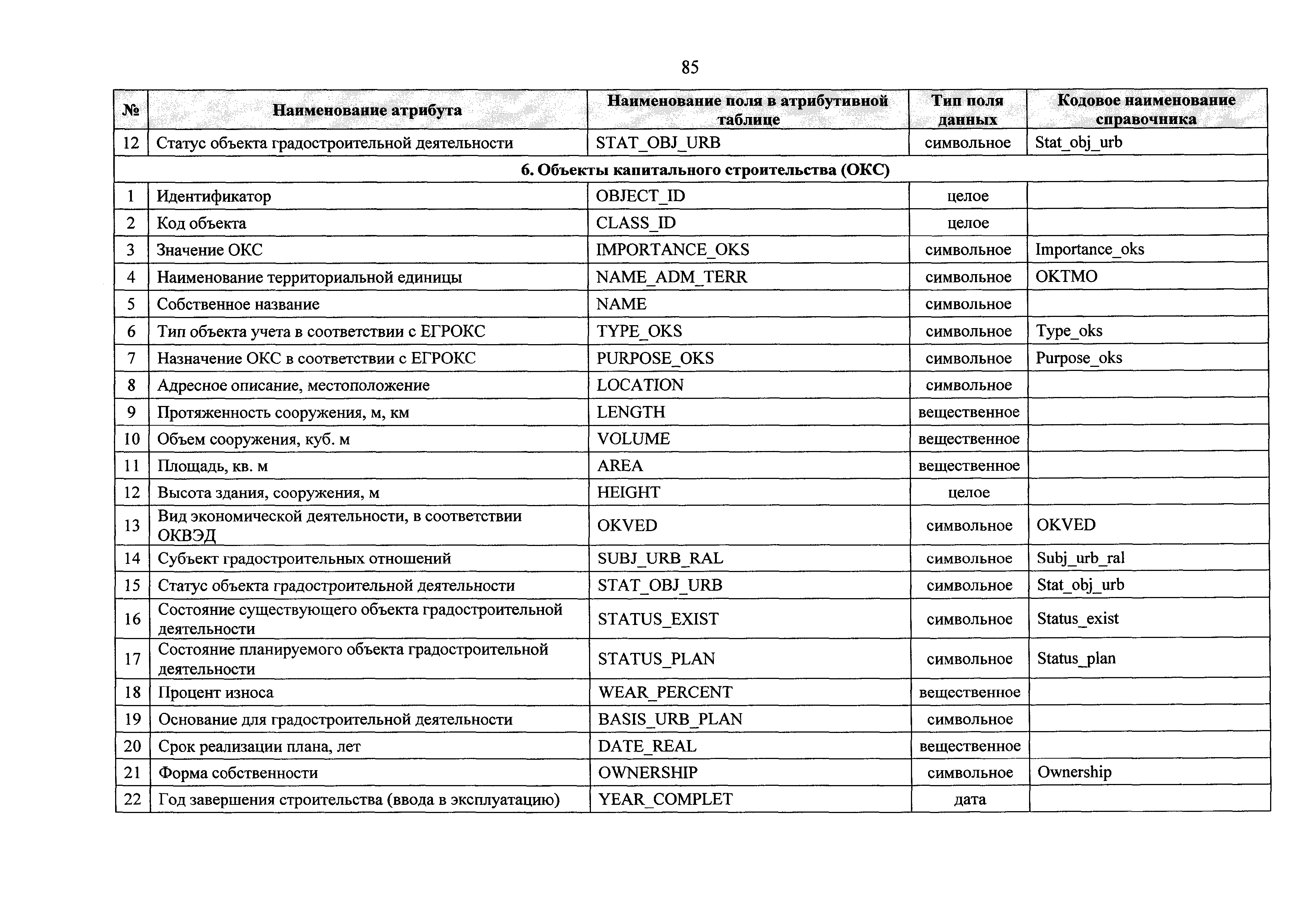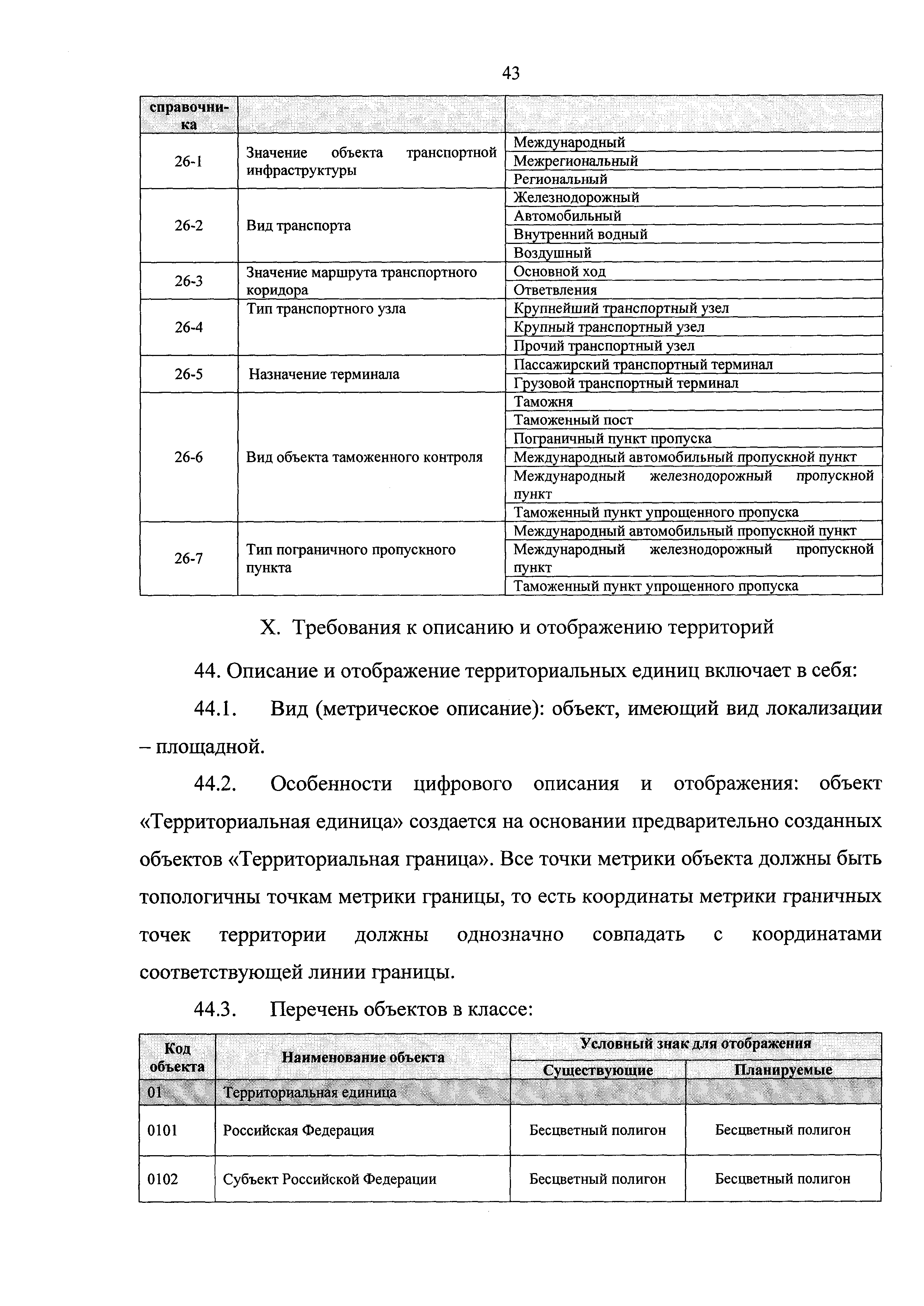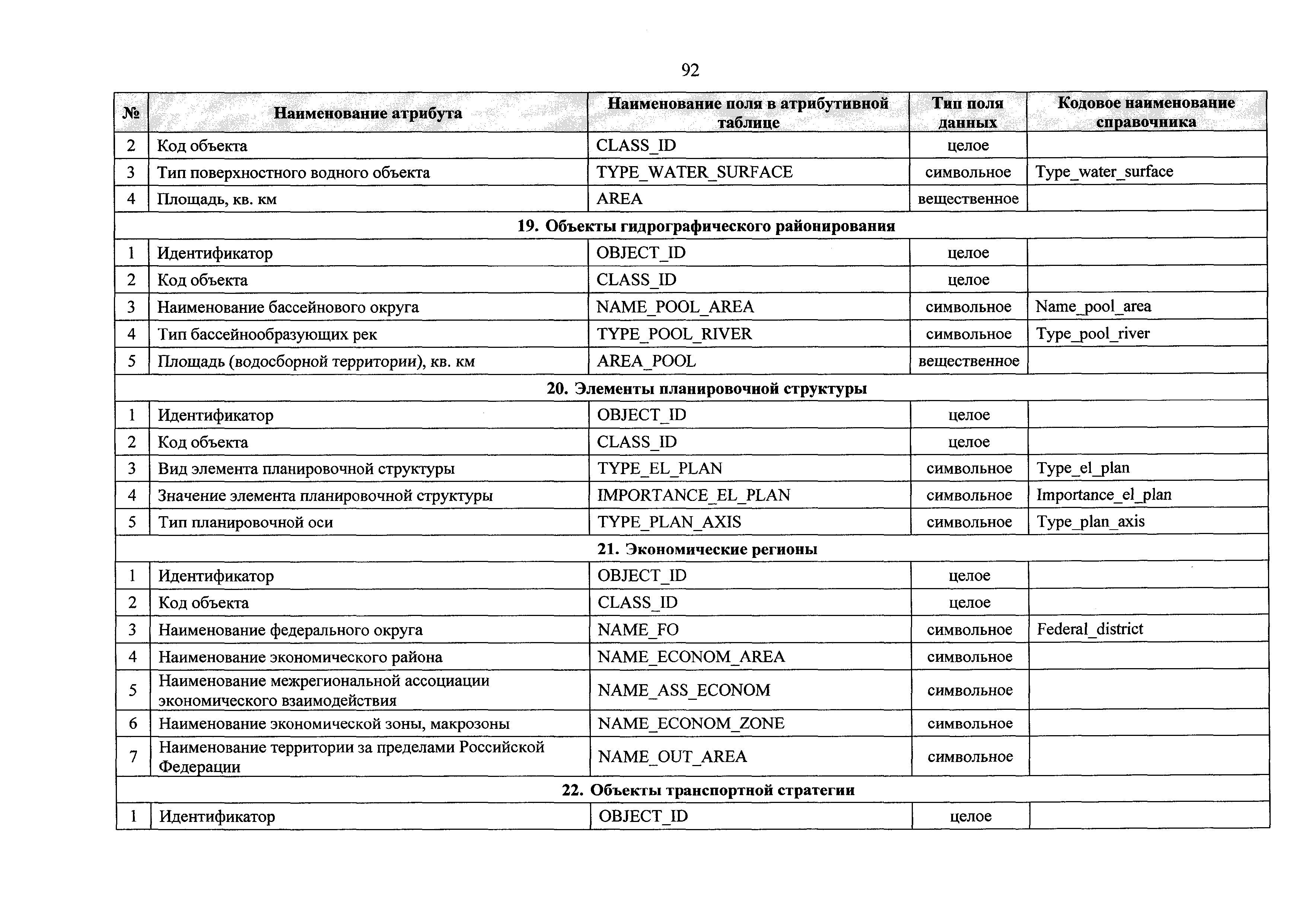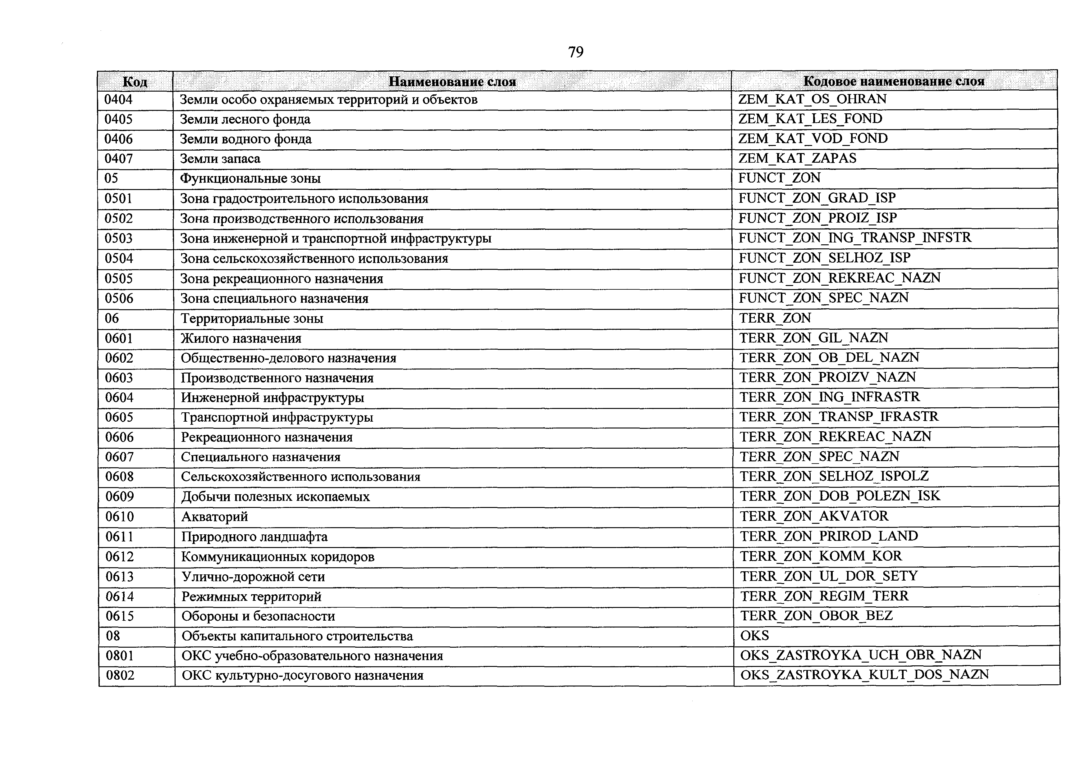 Требования к описанию и отображению в документах территориального планирования объектов федерального значения, объектов регионального значения, объектов местного значения| Статус: | утратил силу | | Название рус.: | Требования к описанию и отображению в документах территориального планирования объектов федерального значения, объектов регионального значения, объектов местного значения | | Дата добавления в базу: | 05.05.2017 | | Дата актуализации: | 01.01.2021 | | Дата введения: | 20.01.2017 | | Дата окончания срока действия: | 12.02.2018 | | Область применения: | Требования к описанию и отображению в документах территориального планирования объектов федерального значения, объектов регионального значения, объектов местного значения разработаны в целях структурирования и унификации информации об объектах федерального, регионального и местного значения, необходимых для подготовки документов территориального планирования Российской Федерации, субъектов Российской Федерации и муниципальных образований | | Оглавление: | I. Общие положения II. Общие правила цифрового описания объектов III. Правила цифрового описания площадных объектов IV. Правила цифрового описания линейных объектов V. Правила цифрового описания точечных объектов VI. Правила атрибутивного (семантического) описания объектов VII. Правила цифрового описания подписей VIII. Требования к описанию и отображению объектов капитального строительства IX. Требования к описанию и отображению иных объектов X. Требования к описанию и отображению территорий XI. Перечень слоев пространственных данных XII. Структура атрибутивных данных XIII. Справочники (перечень текстовых значений атрибутов) | | Утверждён: | 07.12.2016 Министерство экономического развития РФ (793)