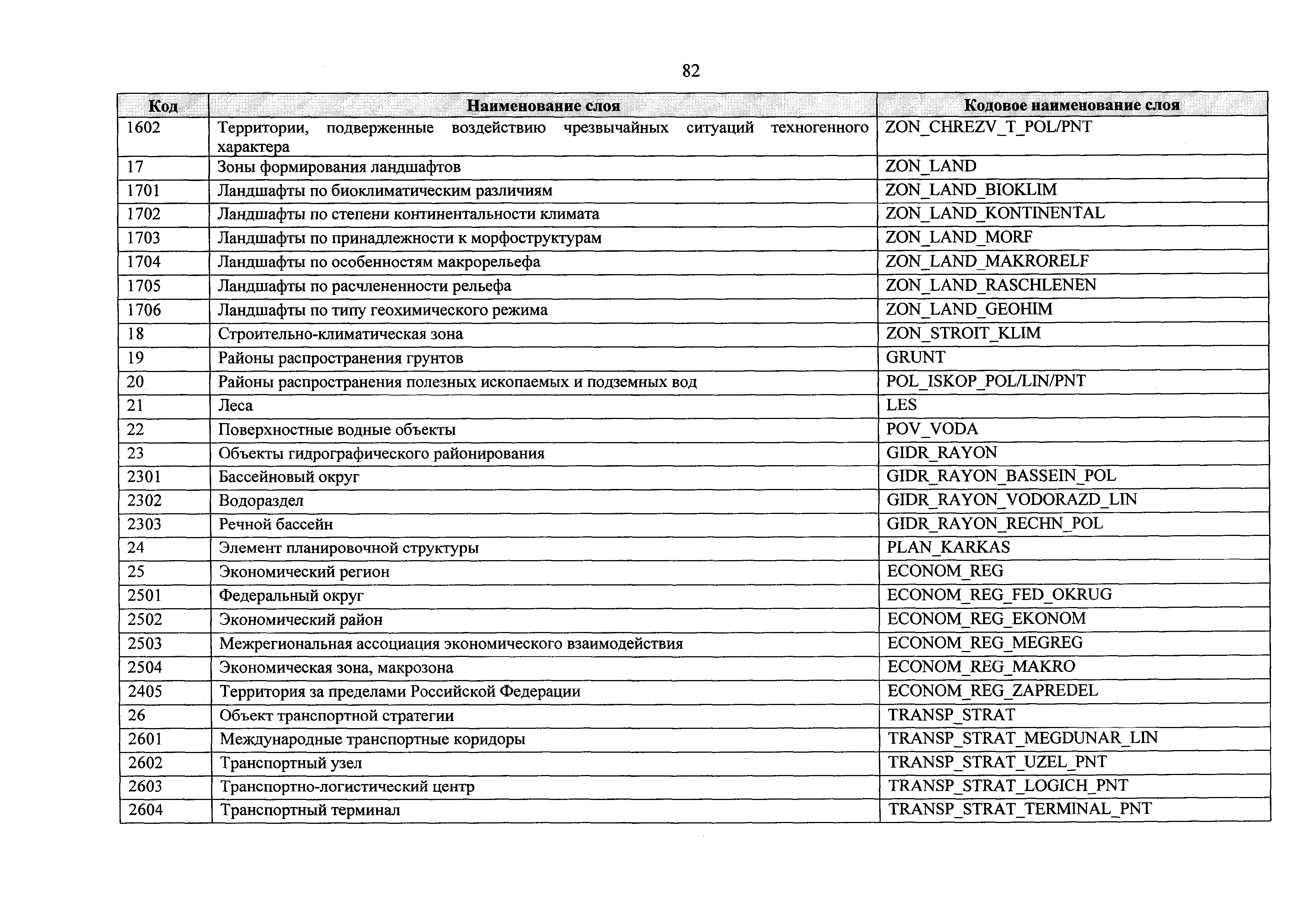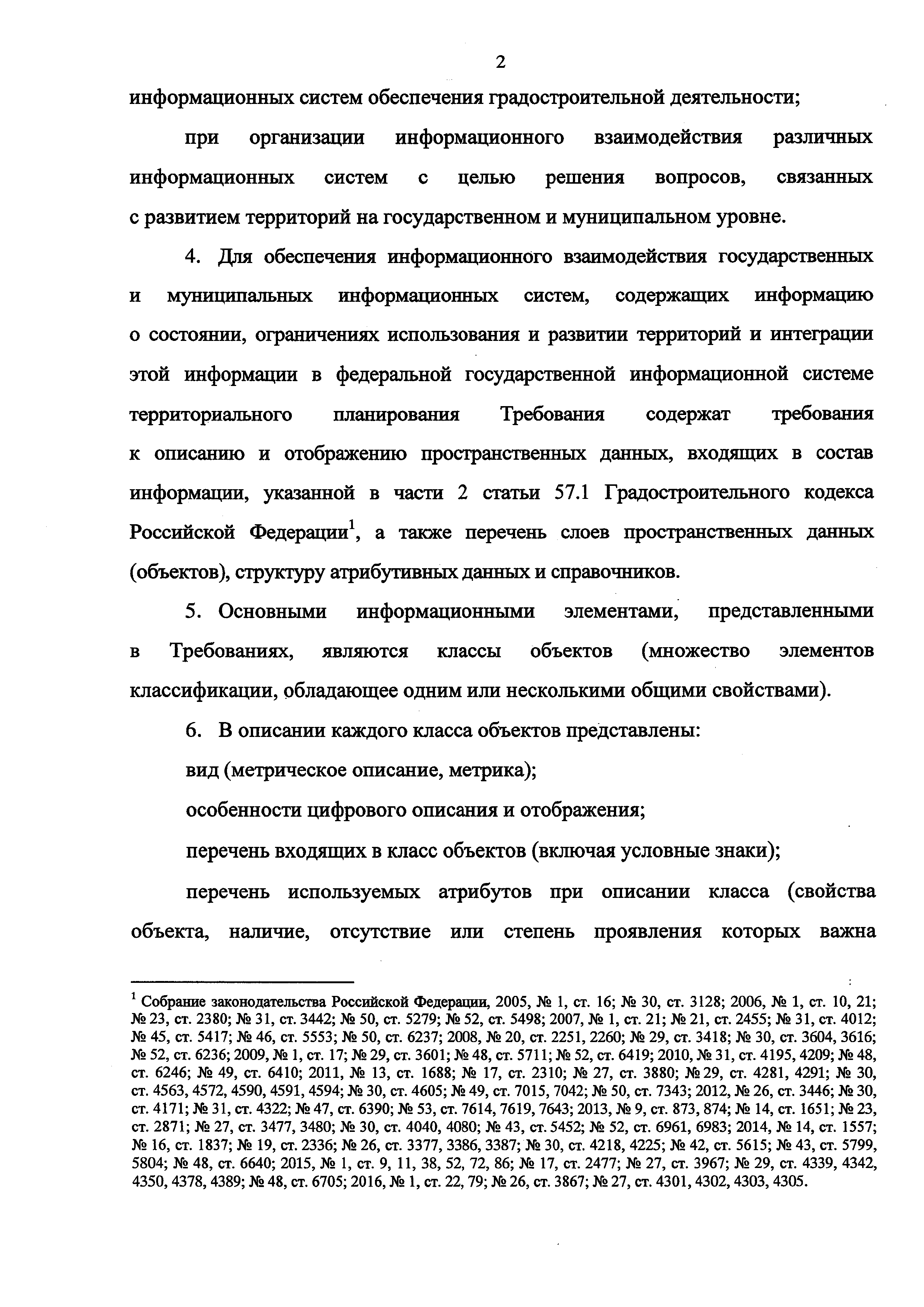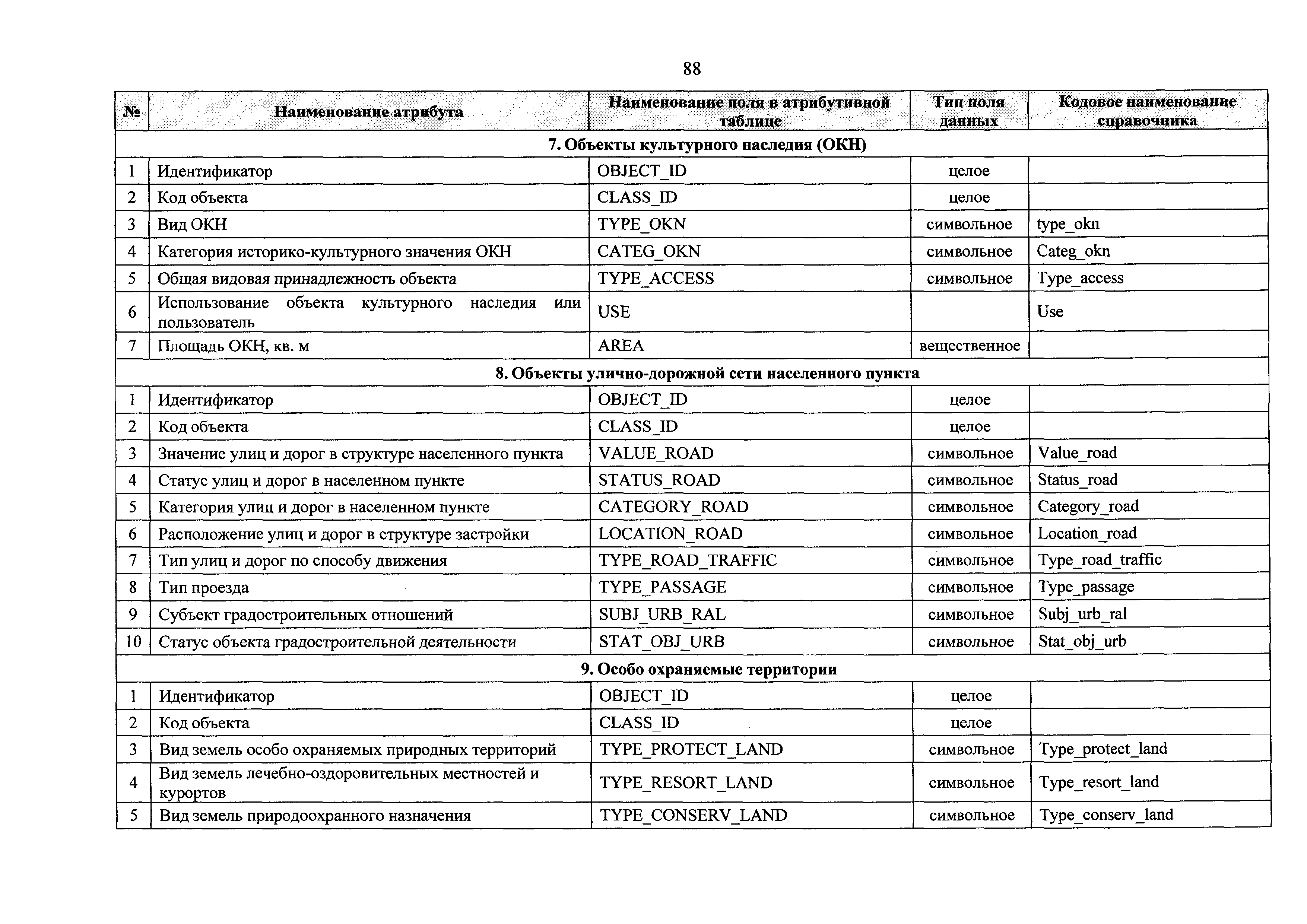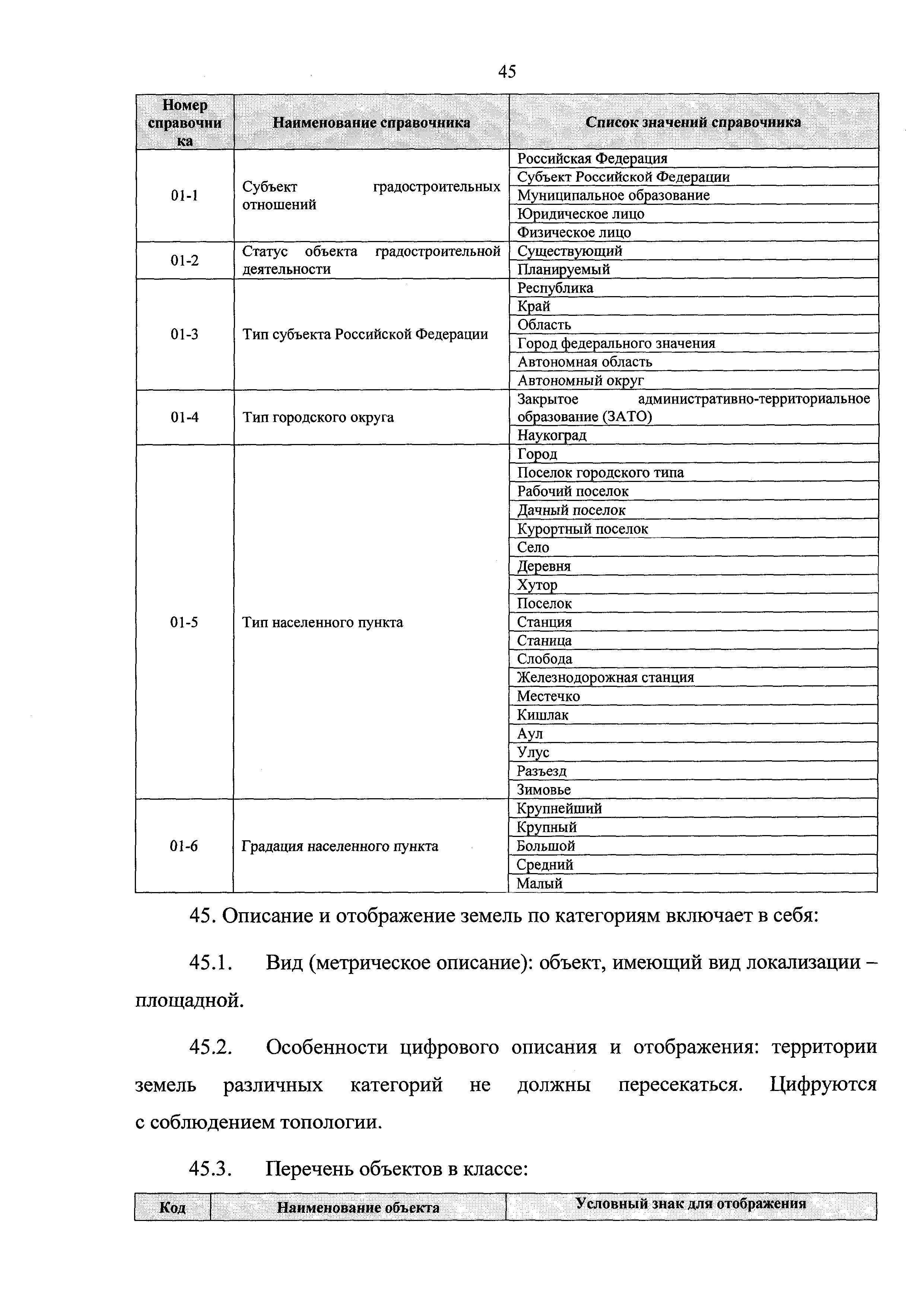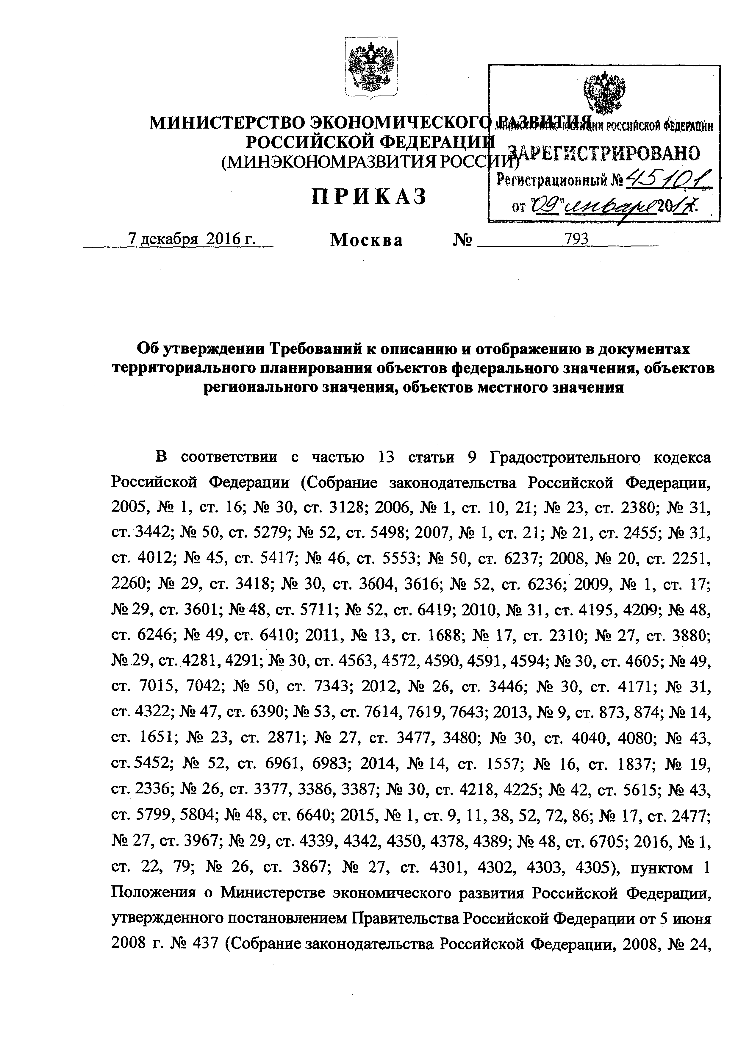 Требования к описанию и отображению в документах территориального планирования объектов федерального значения, объектов регионального значения, объектов местного значения| Статус: | утратил силу | | Название рус.: | Требования к описанию и отображению в документах территориального планирования объектов федерального значения, объектов регионального значения, объектов местного значения | | Дата добавления в базу: | 05.05.2017 | | Дата актуализации: | 01.01.2021 | | Дата введения: | 20.01.2017 | | Дата окончания срока действия: | 12.02.2018 | | Область применения: | Требования к описанию и отображению в документах территориального планирования объектов федерального значения, объектов регионального значения, объектов местного значения разработаны в целях структурирования и унификации информации об объектах федерального, регионального и местного значения, необходимых для подготовки документов территориального планирования Российской Федерации, субъектов Российской Федерации и муниципальных образований | | Оглавление: | I. Общие положения II. Общие правила цифрового описания объектов III. Правила цифрового описания площадных объектов IV. Правила цифрового описания линейных объектов V. Правила цифрового описания точечных объектов VI. Правила атрибутивного (семантического) описания объектов VII. Правила цифрового описания подписей VIII. Требования к описанию и отображению объектов капитального строительства IX. Требования к описанию и отображению иных объектов X. Требования к описанию и отображению территорий XI. Перечень слоев пространственных данных XII. Структура атрибутивных данных XIII. Справочники (перечень текстовых значений атрибутов) | | Утверждён: | 07.12.2016 Министерство экономического развития РФ (793)