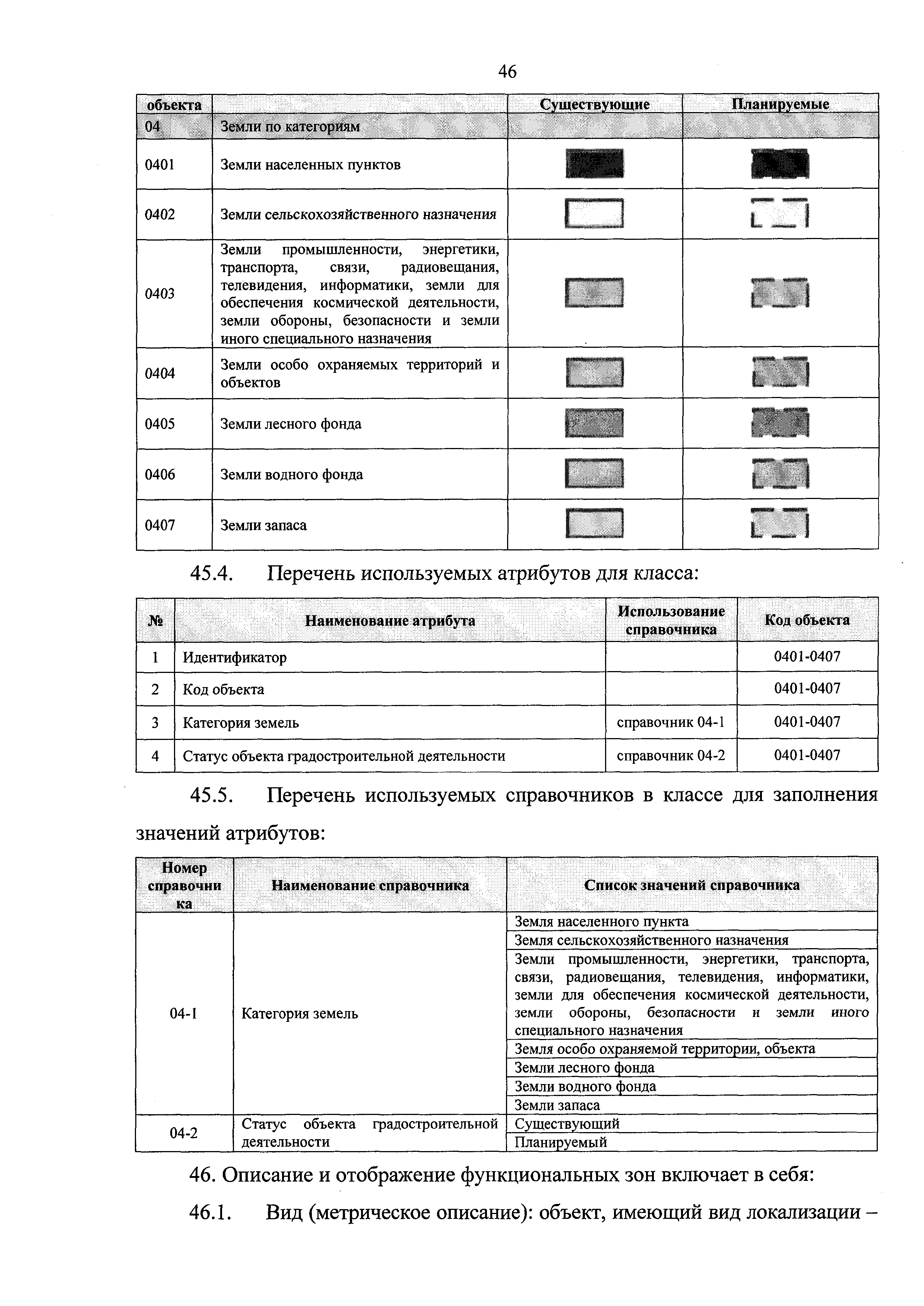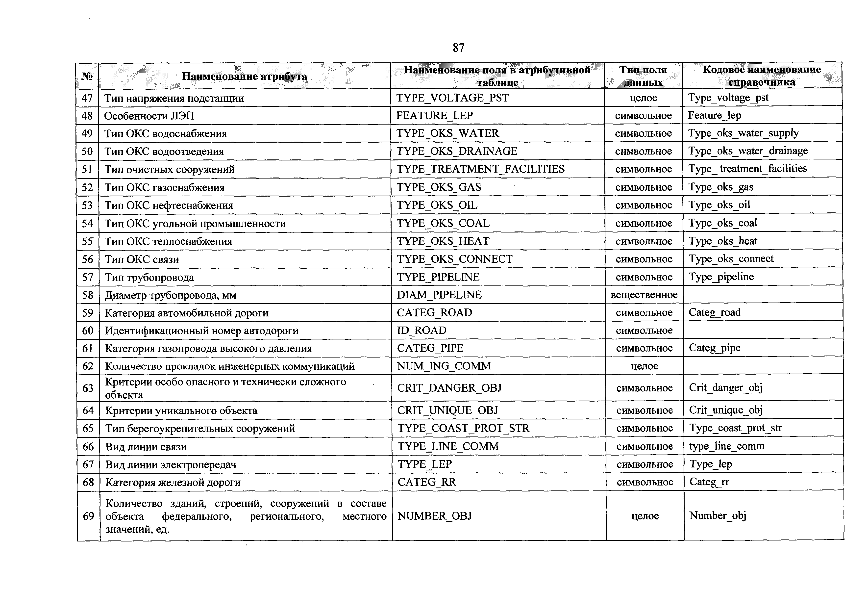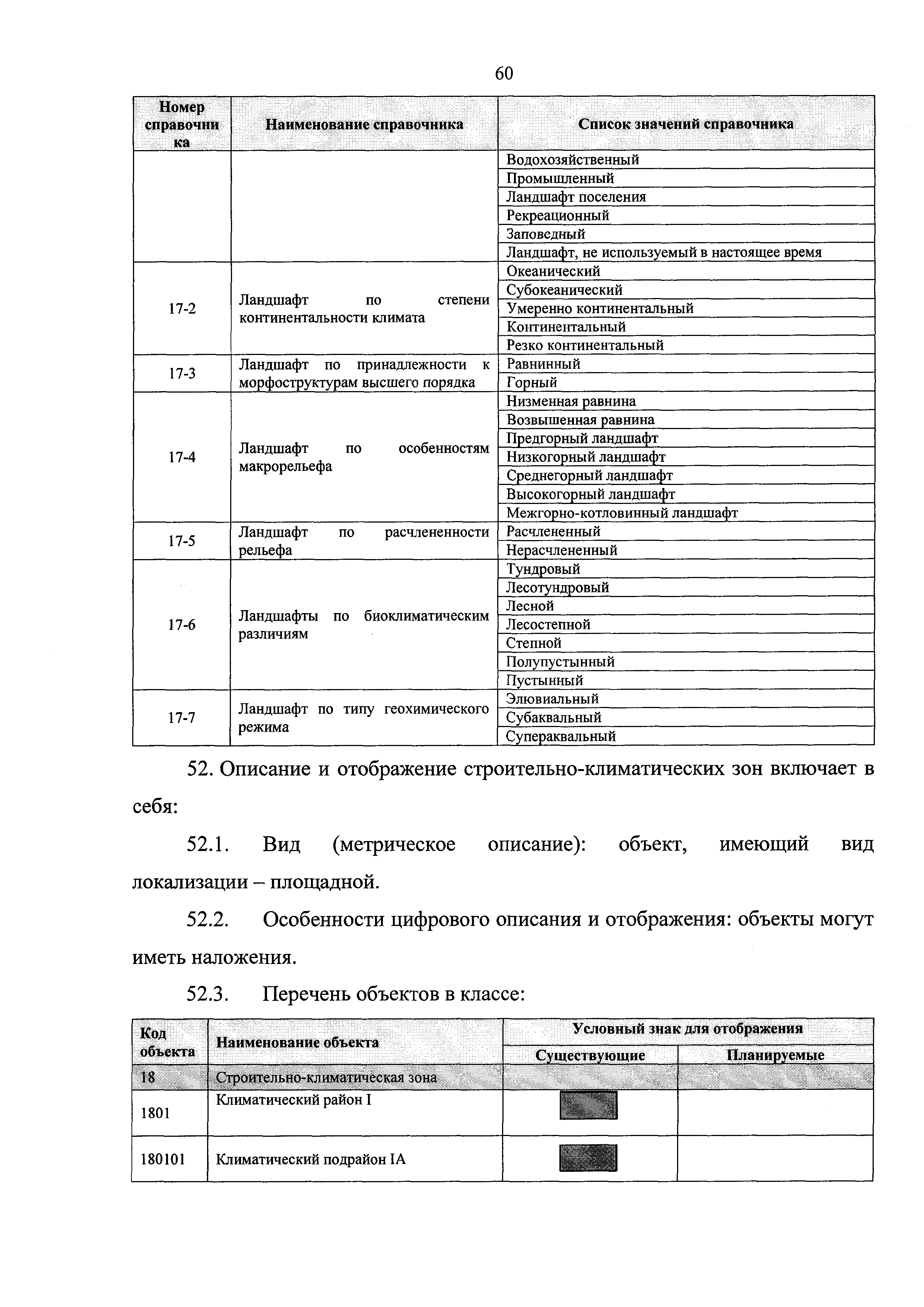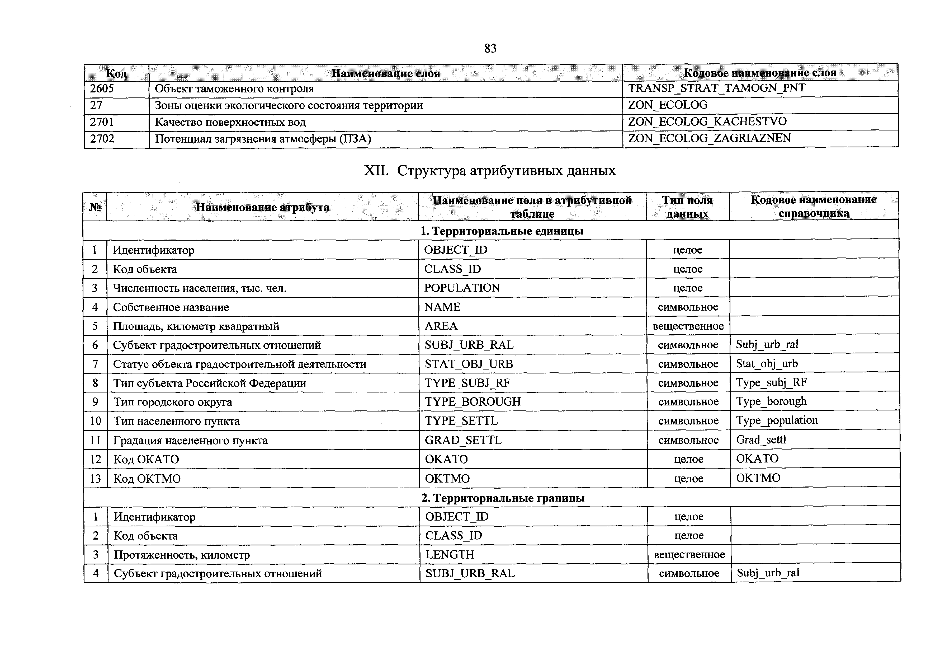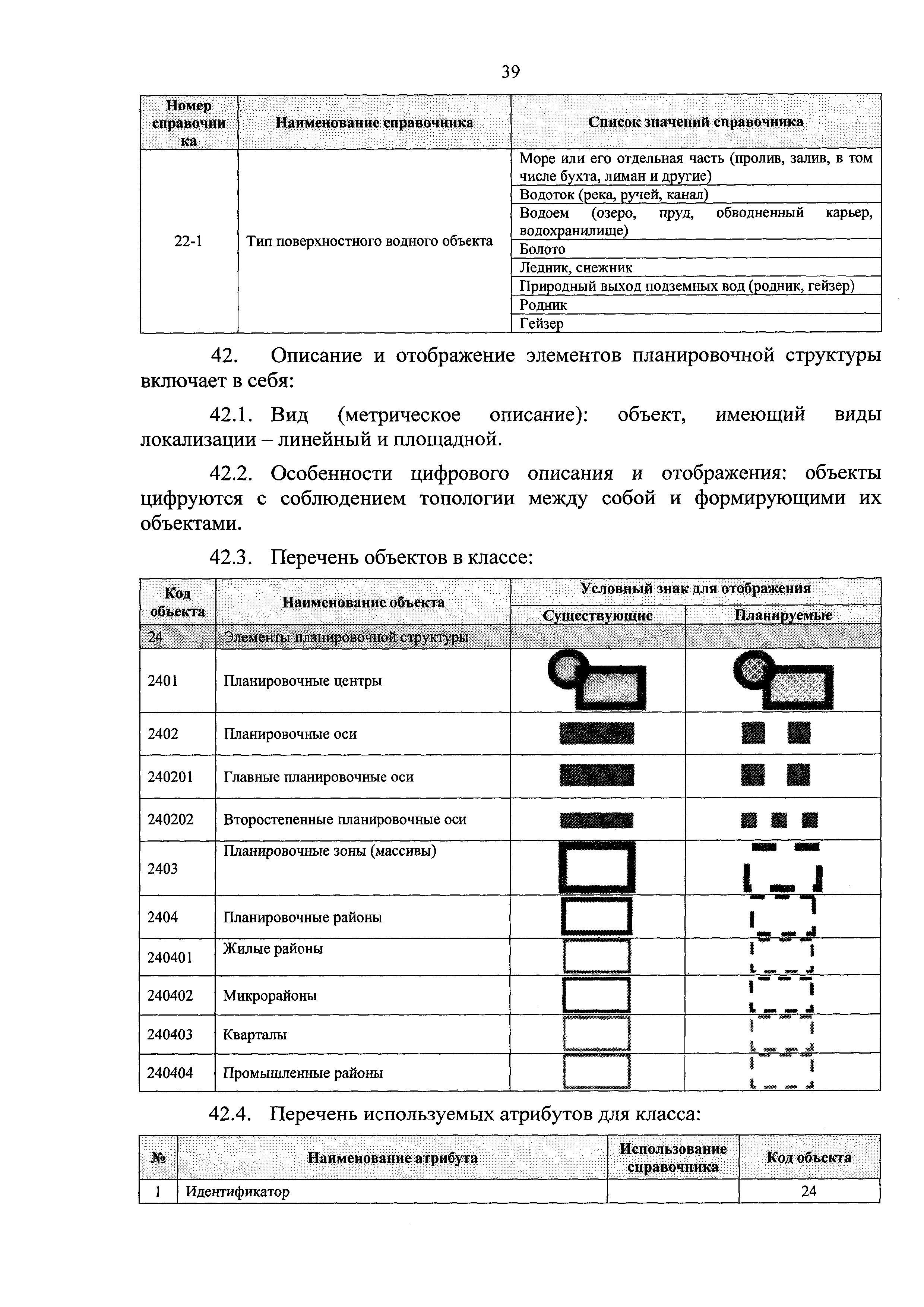 Требования к описанию и отображению в документах территориального планирования объектов федерального значения, объектов регионального значения, объектов местного значения| Статус: | утратил силу | | Название рус.: | Требования к описанию и отображению в документах территориального планирования объектов федерального значения, объектов регионального значения, объектов местного значения | | Дата добавления в базу: | 05.05.2017 | | Дата актуализации: | 01.01.2021 | | Дата введения: | 20.01.2017 | | Дата окончания срока действия: | 12.02.2018 | | Область применения: | Требования к описанию и отображению в документах территориального планирования объектов федерального значения, объектов регионального значения, объектов местного значения разработаны в целях структурирования и унификации информации об объектах федерального, регионального и местного значения, необходимых для подготовки документов территориального планирования Российской Федерации, субъектов Российской Федерации и муниципальных образований | | Оглавление: | I. Общие положения II. Общие правила цифрового описания объектов III. Правила цифрового описания площадных объектов IV. Правила цифрового описания линейных объектов V. Правила цифрового описания точечных объектов VI. Правила атрибутивного (семантического) описания объектов VII. Правила цифрового описания подписей VIII. Требования к описанию и отображению объектов капитального строительства IX. Требования к описанию и отображению иных объектов X. Требования к описанию и отображению территорий XI. Перечень слоев пространственных данных XII. Структура атрибутивных данных XIII. Справочники (перечень текстовых значений атрибутов) | | Утверждён: | 07.12.2016 Министерство экономического развития РФ (793)