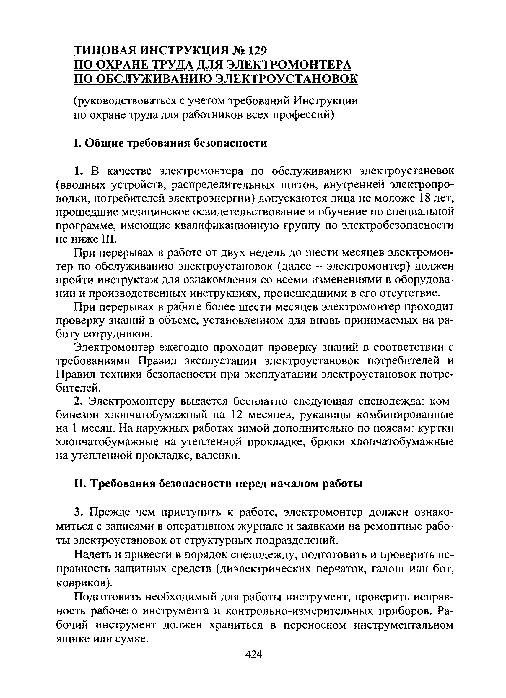 | Название рус.: | Типовая инструкция № 129 по охране труда для электромонтера по обслуживанию электроустановок |