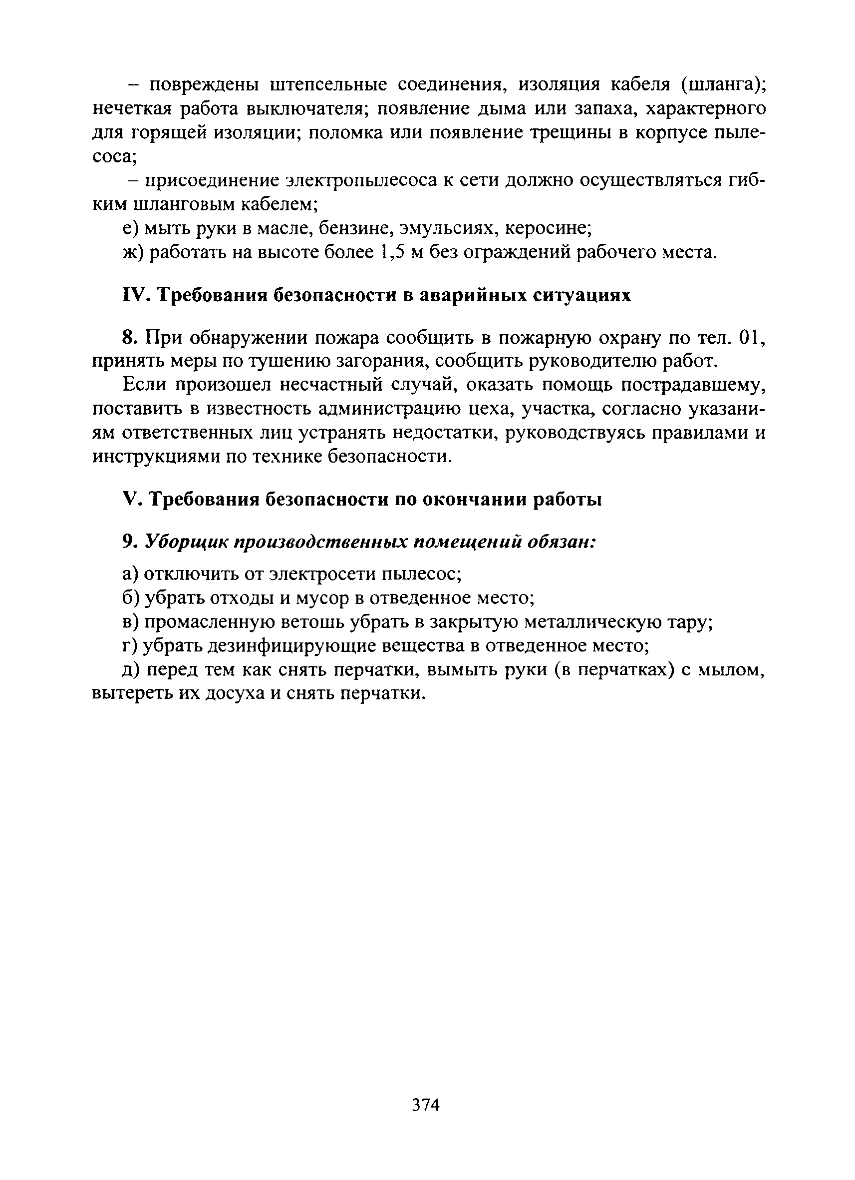 | Оглавление: | I Общие требования безопасности II Требования безопасности перед началом работы III Требования безопасности во время работы IV Требования безопасности в аварийных ситуациях V Требования безопасности по окончании работы |