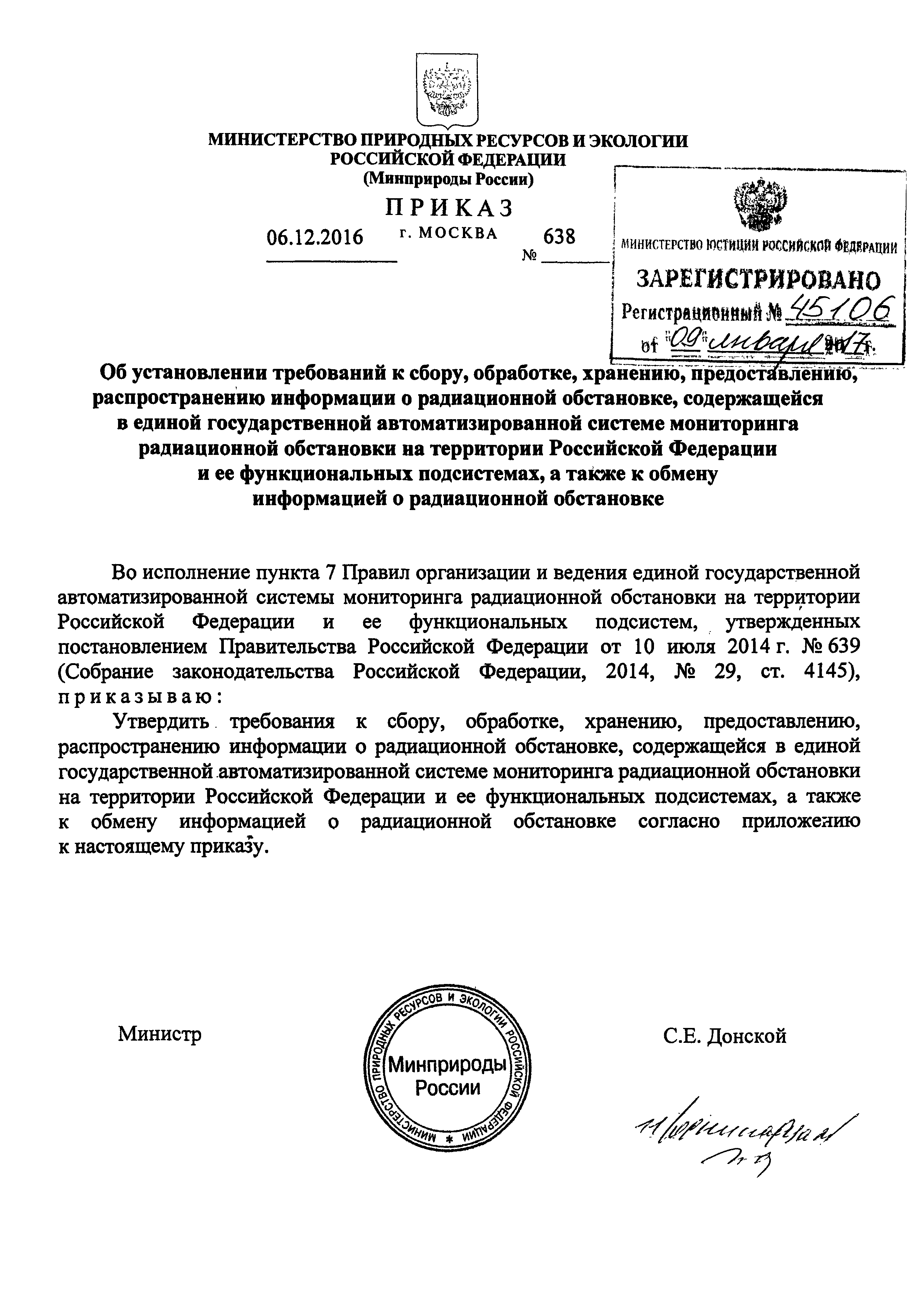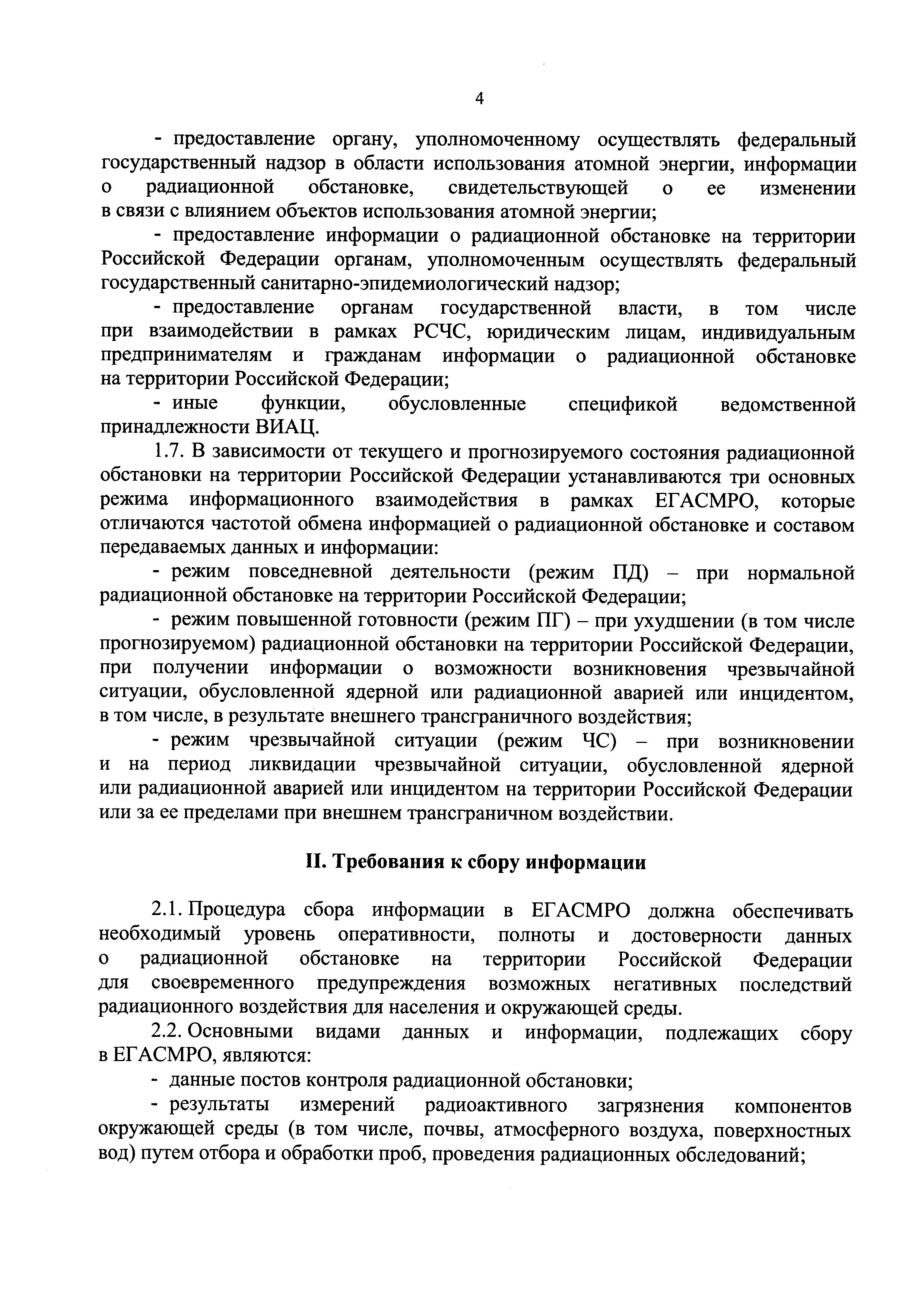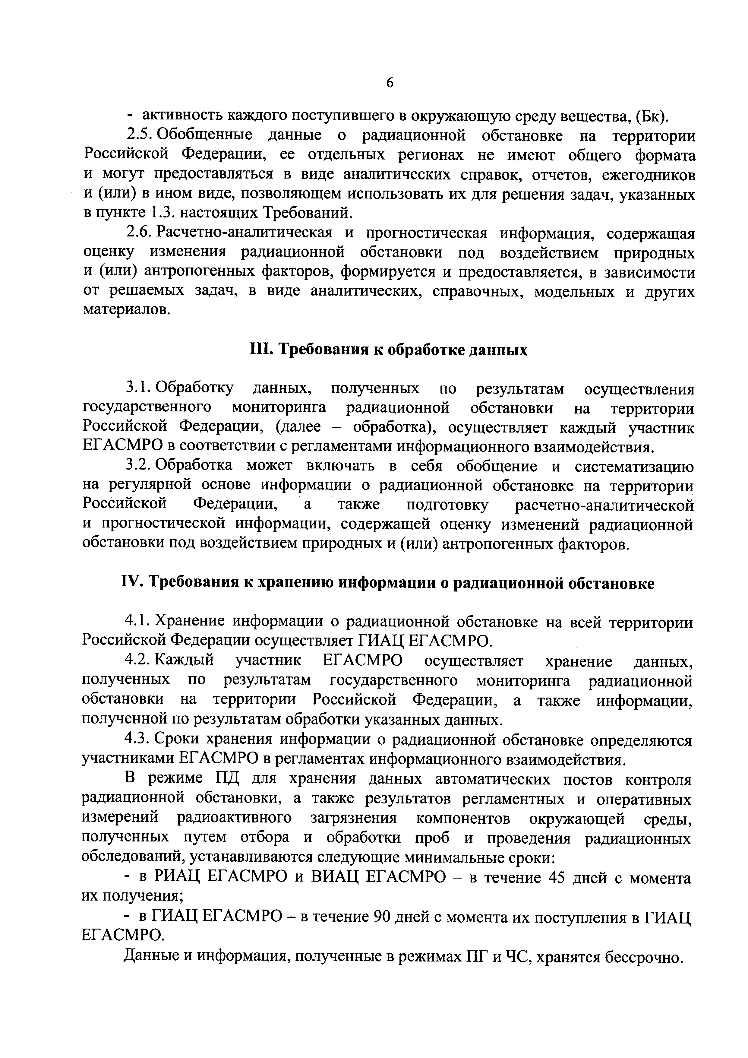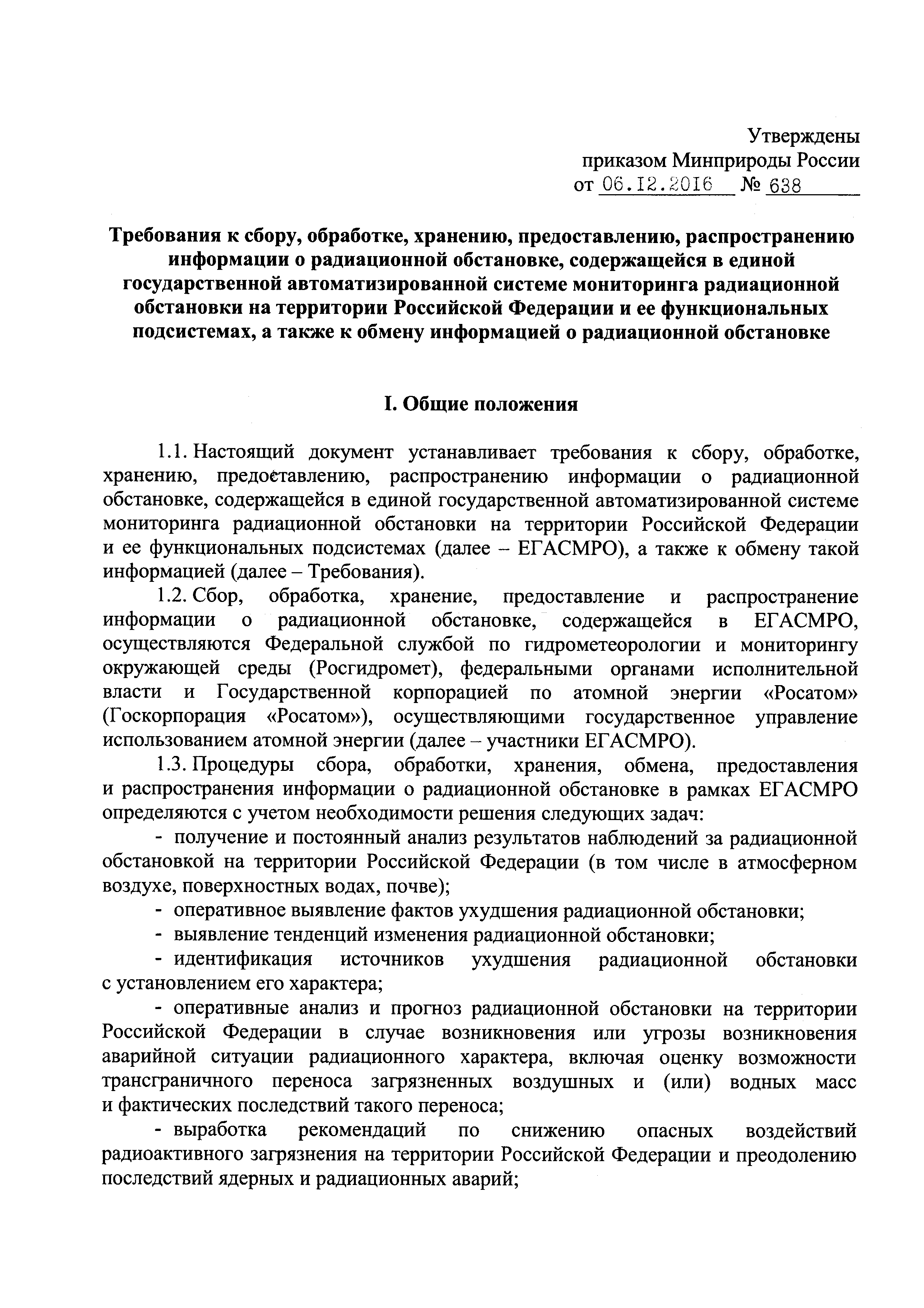 Требования к сбору, обработке, хранению, предоставлению, распространению информации о радиационной обстановке, содержащейся в единой государственной автоматизированной системе мониторинга радиационной обстановки на территории Российской Федерации и ее функциональных подсистемах, а также к обмену информацией о радиационной обстановке| Статус: | действует | | Название рус.: | Требования к сбору, обработке, хранению, предоставлению, распространению информации о радиационной обстановке, содержащейся в единой государственной автоматизированной системе мониторинга радиационной обстановки на территории Российской Федерации и ее функциональных подсистемах, а также к обмену информацией о радиационной обстановке | | Дата добавления в базу: | 05.05.2017 | | Дата актуализации: | 01.01.2021 | | Дата введения: | 20.01.2017 | | Область применения: | Документ устанавливает требования к сбору, обработке, хранению, предоставлению, распространению информации о радиационной обстановке, содержащейся в единой государственной автоматизированной системе мониторинга радиационной обстановки на территории Российской Федерации и ее функциональных подсистемах, а также к обмену такой информацией | | Оглавление: | I. Общие положения II. Требования к сбору информации III. Требования к обработке данных IV. Требования к хранению информации о радиационной обстановке V. Требования к обмену информацией о радиационной обстановке VI. Требования к предоставлению и распространению информации | | Утверждён: | 06.12.2016 Министерство природных ресурсов и экологии Российской Федерации (638)