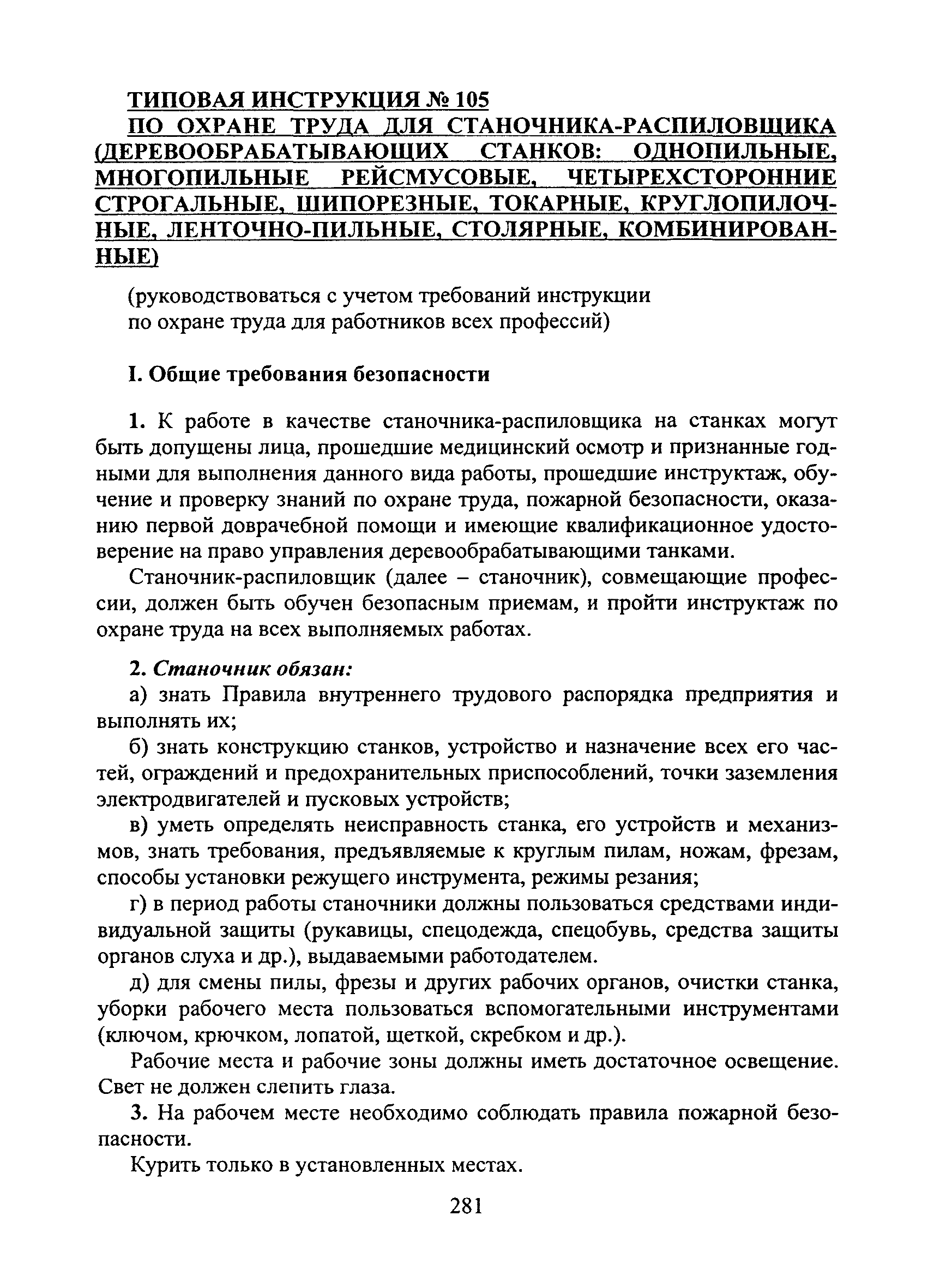 Скачать Типовая инструкция № 105 по охране труда для станочника-распиловщика (деревообрабатывающих станков: однопильные, многопильные рейсмусовые, четырехсторонние строгальные, шипорезные, токарные, круглопилочные, ленточно-пильные, столярные, комбинированные)Дата актуализации: 01.01.2021