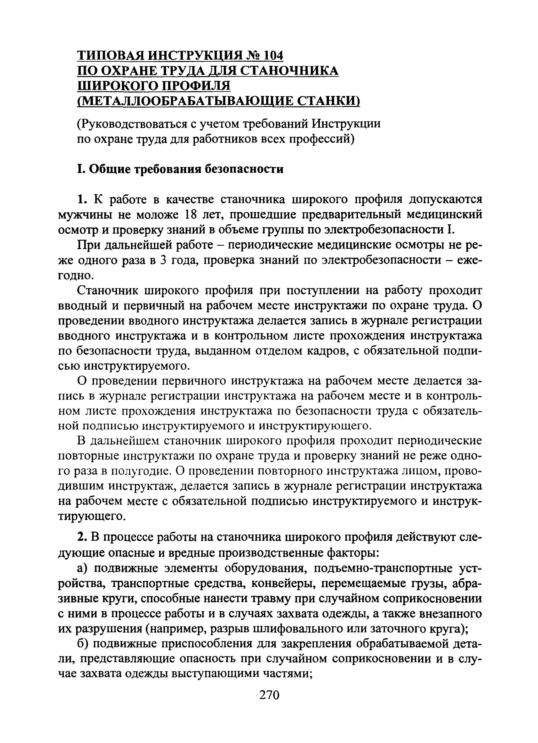 | Название рус.: | Типовая инструкция № 104 по охране труда для станочника широкого профиля (металлообрабатывающие станки) |