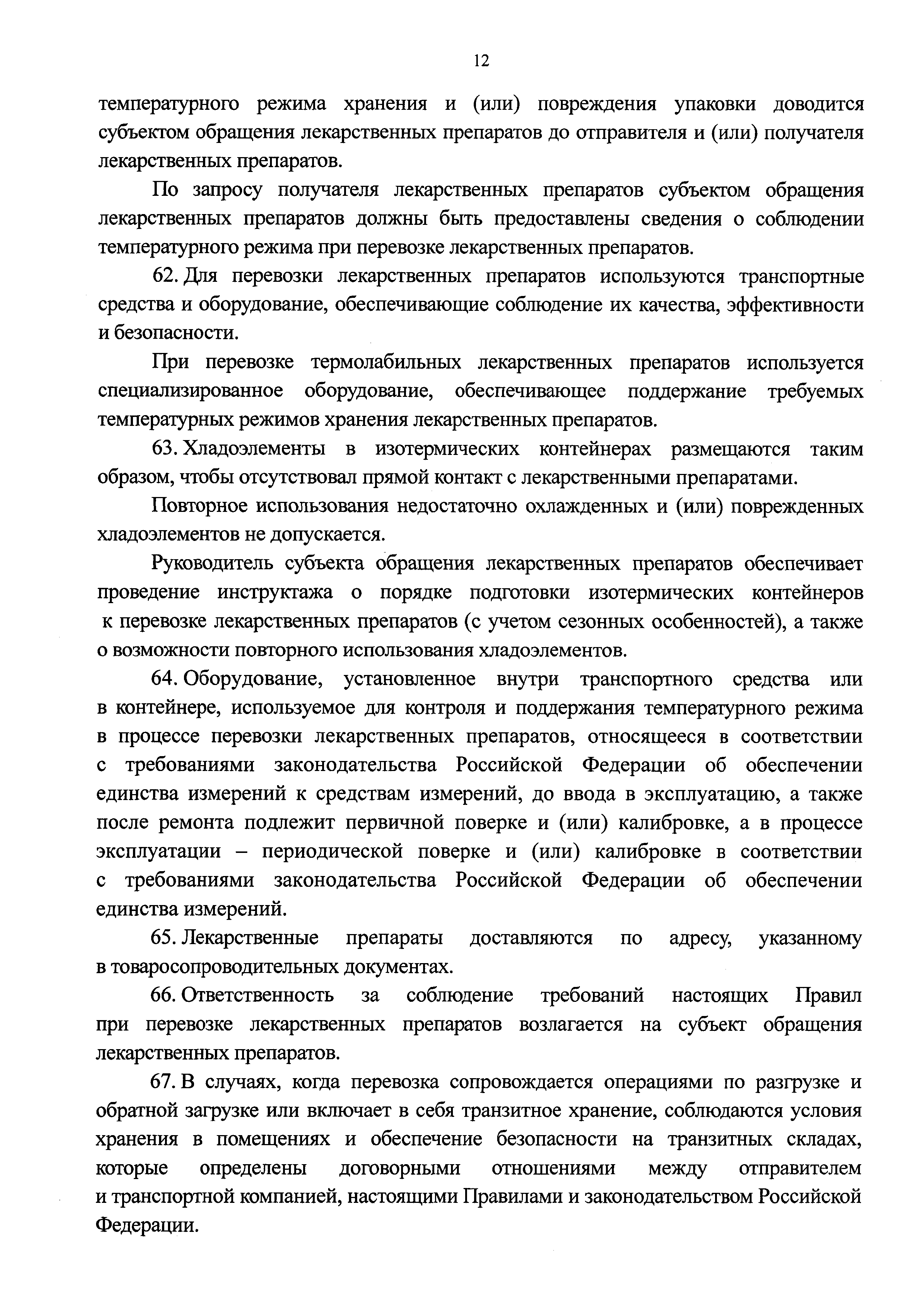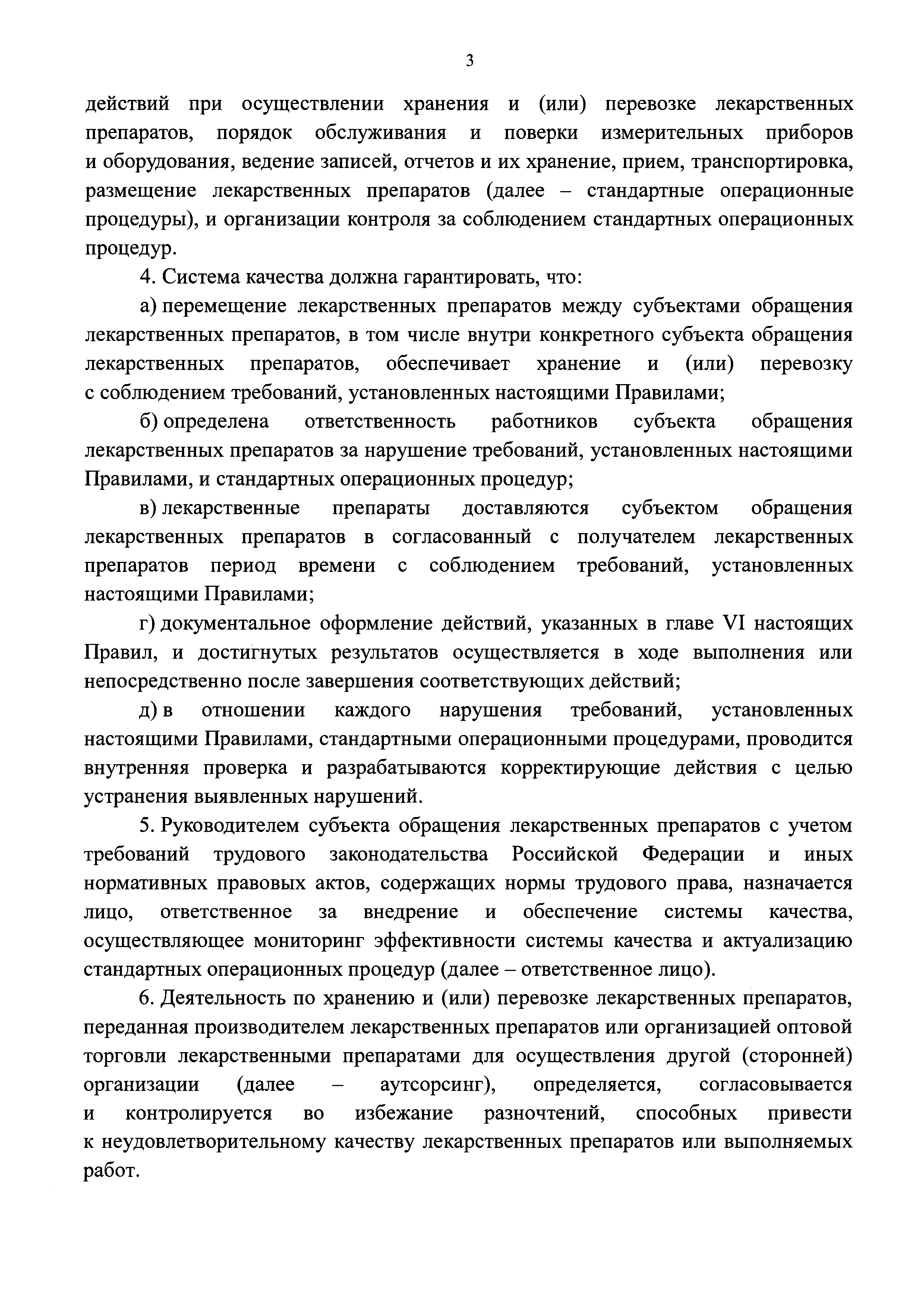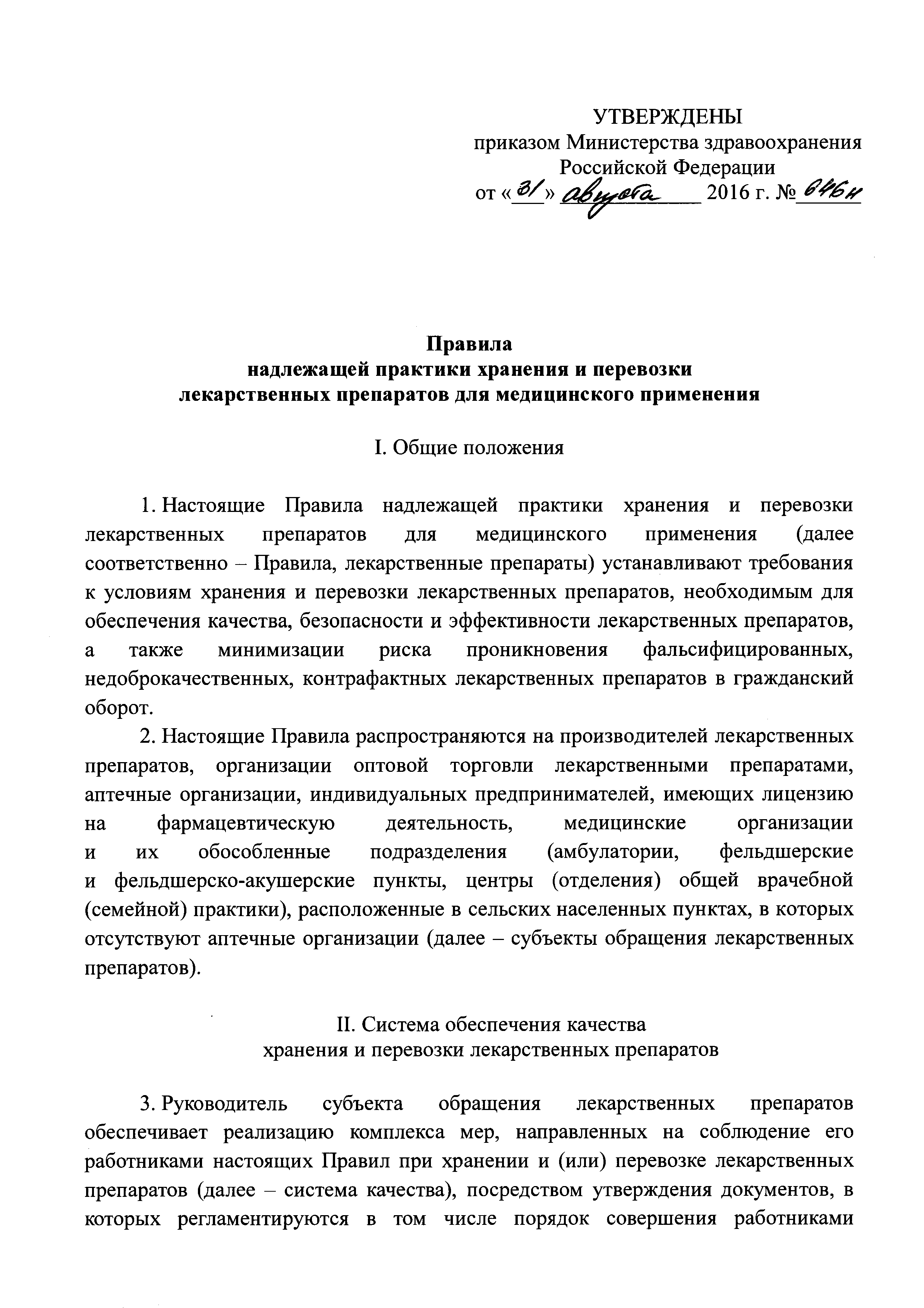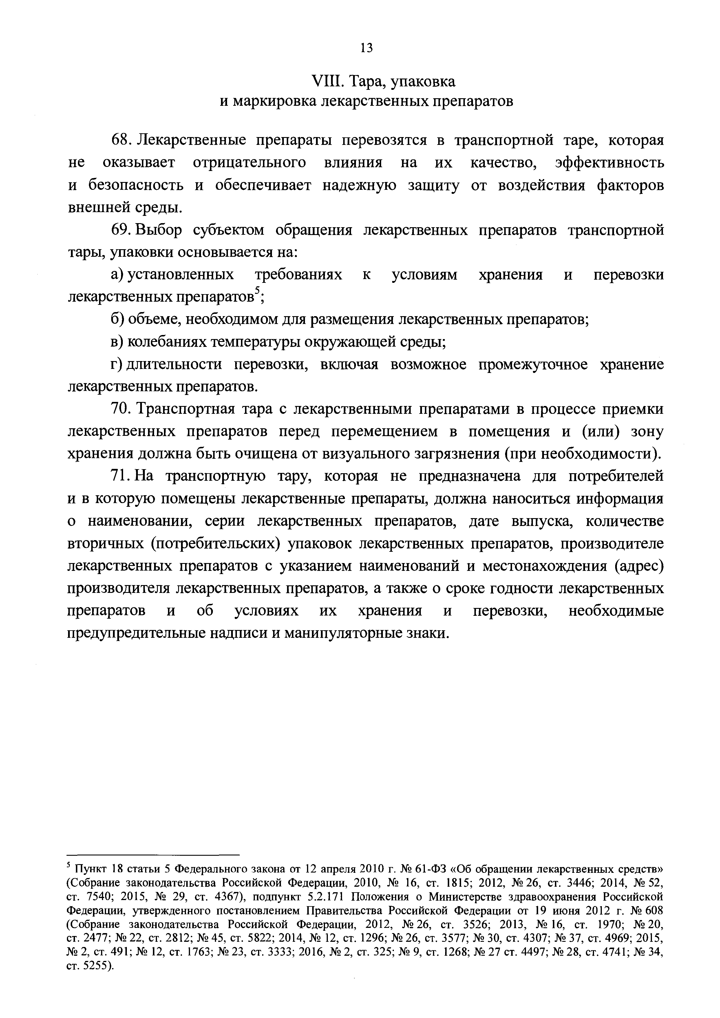| Оглавление: | I. Общие положения II. Система обеспечения качества хранения и перевозки лекарственных препаратов III. Персонал IV. Помещения и оборудование для хранения лекарственных препаратов V. Документы по хранению и перевозке лекарственных препаратов VI. Действия субъекта обращения лекарственных препаратов по хранению и перевозке VII. Перевозка лекарственных препаратов VIII. Тара, упаковка и маркировка лекарственных препаратов |