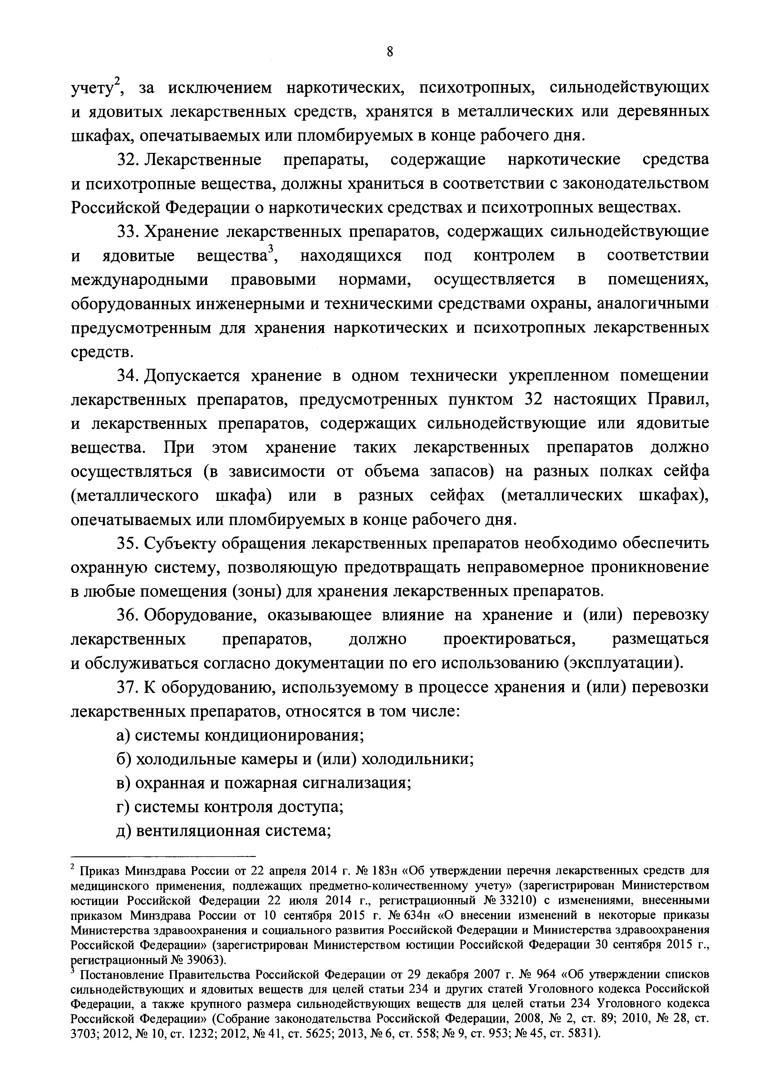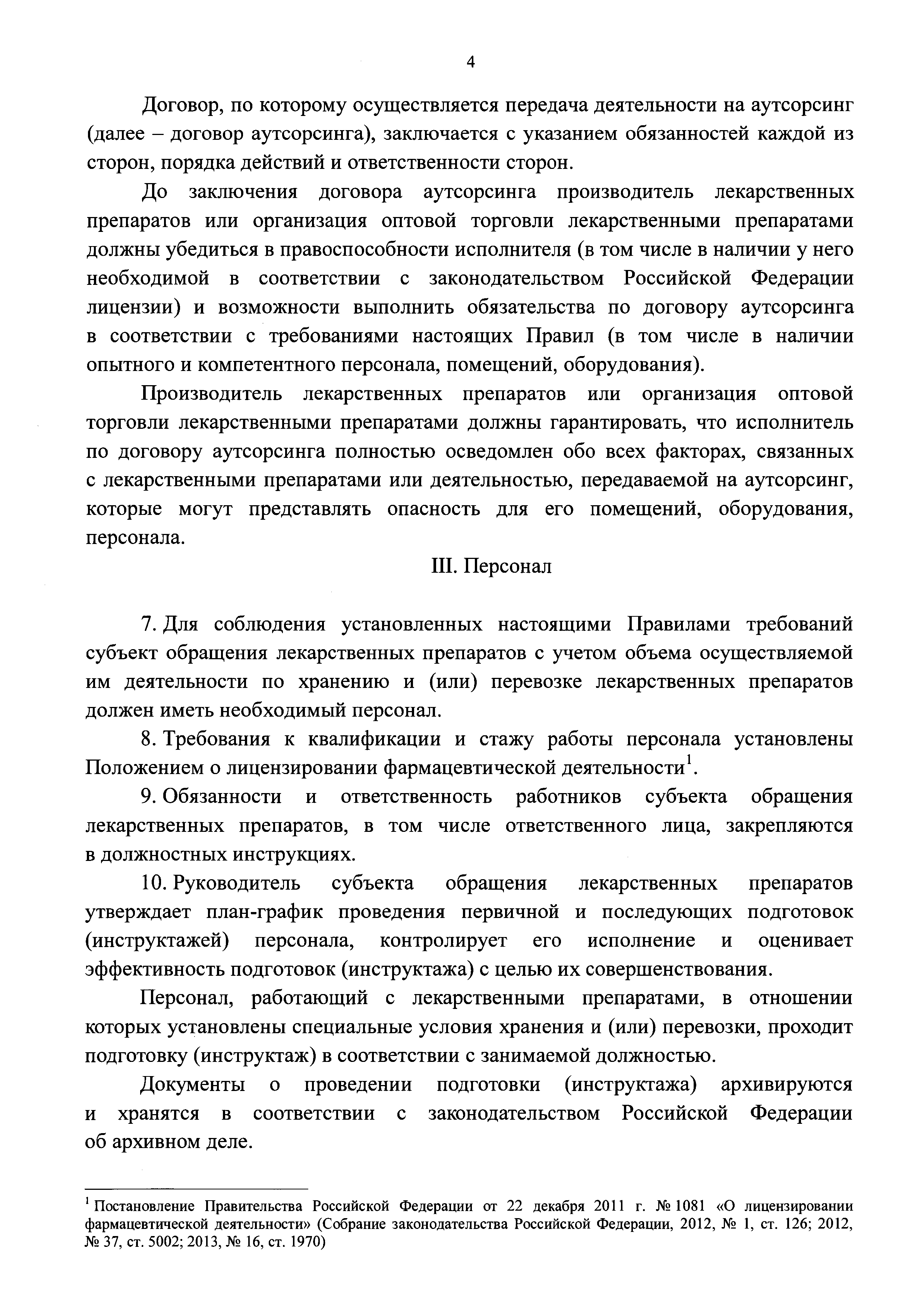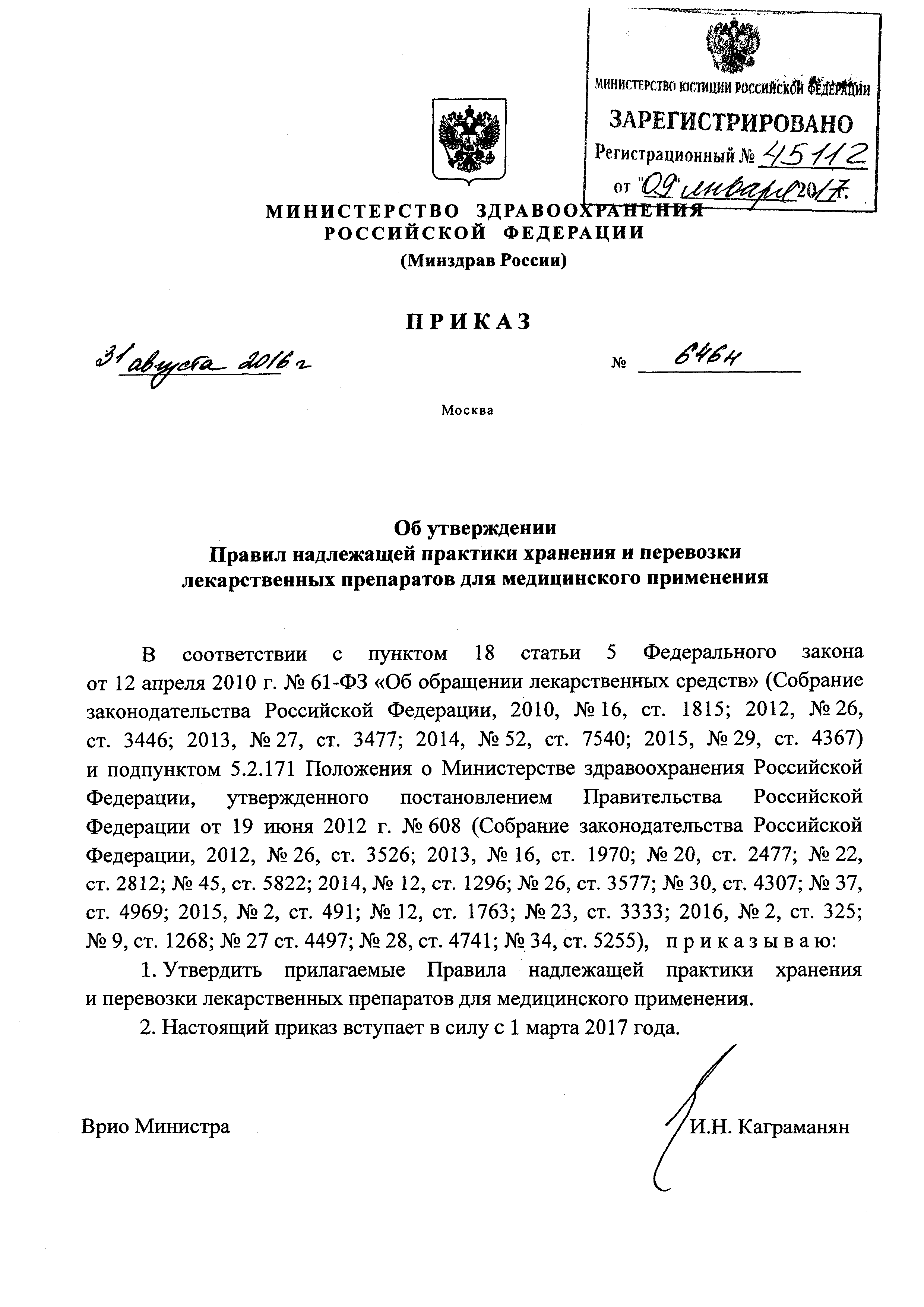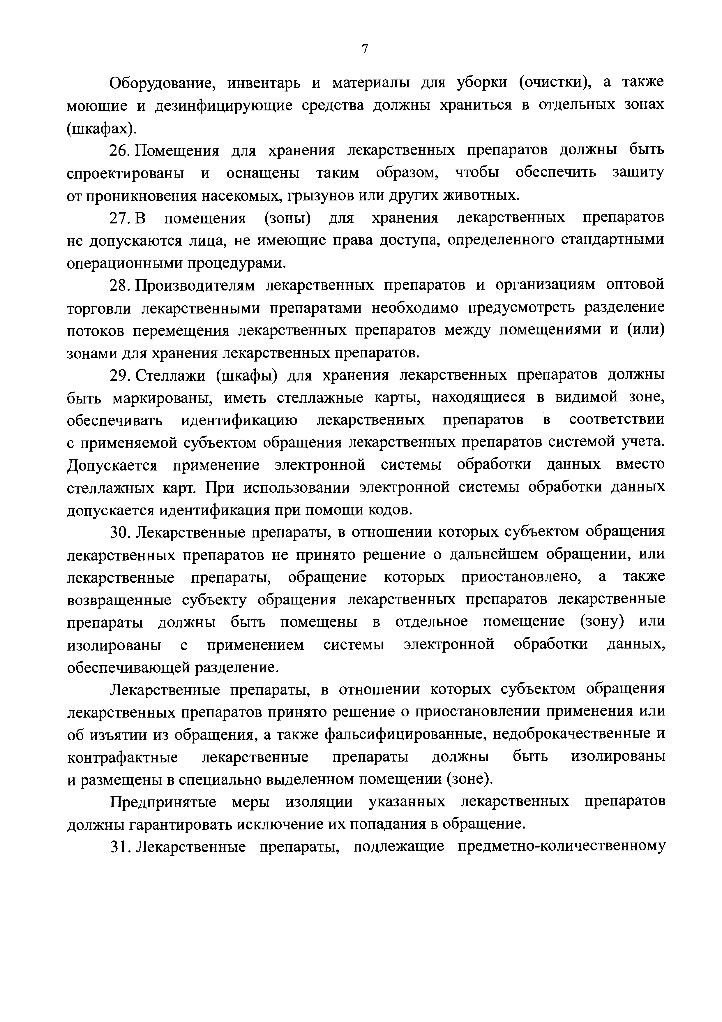 | Оглавление: | I. Общие положения II. Система обеспечения качества хранения и перевозки лекарственных препаратов III. Персонал IV. Помещения и оборудование для хранения лекарственных препаратов V. Документы по хранению и перевозке лекарственных препаратов VI. Действия субъекта обращения лекарственных препаратов по хранению и перевозке VII. Перевозка лекарственных препаратов VIII. Тара, упаковка и маркировка лекарственных препаратов |