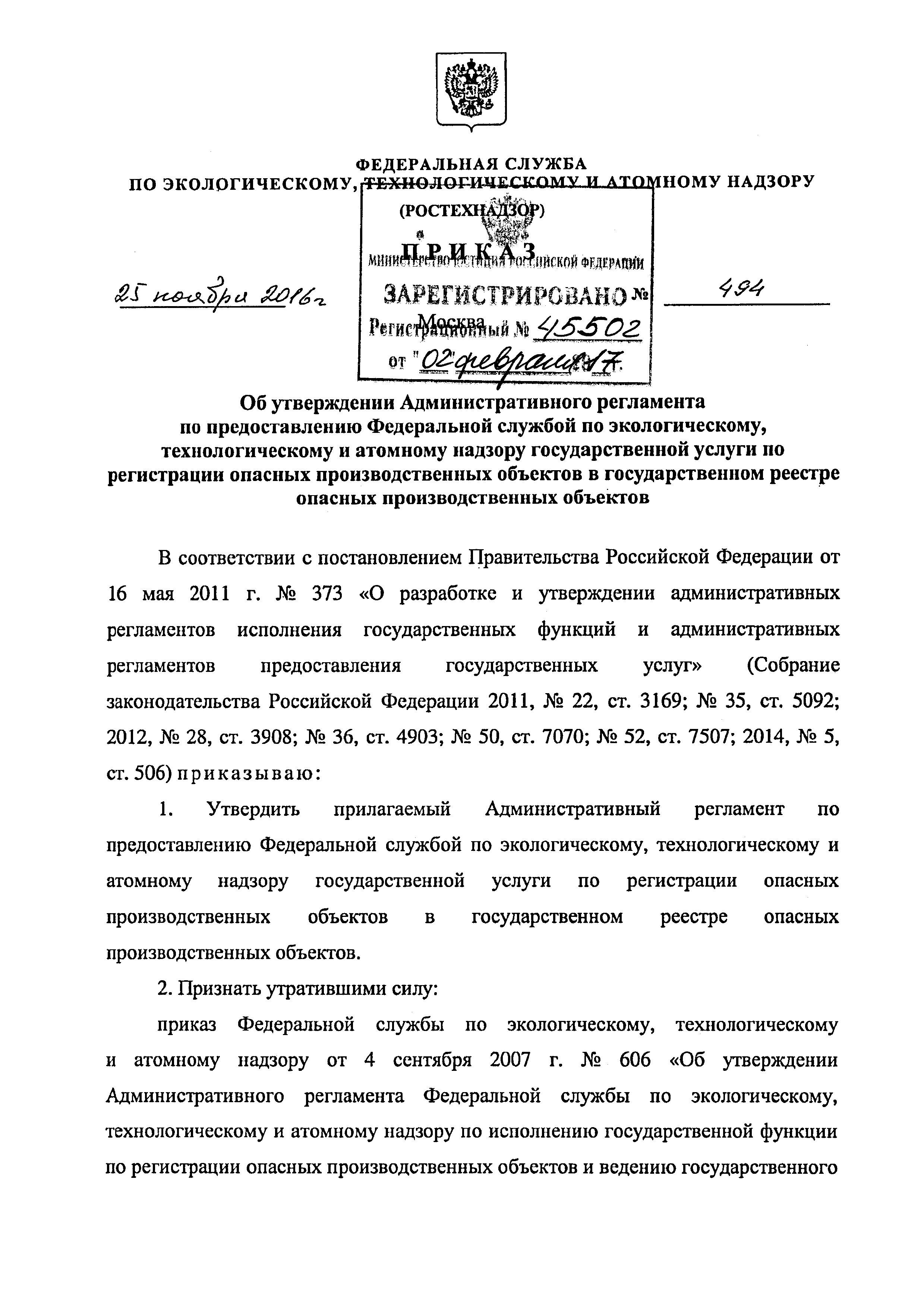 | Утверждён: | 25.11.2016 Федеральная служба по экологическому, технологическому и атомному надзору (494)