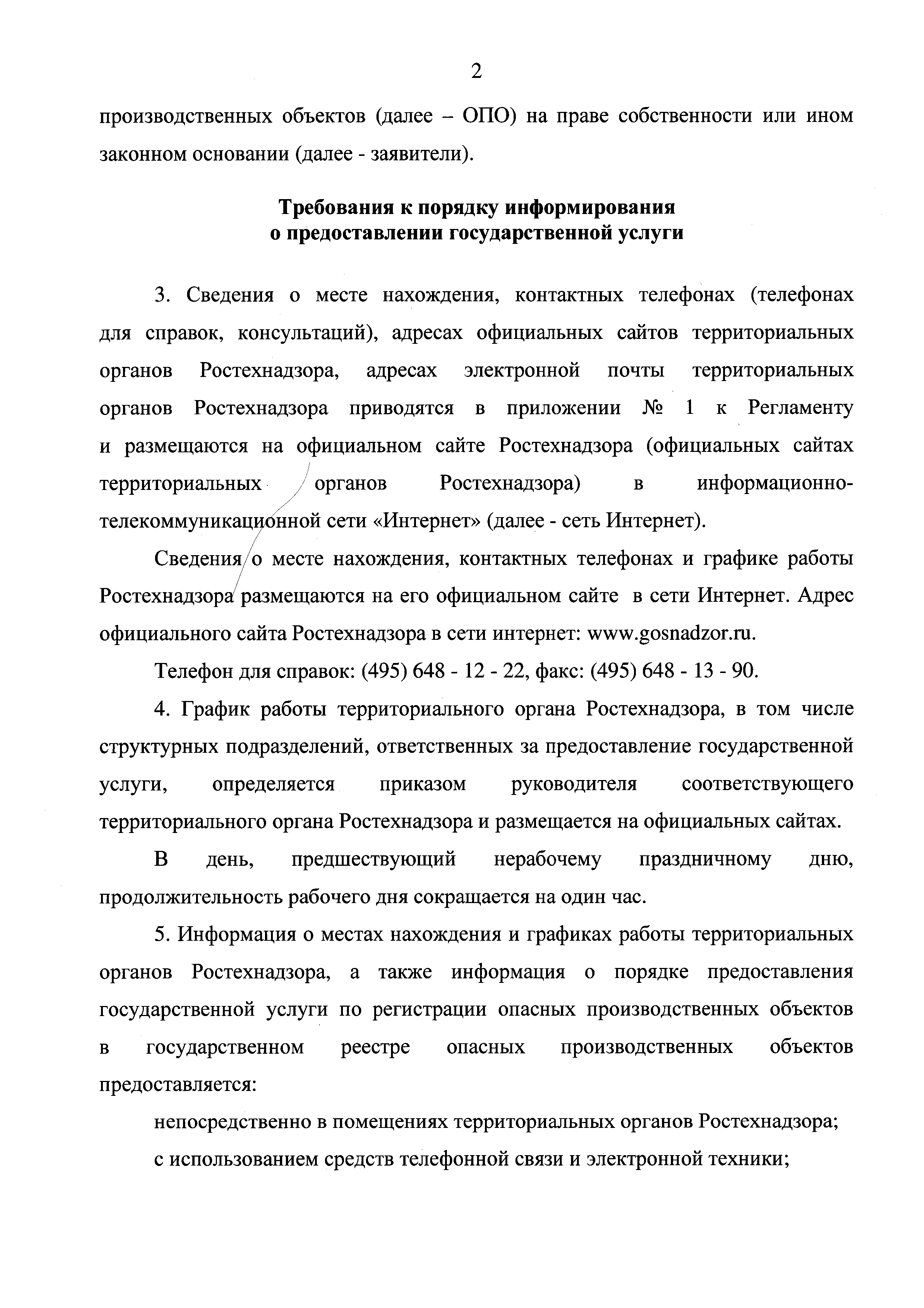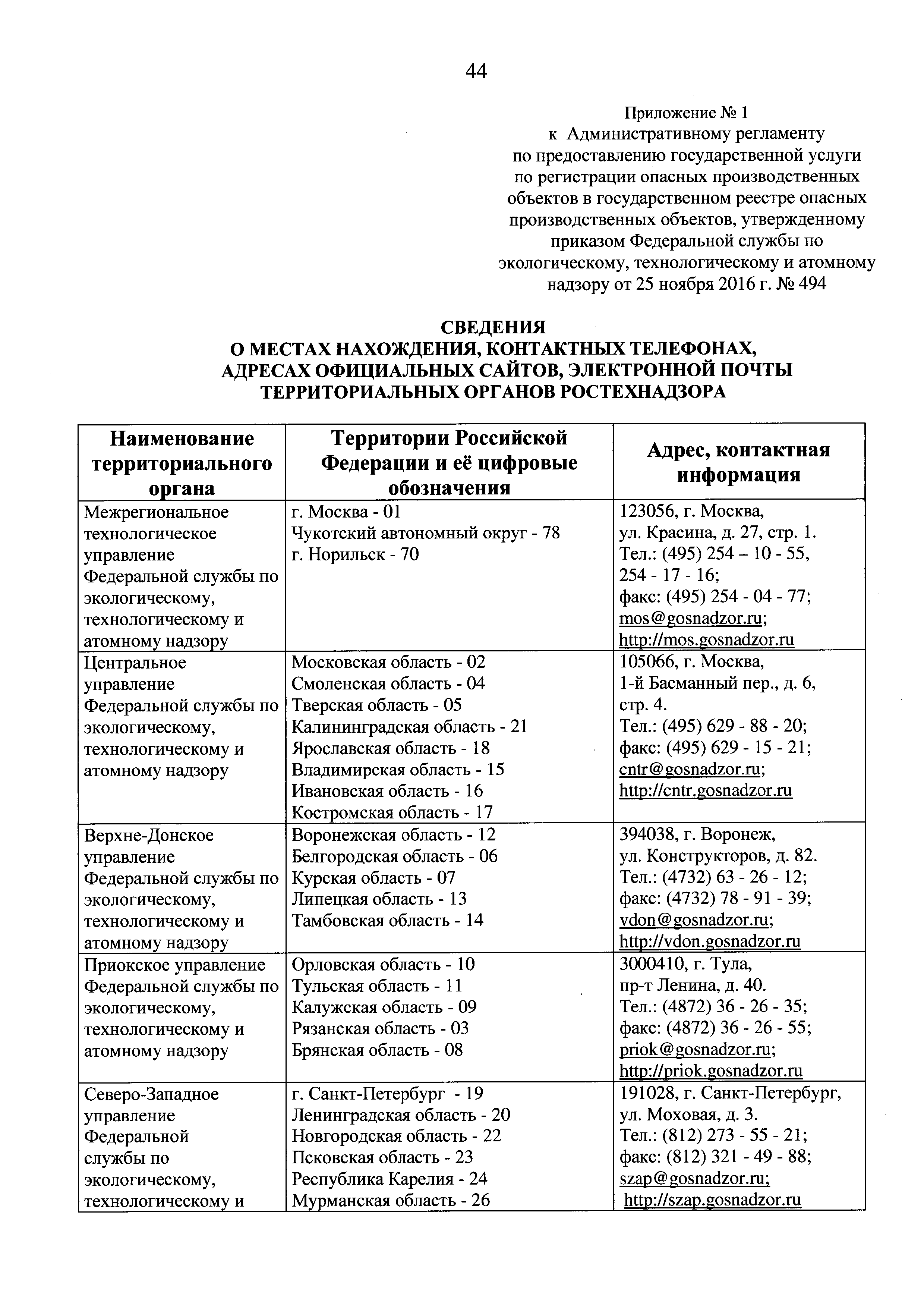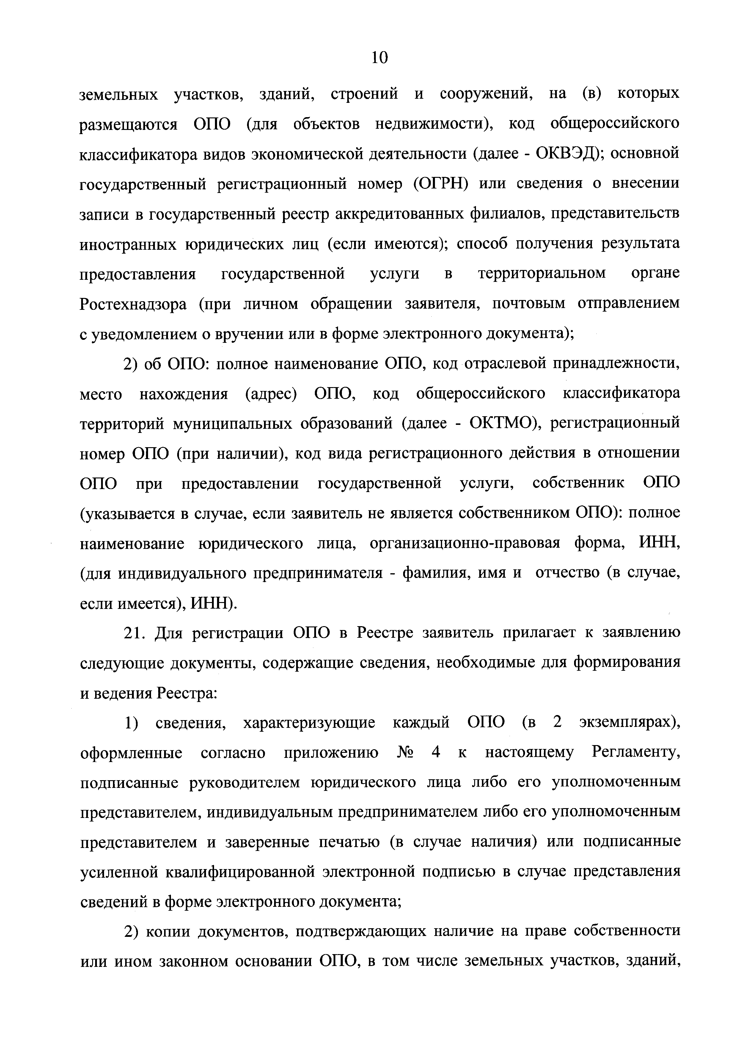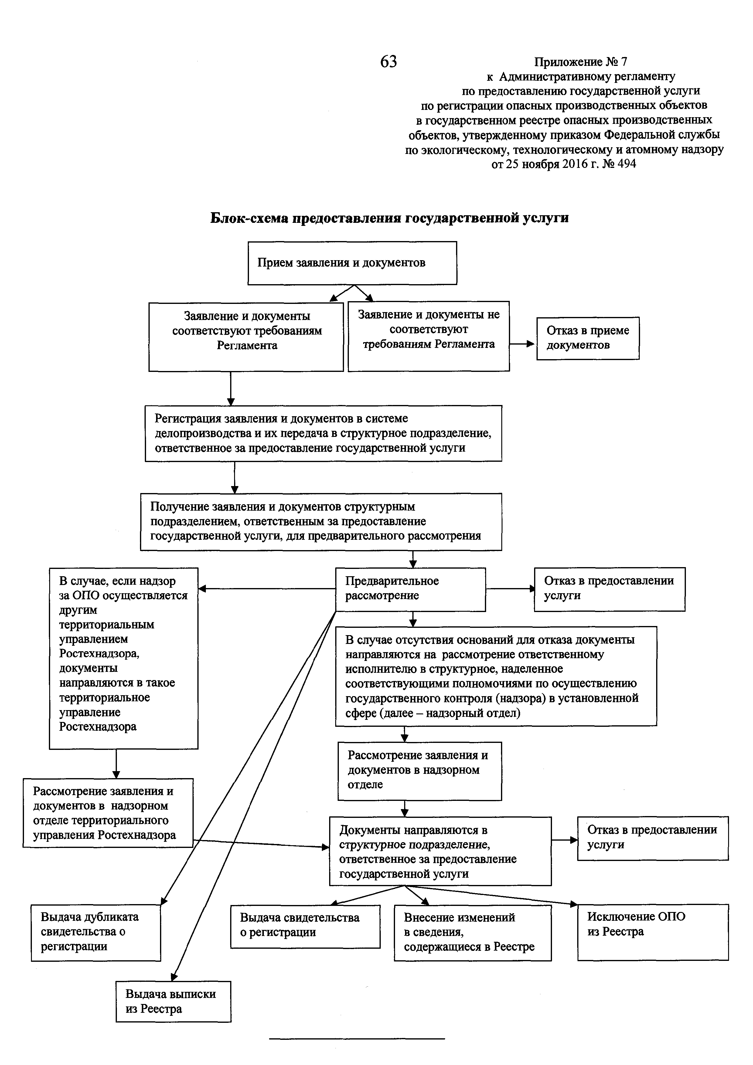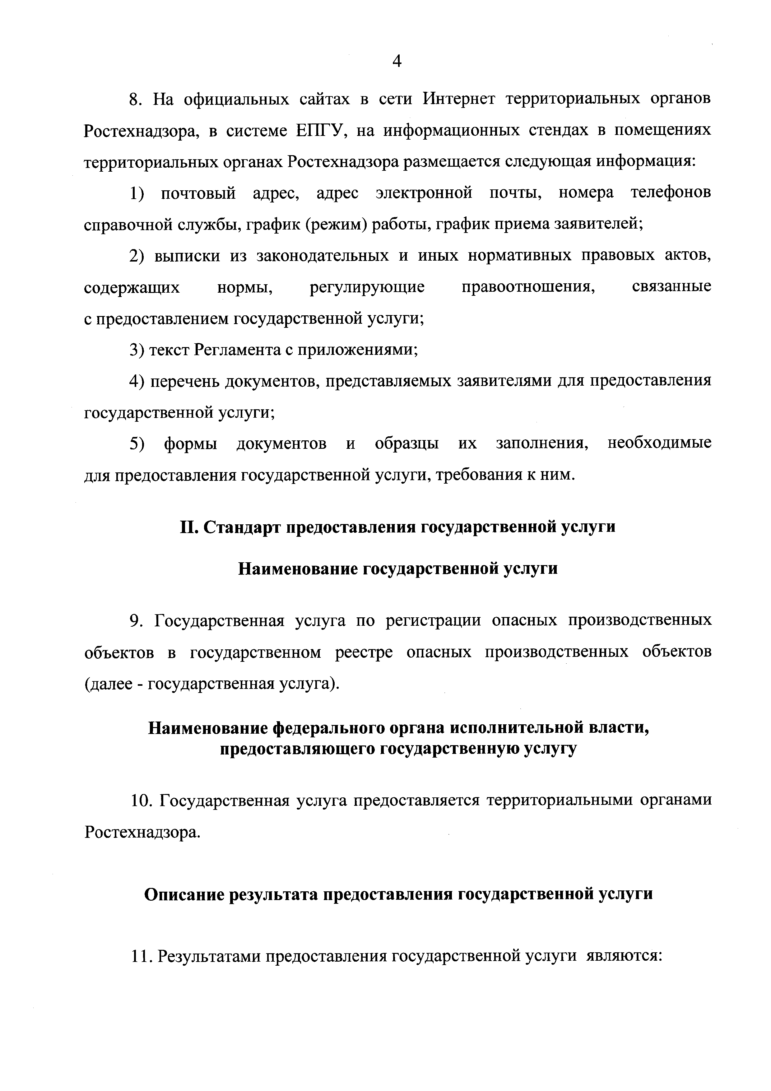 | Оглавление: | I. Общие положения II. Стандарт предоставления государственной услуги III. Состав, последовательность и сроки выполнения административных процедур (действий), требования к порядку их выполнения, в том числе особенности выполнения административных процедур (действий) в электронной форме IV. Формы контроля за исполнением настоящего Регламента V. Досудебный (внесудебный) порядок обжалования решений и действий (бездействия) Ростехнадзора, а также его должностных лиц Приложение № 1. Сведения о местах нахождения, контактных телефонах, адресах официальных сайтов, электронной почты территориальных органов Ростехнадзора Приложение № 2. Опись документов Приложение № 3. Заявление Приложение № 4. Сведения, характеризующие ОПО Приложение № 5. Заявление о переоформлении (выдаче дубликата) свидетельства о регистрации в государственном реестре опасных производственных объектов Приложение № 6. Заявление о предоставлении информации о зарегистрированных в Реестре ОПО в форме выписки Приложение № 7. Блок-схема предоставления государственной услуги |