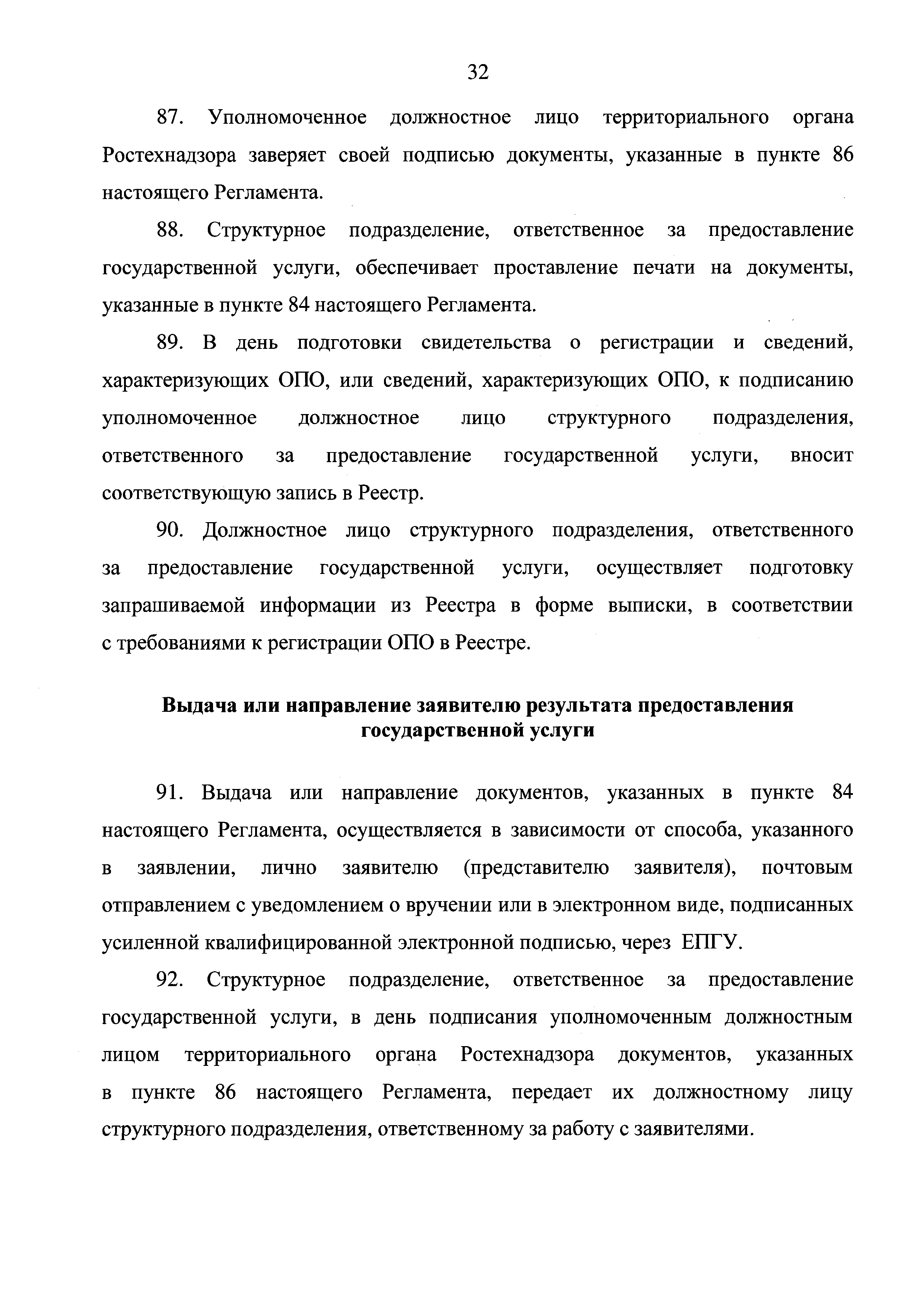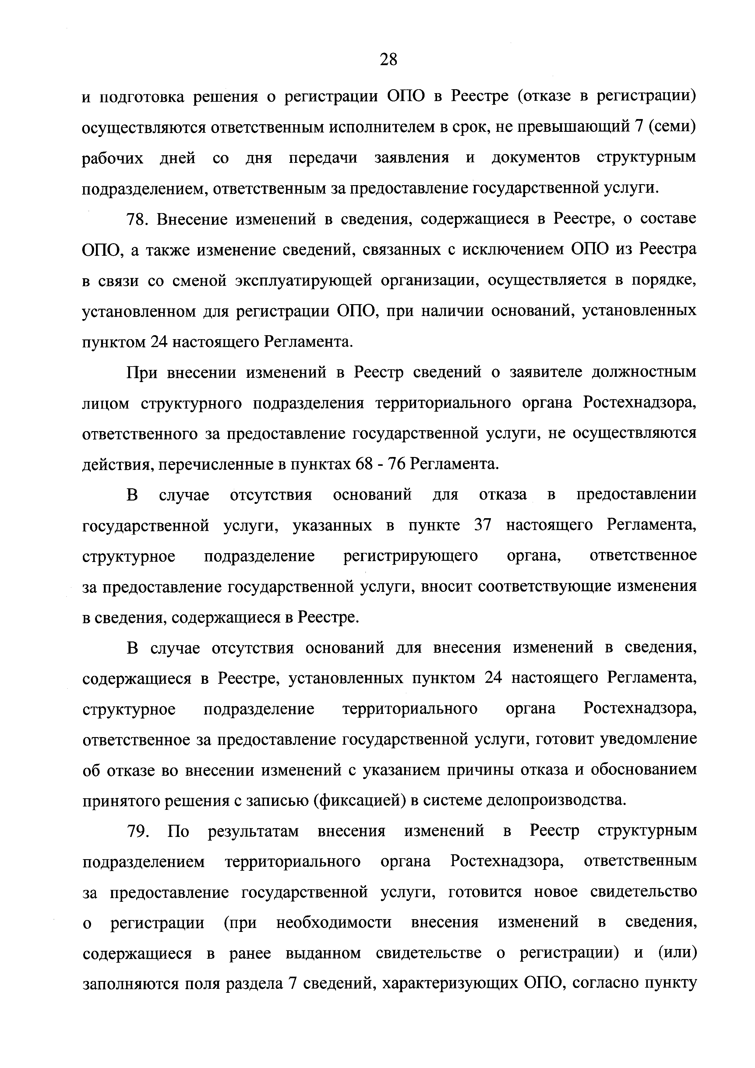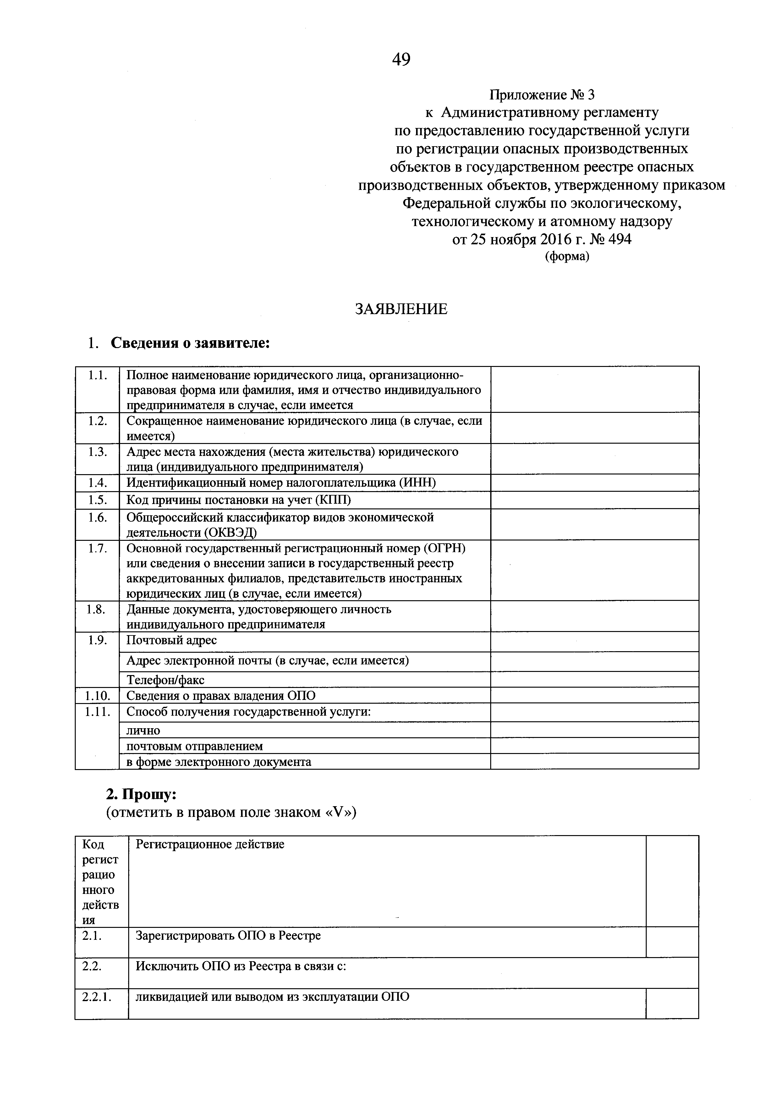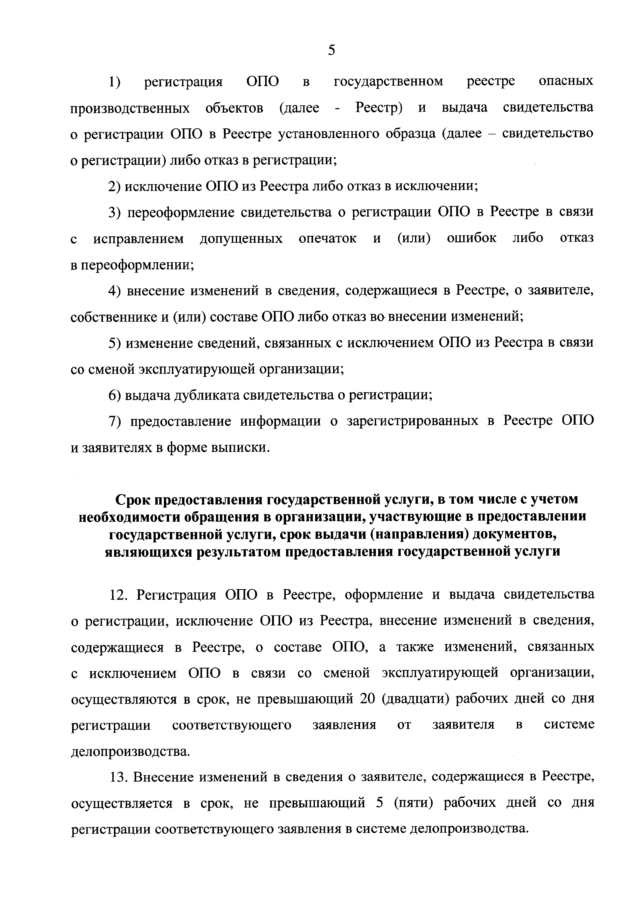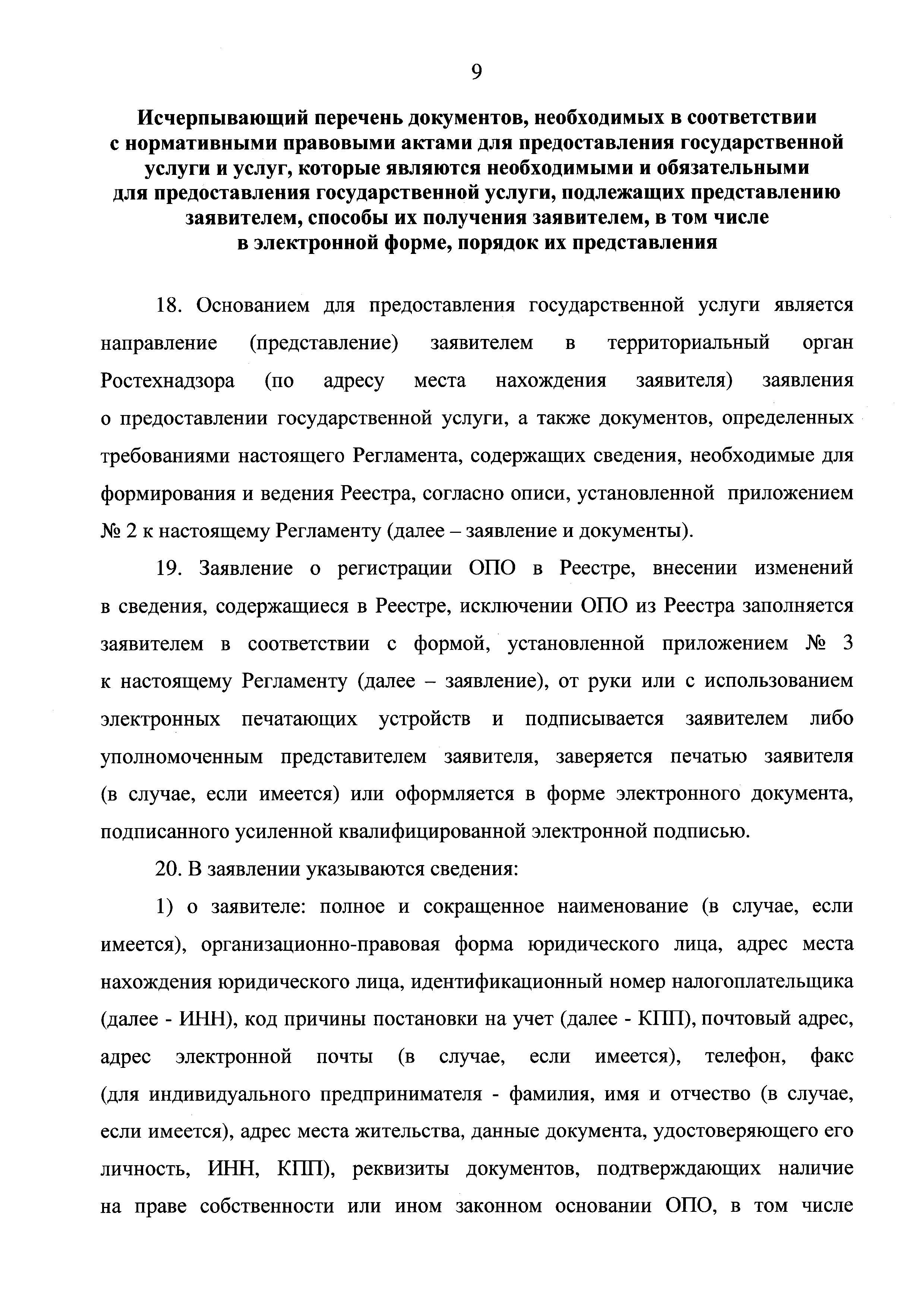 | Оглавление: | I. Общие положения II. Стандарт предоставления государственной услуги III. Состав, последовательность и сроки выполнения административных процедур (действий), требования к порядку их выполнения, в том числе особенности выполнения административных процедур (действий) в электронной форме IV. Формы контроля за исполнением настоящего Регламента V. Досудебный (внесудебный) порядок обжалования решений и действий (бездействия) Ростехнадзора, а также его должностных лиц Приложение № 1. Сведения о местах нахождения, контактных телефонах, адресах официальных сайтов, электронной почты территориальных органов Ростехнадзора Приложение № 2. Опись документов Приложение № 3. Заявление Приложение № 4. Сведения, характеризующие ОПО Приложение № 5. Заявление о переоформлении (выдаче дубликата) свидетельства о регистрации в государственном реестре опасных производственных объектов Приложение № 6. Заявление о предоставлении информации о зарегистрированных в Реестре ОПО в форме выписки Приложение № 7. Блок-схема предоставления государственной услуги |